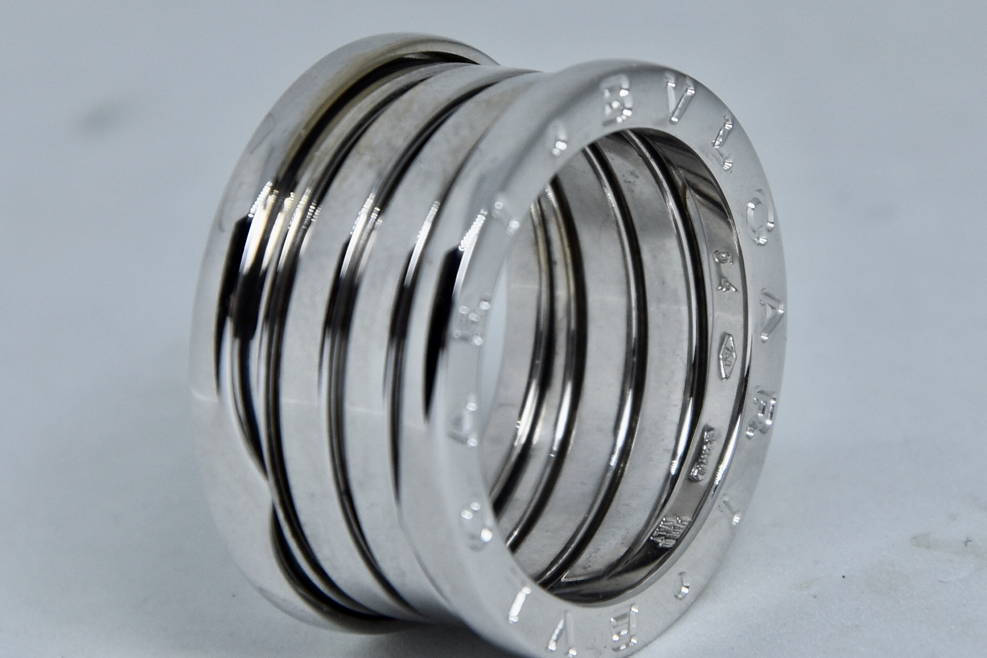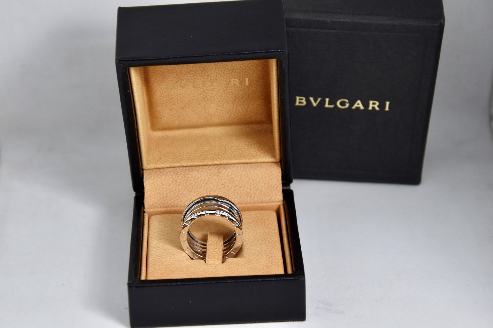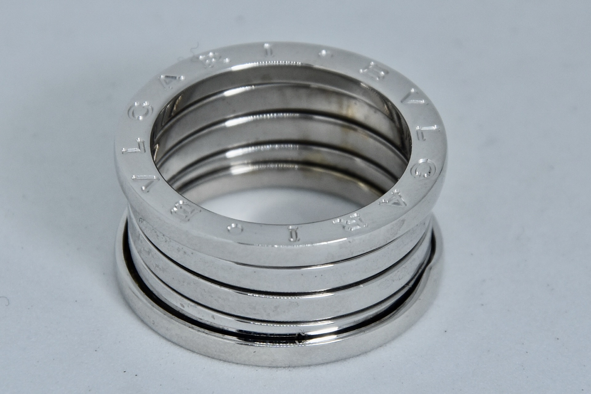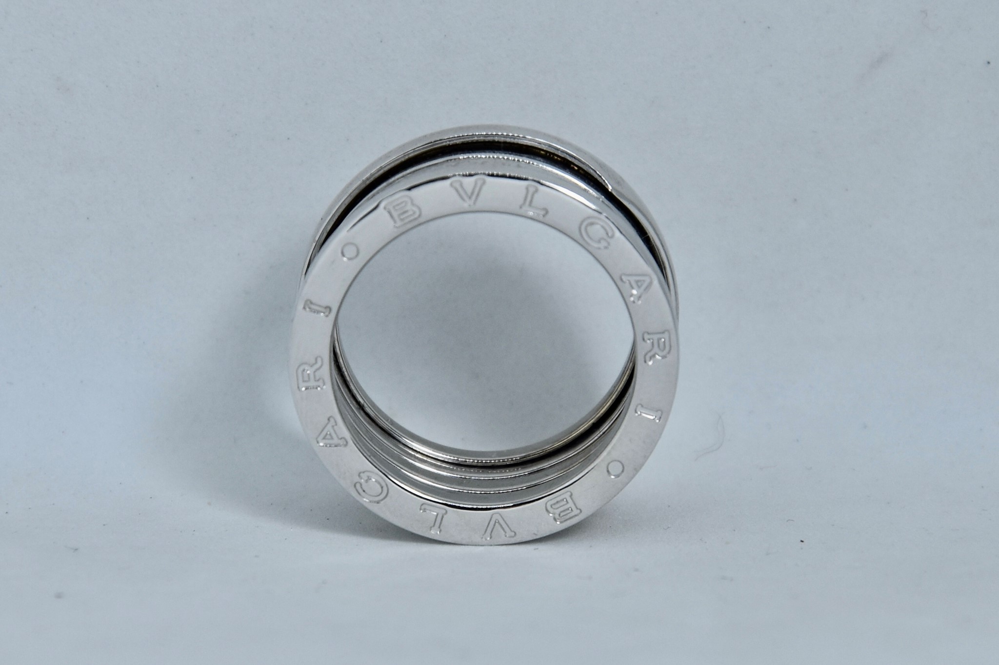 Anello Bulgari dell'iconica collezione B.Zero 1 in oro bianco 750/00. Peso anello 11,10g.