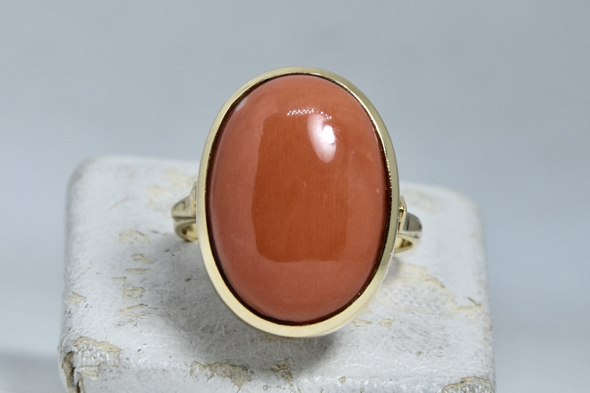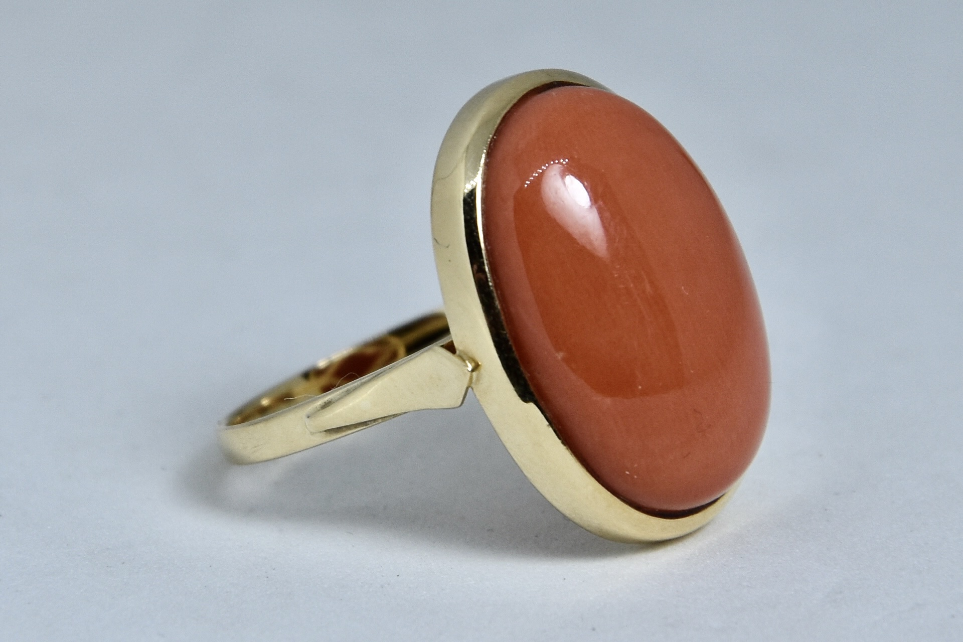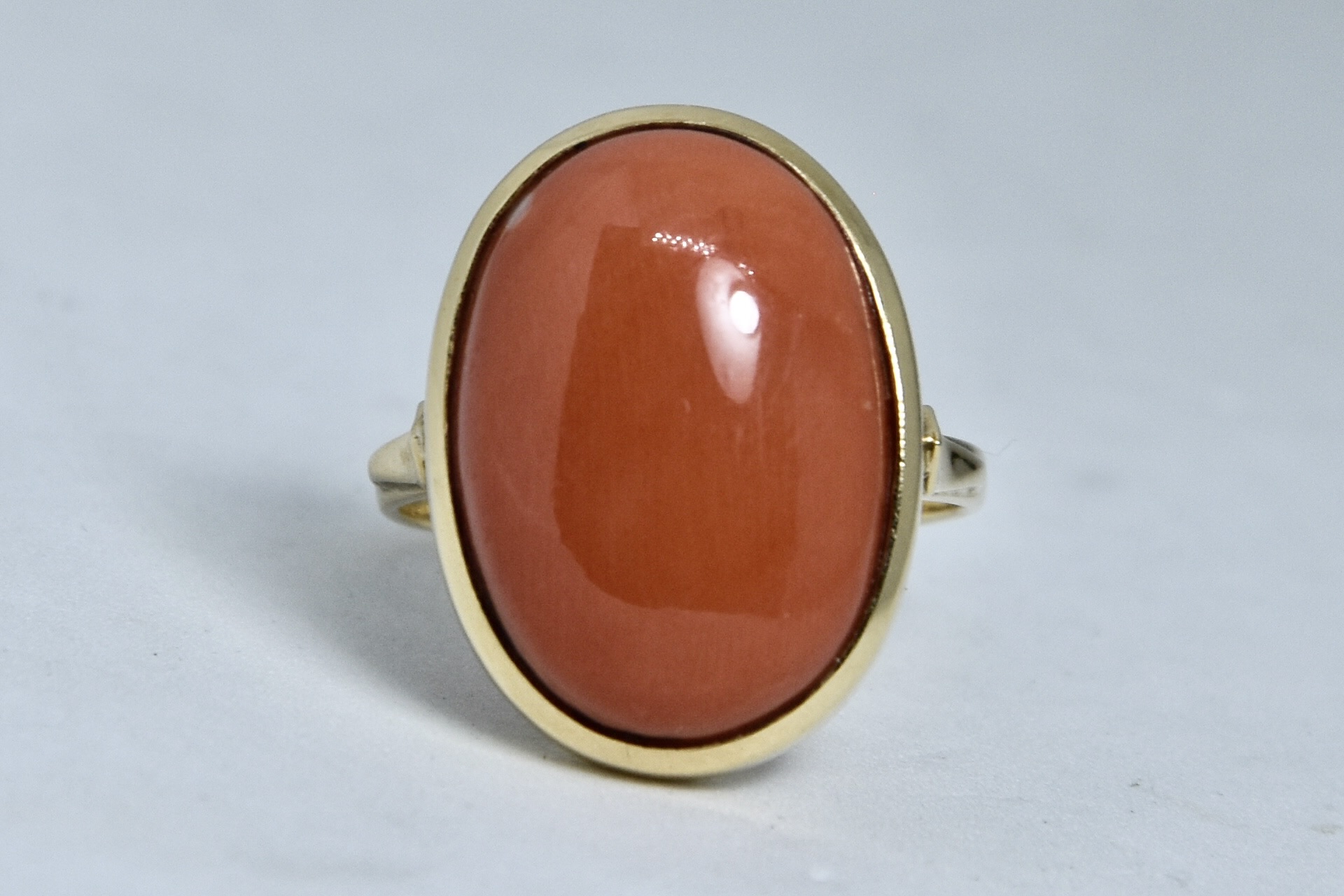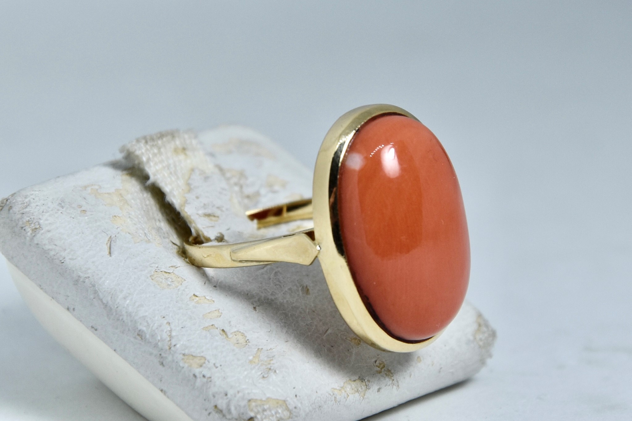 Anello in oro giallo 750/00 con corallo giapponese (dimensione corallo 1,80x1,30cm). Peso anello 9,50g.