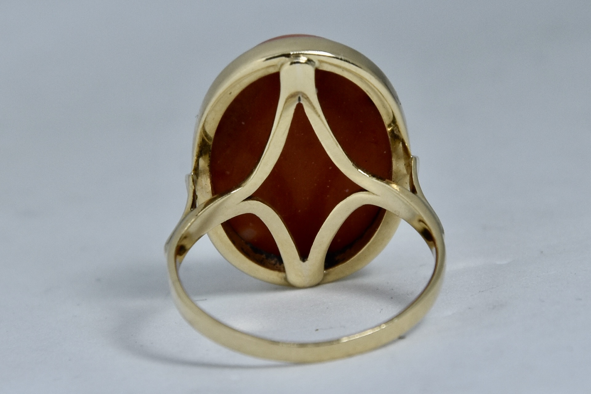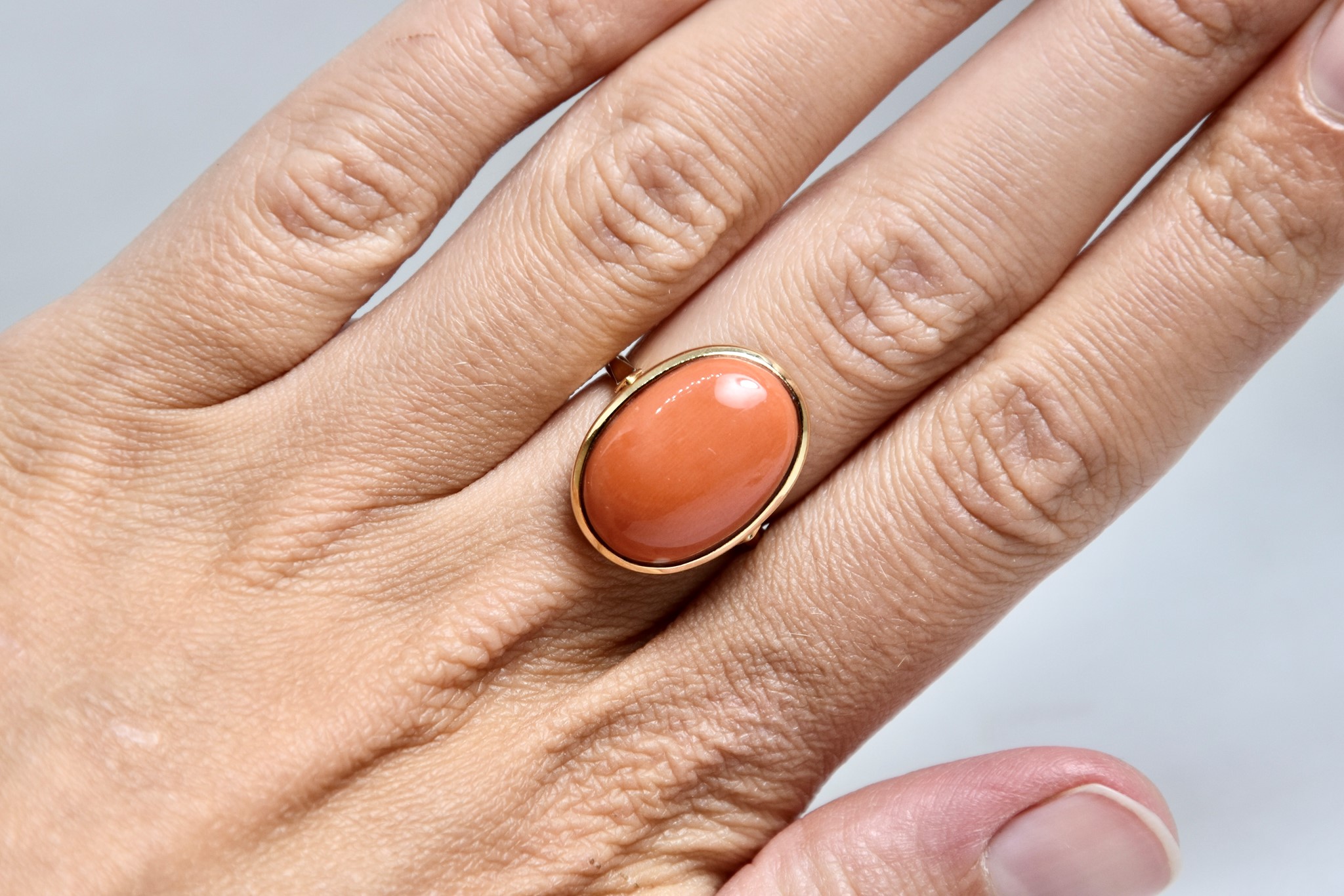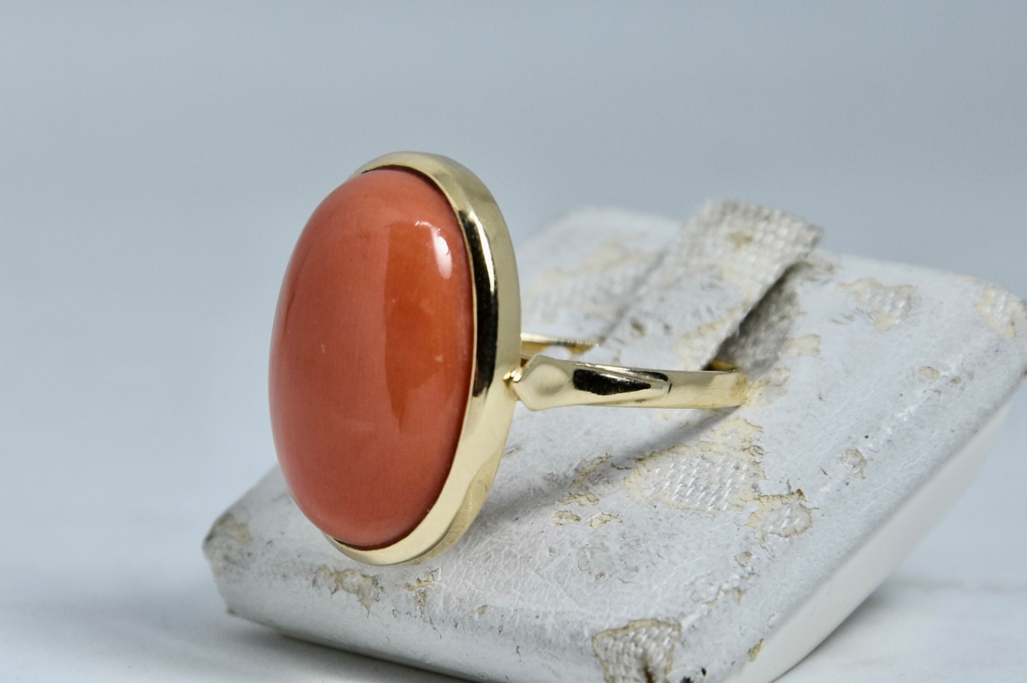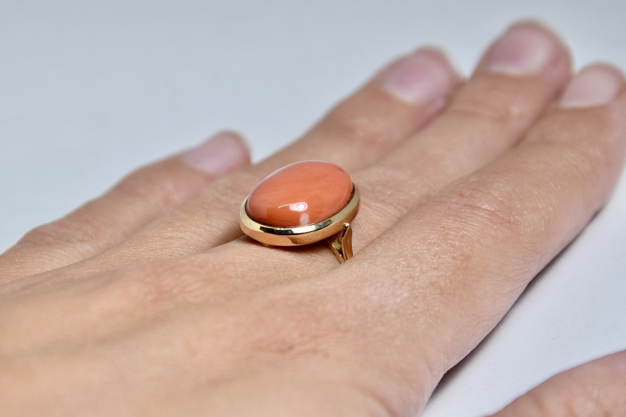 Anello in oro giallo 750/00 con corallo giapponese (dimensione corallo 1,80x1,30cm). Peso anello 9,50g.