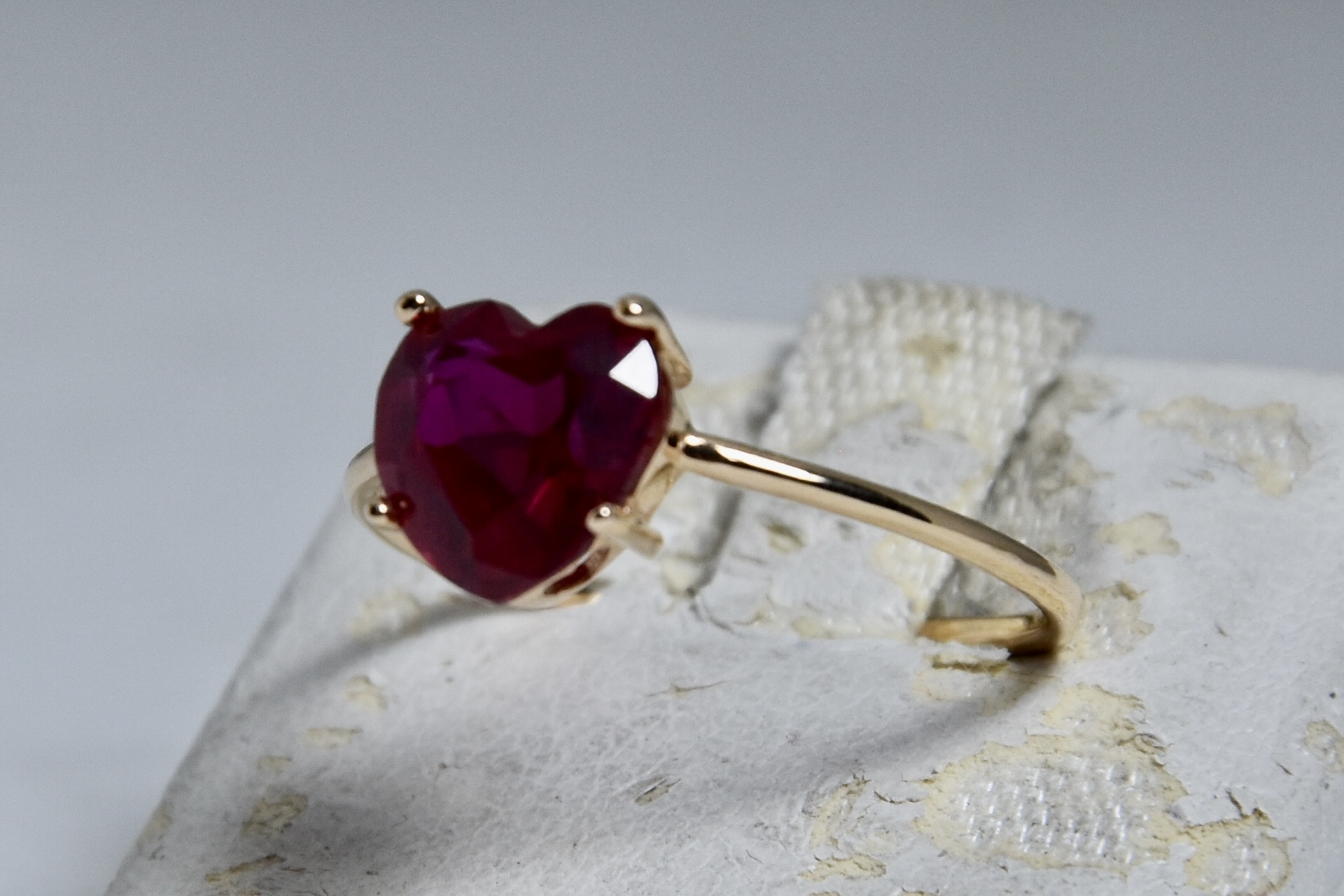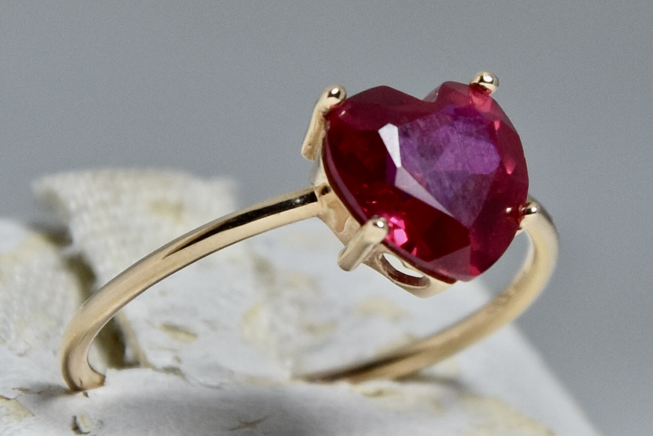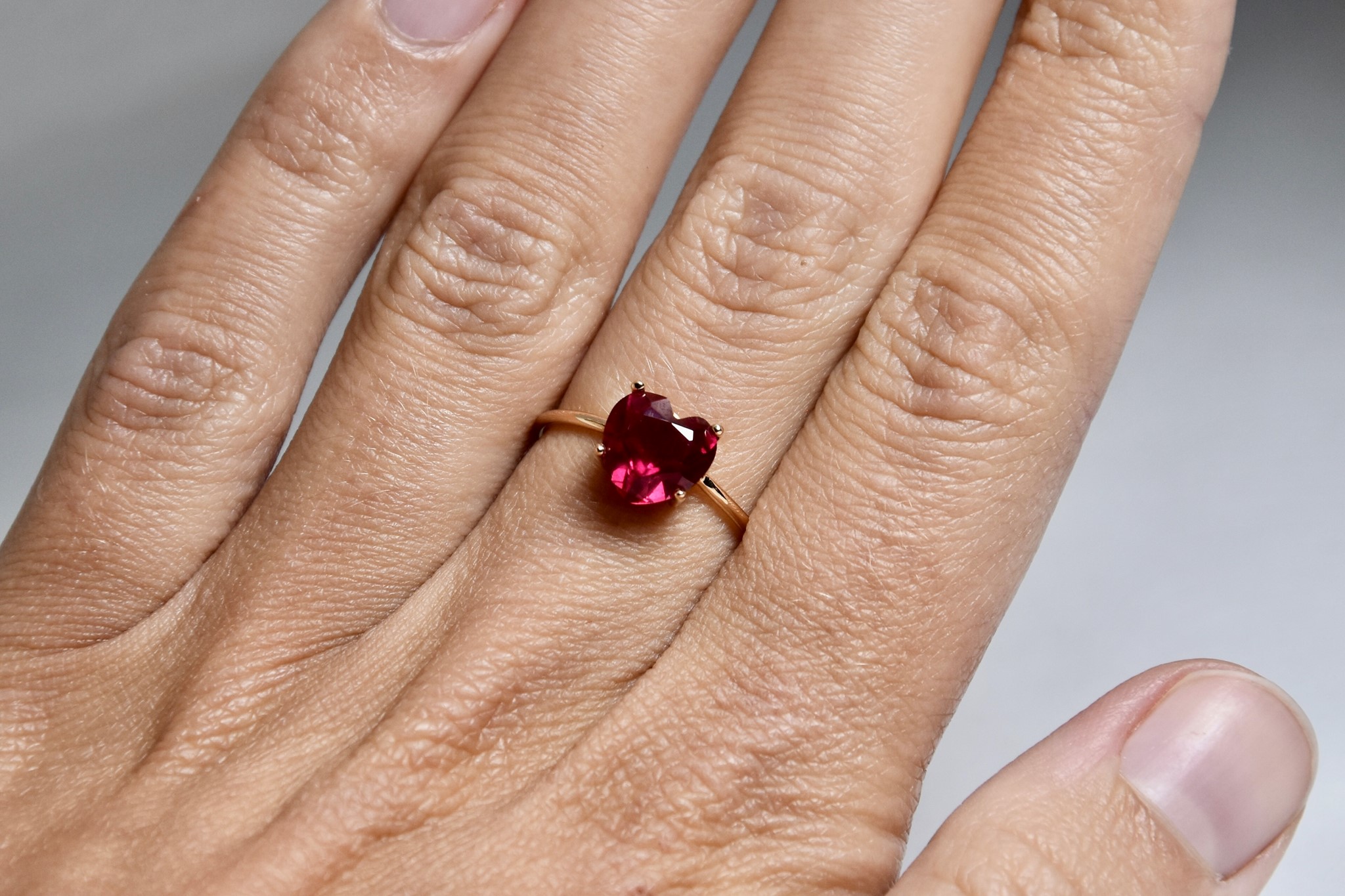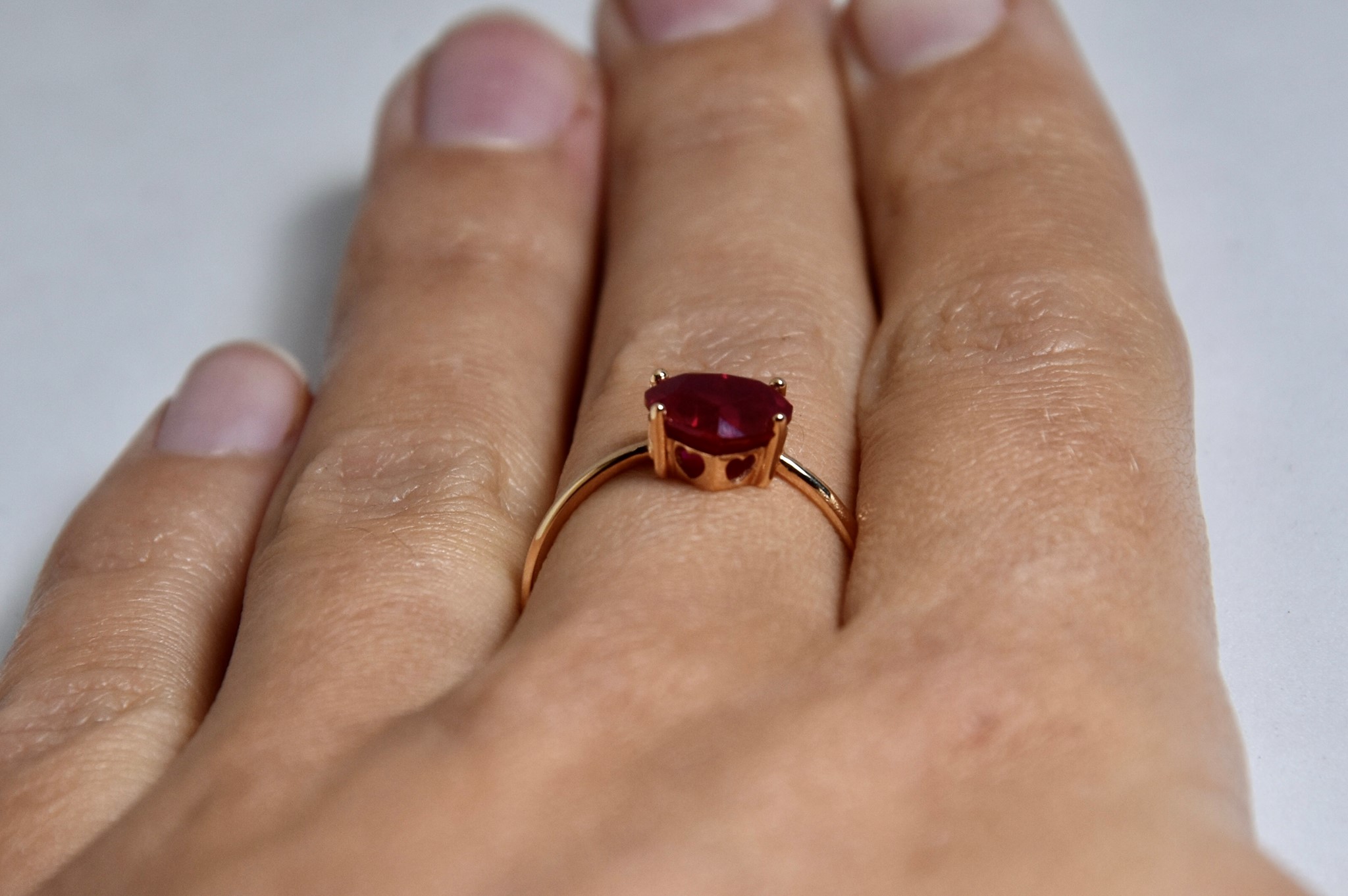Anello in oro rosa 750/00 con pietra rossa sintetica a forma di cuore. Peso anello 1,70g.