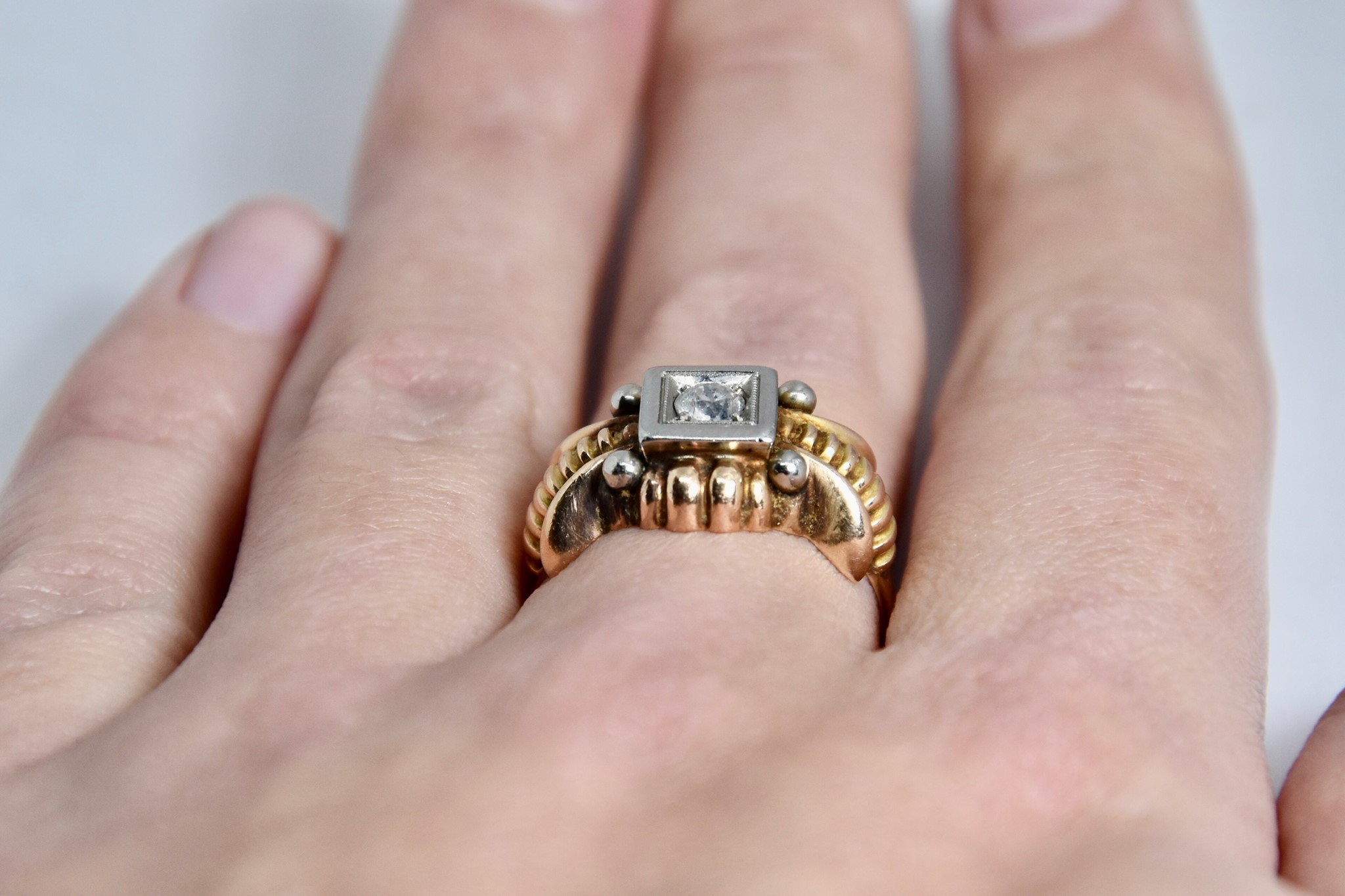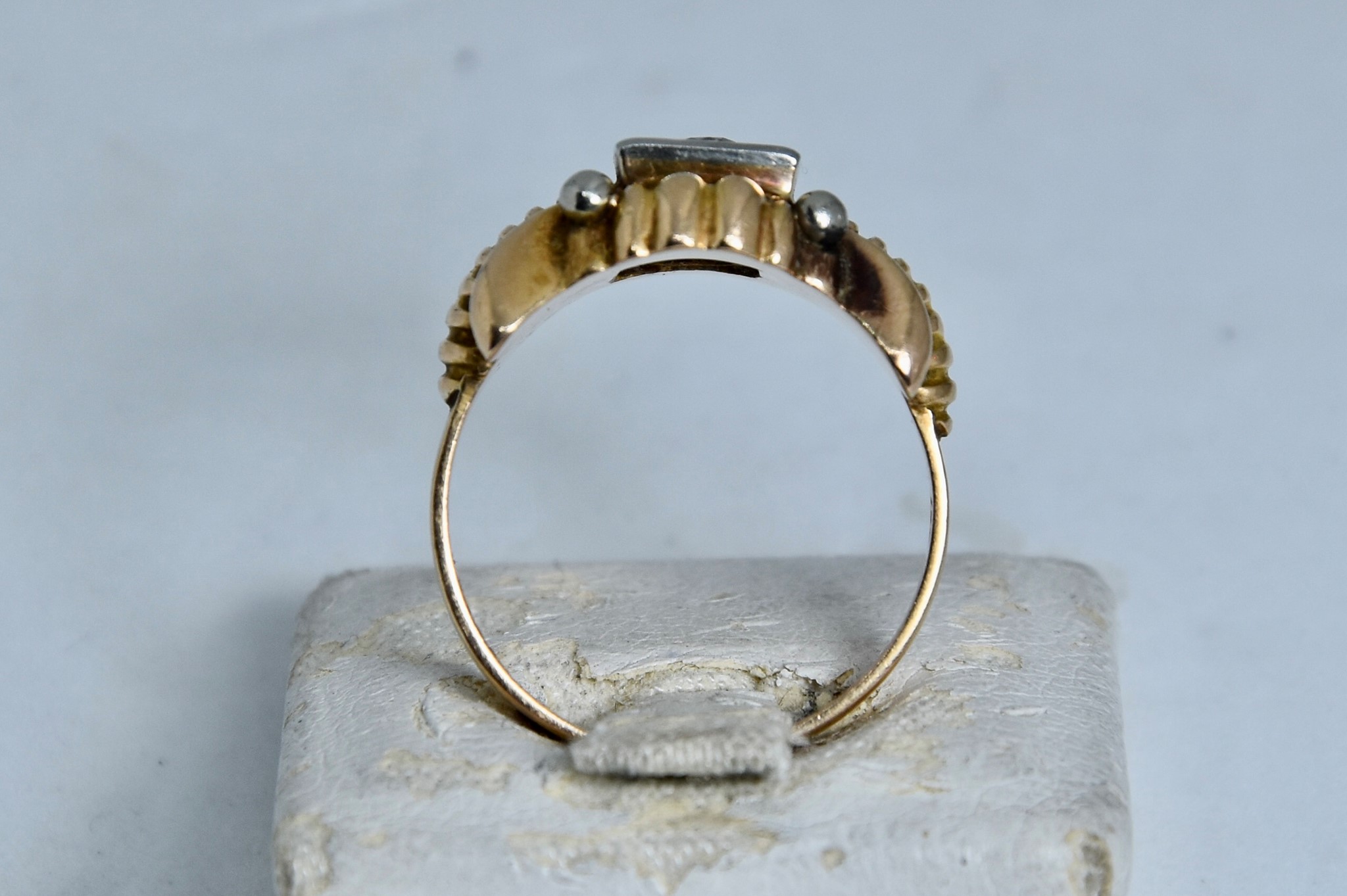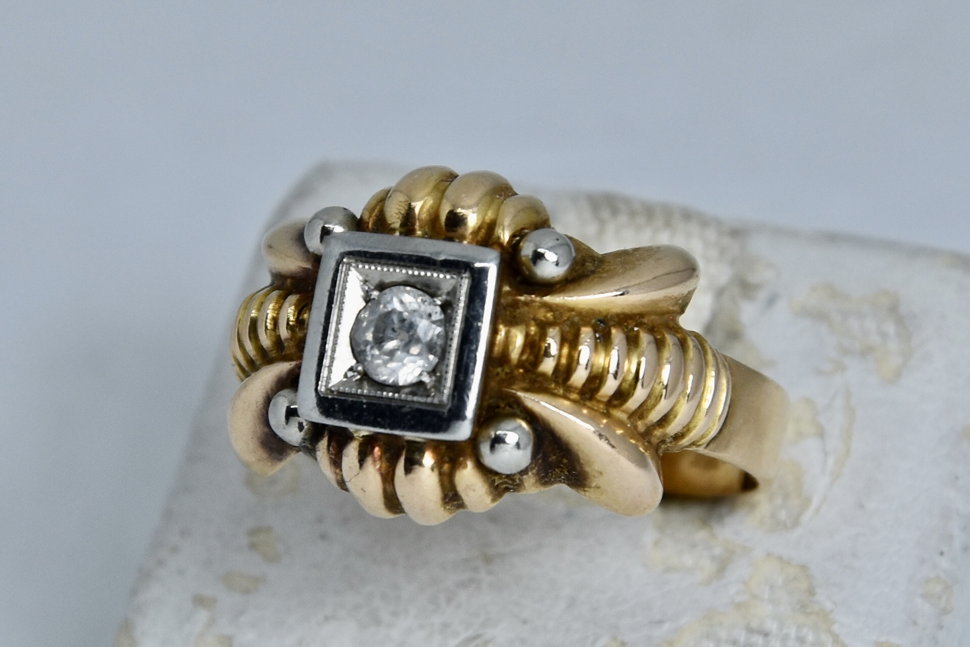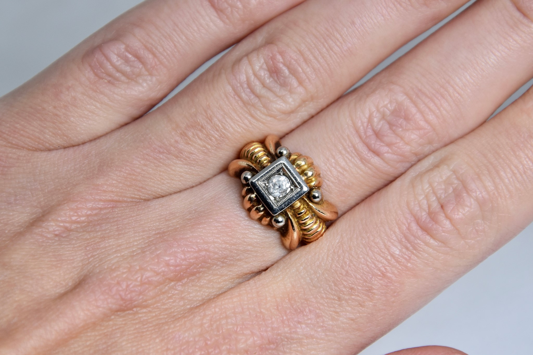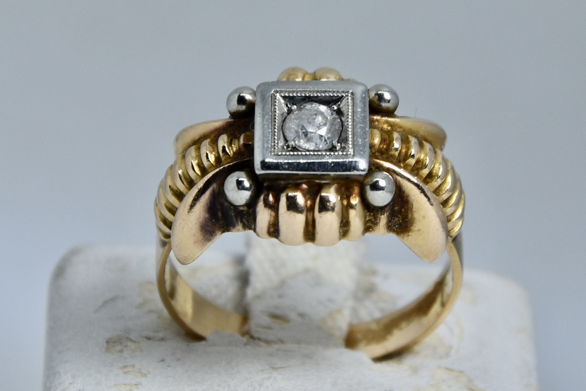Anello anni '40 circa in oro rosa e bianco 750/00 e diamanti taglio antico di 0,21ct. Peso di 4,75g.