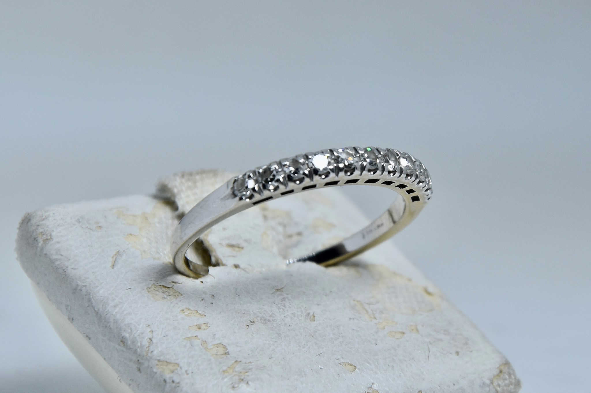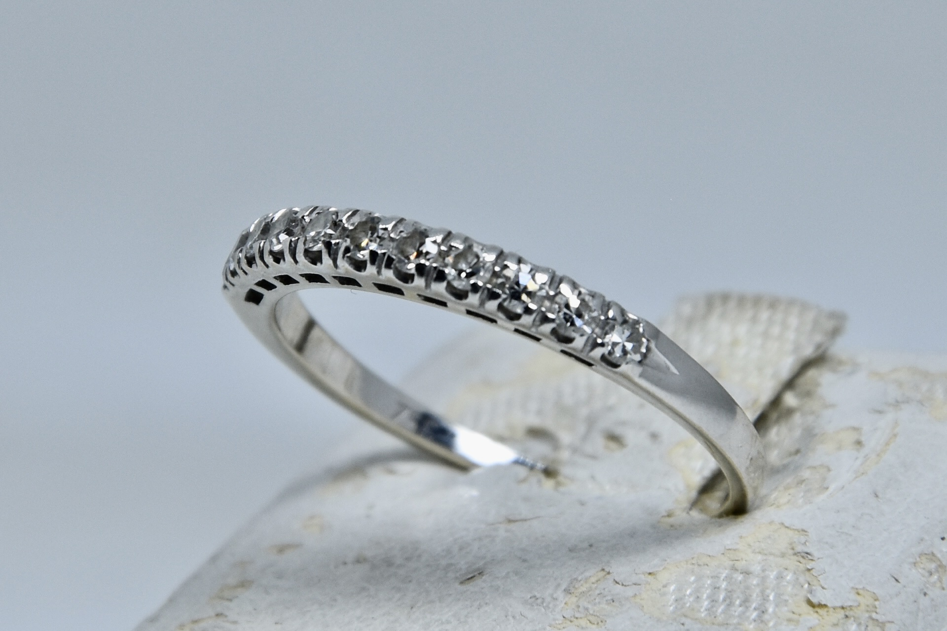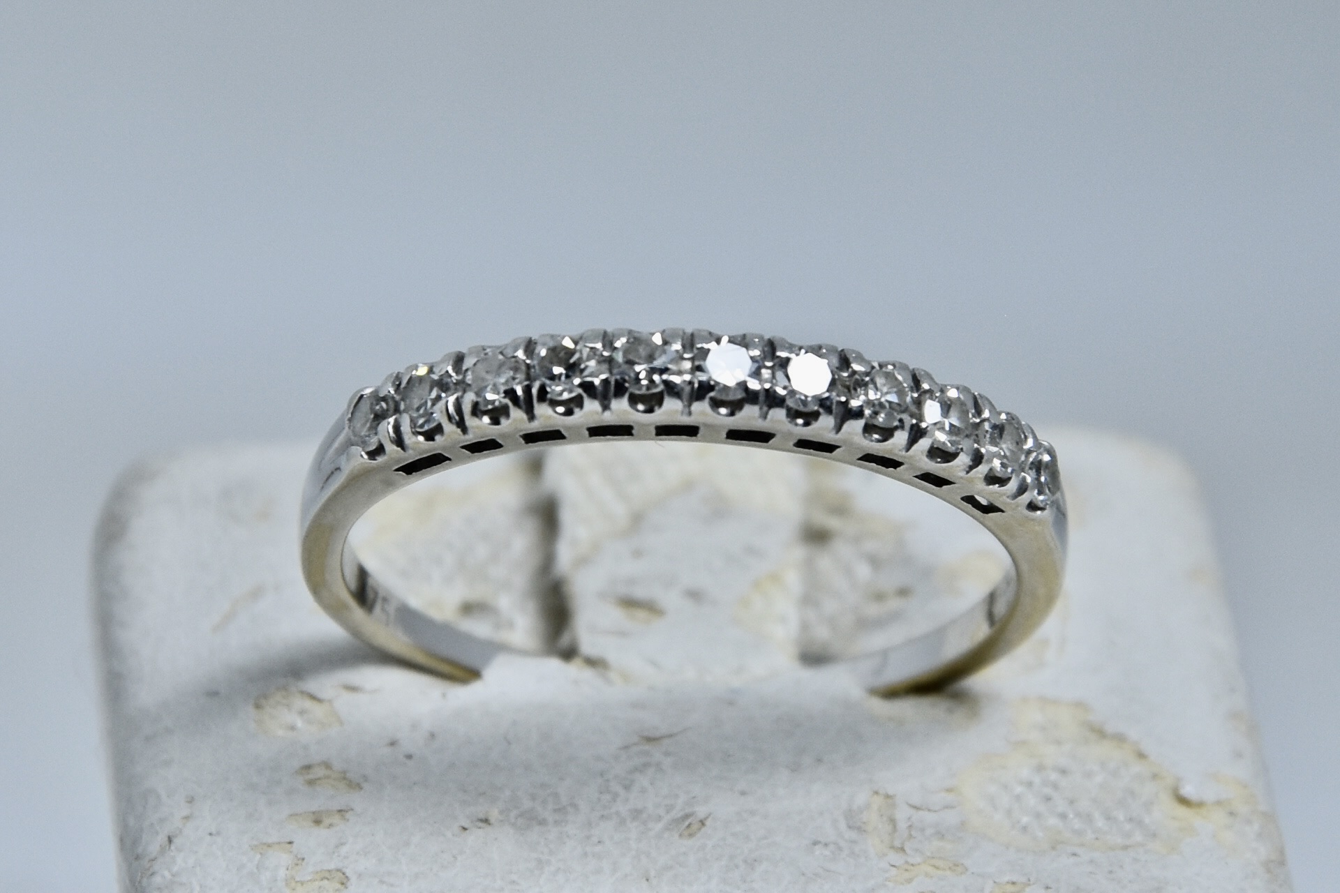 Anello fedina in oro bianco 750/00 con 11 diamanti taglio brillante tot. 0,16ct circa. Peso anello 2,00g.