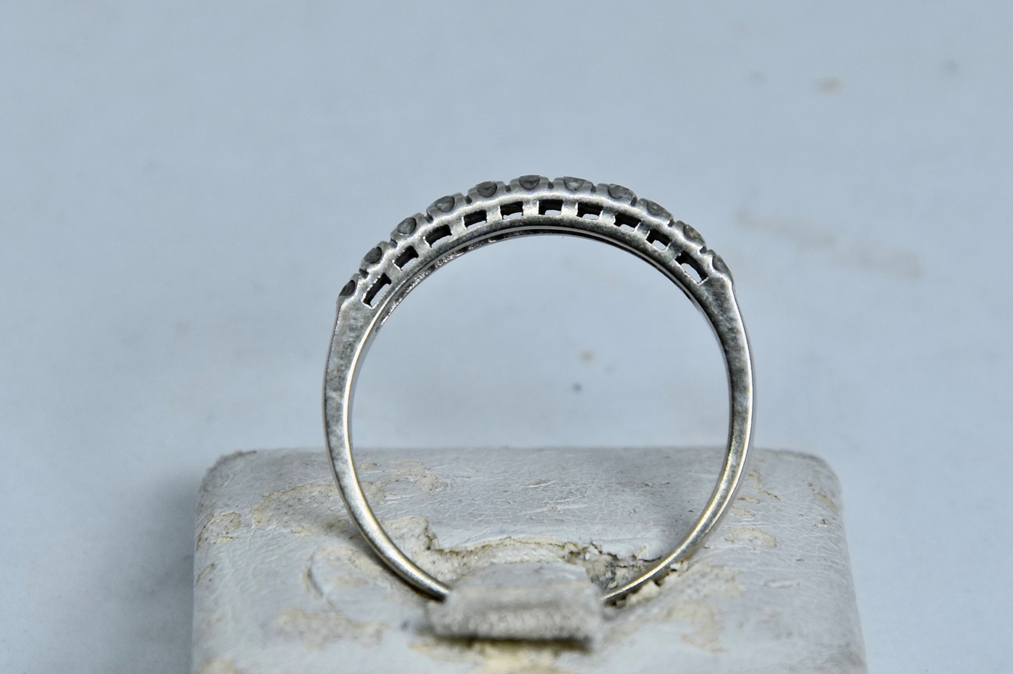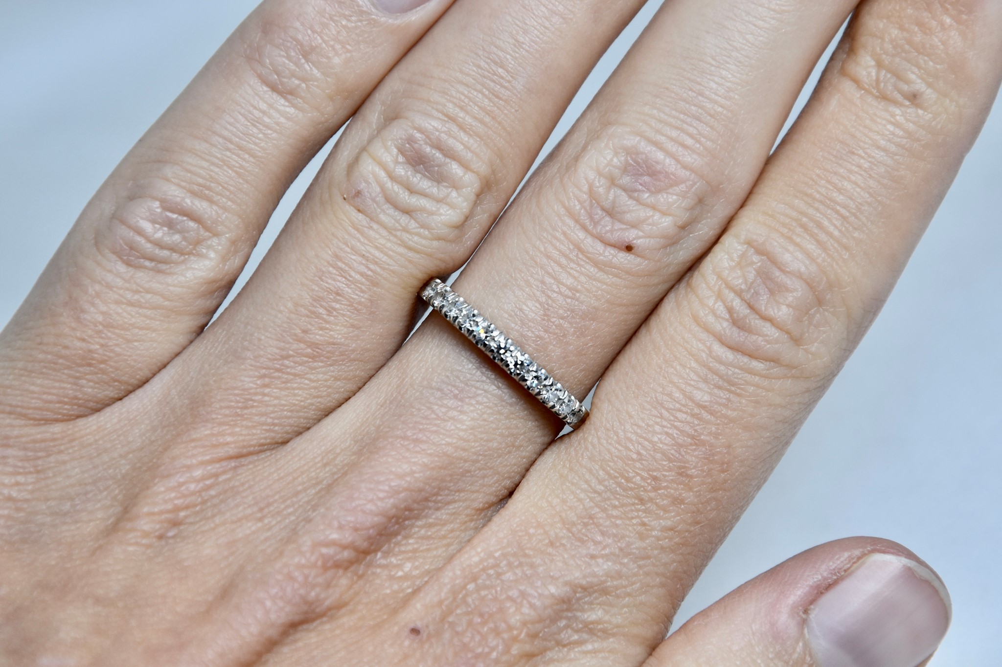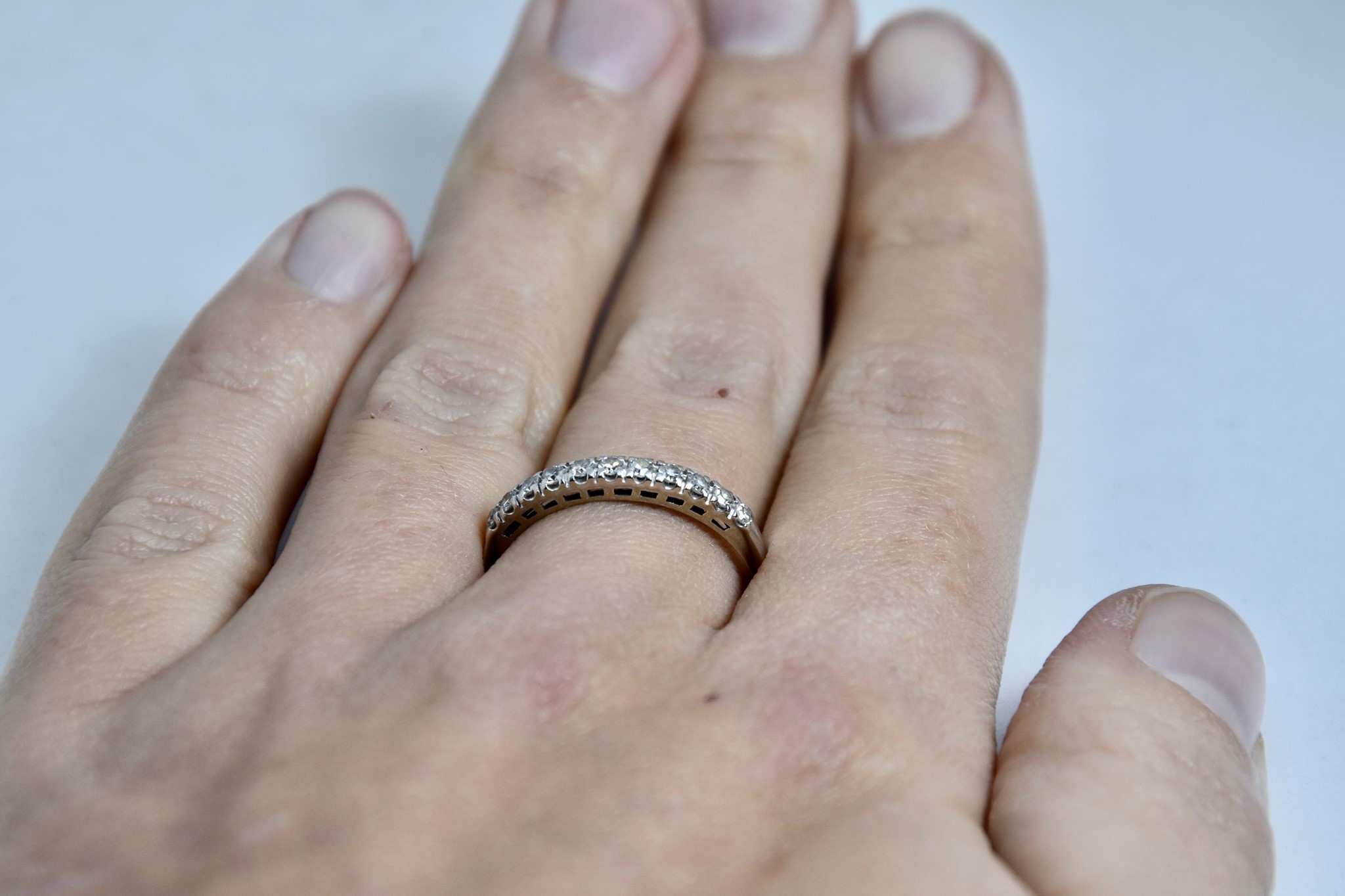 Anello fedina in oro bianco 750/00 con 11 diamanti taglio brillante tot. 0,16ct circa. Peso anello 2,00g.