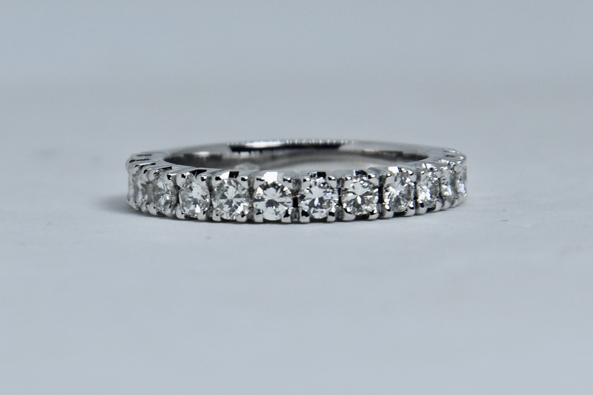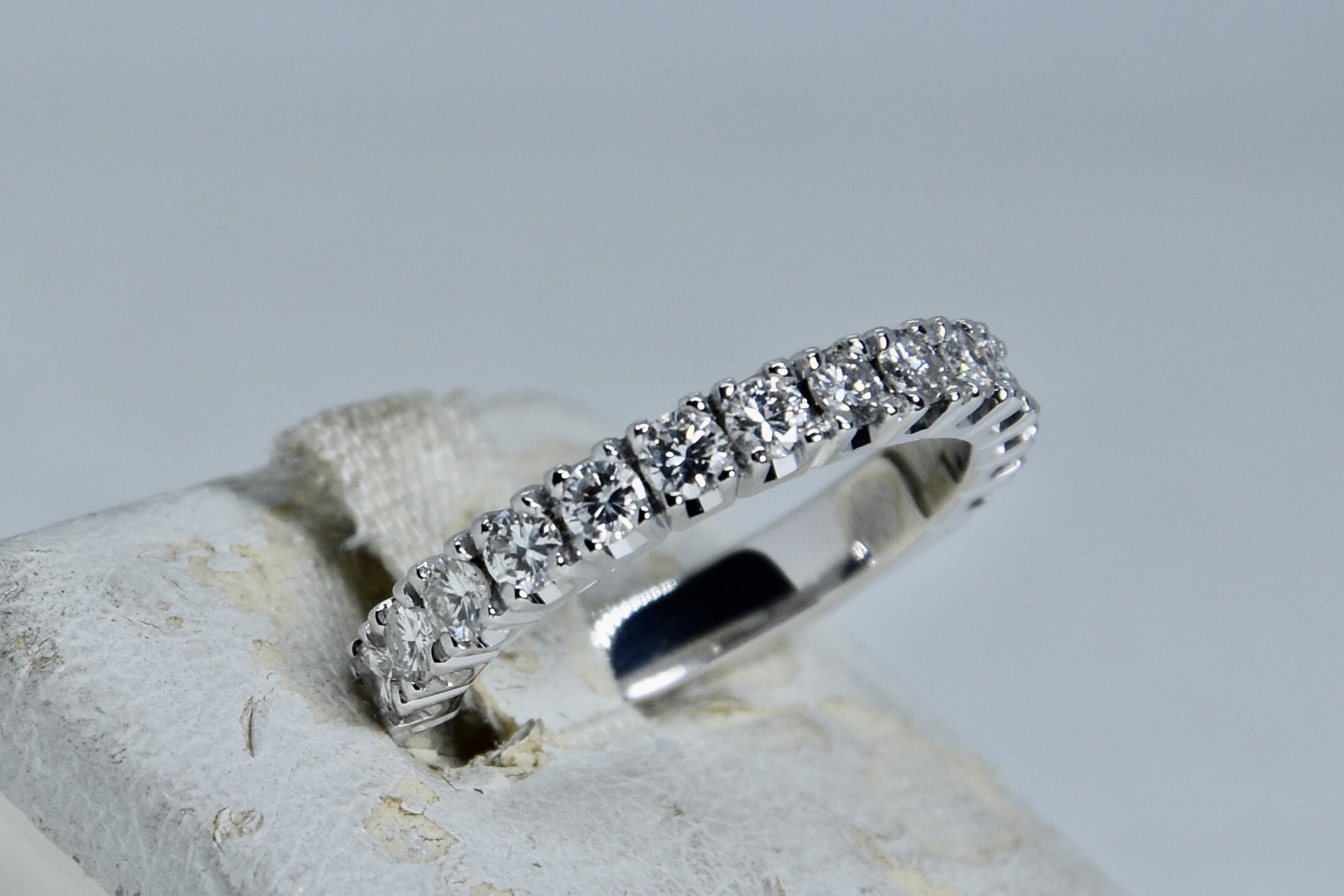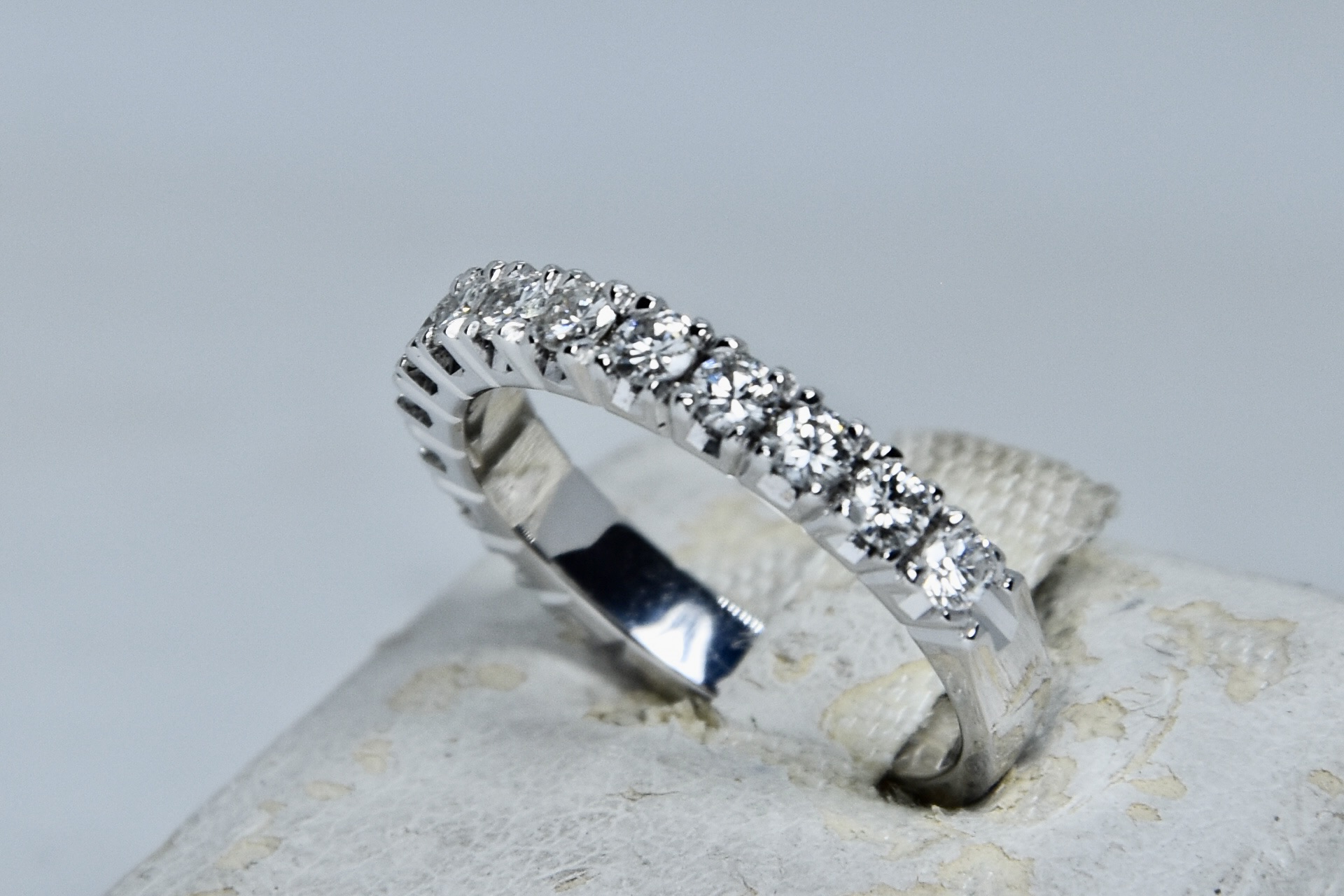 Anello fedina in oro bianco 750/00 con 14 diamanti taglio brillante totale 0,80ct (14 x 0,057); I color; VS2. Peso anello 4,05 g.