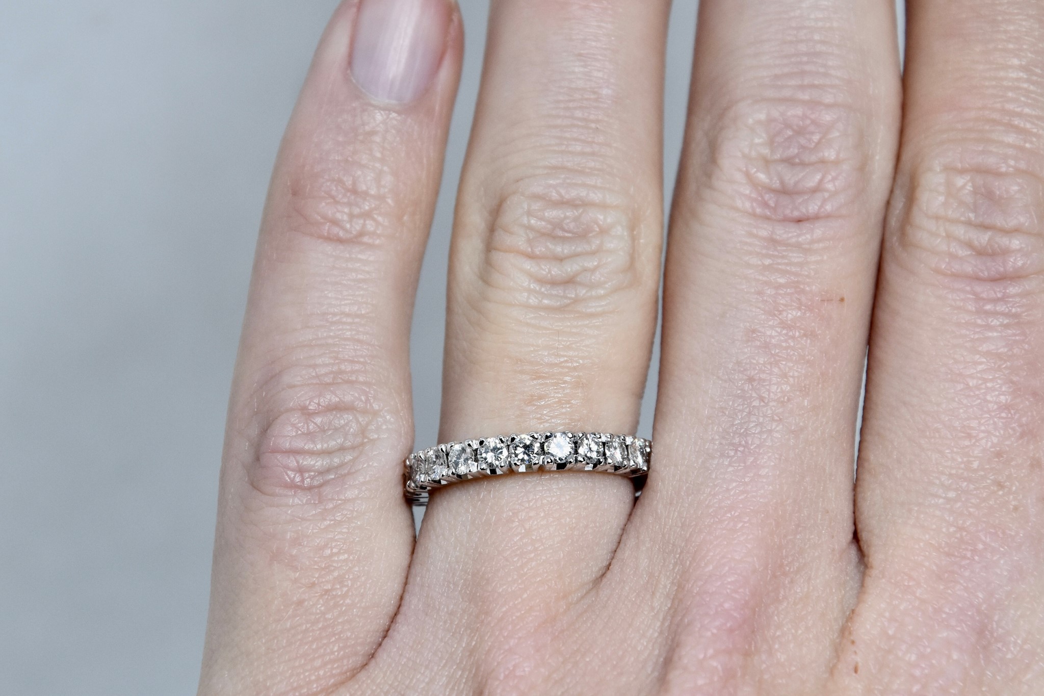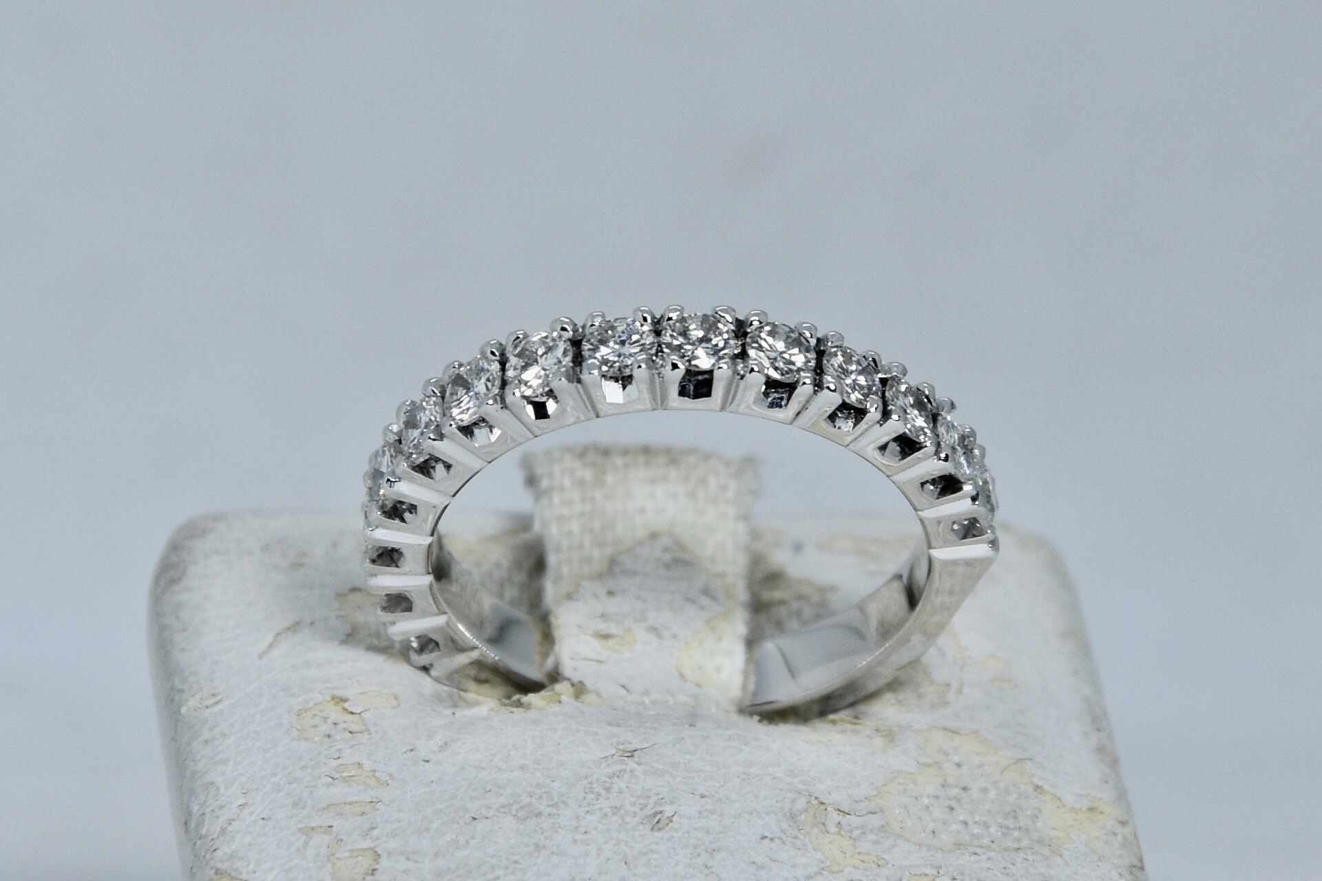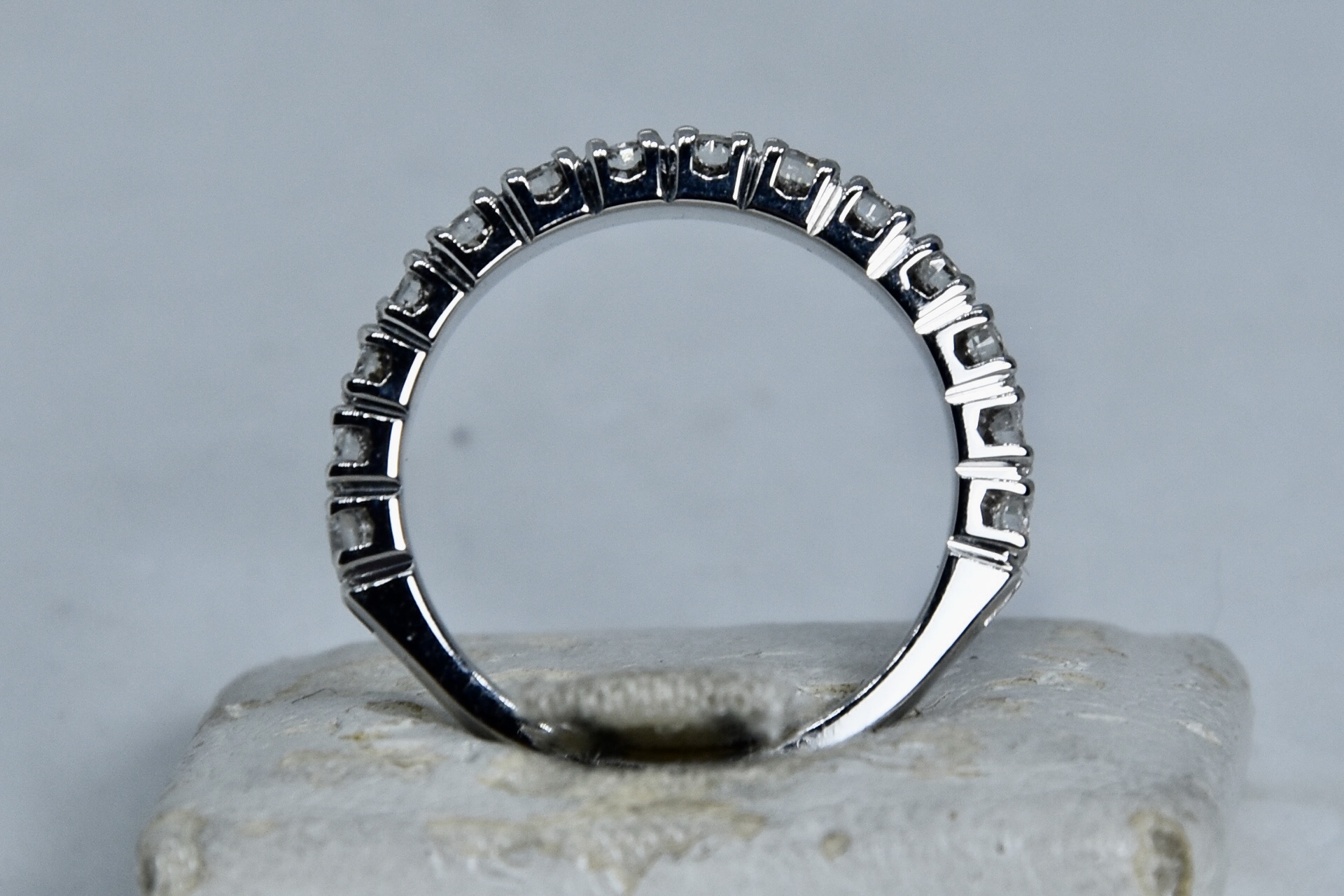 Anello fedina in oro bianco 750/00 con 14 diamanti taglio brillante totale 0,80ct (14 x 0,057); I color; VS2. Peso anello 4,05 g.
