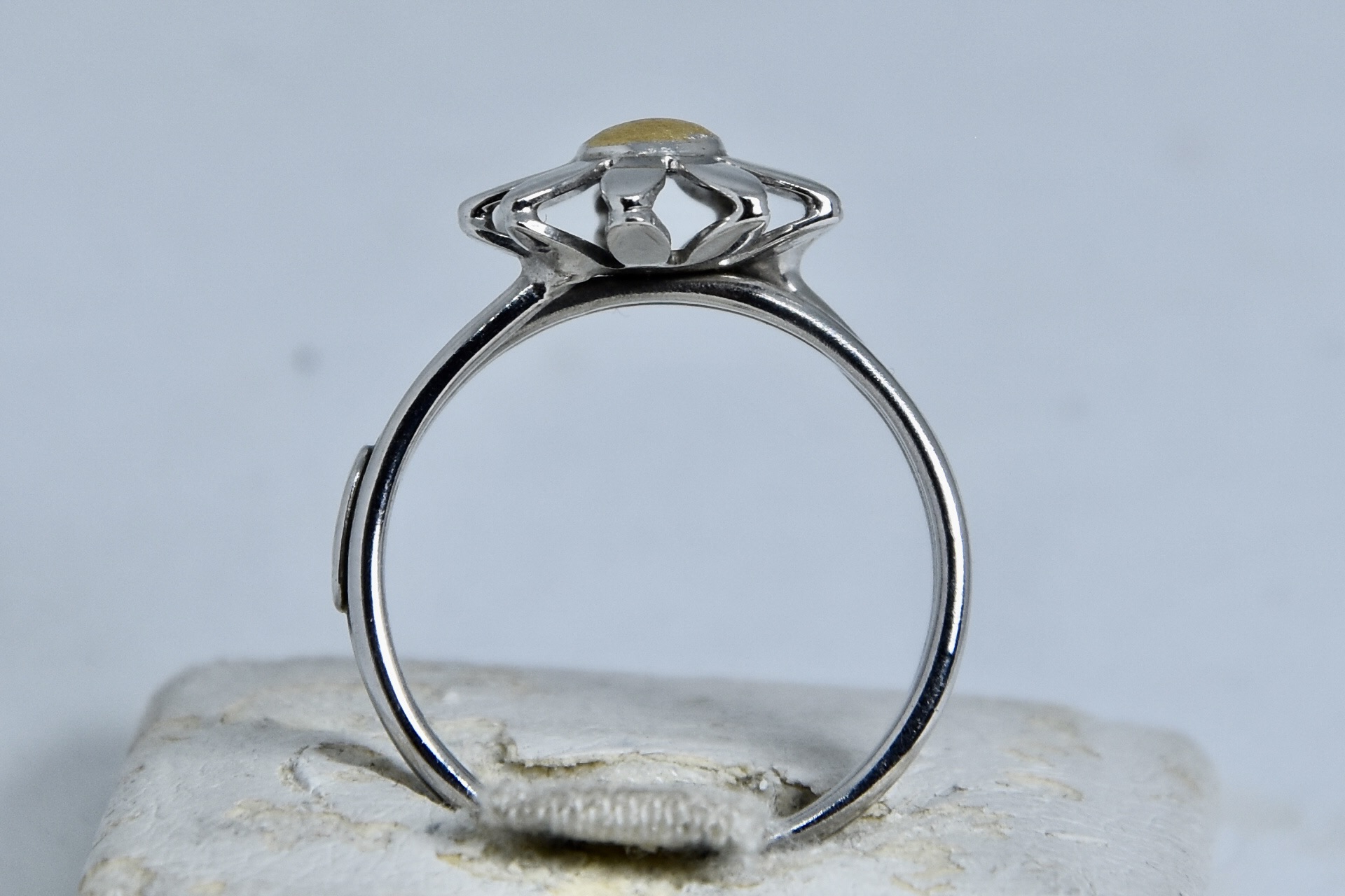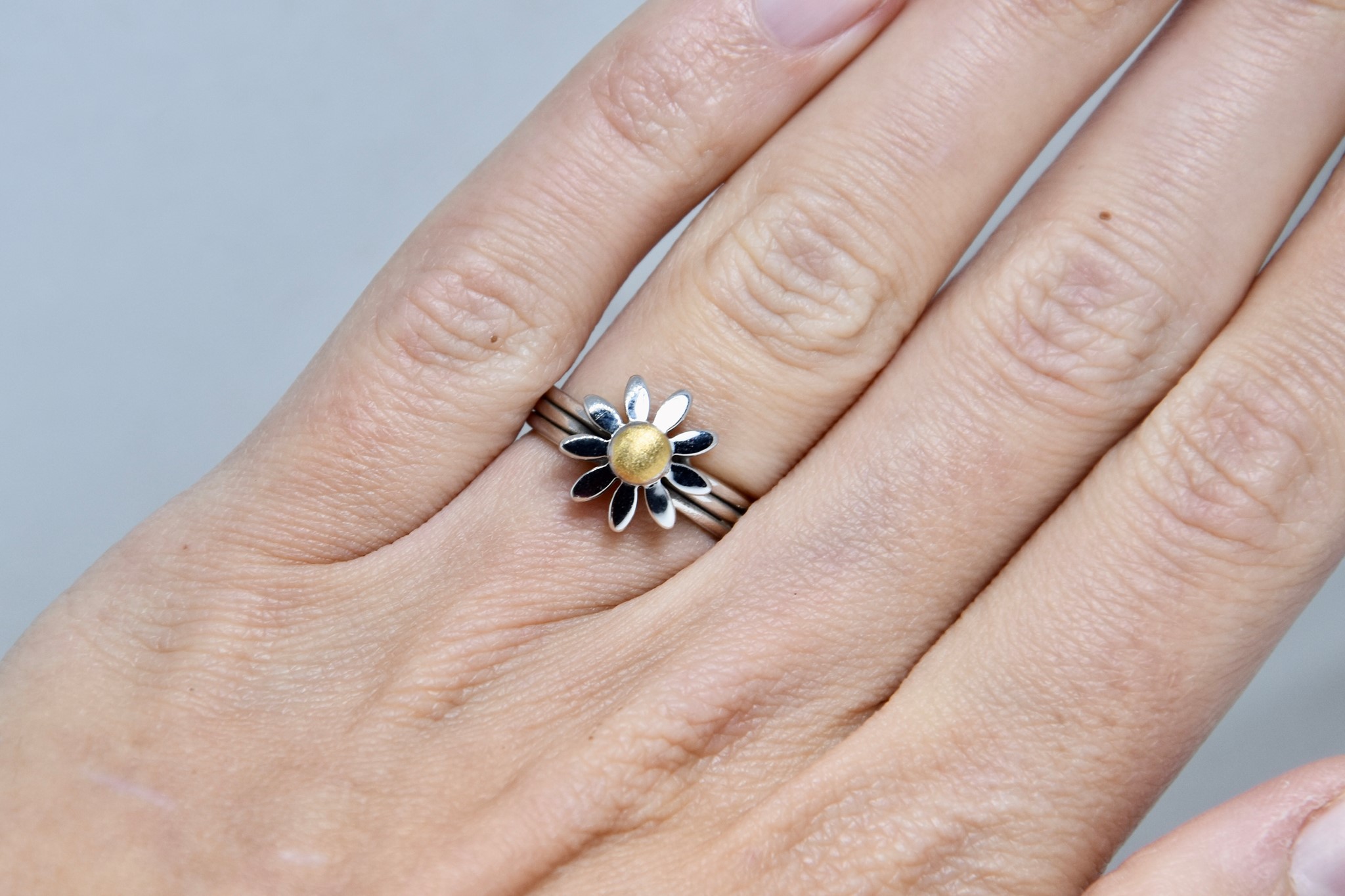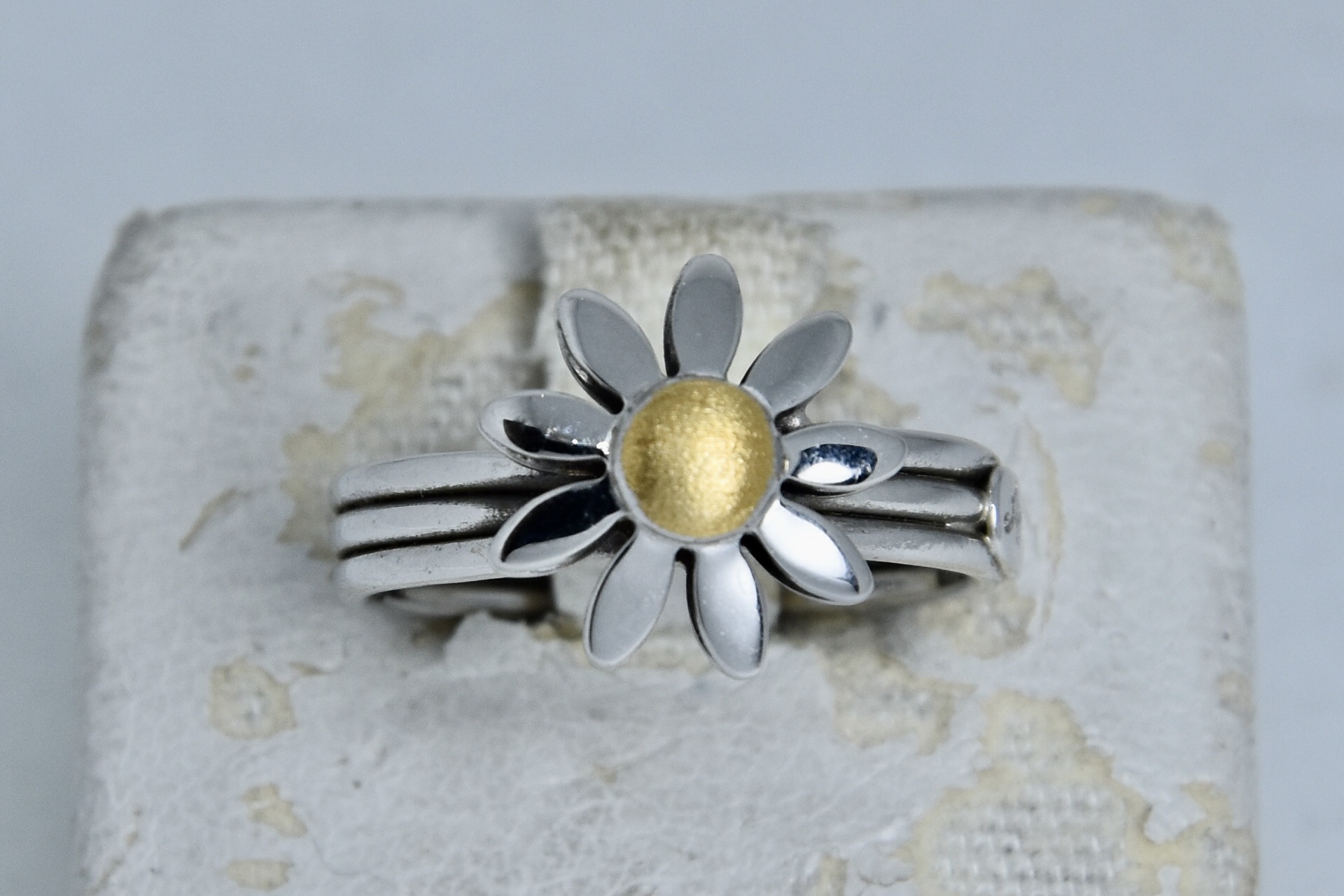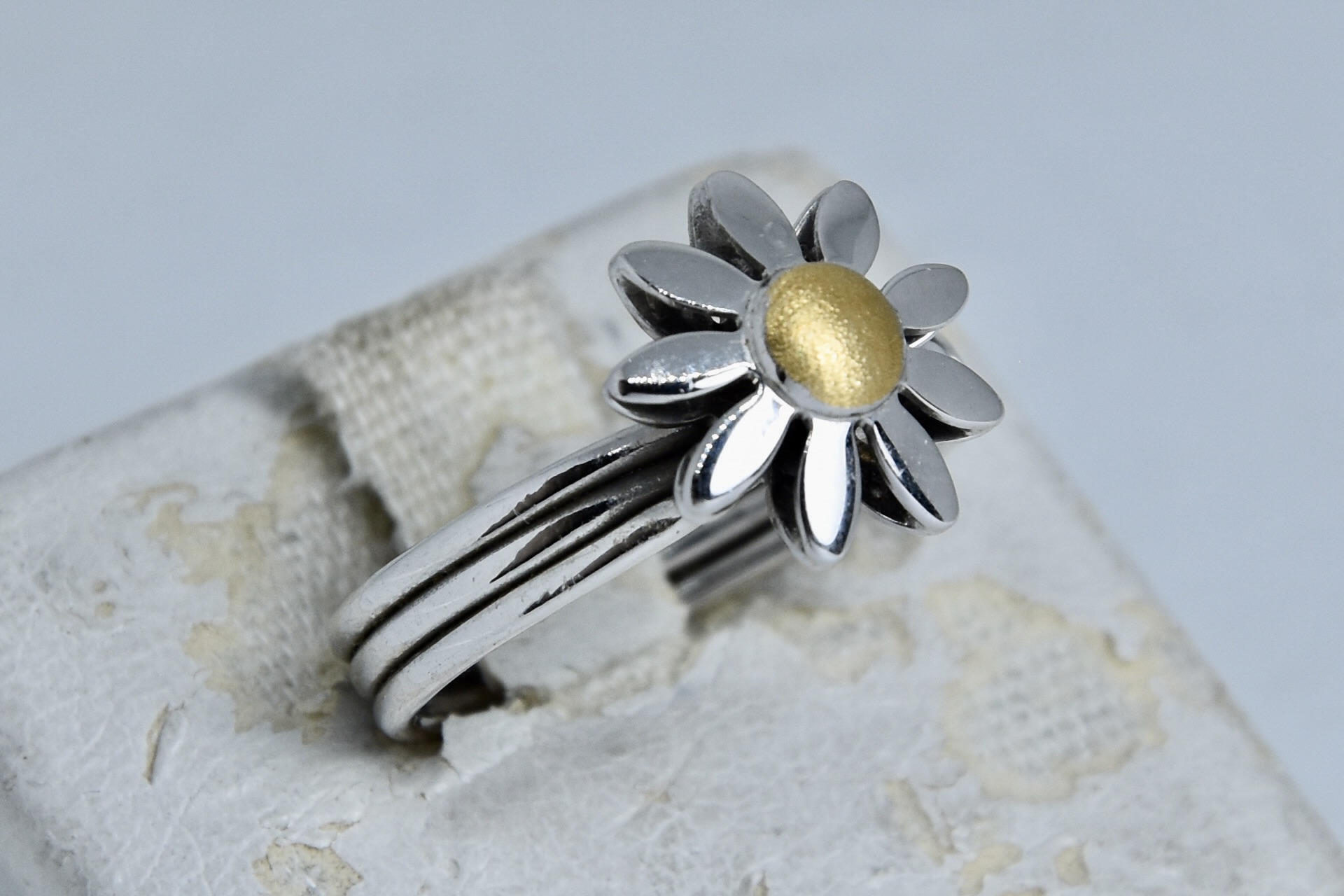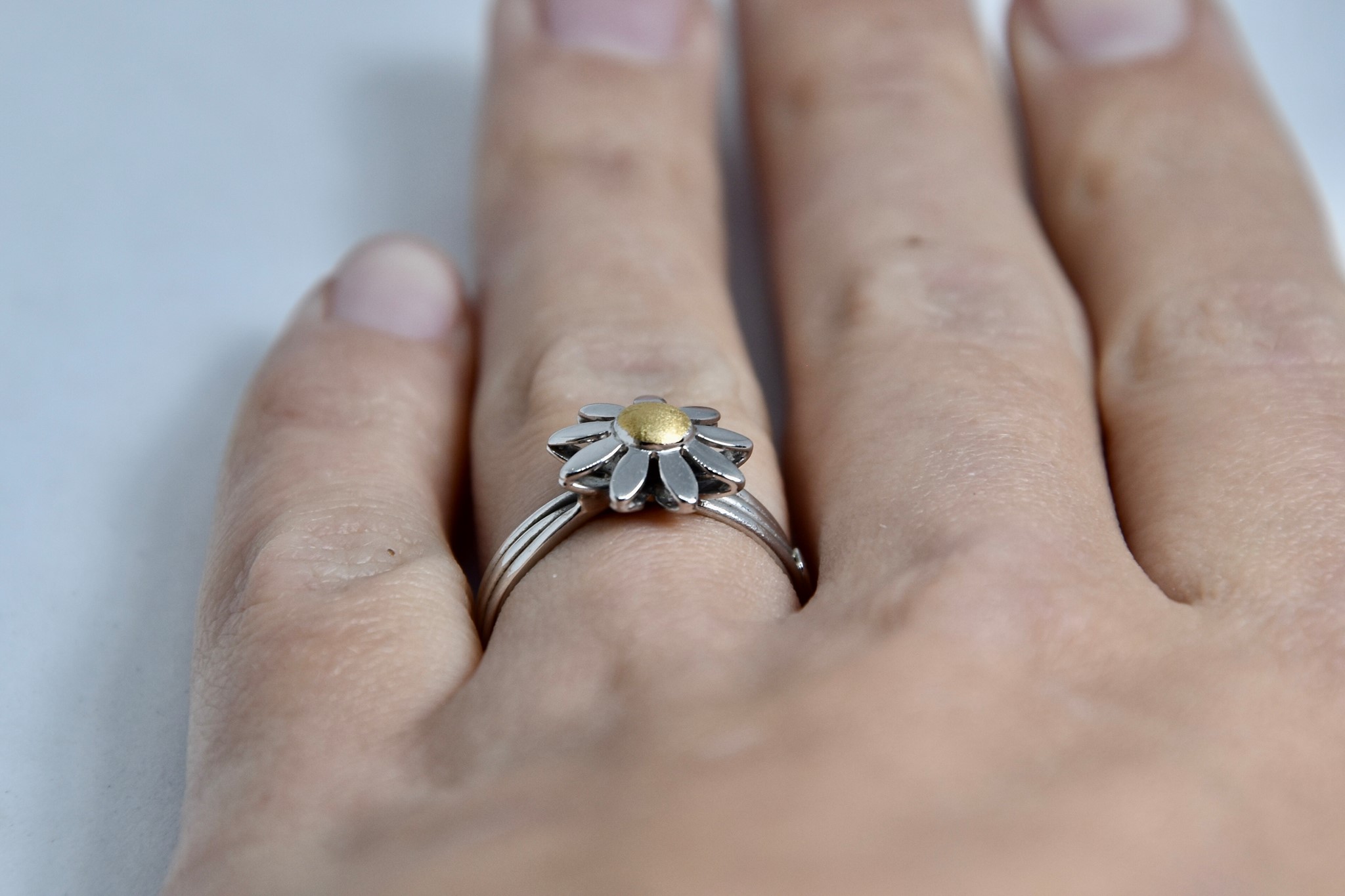 Anello oro bianco e giallo 750/00 con margherita. Diametro fiore 1,10cm. Peso anello 2,60.