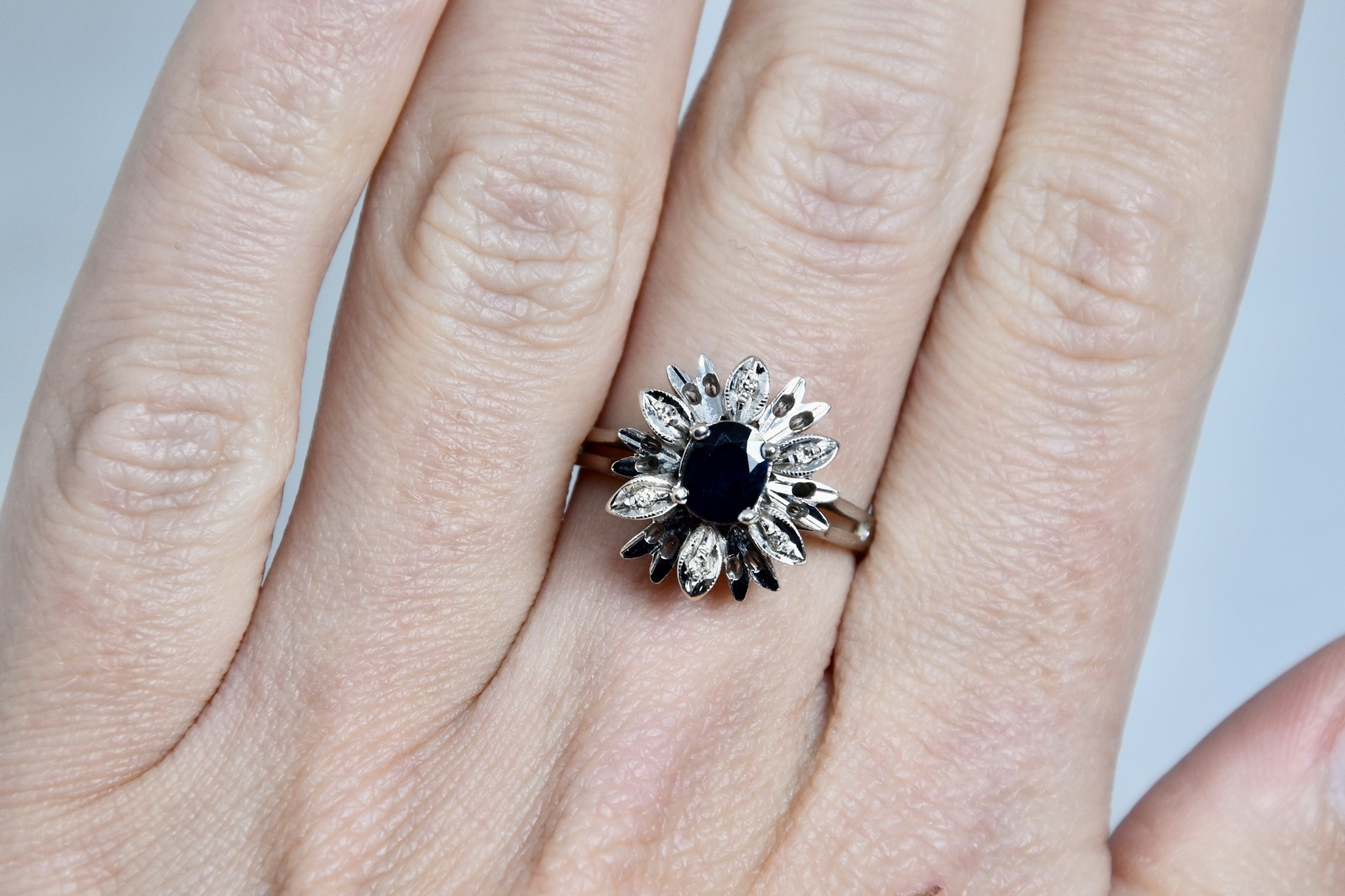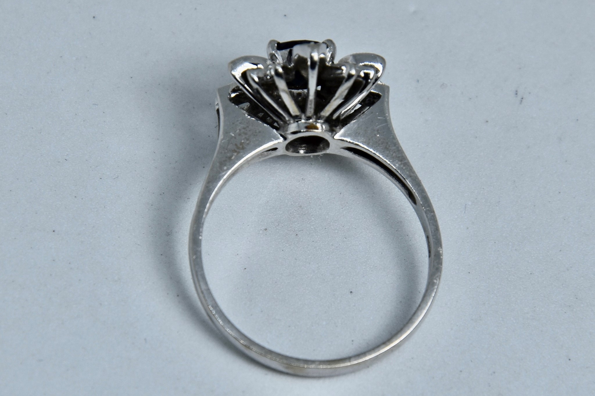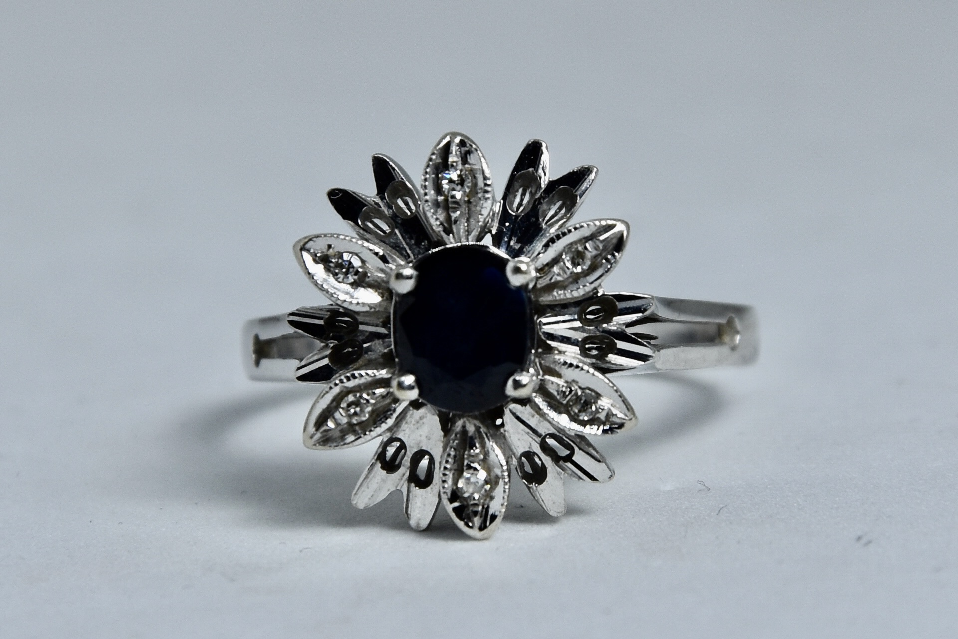 Anello margherita in oro bianco 750/00 con zaffiro naturale molto scuro di circa 0,50ct con 6 diamantini taglio huit-huit di circa 0,03ct totali. Peso 4,60g.