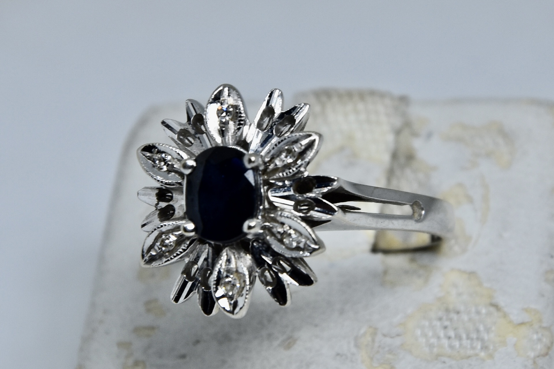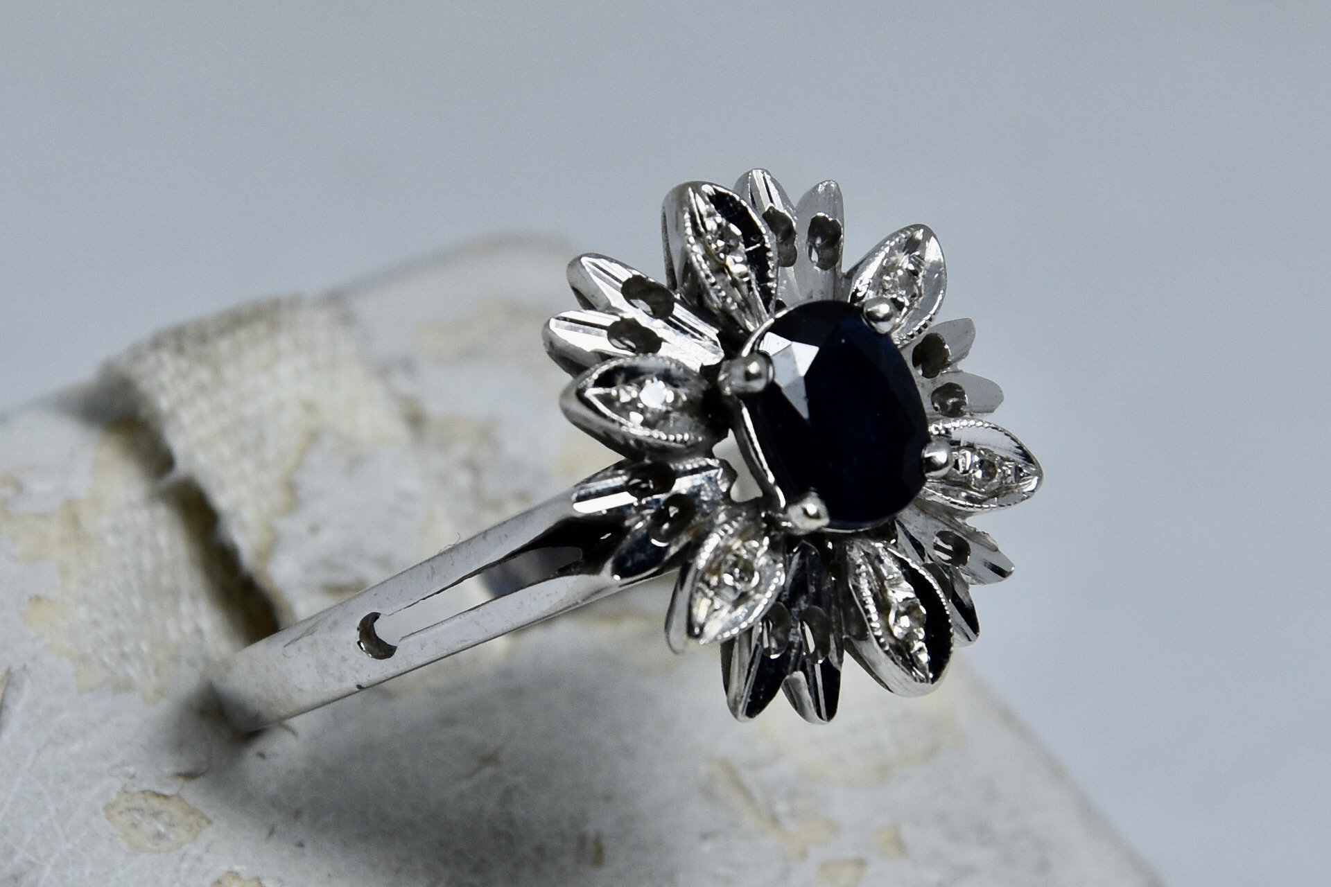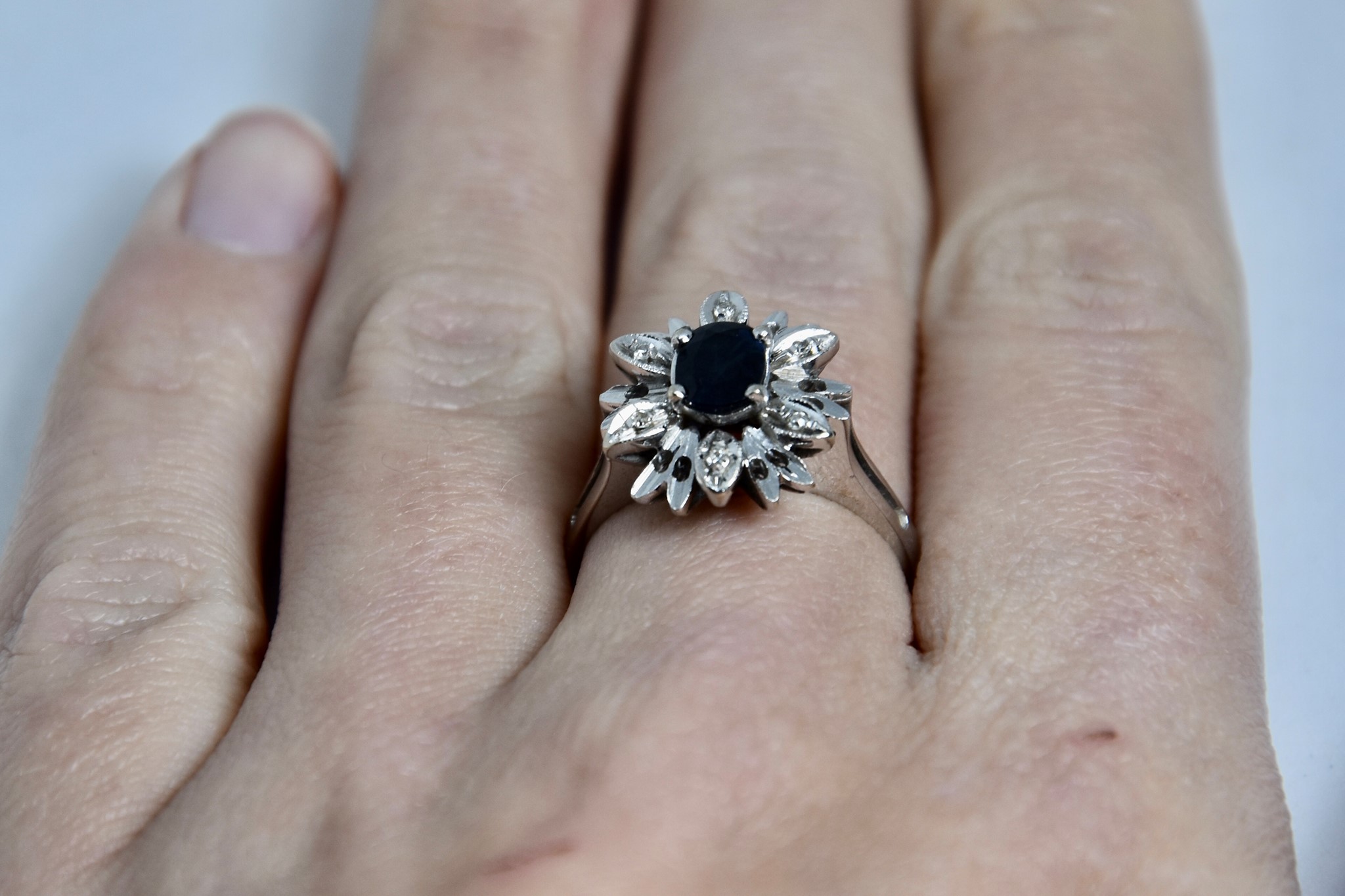 Anello margherita in oro bianco 750/00 con zaffiro naturale molto scuro di circa 0,50ct con 6 diamantini taglio huit-huit di circa 0,03ct totali. Peso 4,60g.