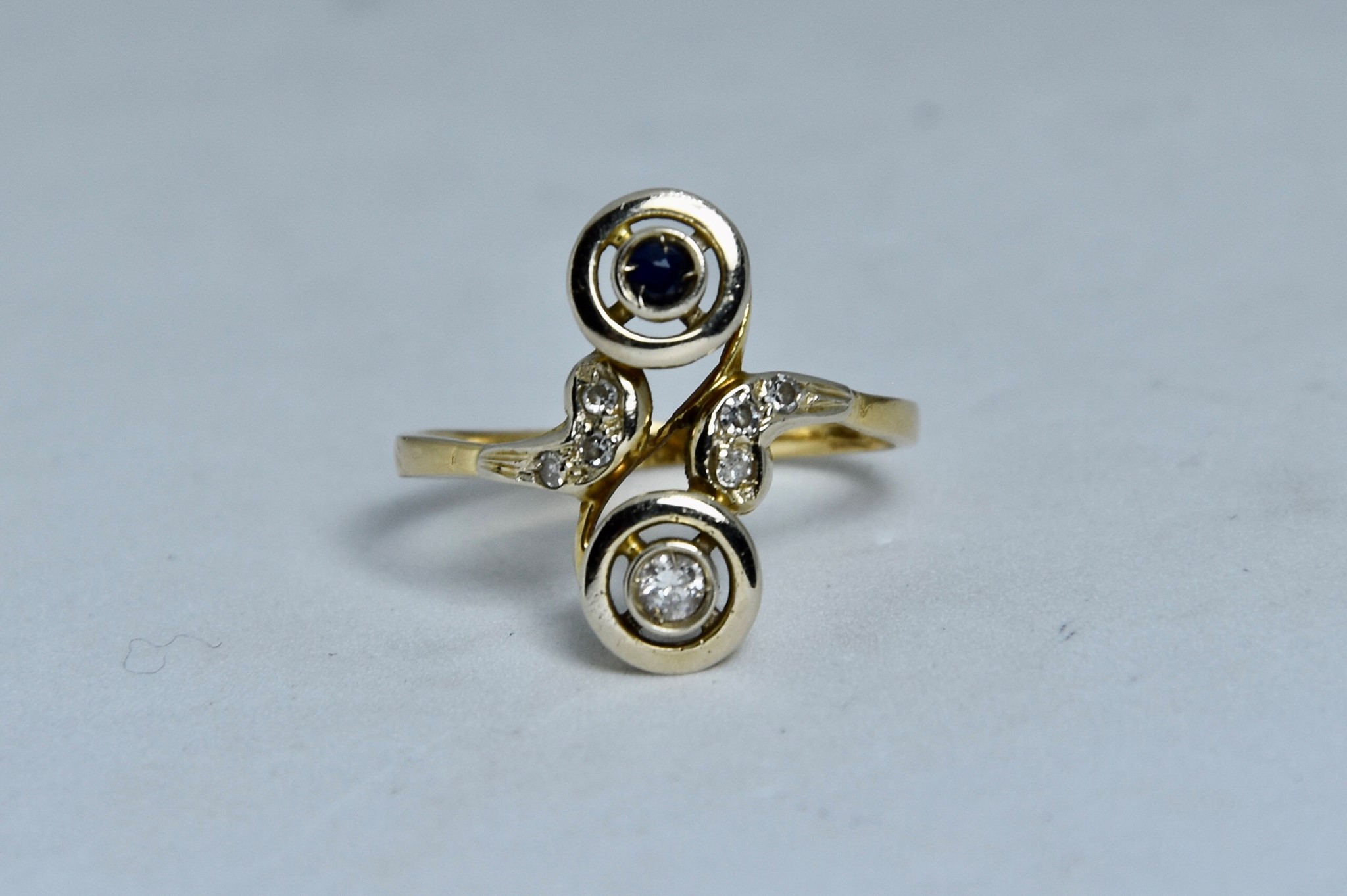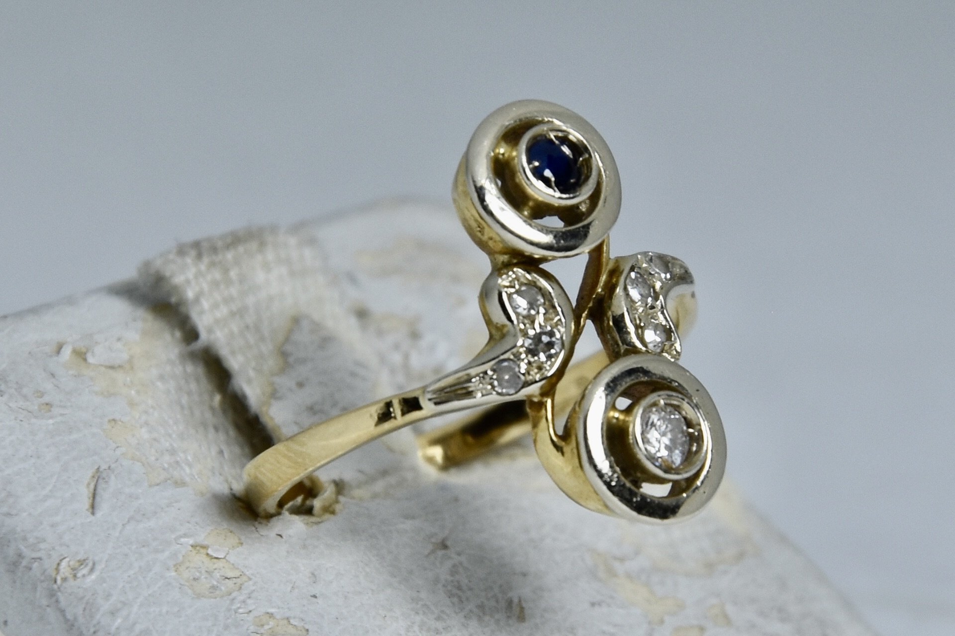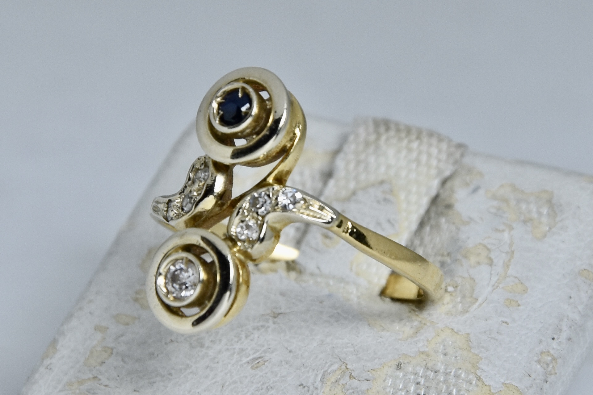 Anello in oro giallo 750/00 con radice di zaffiro e circa 0,08ct di diamanti. Peso anello 2,65g.
