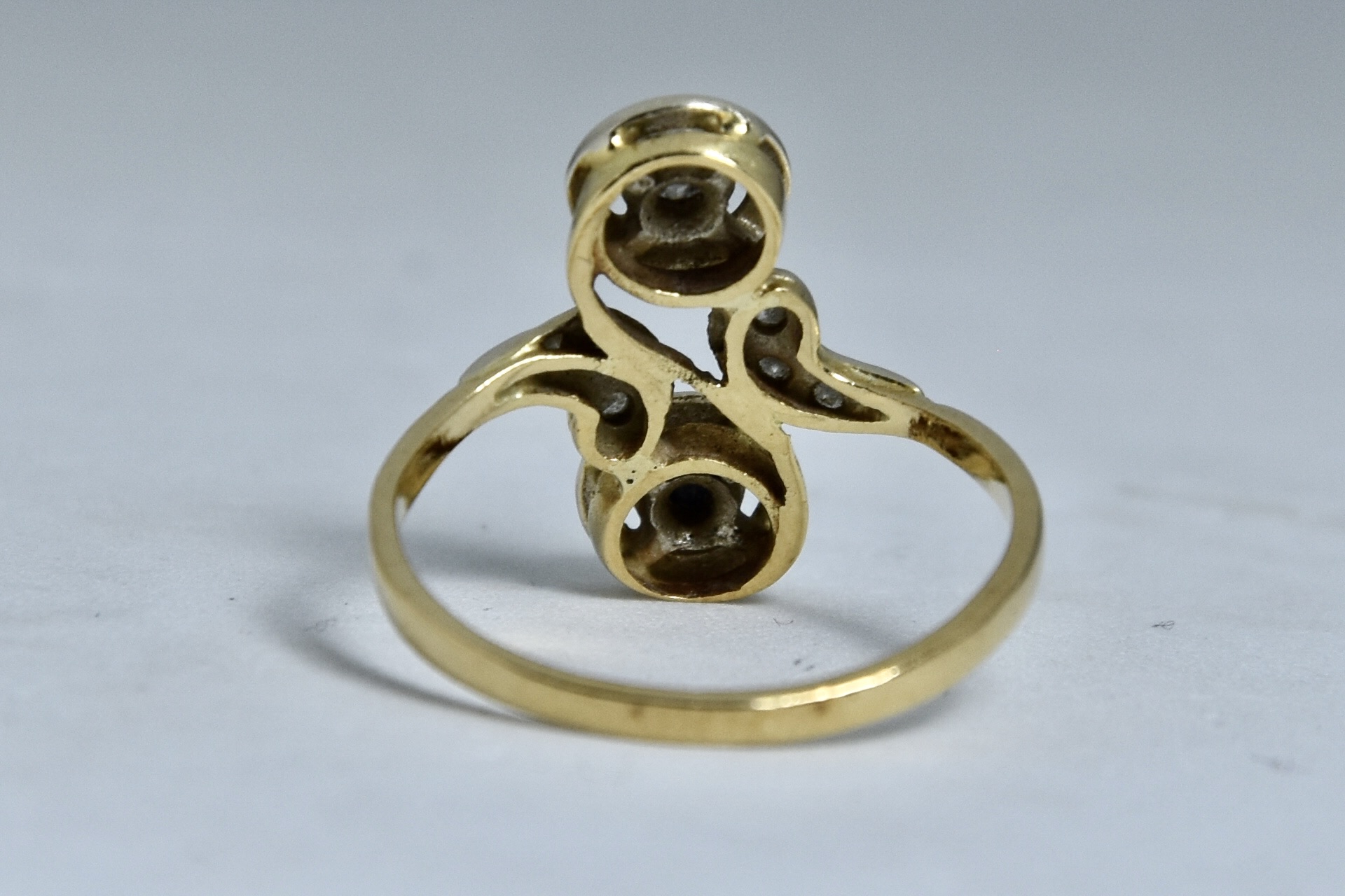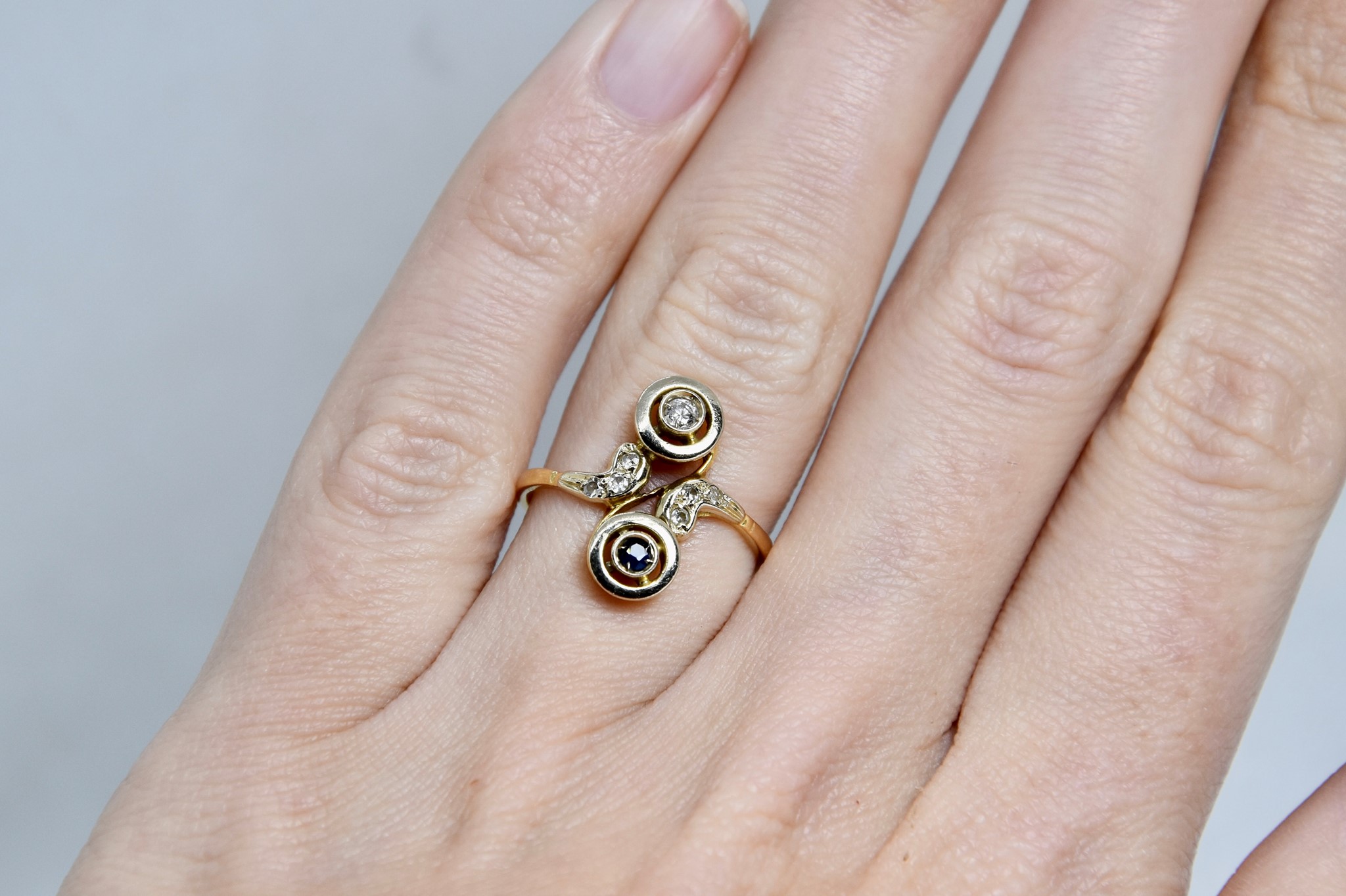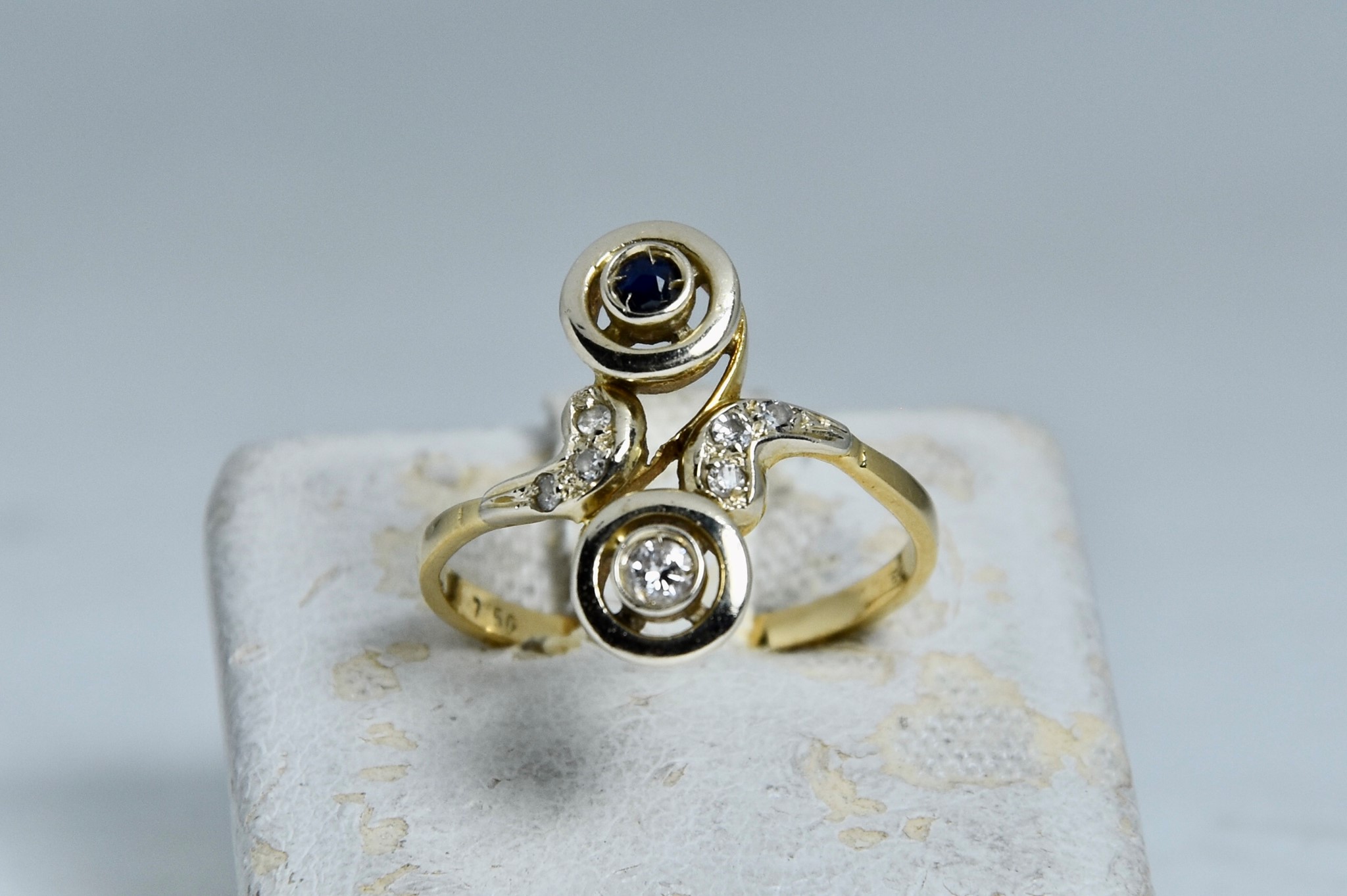 Anello in oro giallo 750/00 con radice di zaffiro e circa 0,08ct di diamanti. Peso anello 2,65g.