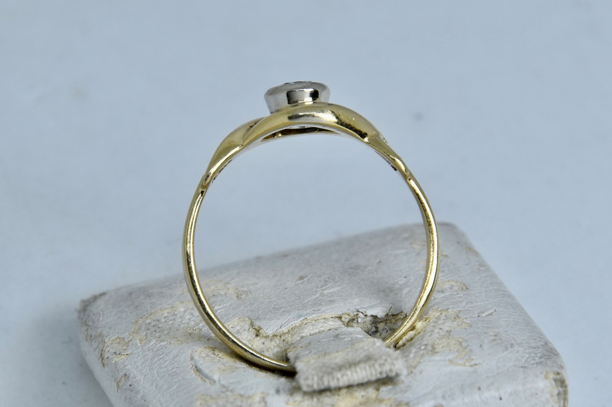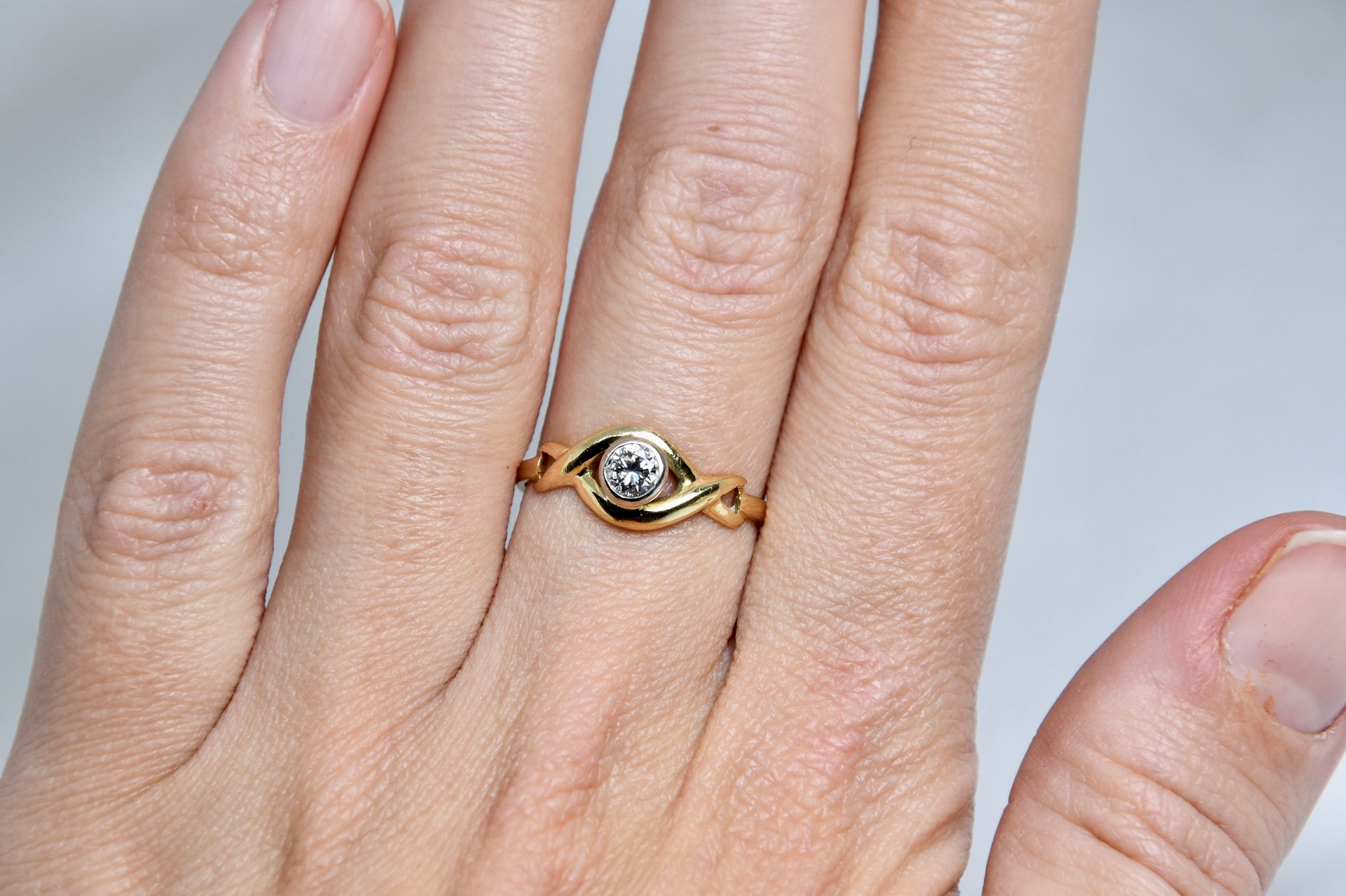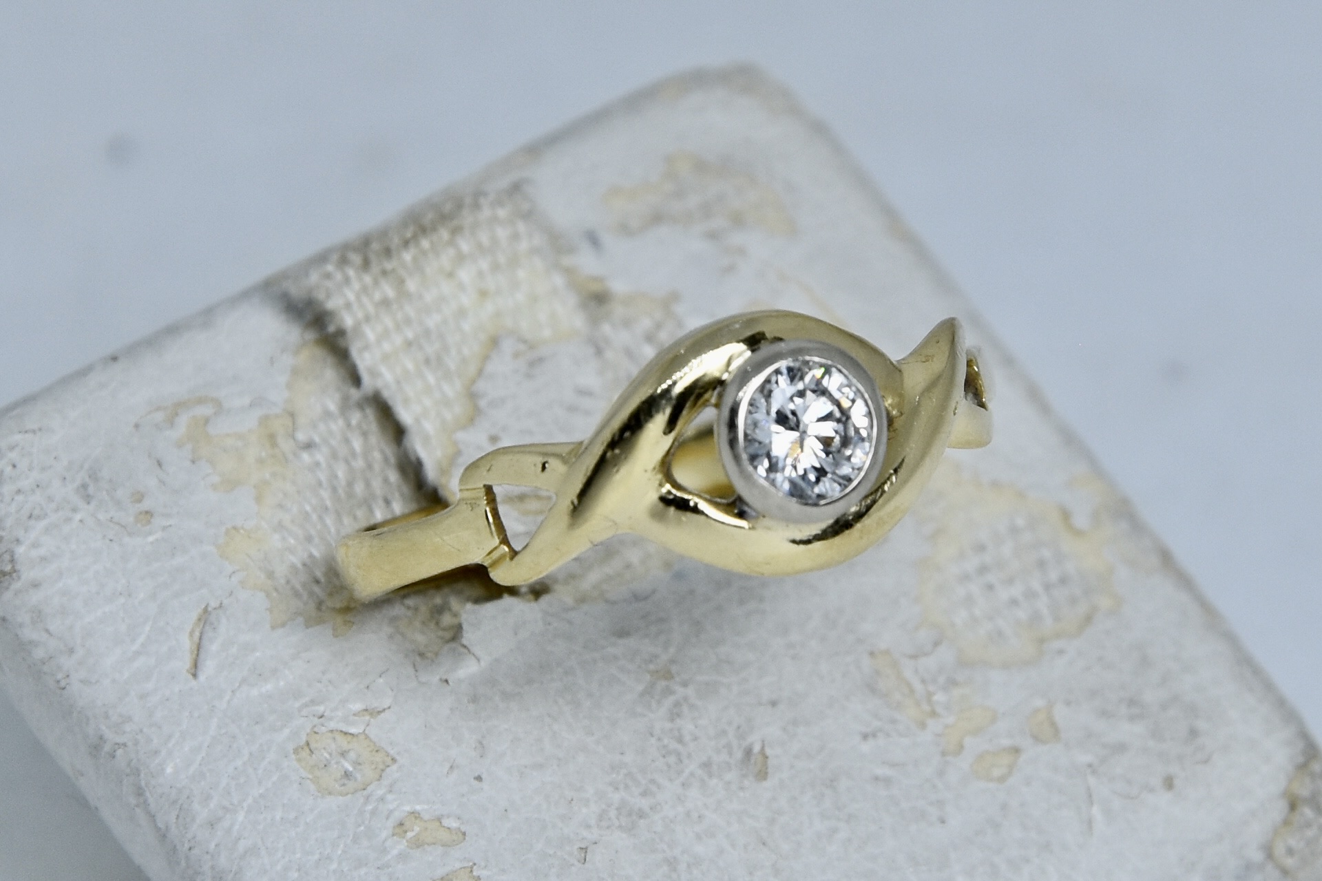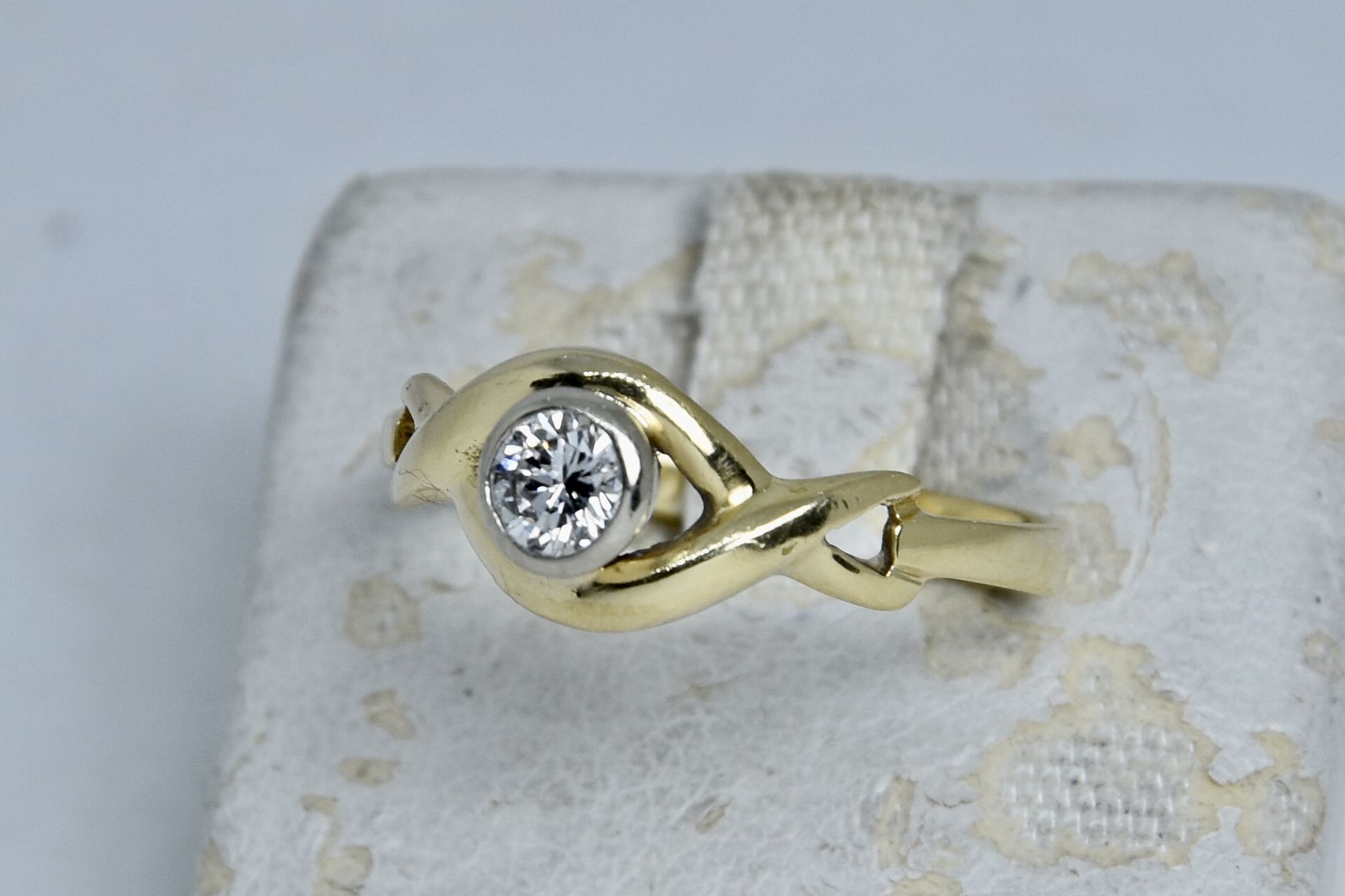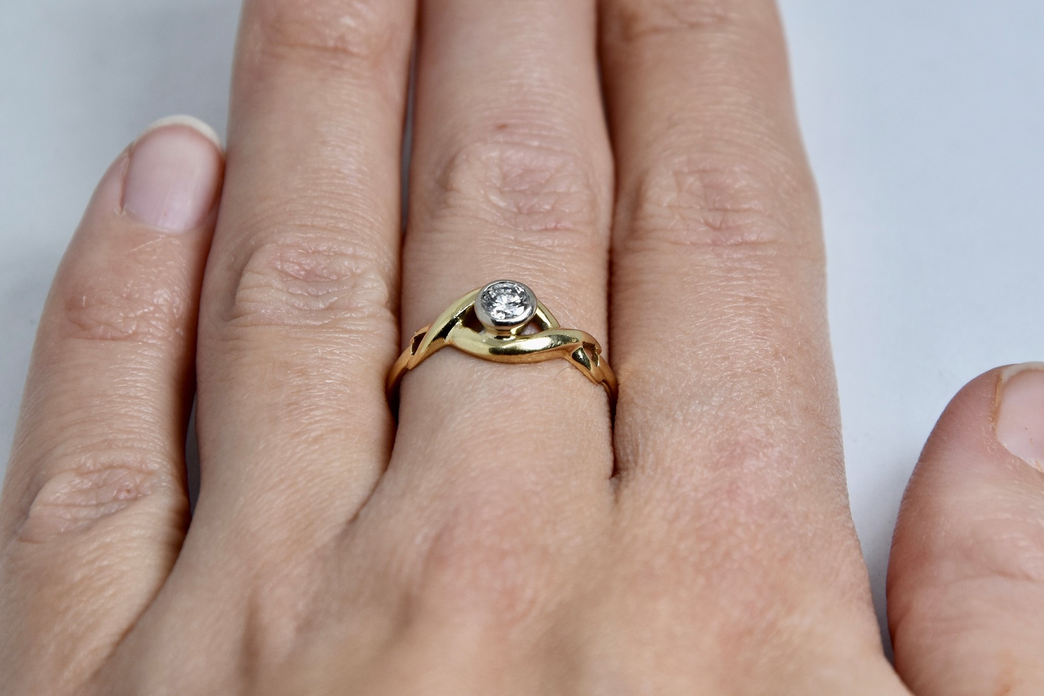 Anello solitario in oro giallo e bianco 750/00 con diamante taglio brillante 0,20ct circa; H/I color; VS1. Peso anello 2,70g.