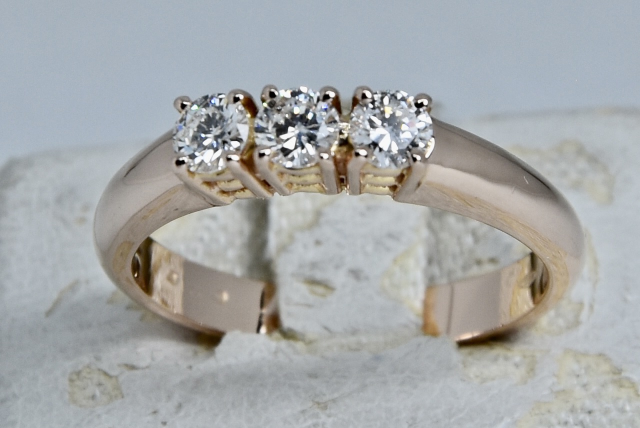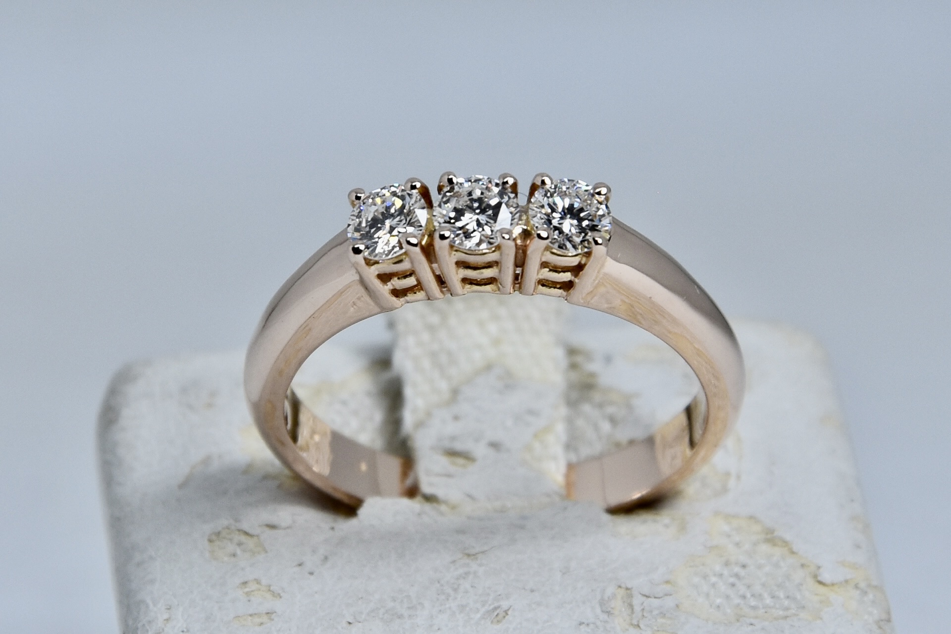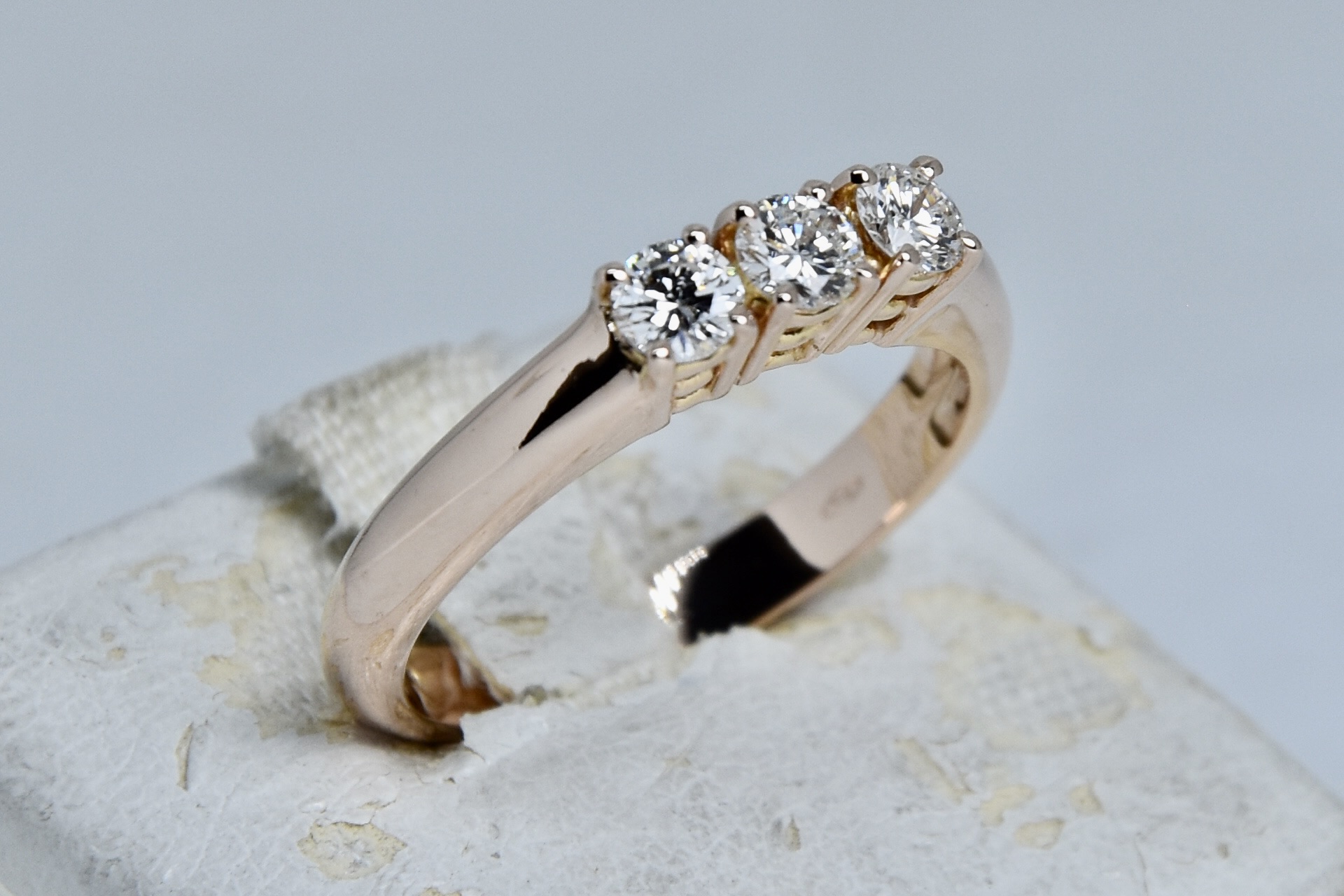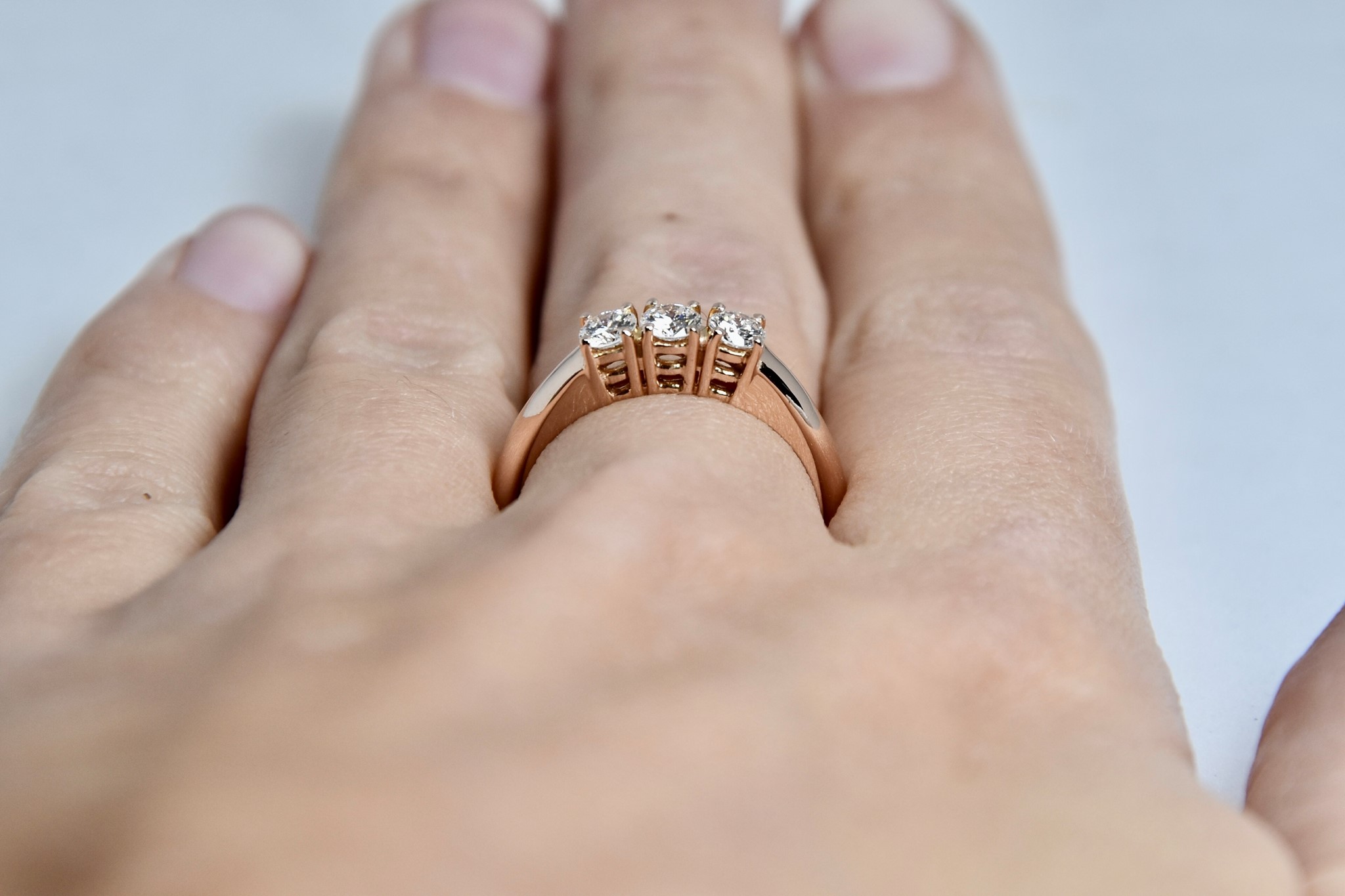 Anello trilogy in oro rosa750/00 con 3 diamanto taglio brillante 0,45ct totali; H/I color; VS1. Peso anello 4,60.