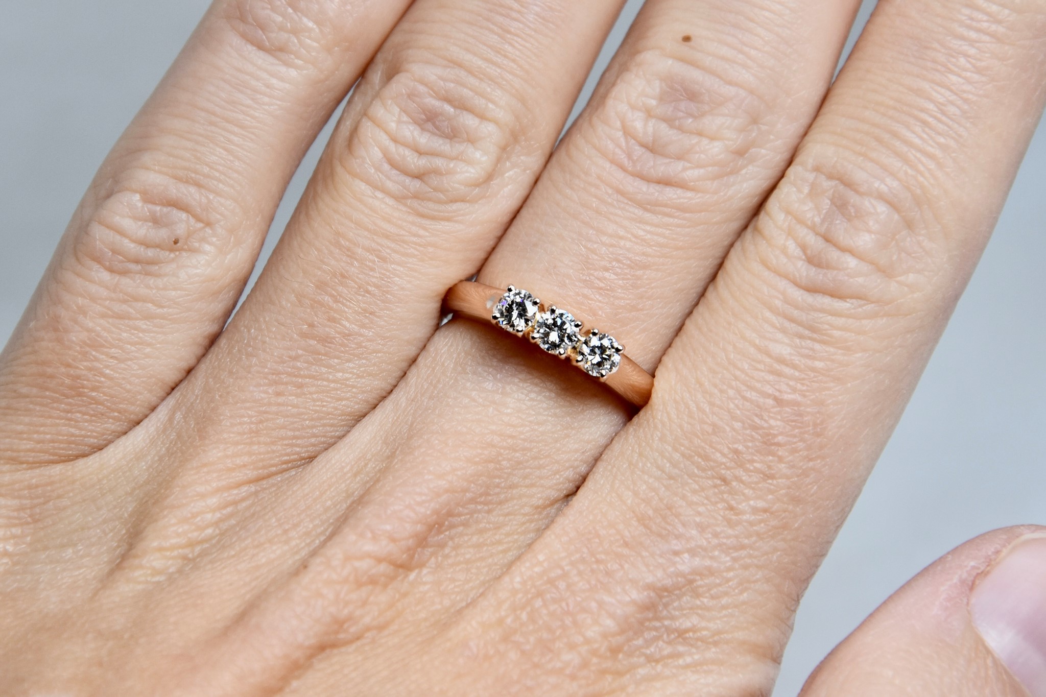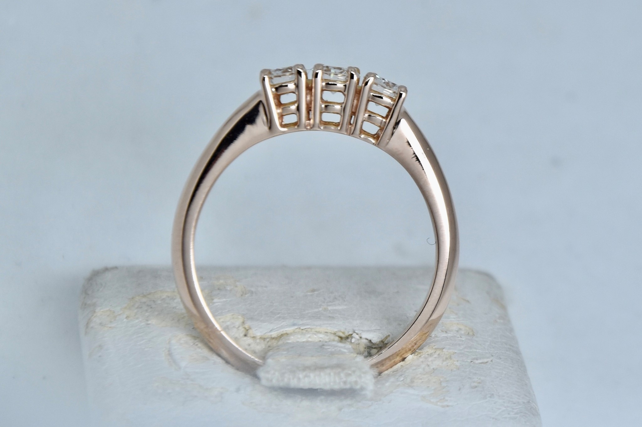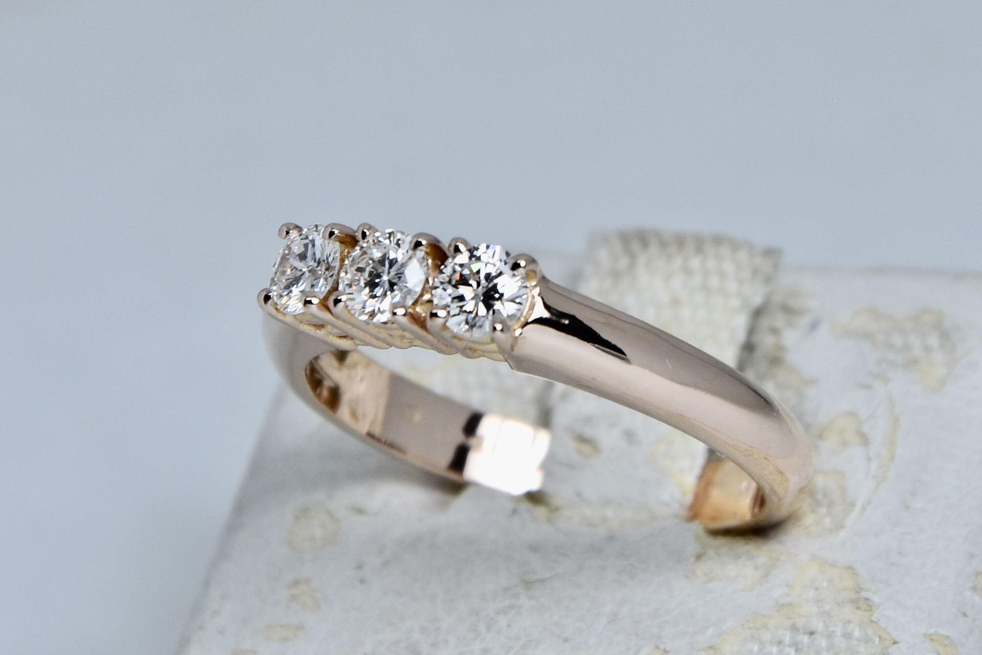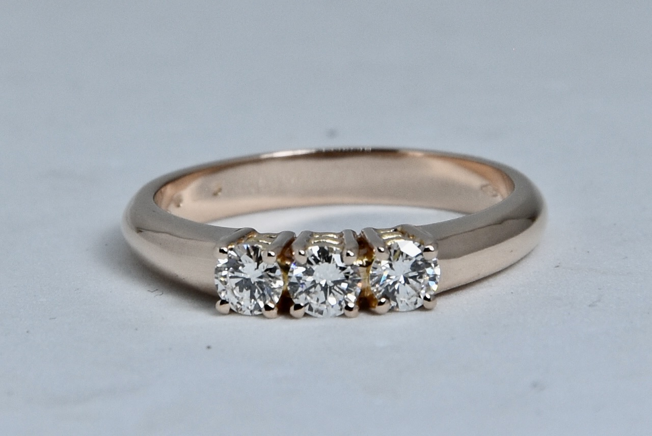 Anello trilogy in oro rosa750/00 con 3 diamanto taglio brillante 0,45ct totali; H/I color; VS1. Peso anello 4,60.