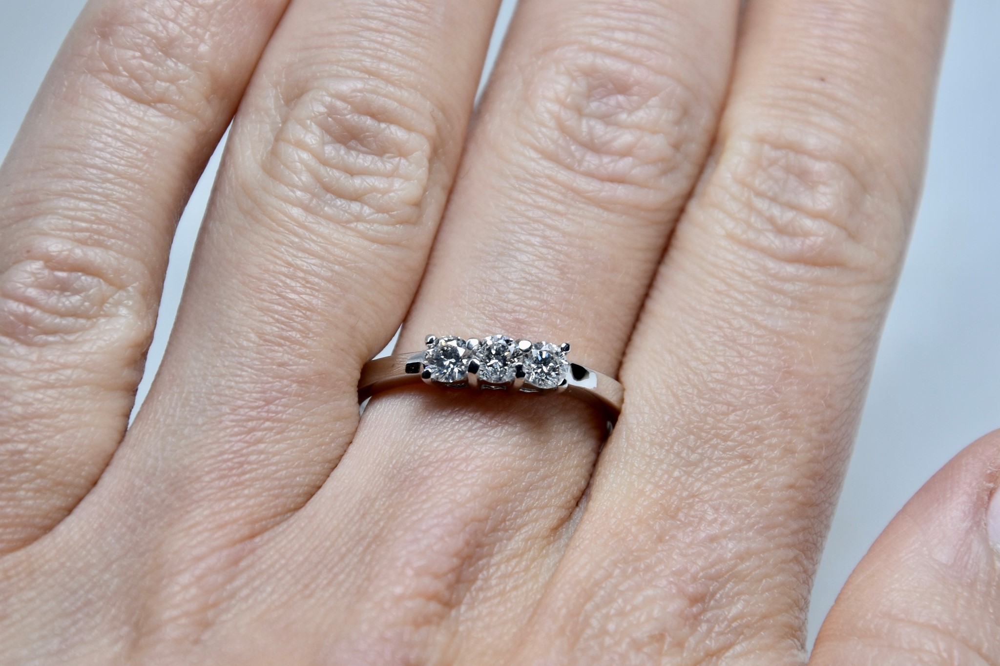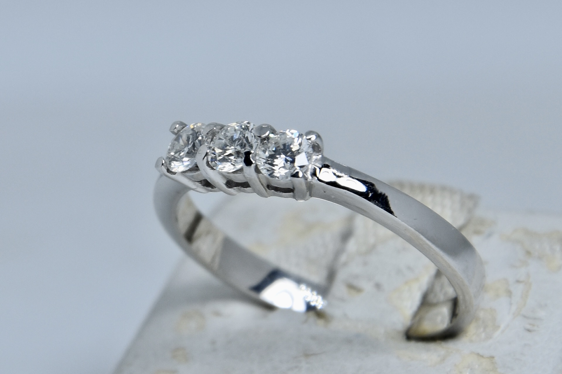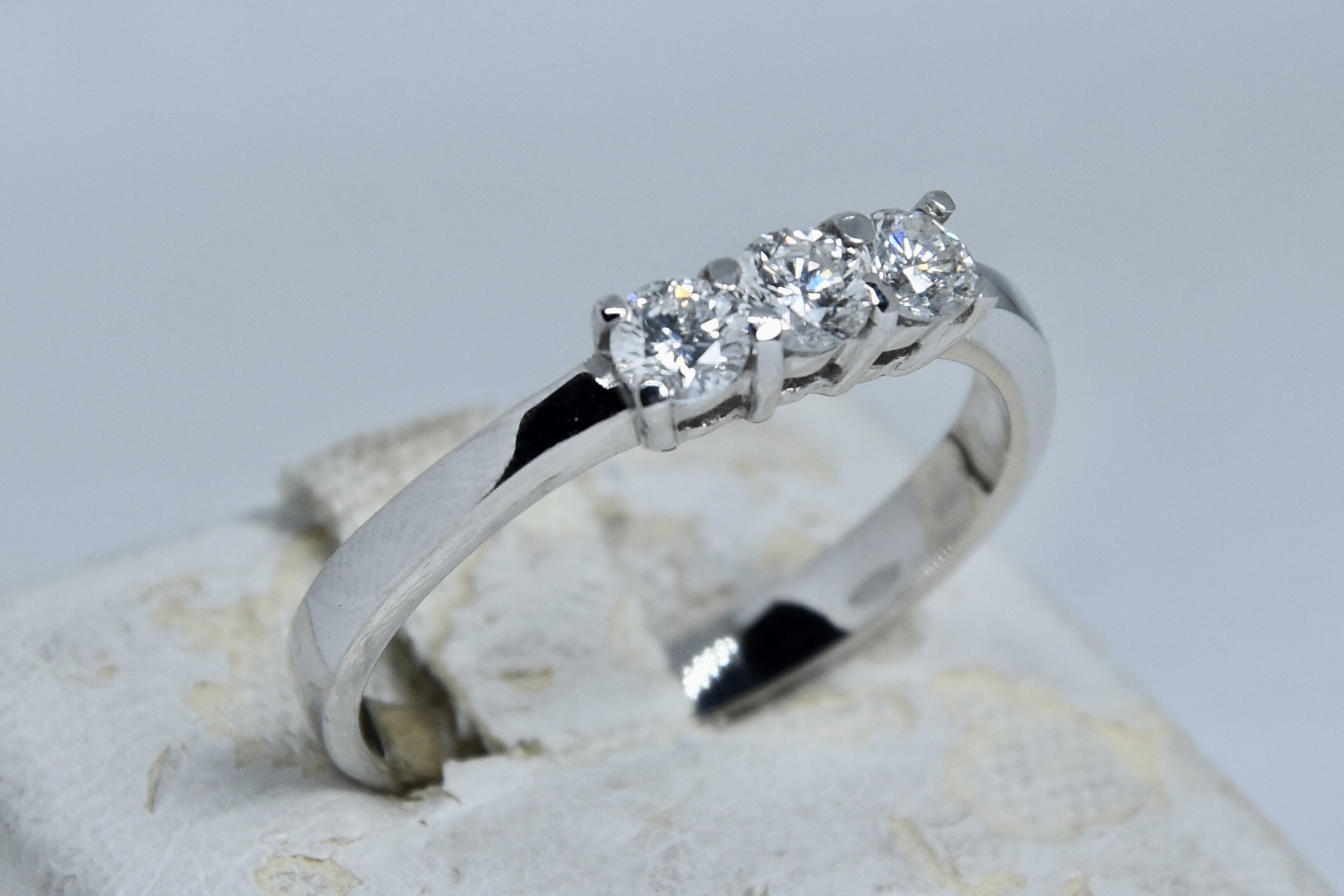 Anello Trilogy in oro bianco 750/00 con diamanti taglio brillante di circa 0,60ct totali; H color; VS2. Peso 3,80g.
