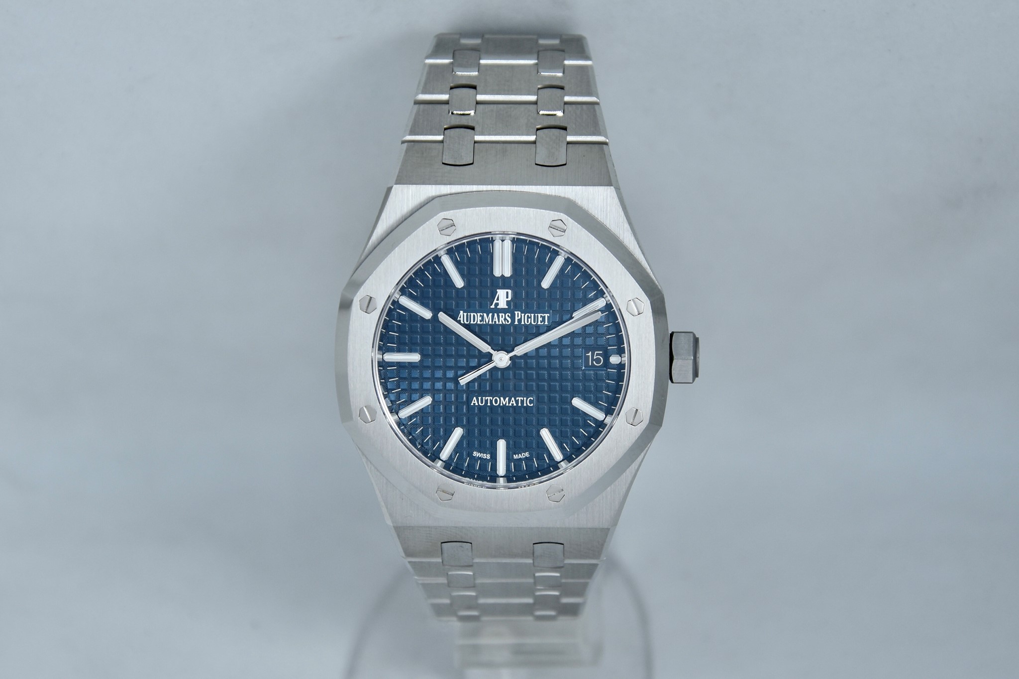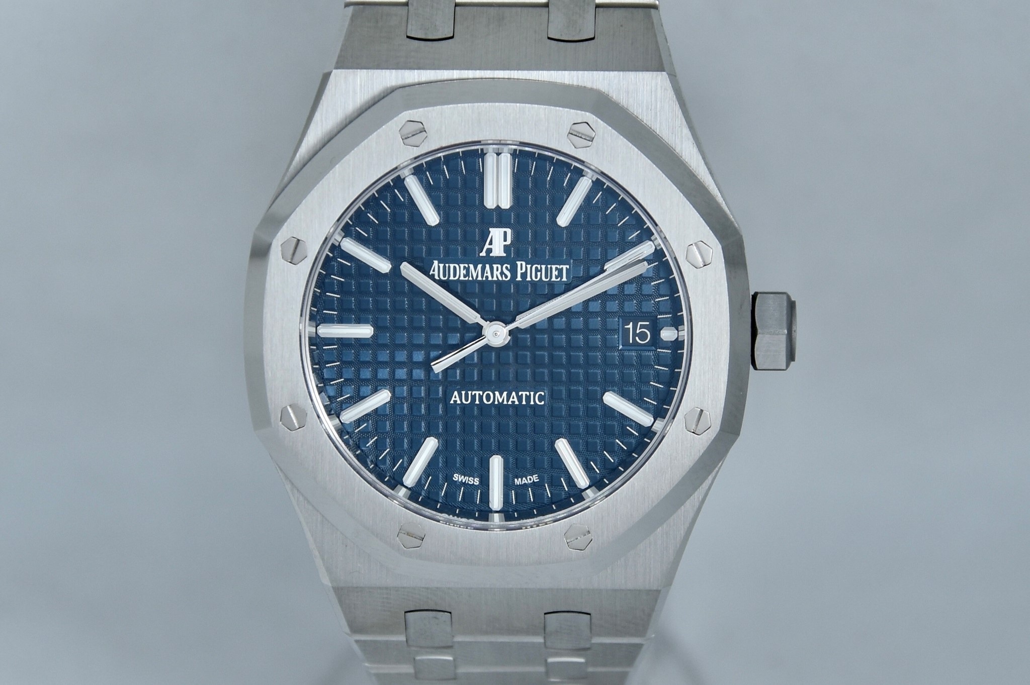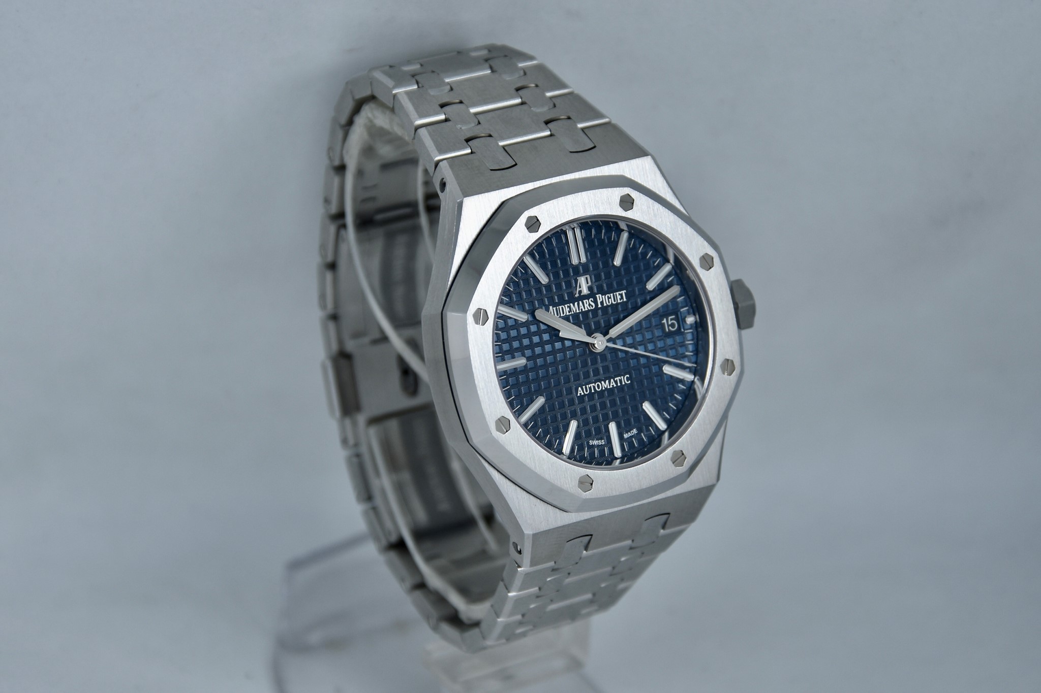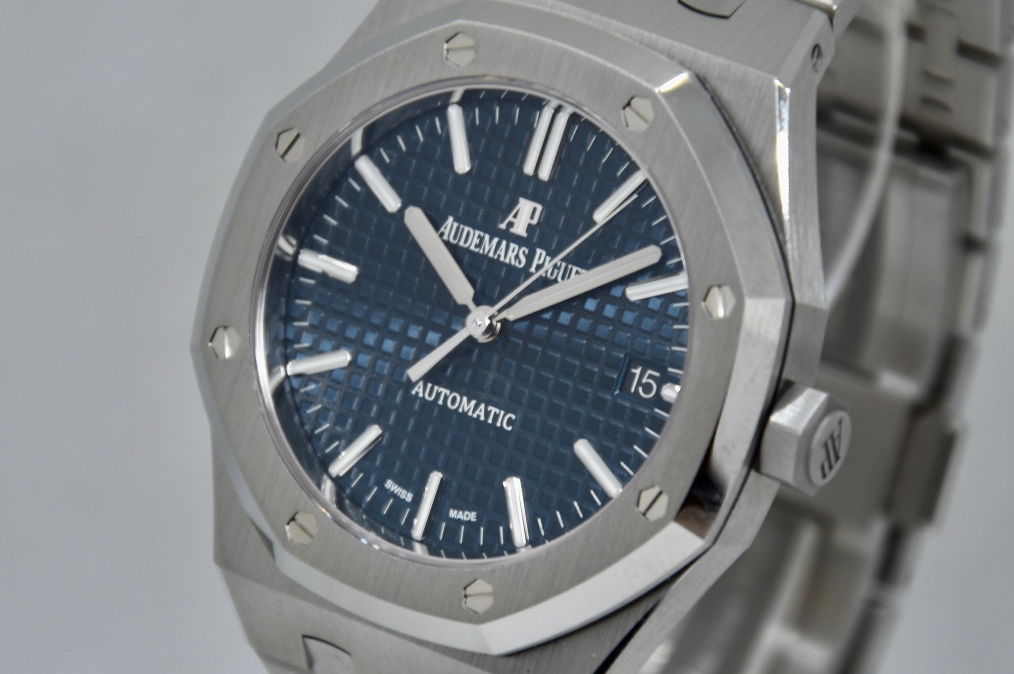 Audemars Piguet Royal Oak ref. 15450 del 2020.Orologio in acciaio MAI INDOSSATO. Quadrante blu “Grande Tapisserie". Movimento a carica automatica. Diametro cassa 37mm. Datario a ore 3. Vetro zaffiro. Movimento a vista. Con scatola e garanzia originali.