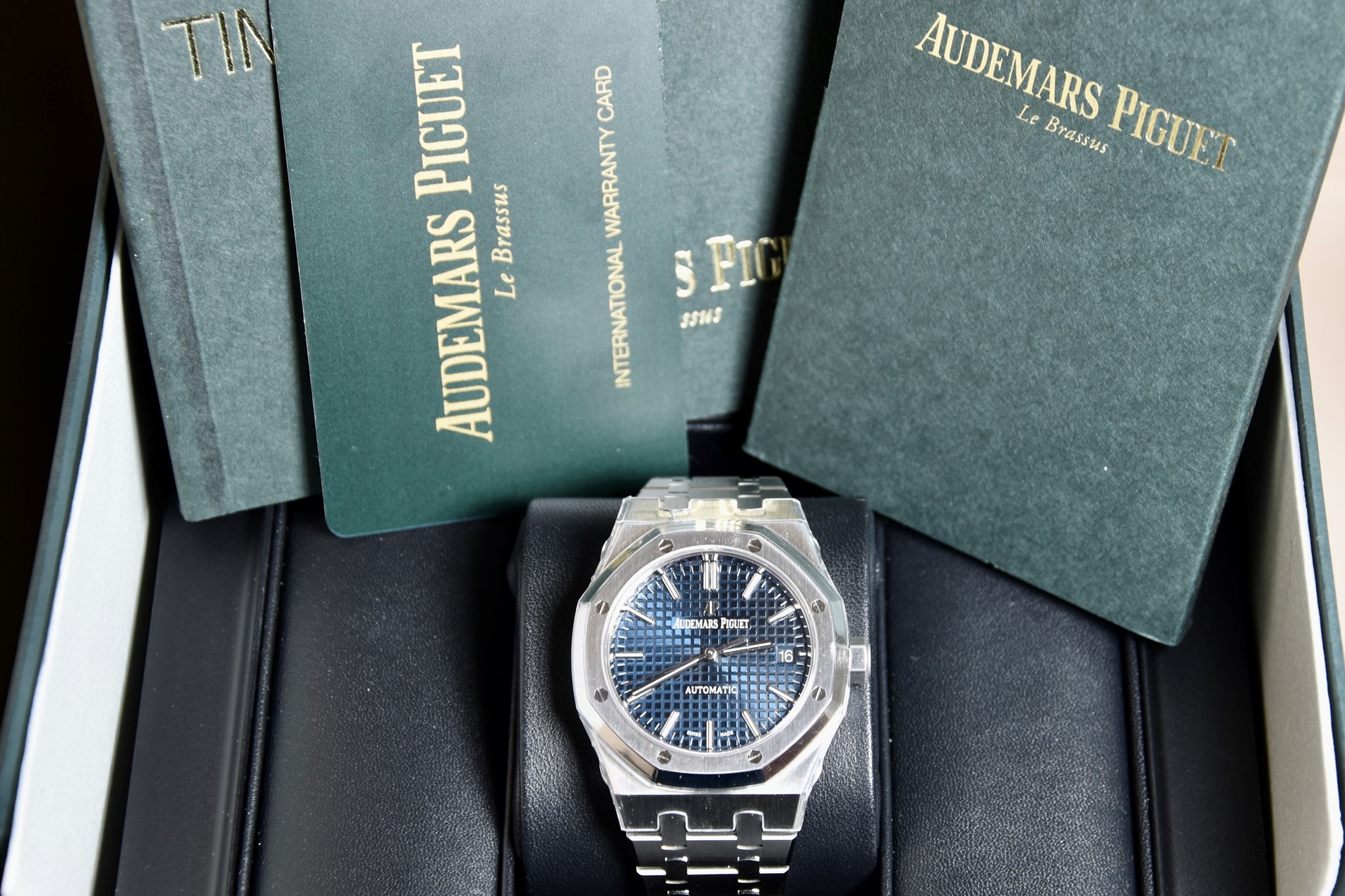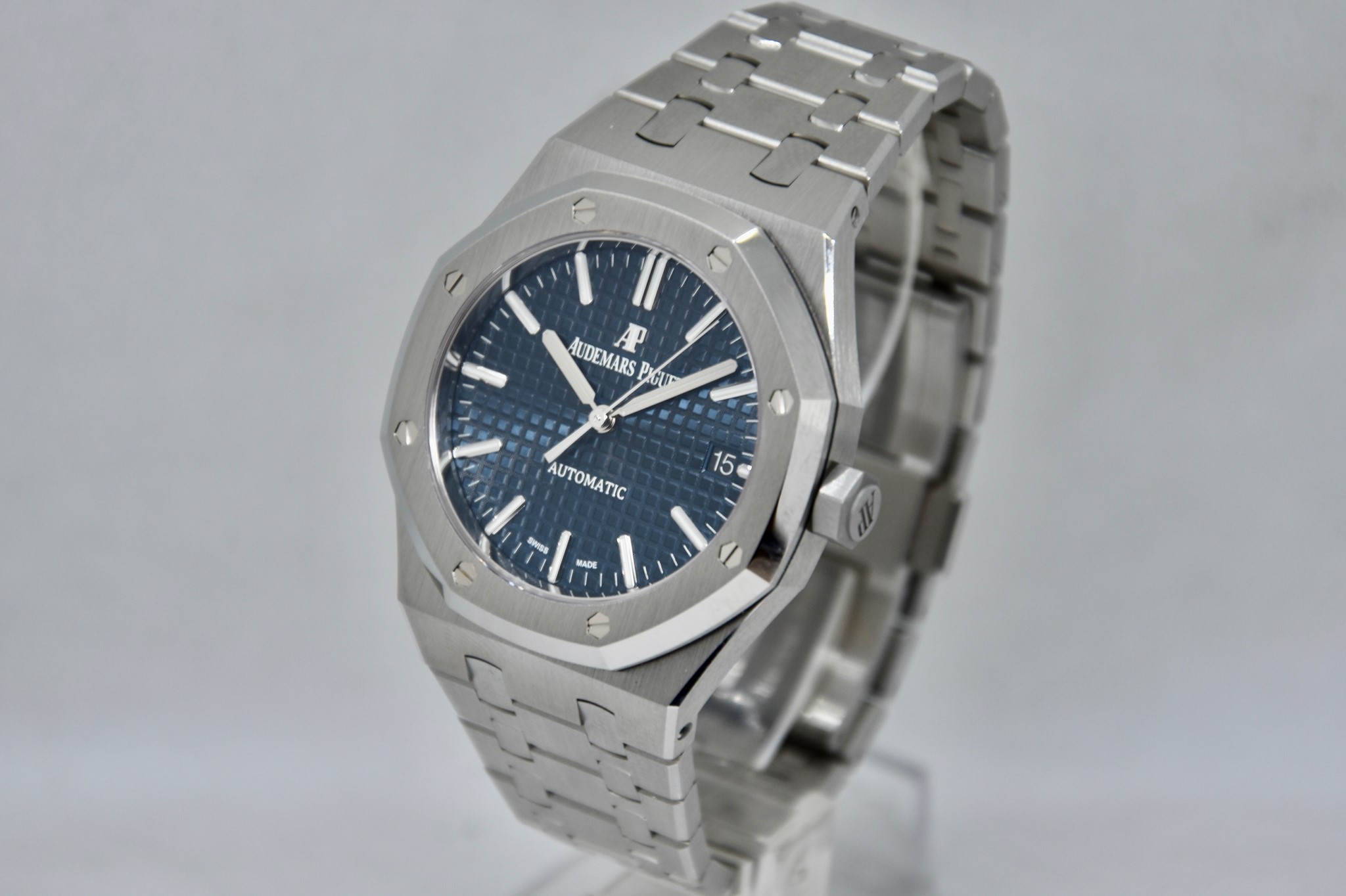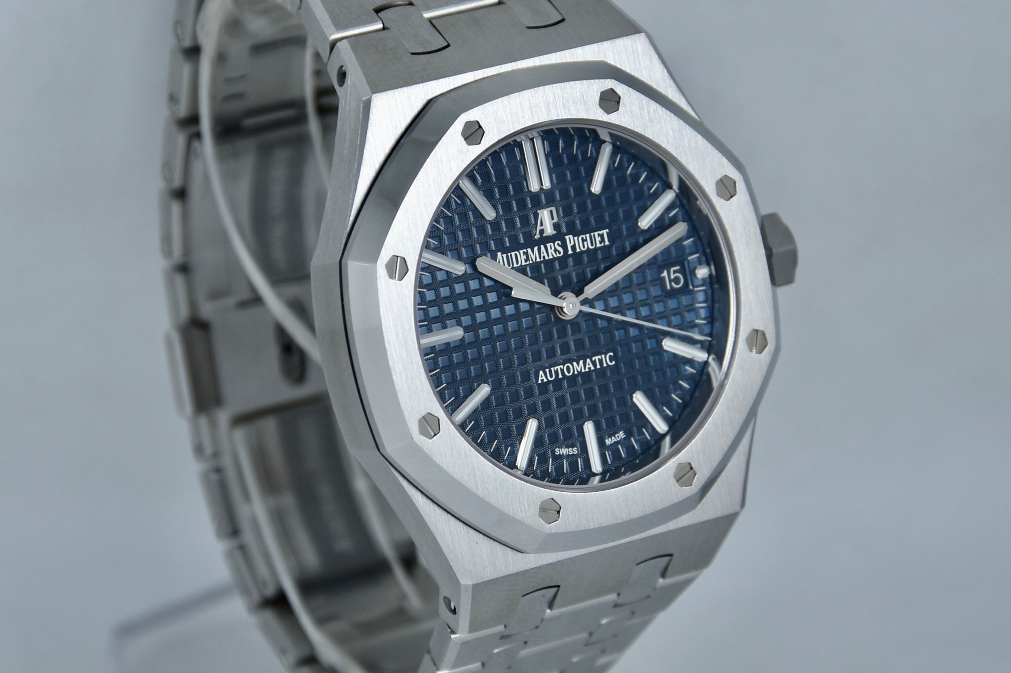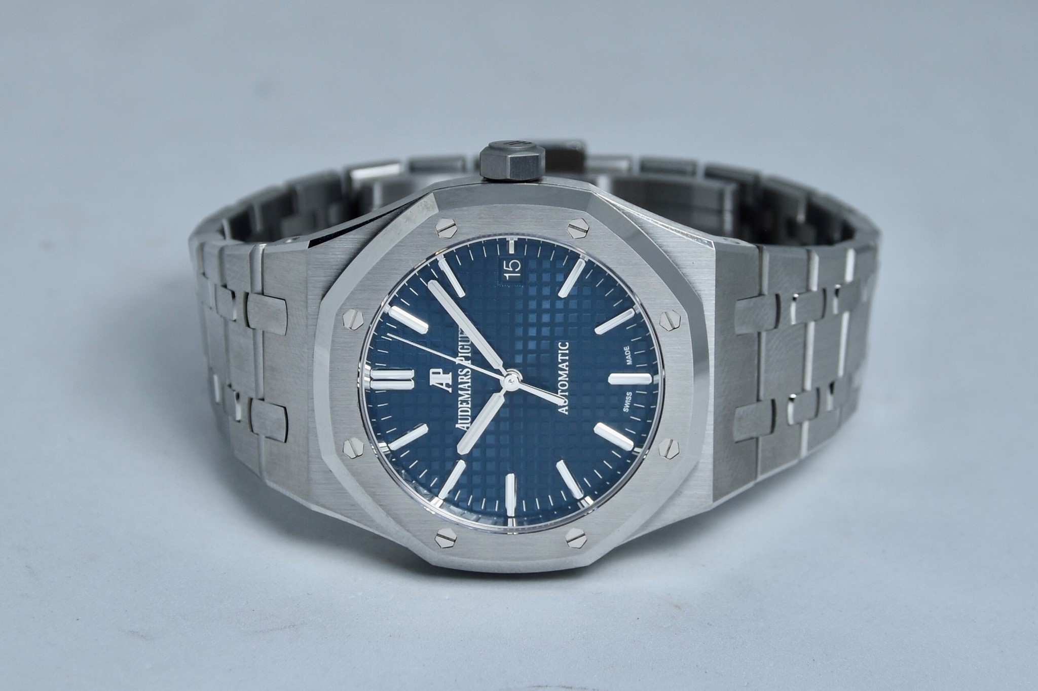 Audemars Piguet Royal Oak ref. 15450 del 2020.Orologio in acciaio MAI INDOSSATO. Quadrante blu “Grande Tapisserie". Movimento a carica automatica. Diametro cassa 37mm. Datario a ore 3. Vetro zaffiro. Movimento a vista. Con scatola e garanzia originali.
