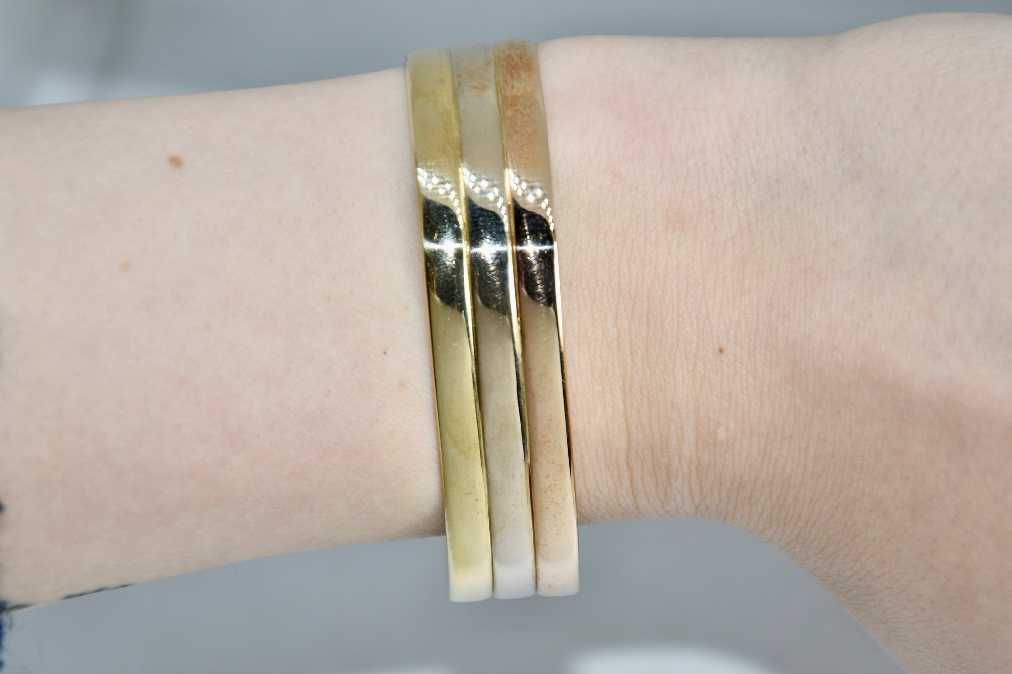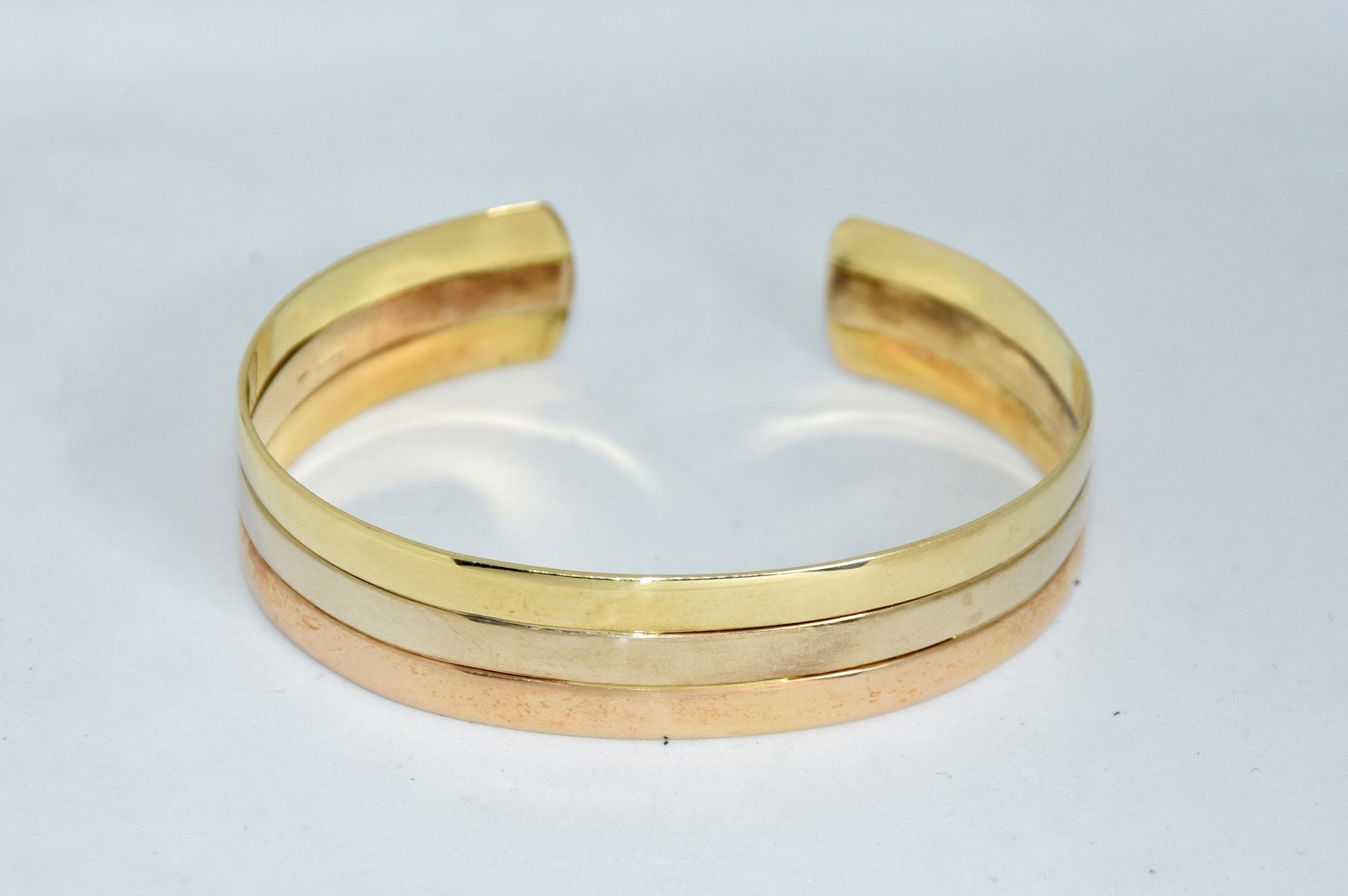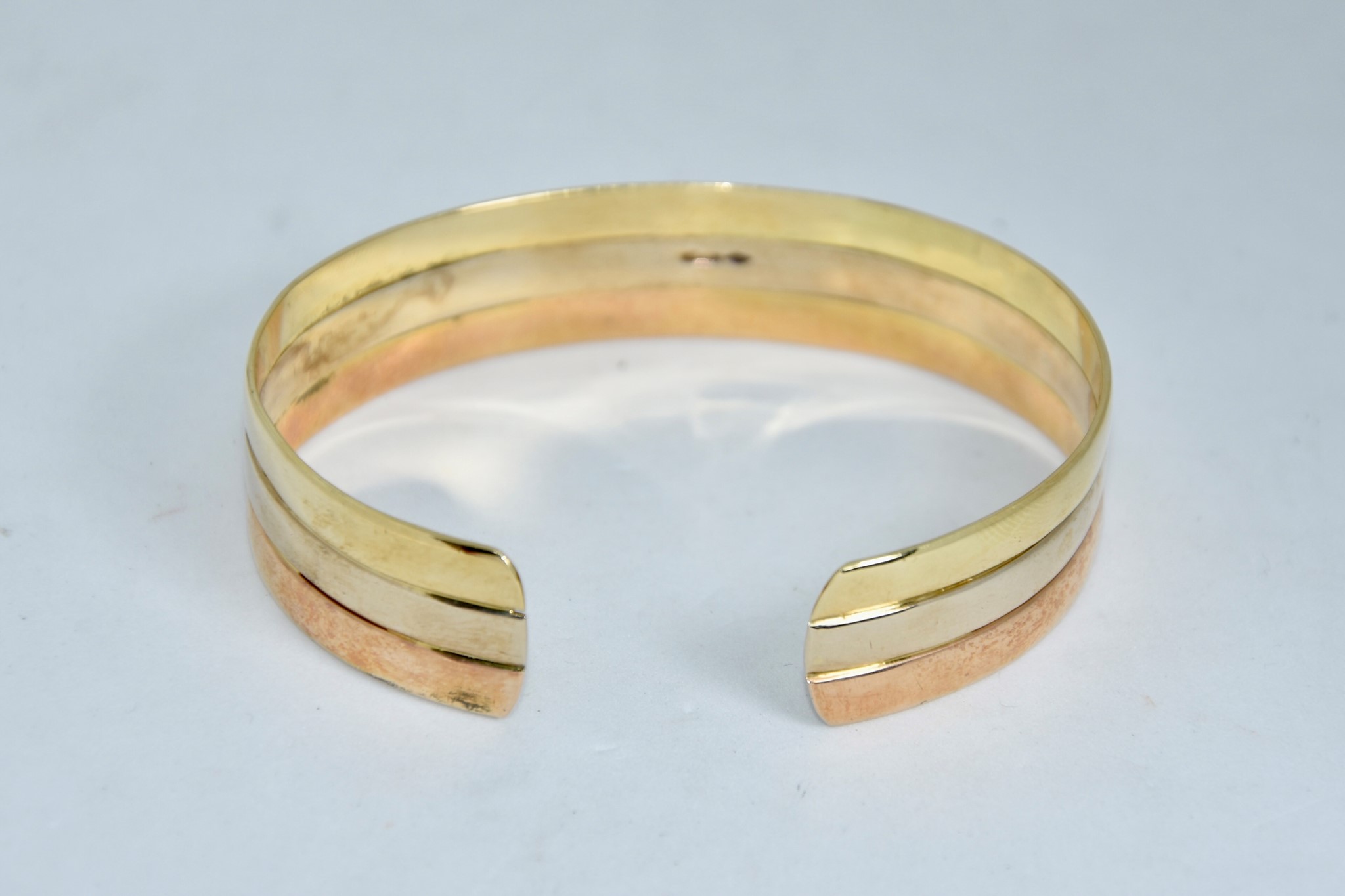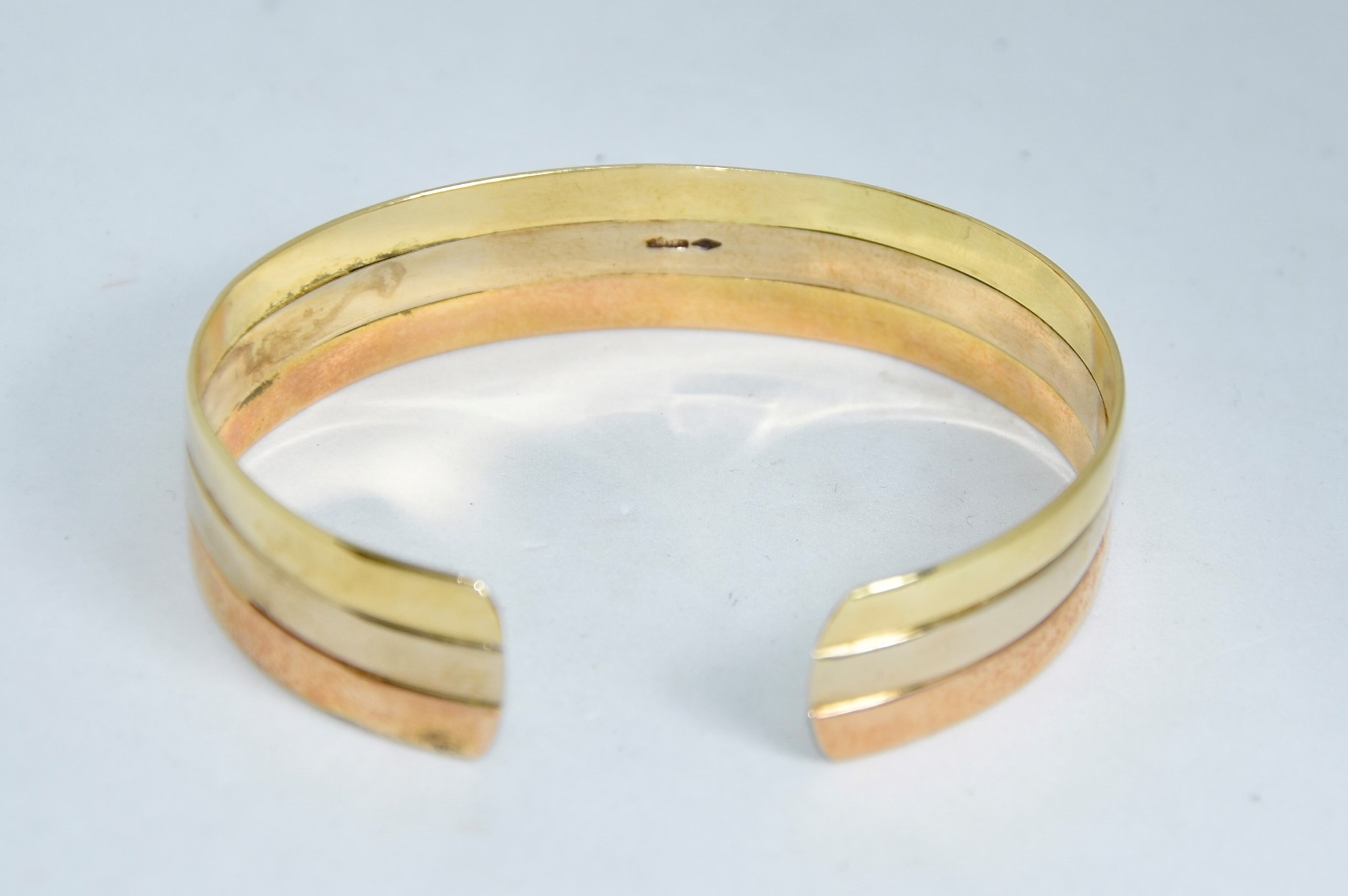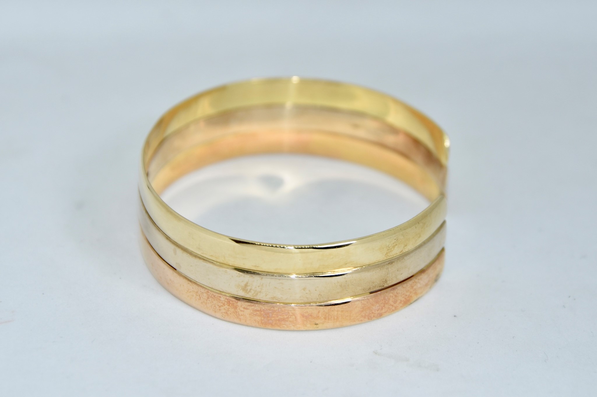 Bracciale rigido aperto in oro giallo, bianco e rosso 750/00, dal diametro di 6,00cm, spessore 1,40cm. Peso bracciale 28,40g.