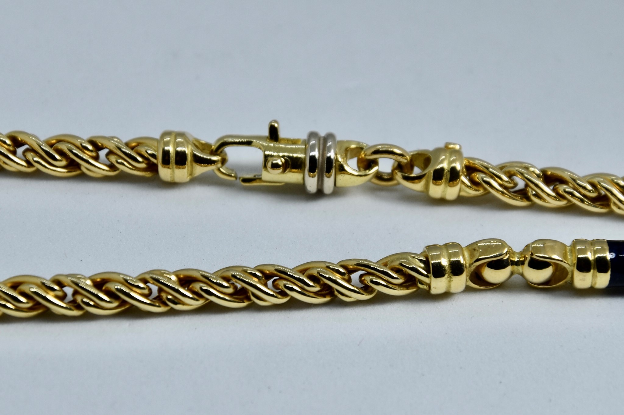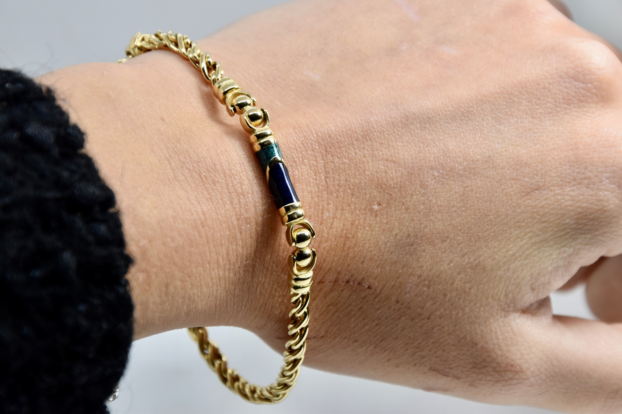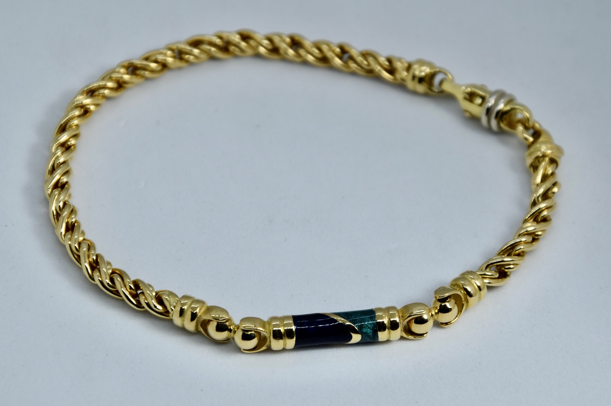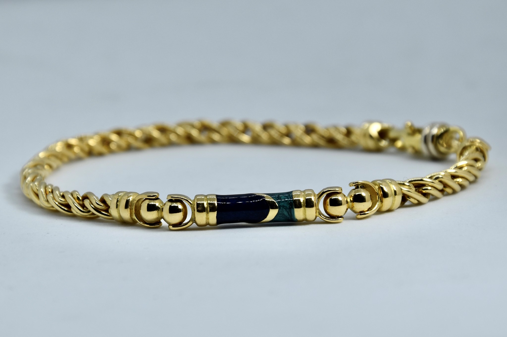 Braccialetto uomo in oro giallo 750/00 con con smalto (piccola parte in oro bianco vicino la chiusura). Lunghezza bracciale 21,50cm. Peso 14,50g.
