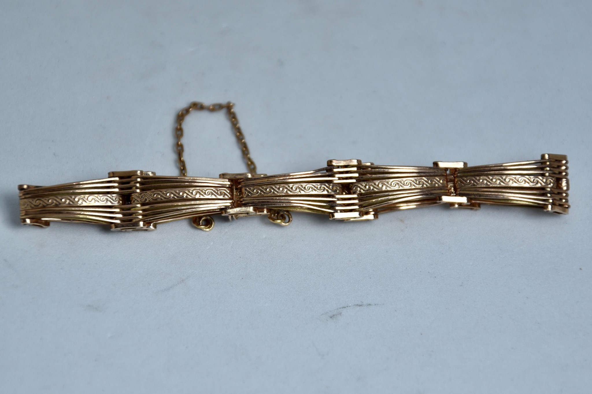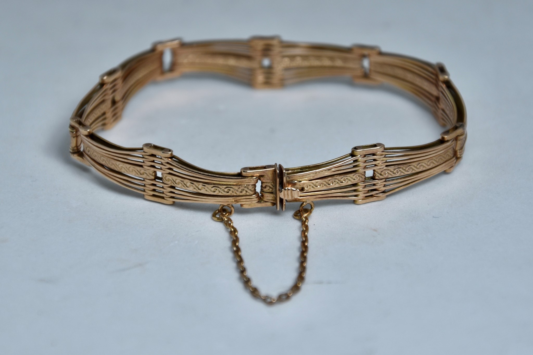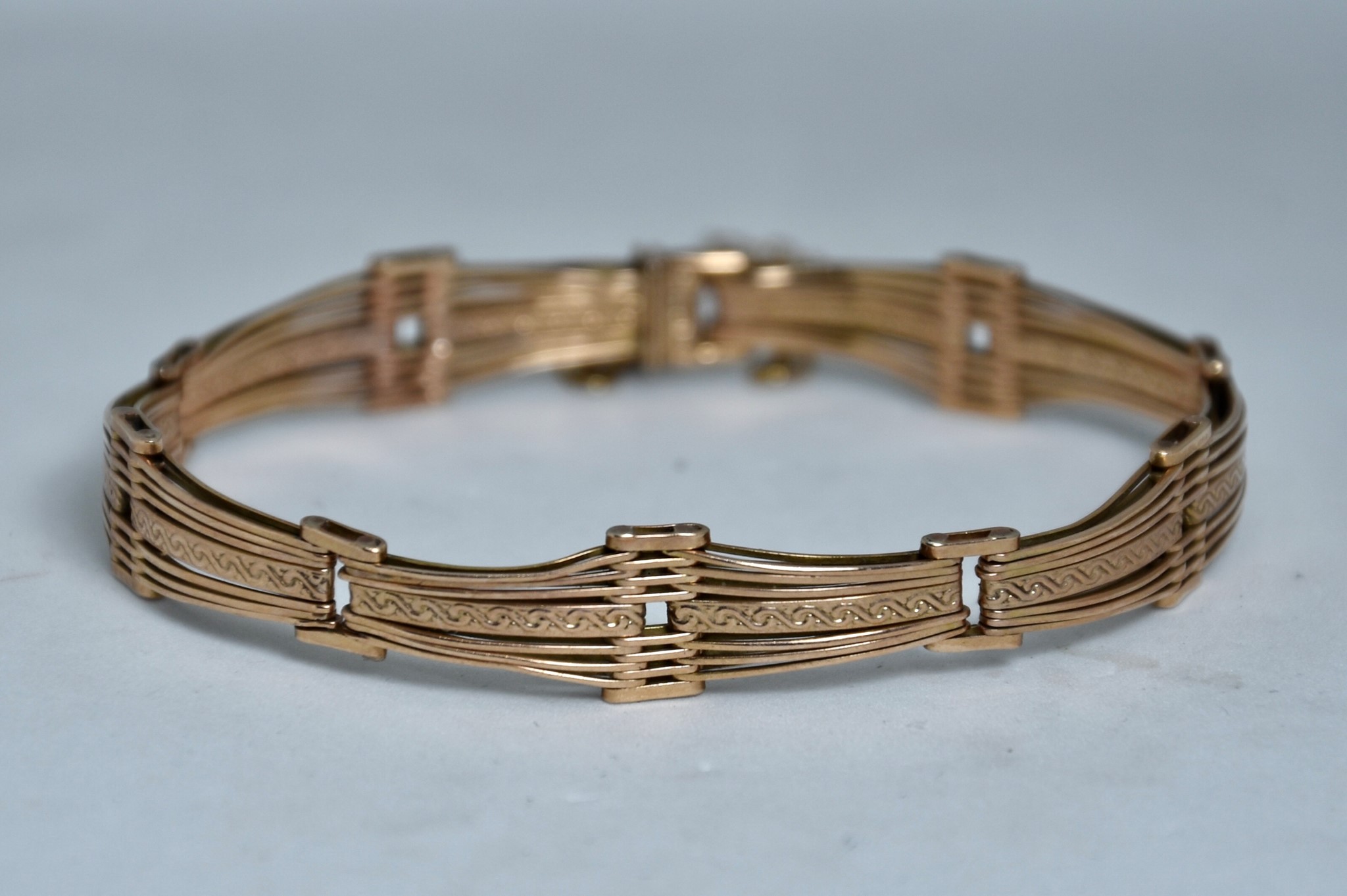 Bracciale semi rigido con maglie articolate lavorato a sbalzo in oro rosa 585/00 della lunghezza di 17cm circa. Altezza del bracciale 0,9cm. Peso bracciale 9,90g.