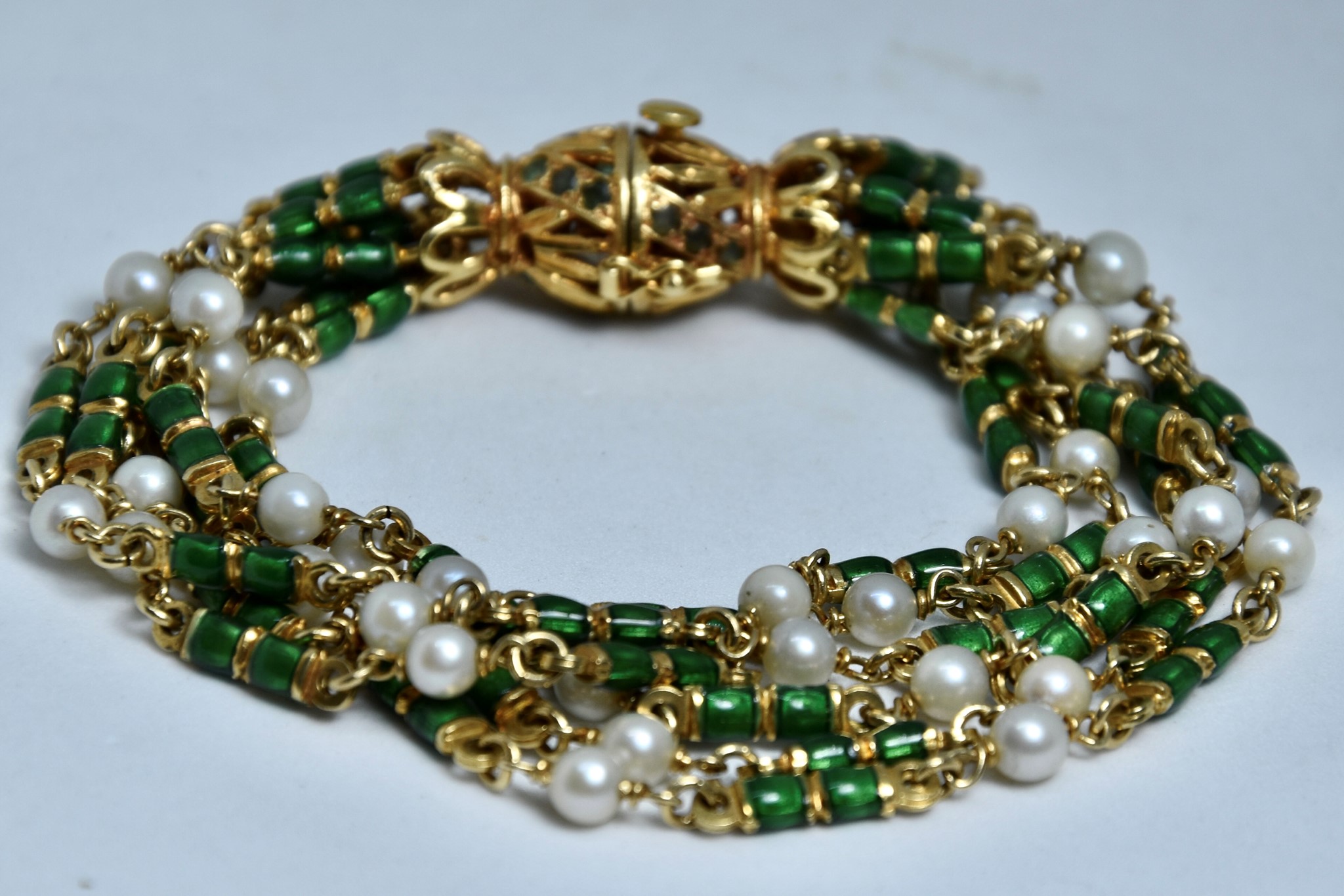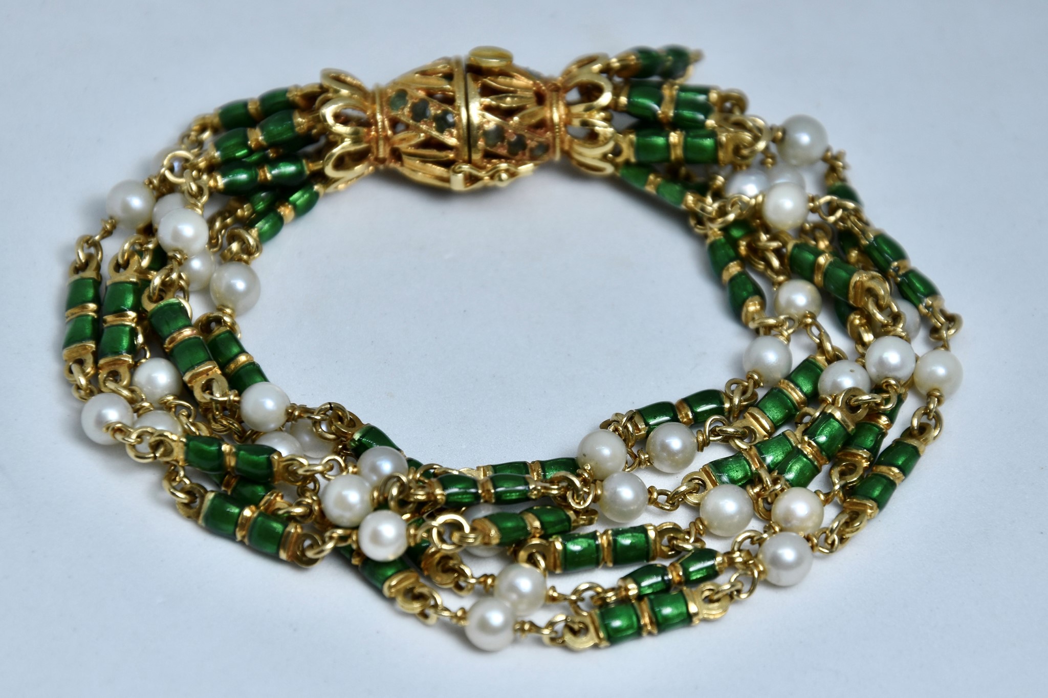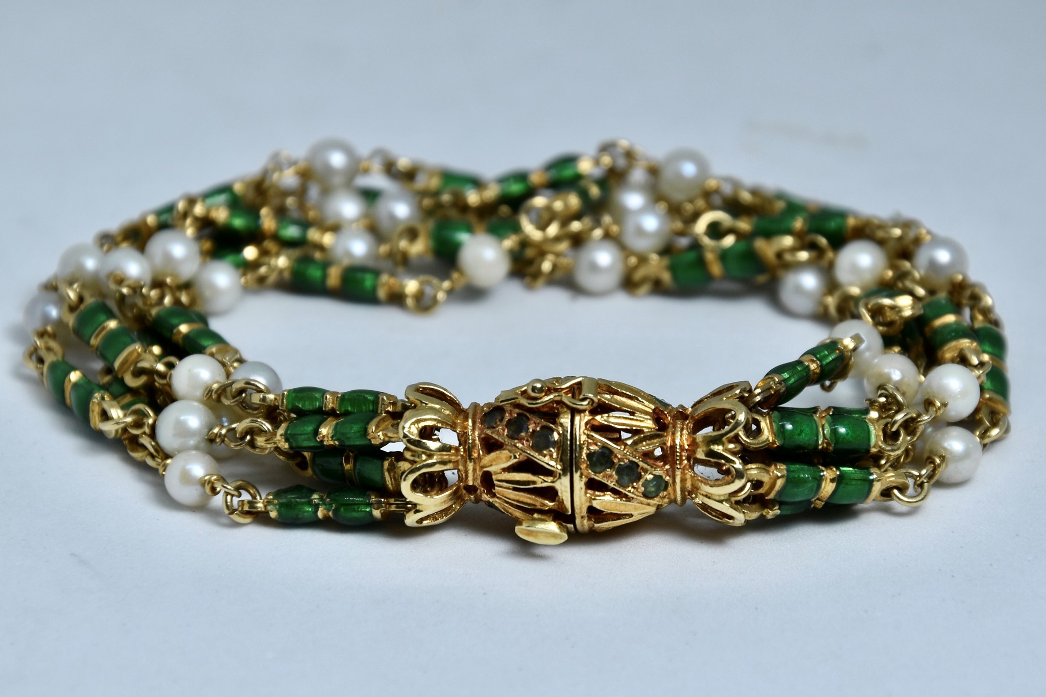 Bracciale in oro giallo 750/00 con perle, smalto verde e 18 smeraldini sulla chiusura. Lunghezza bracciale 19c. Peso 50,70g.
