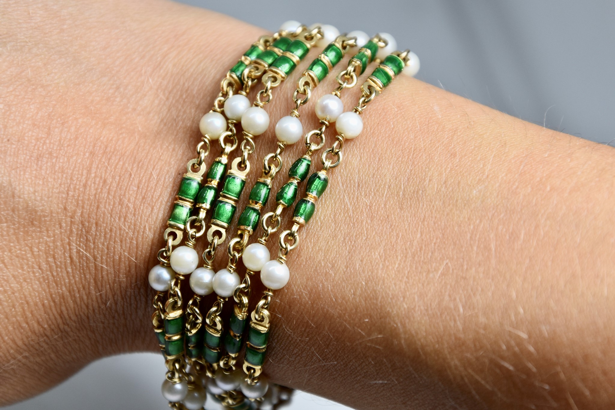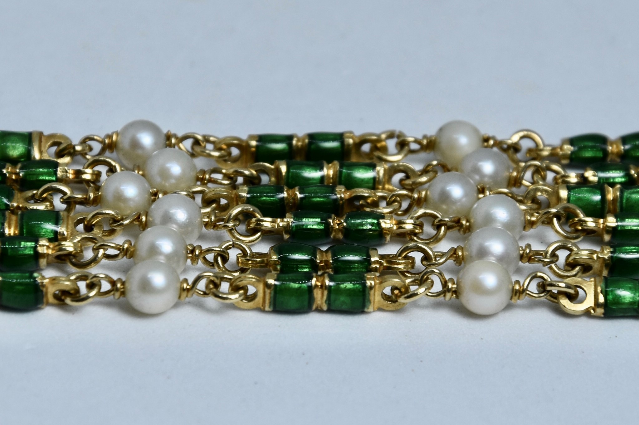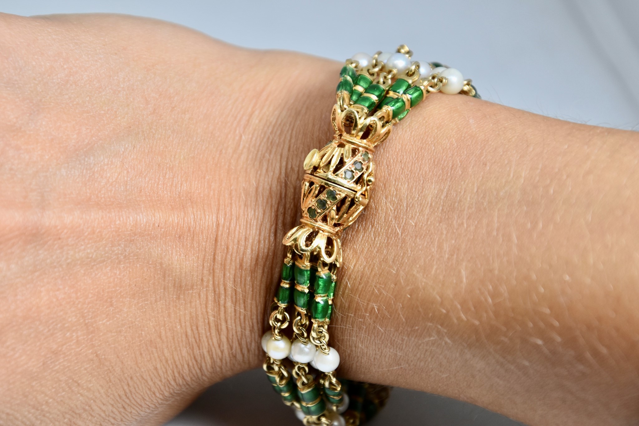 Bracciale in oro giallo 750/00 con perle, smalto verde e 18 smeraldini sulla chiusura. Lunghezza bracciale 19c. Peso 50,70g.
