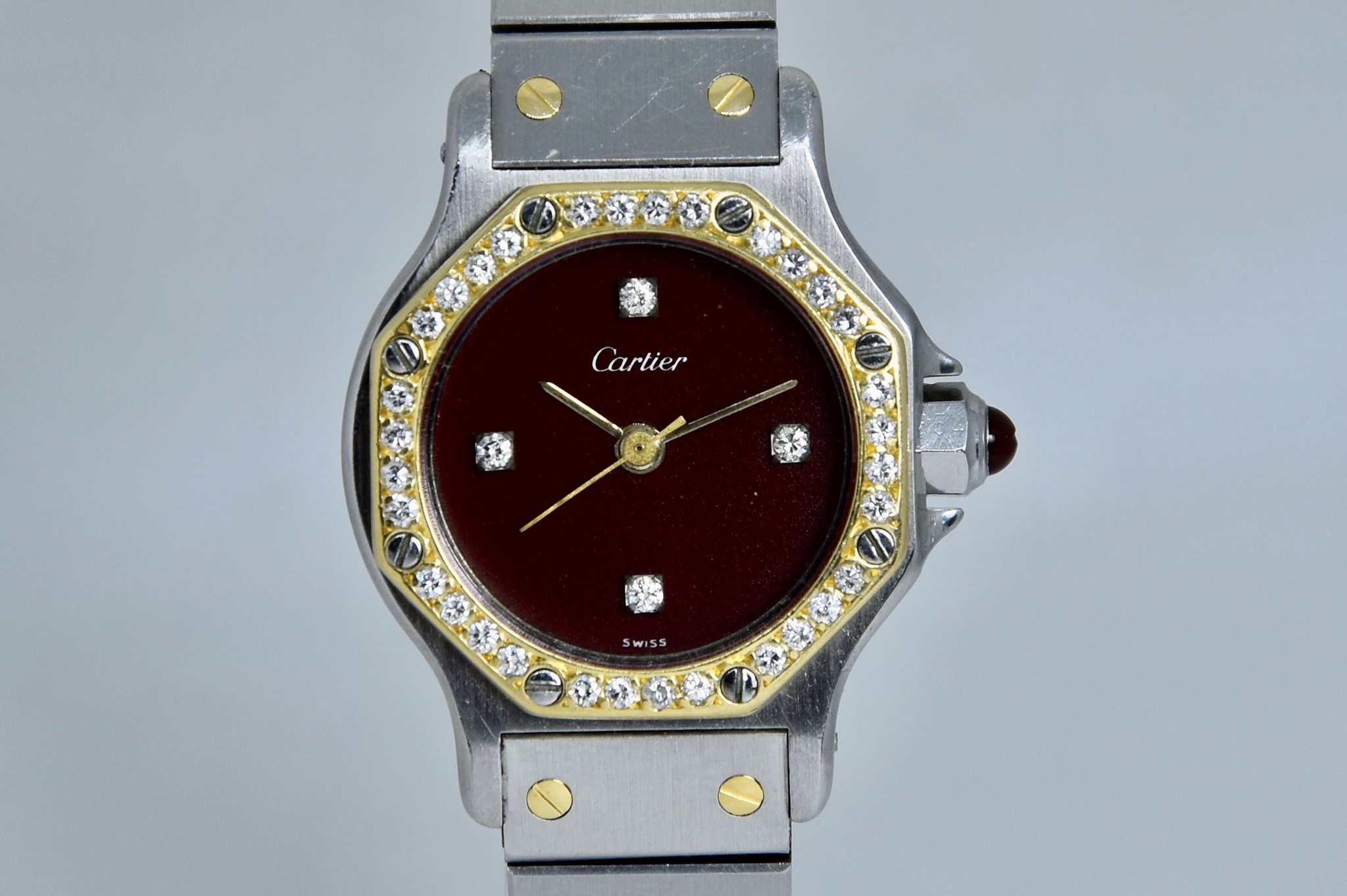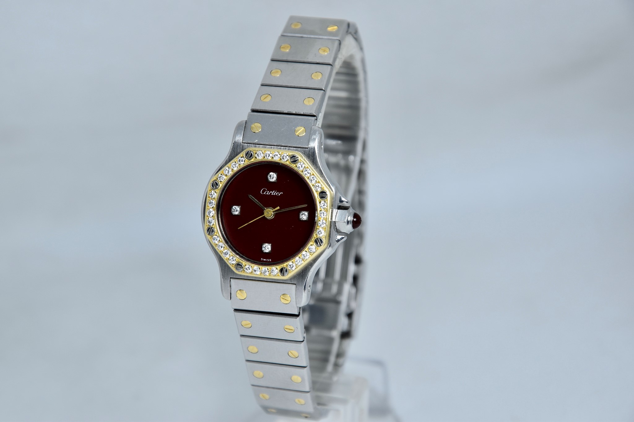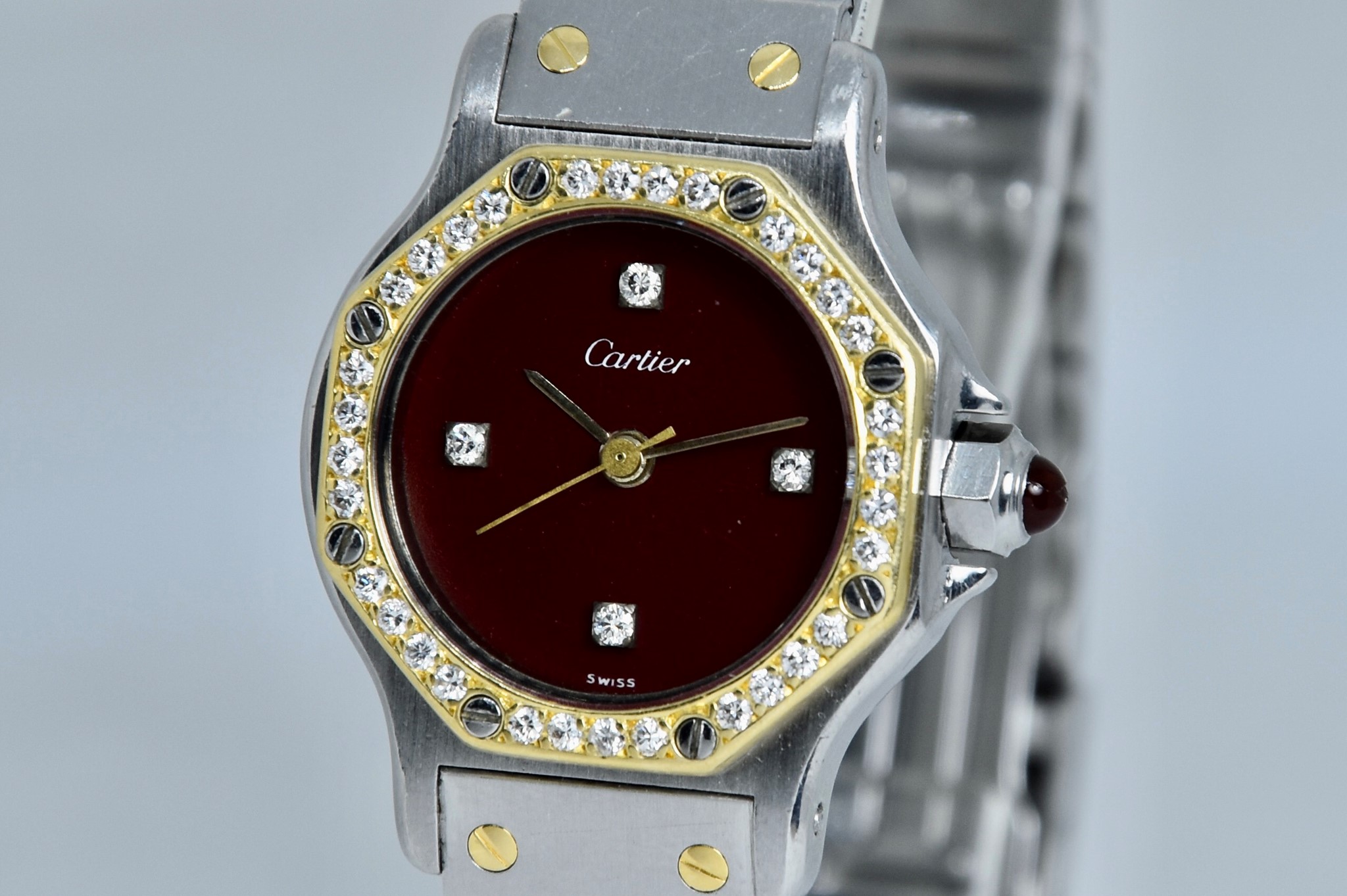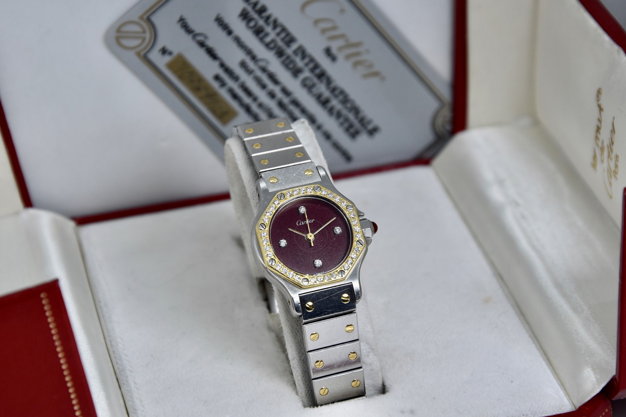 Cartier Octagon Bordeaux Dial ref. 0907 del 1984. Orologio in buone condizioni. Movimento automatico. Diametro cassa 25mm. Spendido quadrante. Vetro zaffiro (vetro originale, non scheggiato ma con dei segni interni, ovvero il cerchio che si vede nelle foto. Su richiesta possibile sostituirlo). Indicatore del datario. Corona con rubino cabochon. Con bracciale originale in acciaio con tutte le maglie. I diamanti su lunetta e quadrante sono stati aggiunti successivamente. Con scatola e garanzia originali.