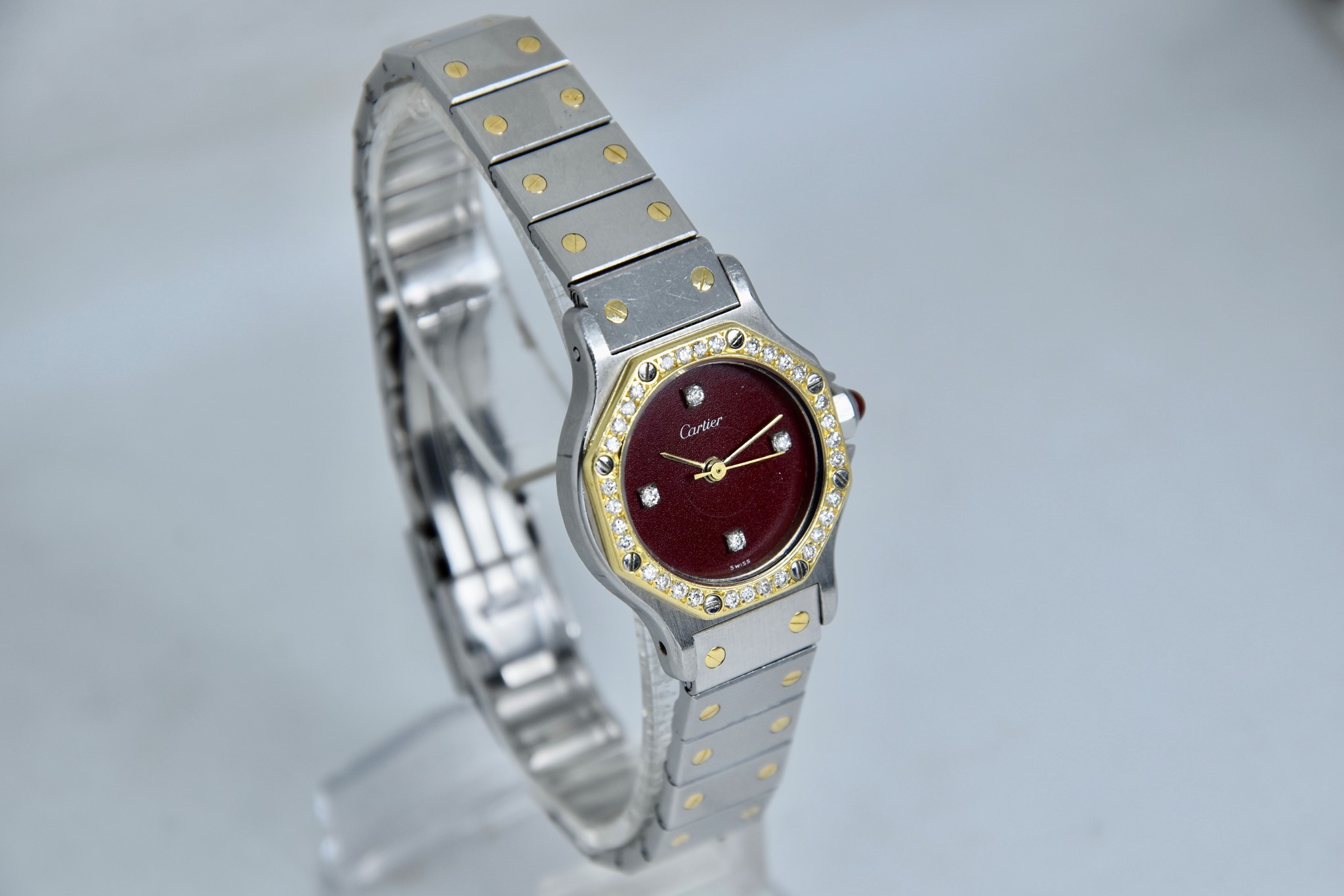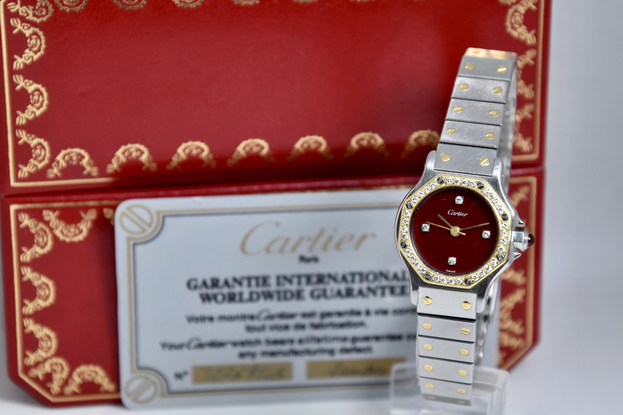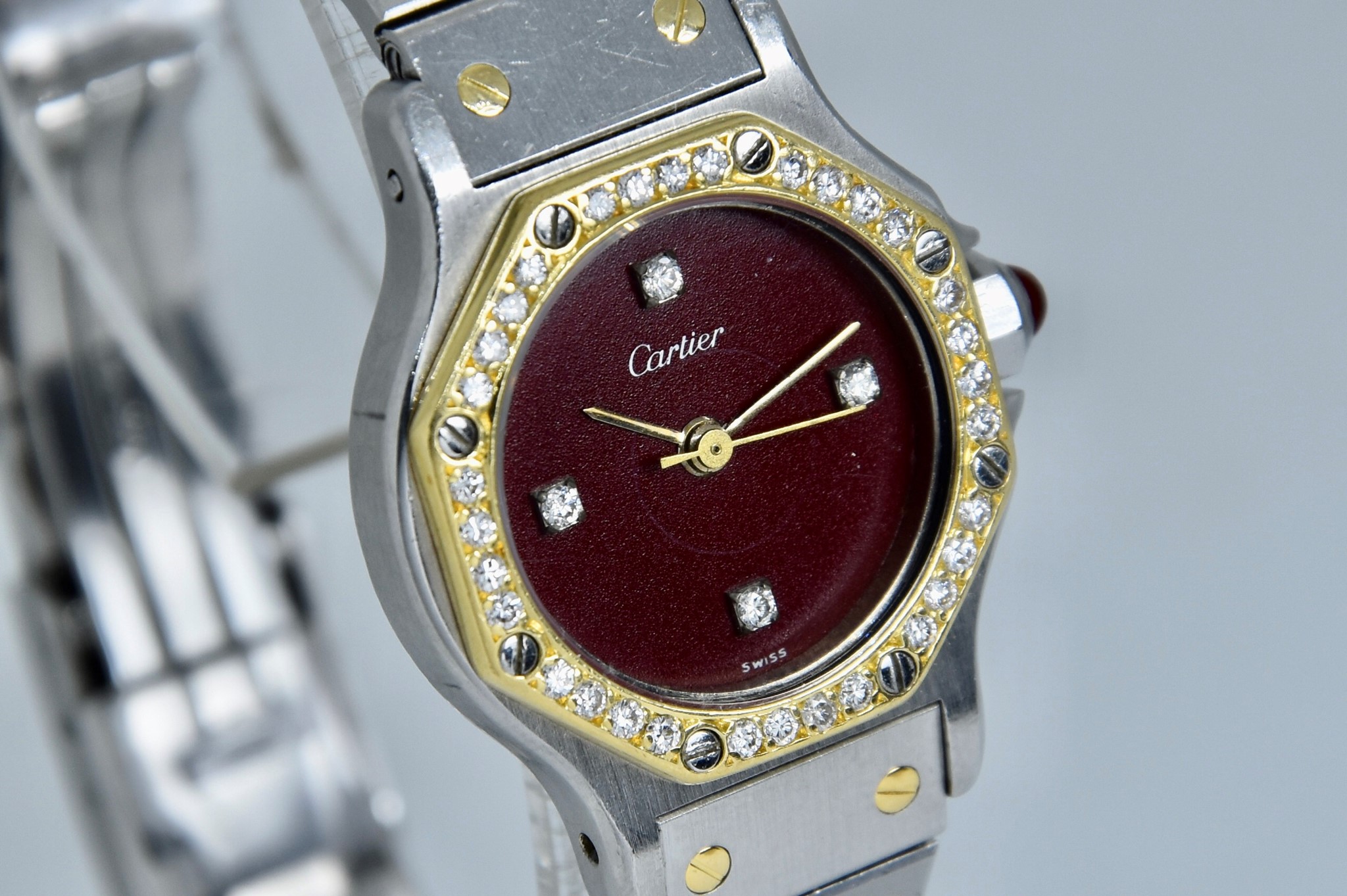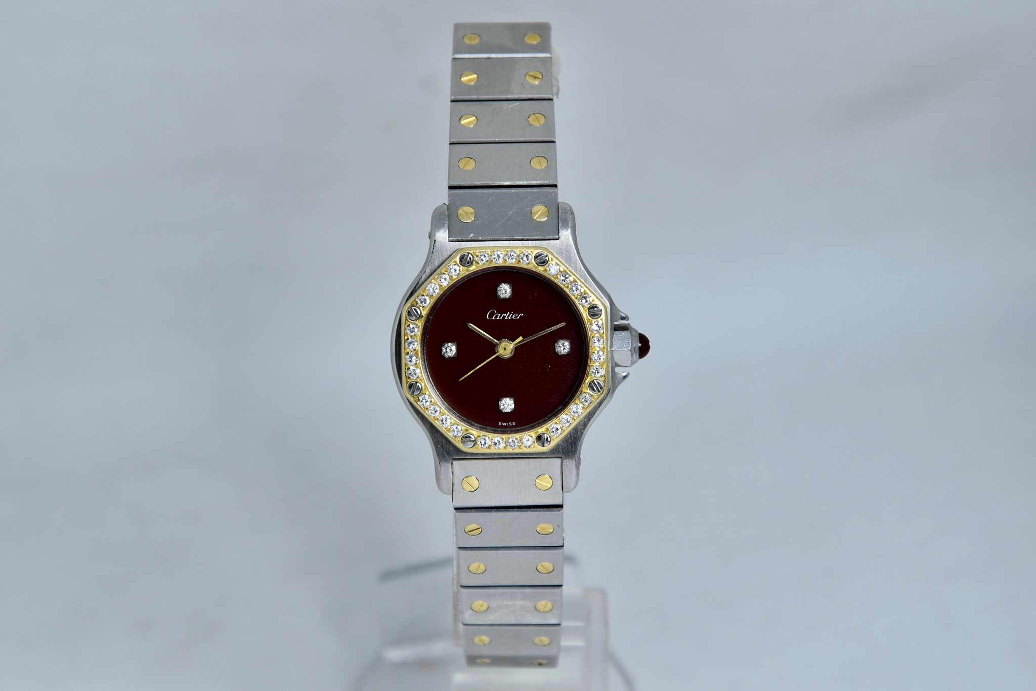 Cartier Octagon Bordeaux Dial ref. 0907 del 1984. Orologio in buone condizioni. Movimento automatico. Diametro cassa 25mm. Spendido quadrante. Vetro zaffiro (vetro originale, non scheggiato ma con dei segni interni, ovvero il cerchio che si vede nelle foto. Su richiesta possibile sostituirlo). Indicatore del datario. Corona con rubino cabochon. Con bracciale originale in acciaio con tutte le maglie. I diamanti su lunetta e quadrante sono stati aggiunti successivamente. Con scatola e garanzia originali.