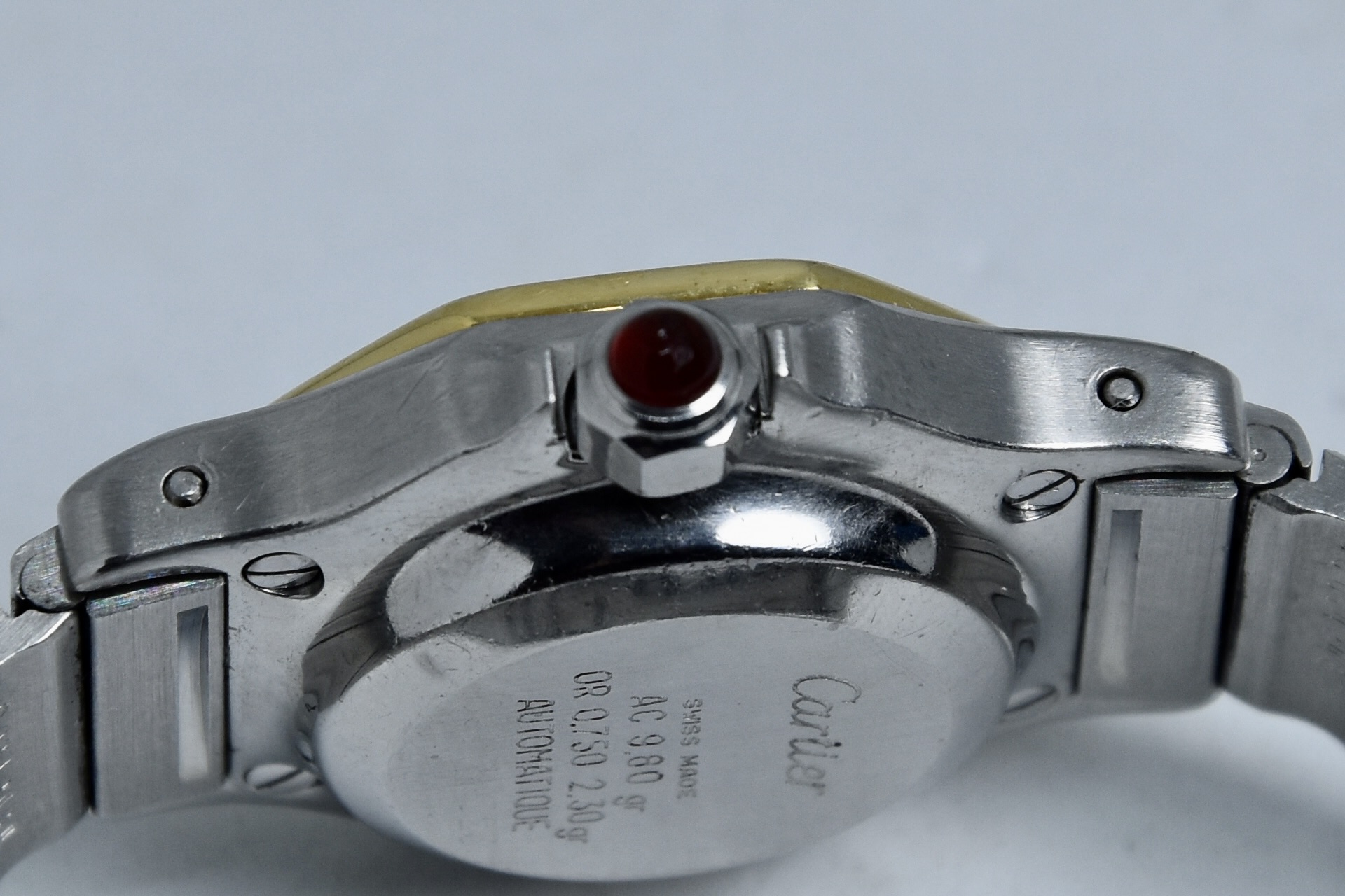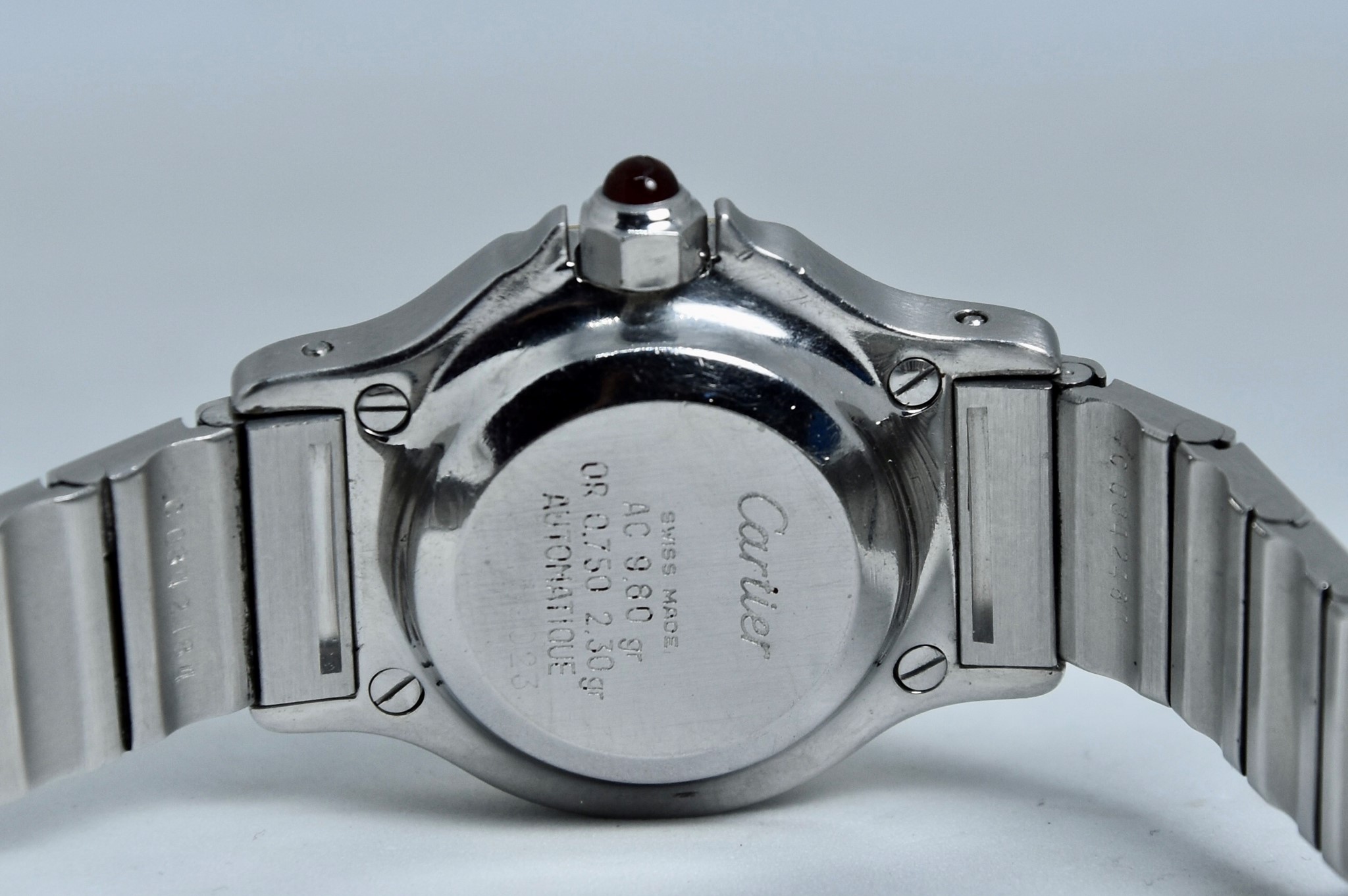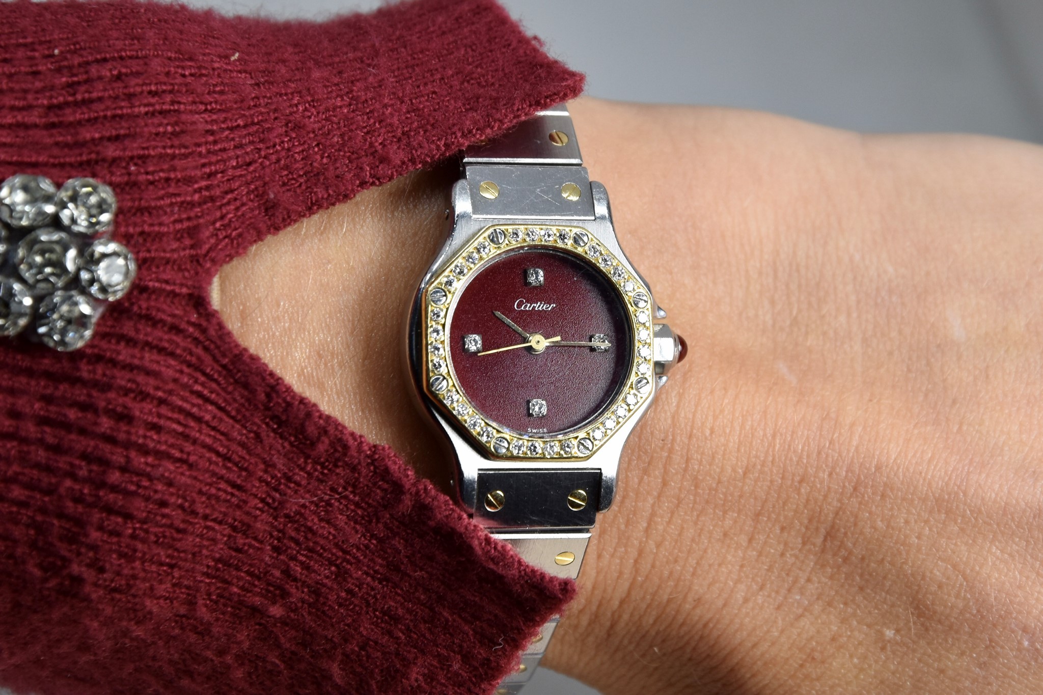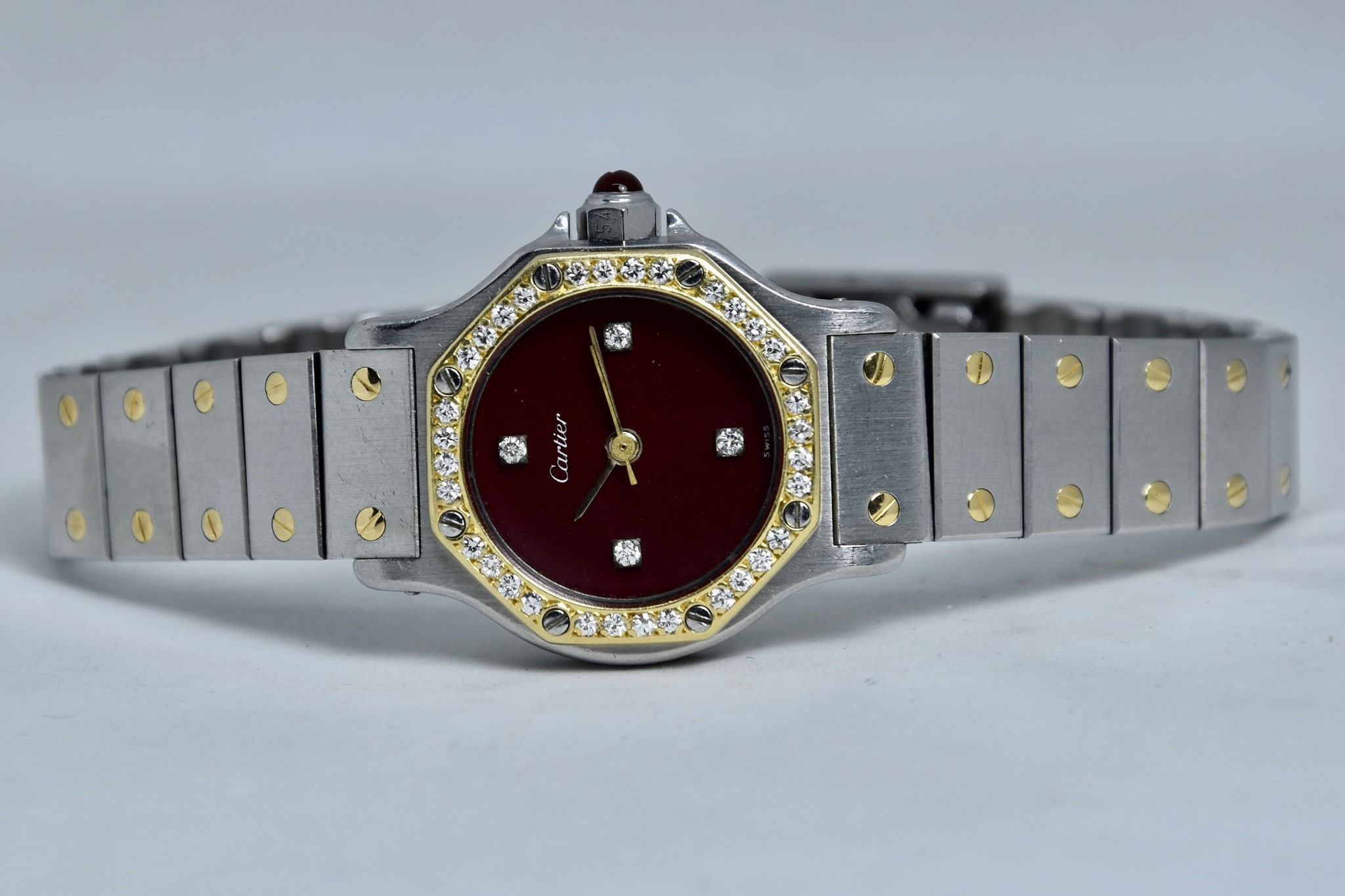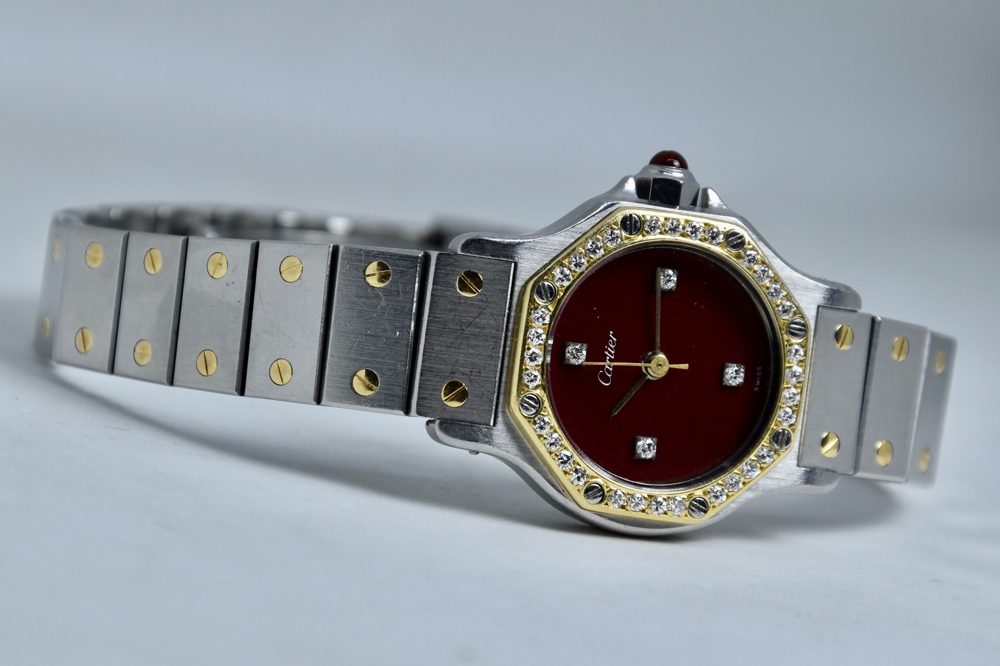 Cartier Octagon Bordeaux Dial ref. 0907 del 1984. Orologio in buone condizioni. Movimento automatico. Diametro cassa 25mm. Spendido quadrante. Vetro zaffiro (vetro originale, non scheggiato ma con dei segni interni, ovvero il cerchio che si vede nelle foto. Su richiesta possibile sostituirlo). Indicatore del datario. Corona con rubino cabochon. Con bracciale originale in acciaio con tutte le maglie. I diamanti su lunetta e quadrante sono stati aggiunti successivamente. Con scatola e garanzia originali.