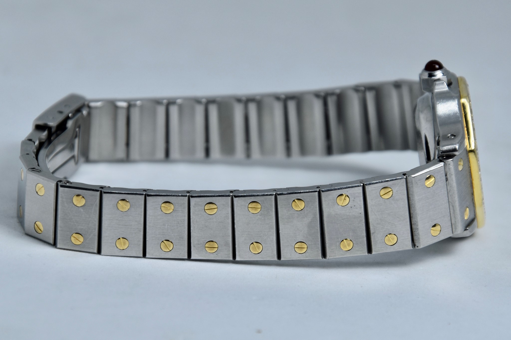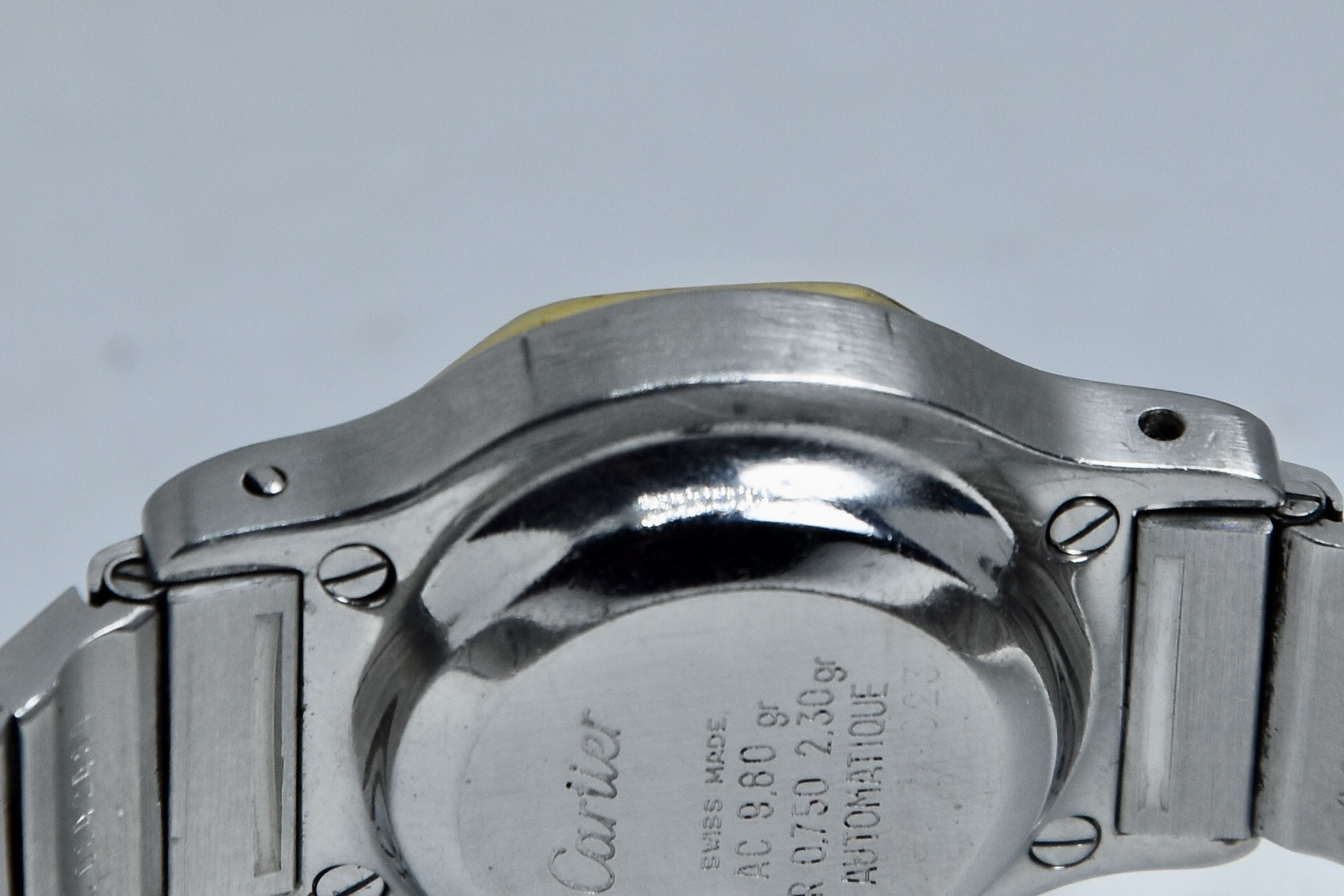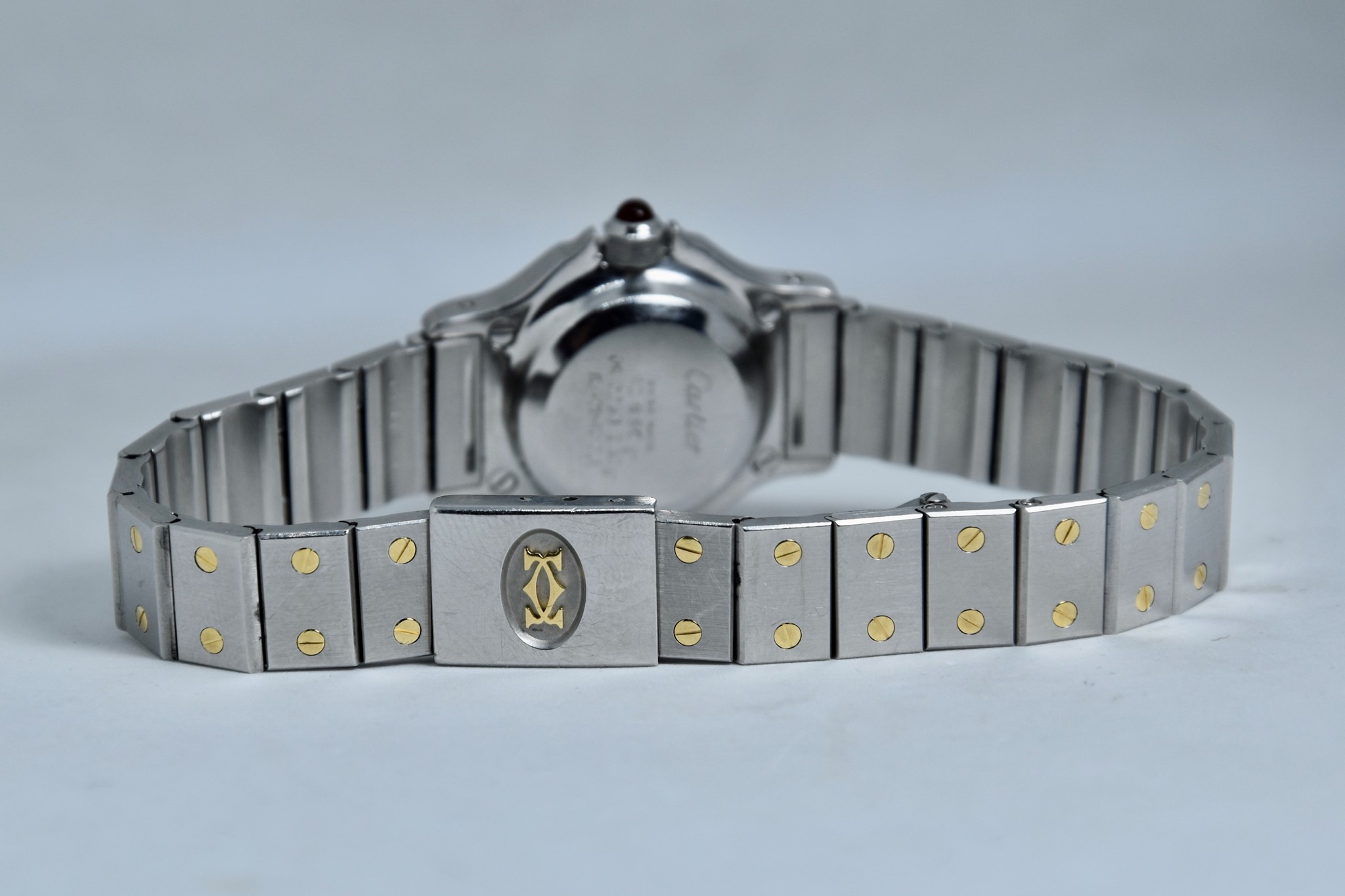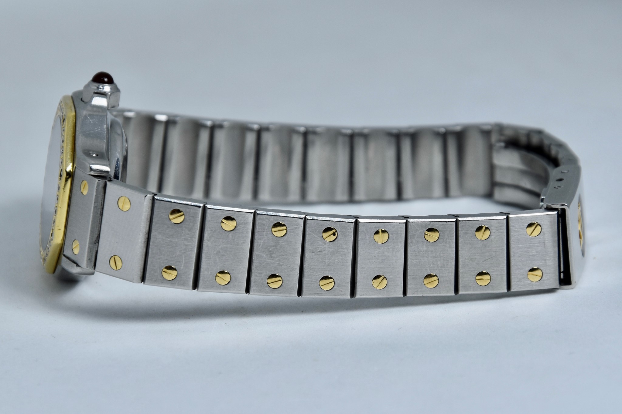Cartier Octagon Bordeaux Dial ref. 0907 del 1984. Orologio in buone condizioni. Movimento automatico. Diametro cassa 25mm. Spendido quadrante. Vetro zaffiro (vetro originale, non scheggiato ma con dei segni interni, ovvero il cerchio che si vede nelle foto. Su richiesta possibile sostituirlo). Indicatore del datario. Corona con rubino cabochon. Con bracciale originale in acciaio con tutte le maglie. I diamanti su lunetta e quadrante sono stati aggiunti successivamente. Con scatola e garanzia originali.
