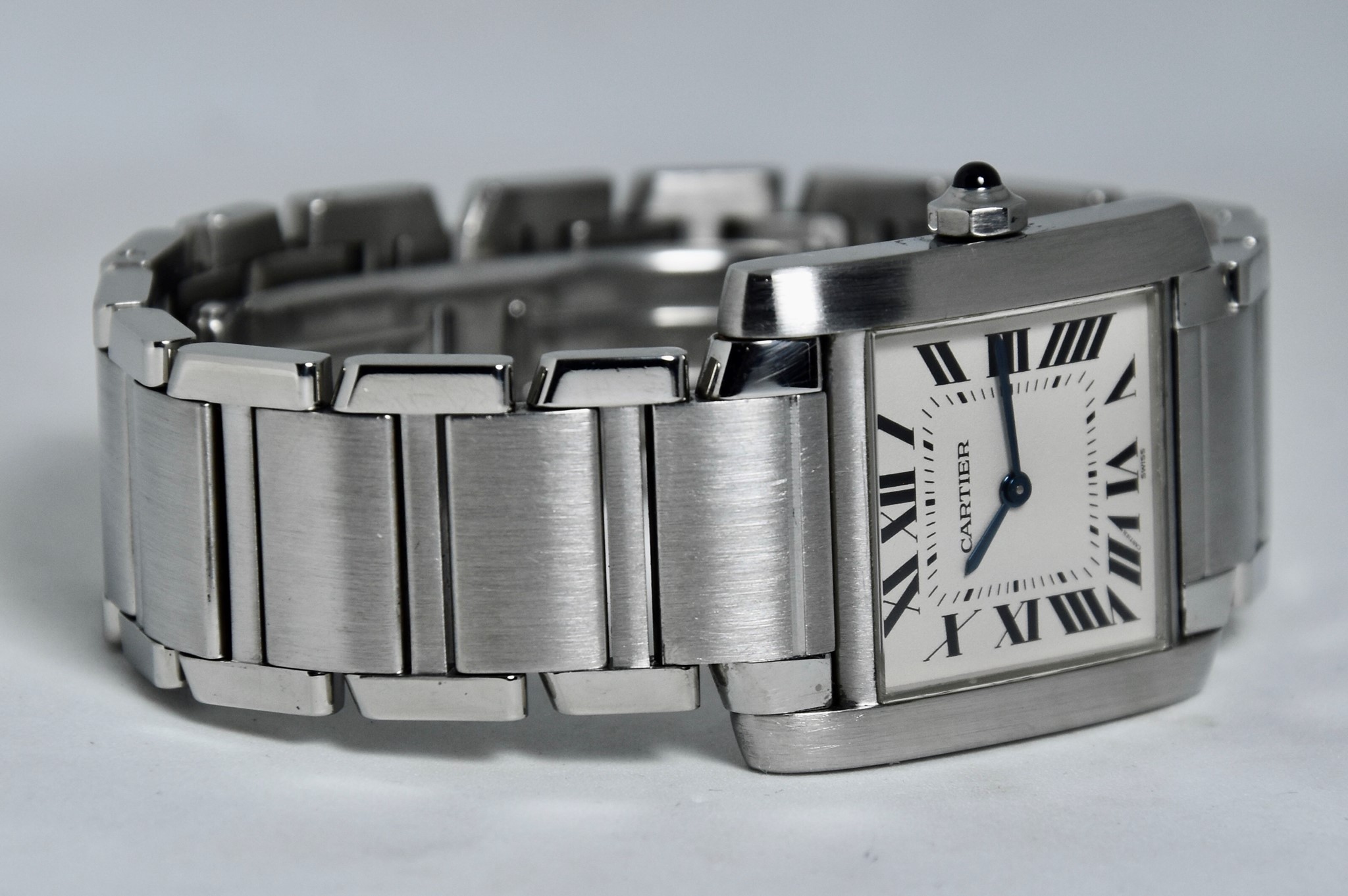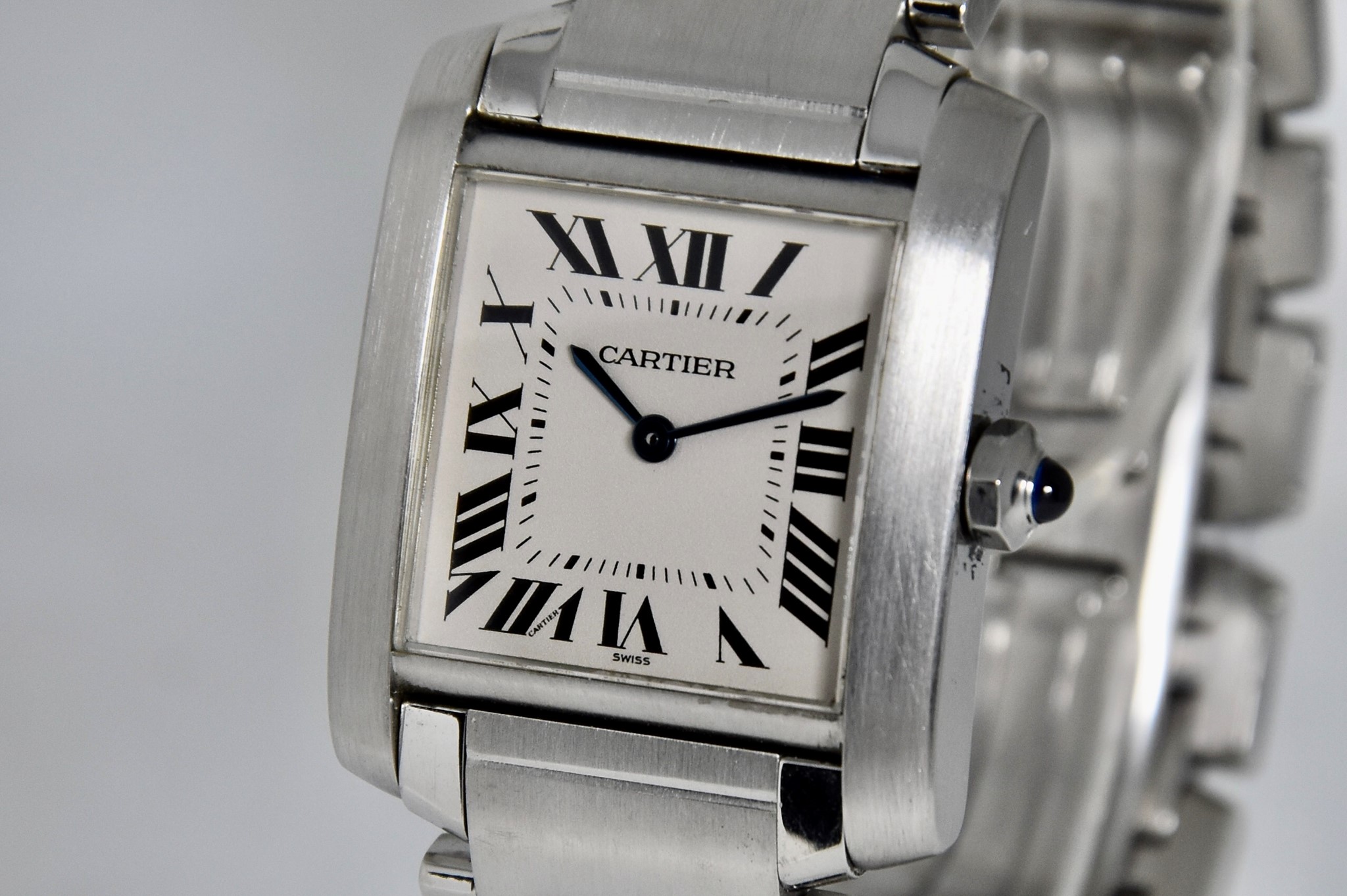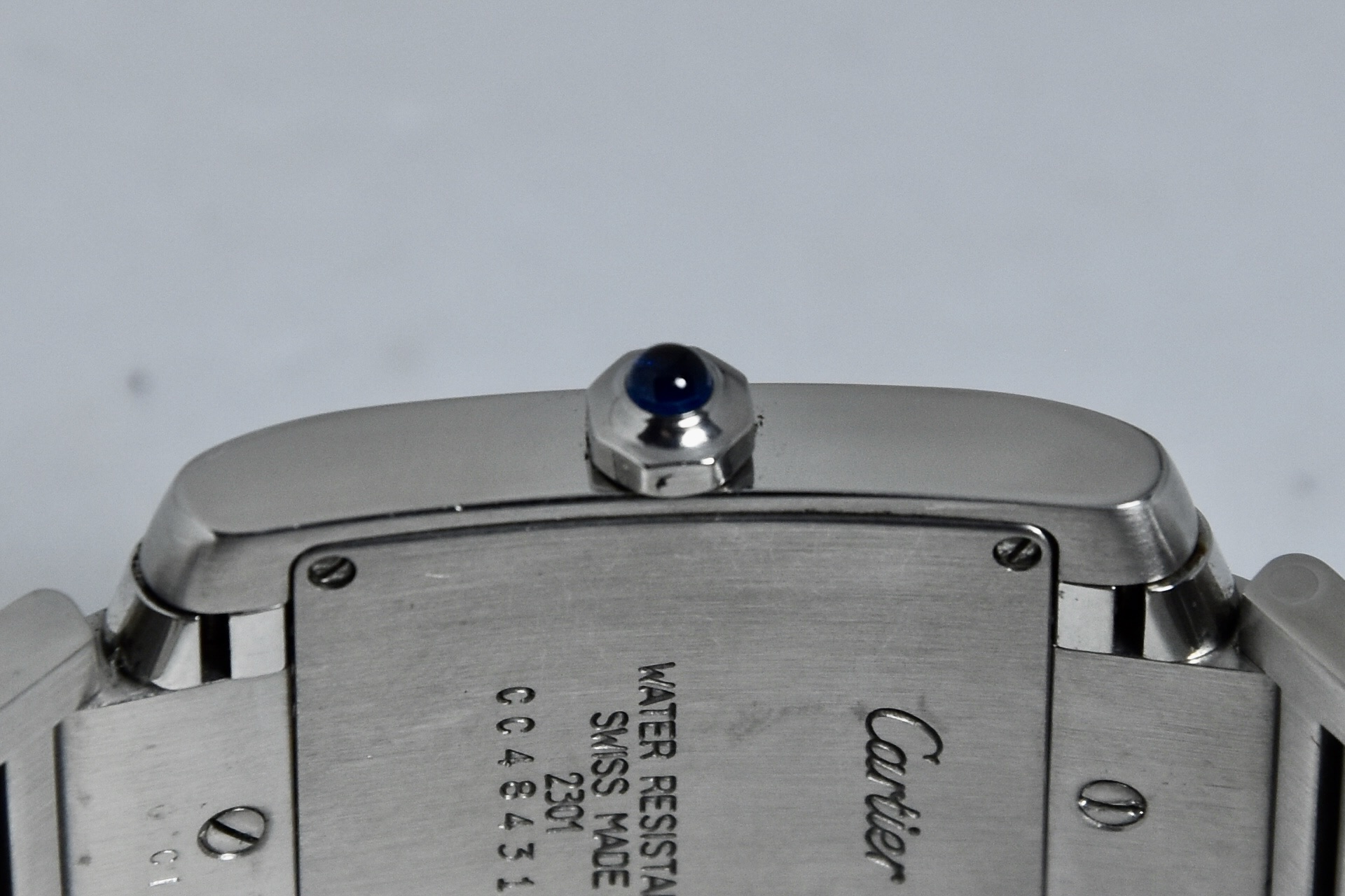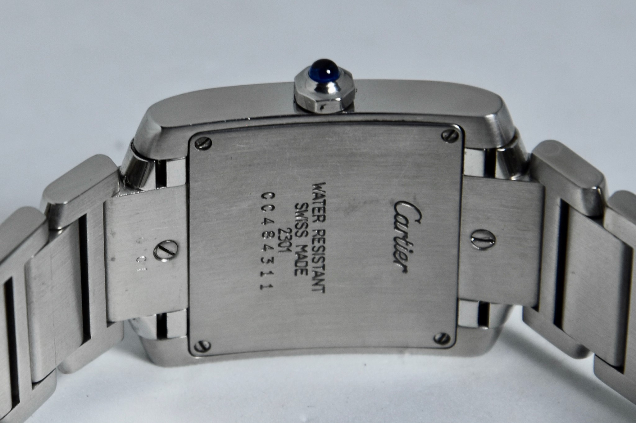 Cartier Tank Francaise ref.2301 del 1998. Orologio in acciaio in ottime condizioni. Movimento al quarzo, calibro Cartier 157 senza sfera dei secondi. Diametro cassa 25x37 mm. Quadrante bianco con numeri romani. Vetro zaffiro. Corona con zaffiro cabochon. Con bracciale originale in acciaio in ottime condizioni. Senza scatola né garanzia originali.