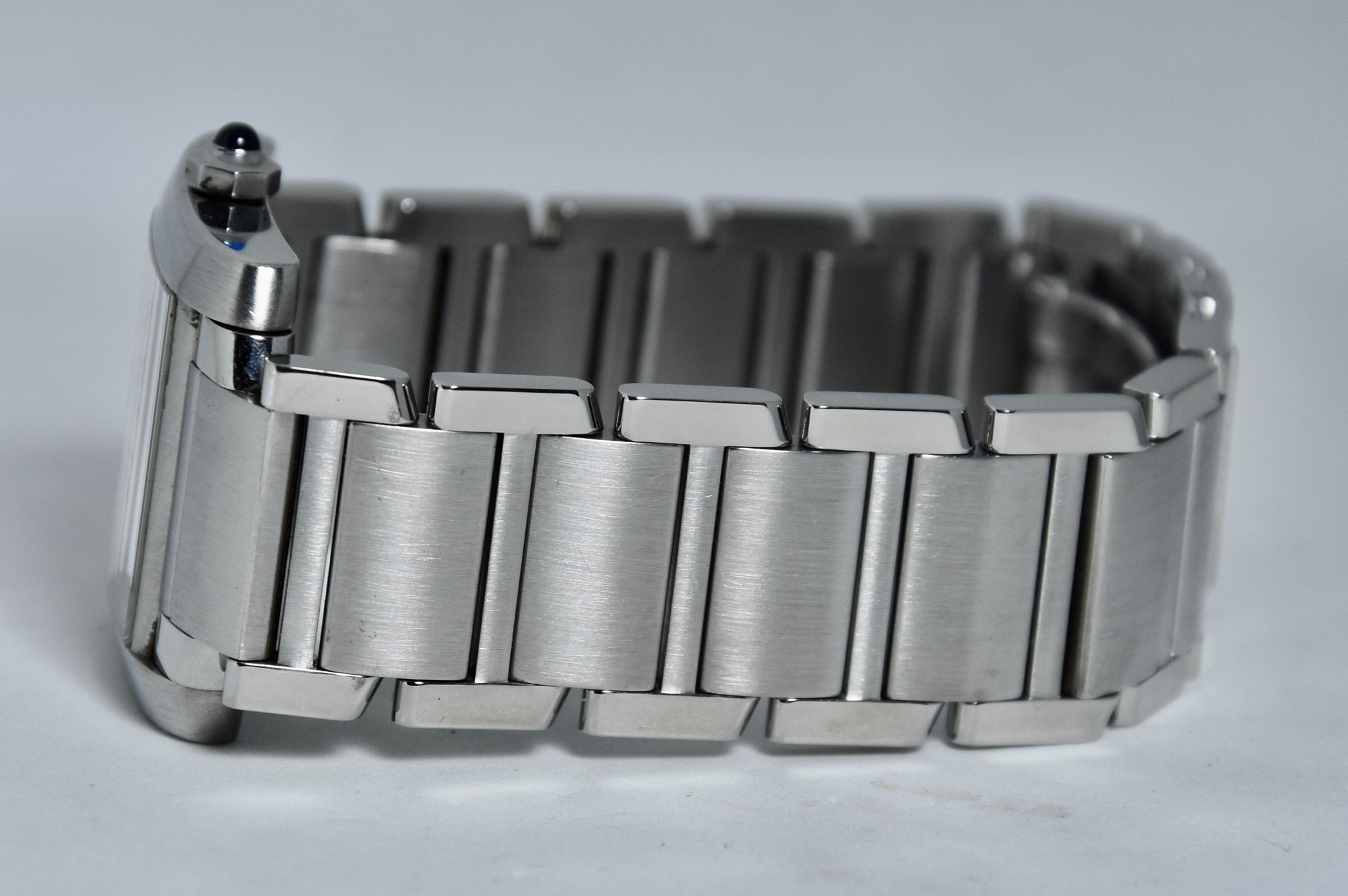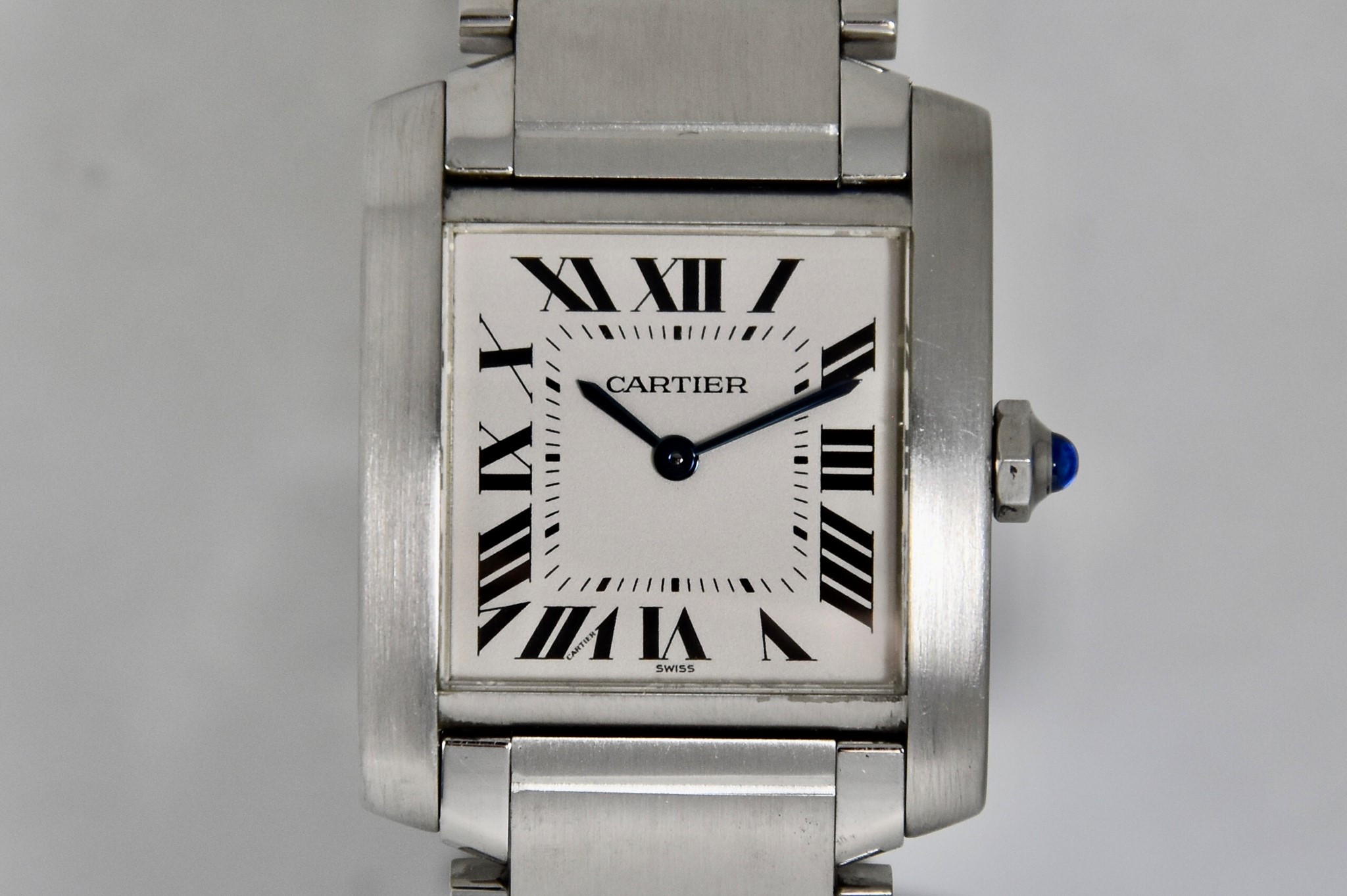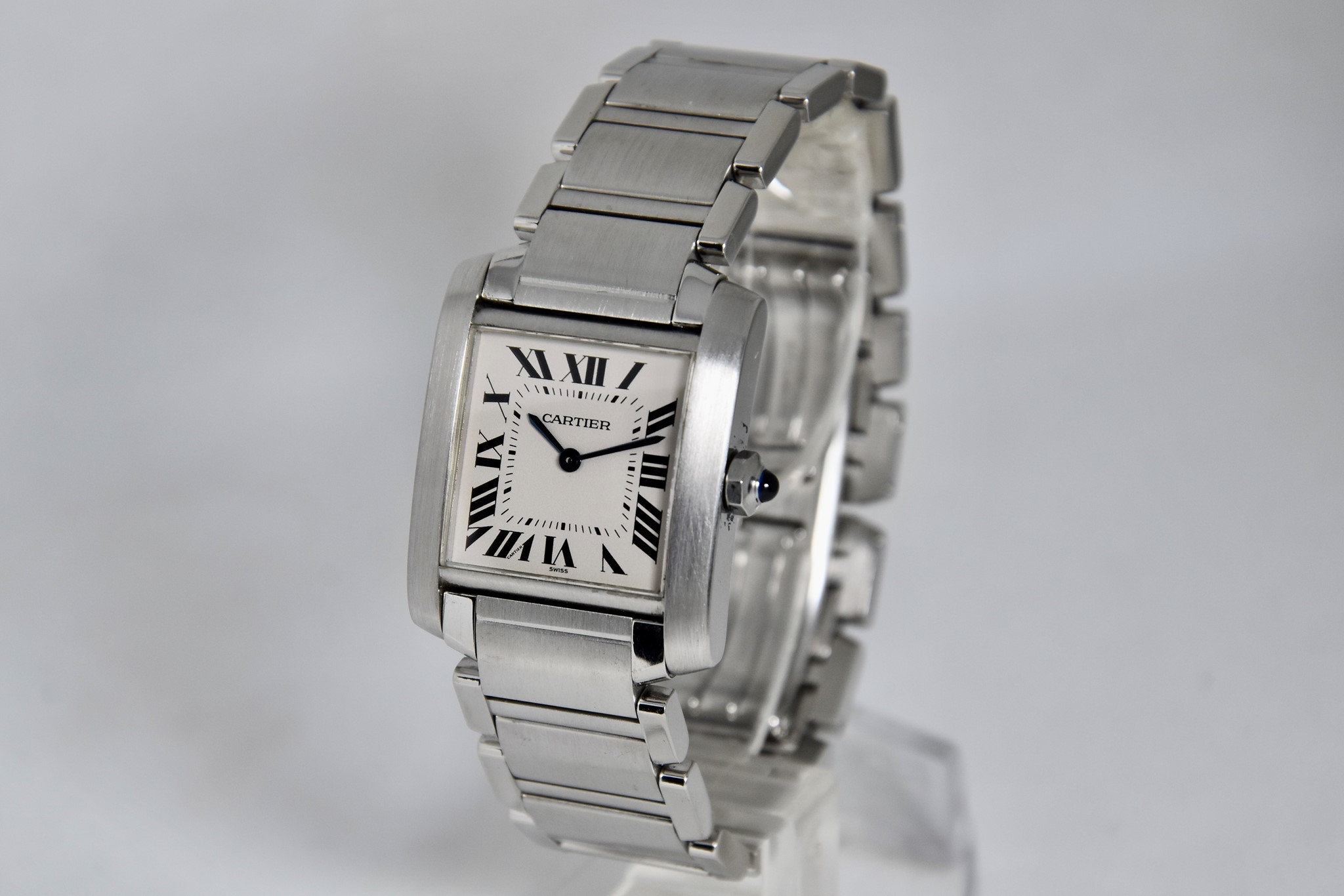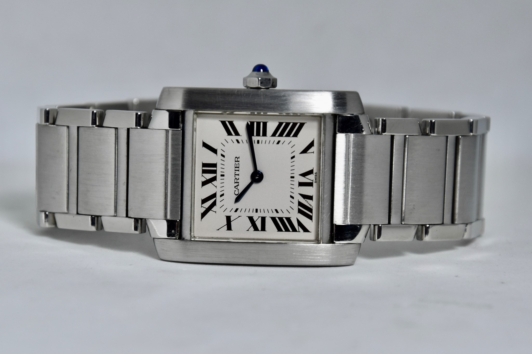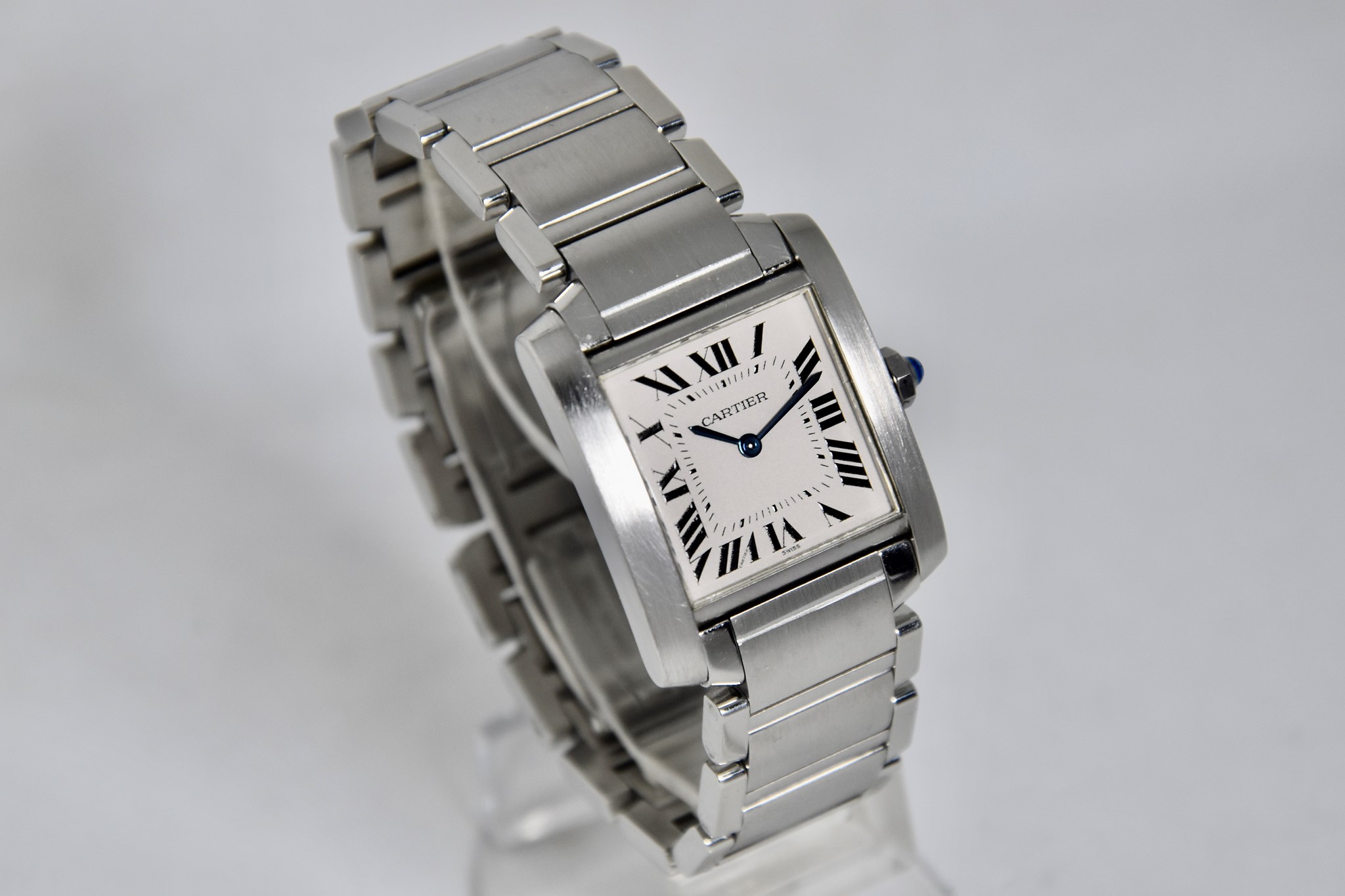 Cartier Tank Francaise ref.2301 del 1998. Orologio in acciaio in ottime condizioni. Movimento al quarzo, calibro Cartier 157 senza sfera dei secondi. Diametro cassa 25x37 mm. Quadrante bianco con numeri romani. Vetro zaffiro. Corona con zaffiro cabochon. Con bracciale originale in acciaio in ottime condizioni. Senza scatola né garanzia originali.