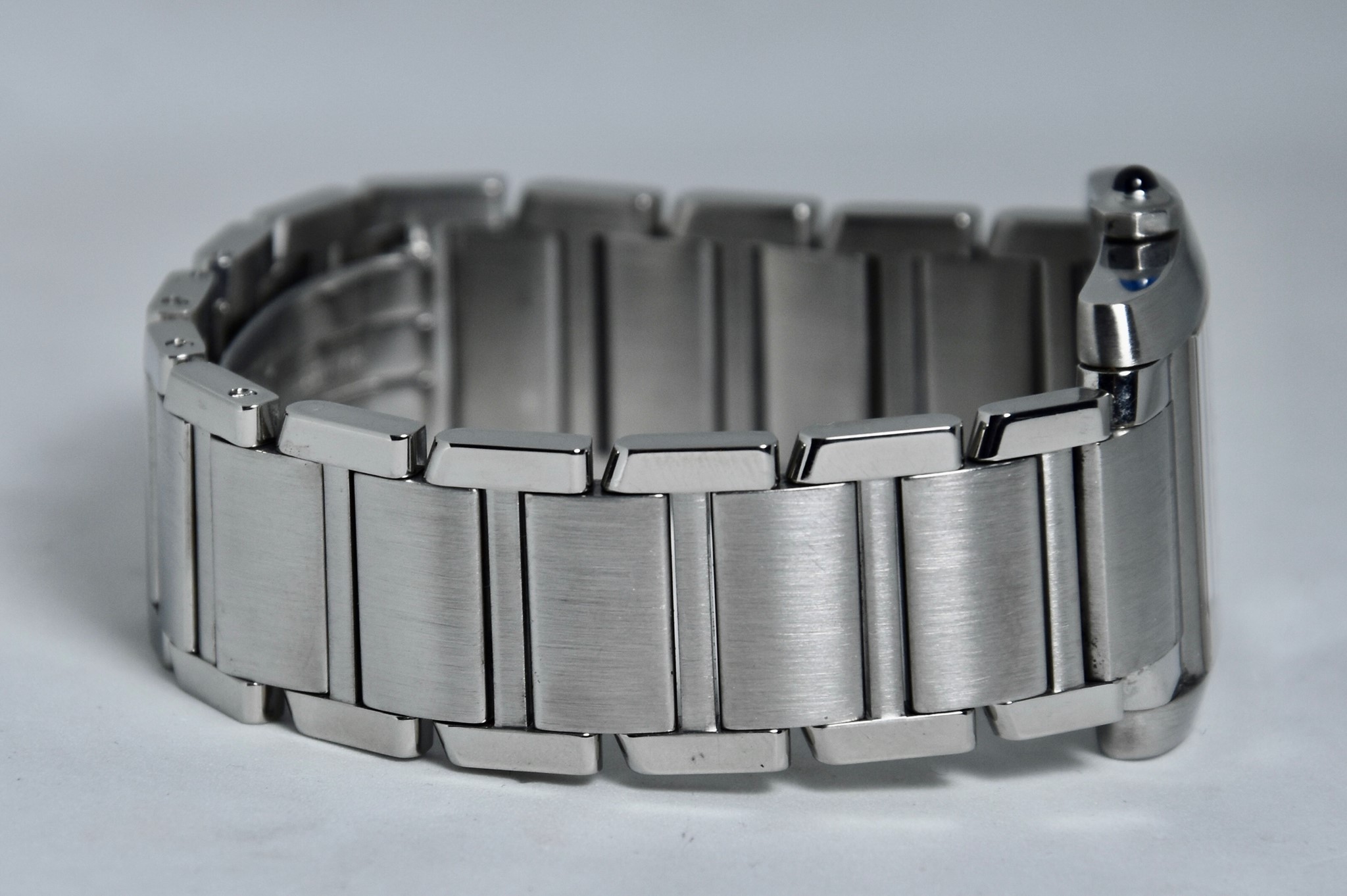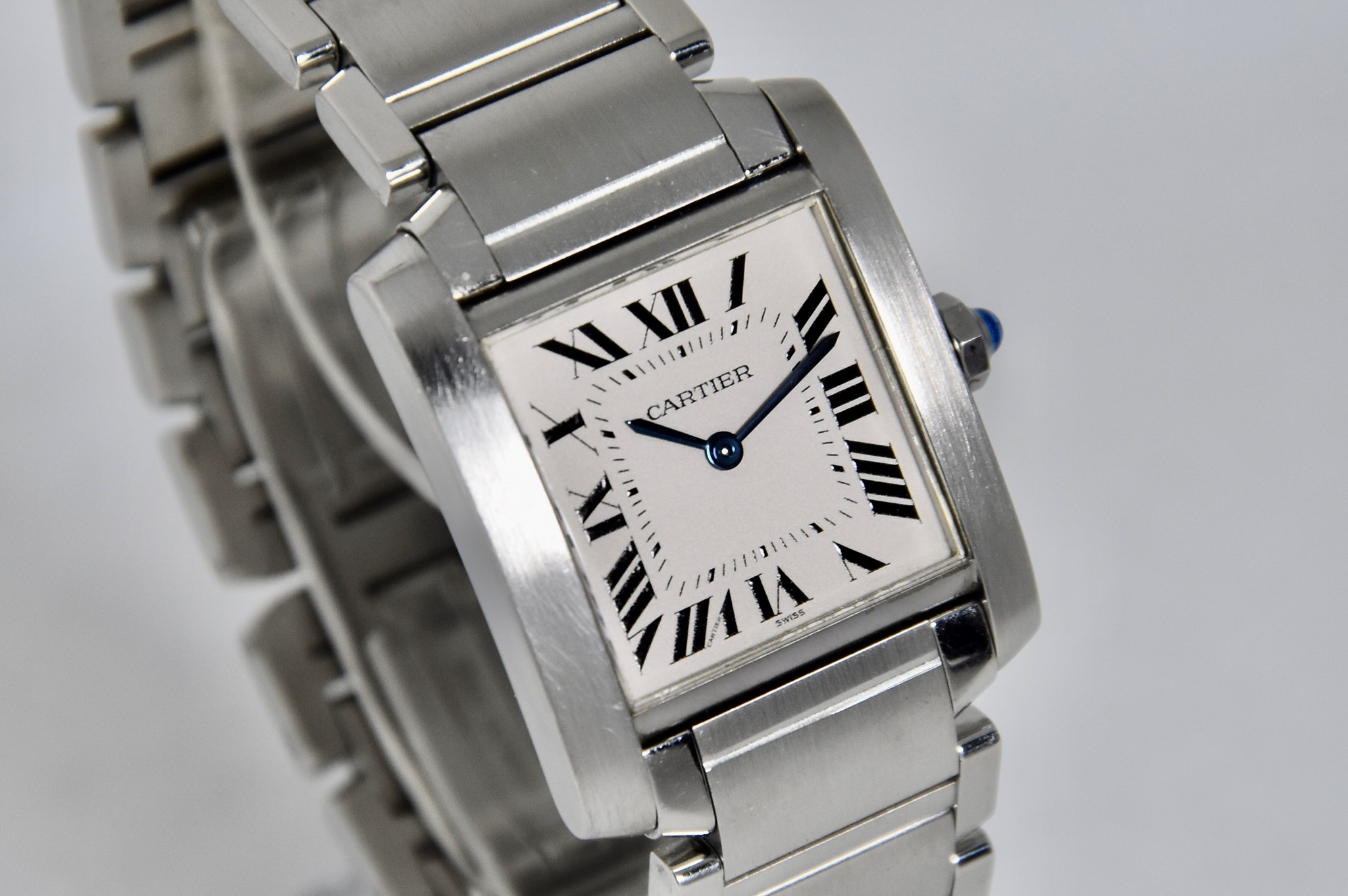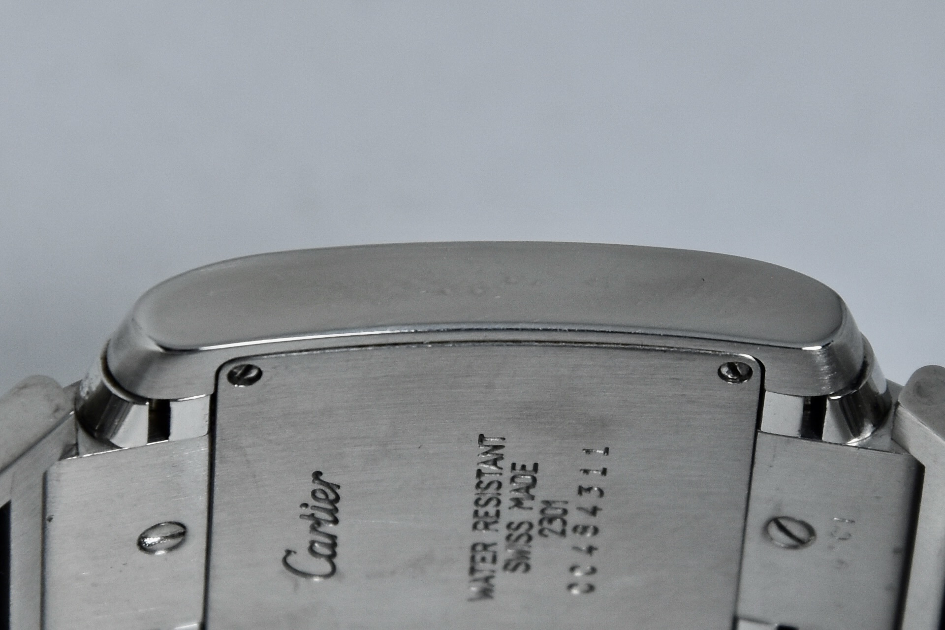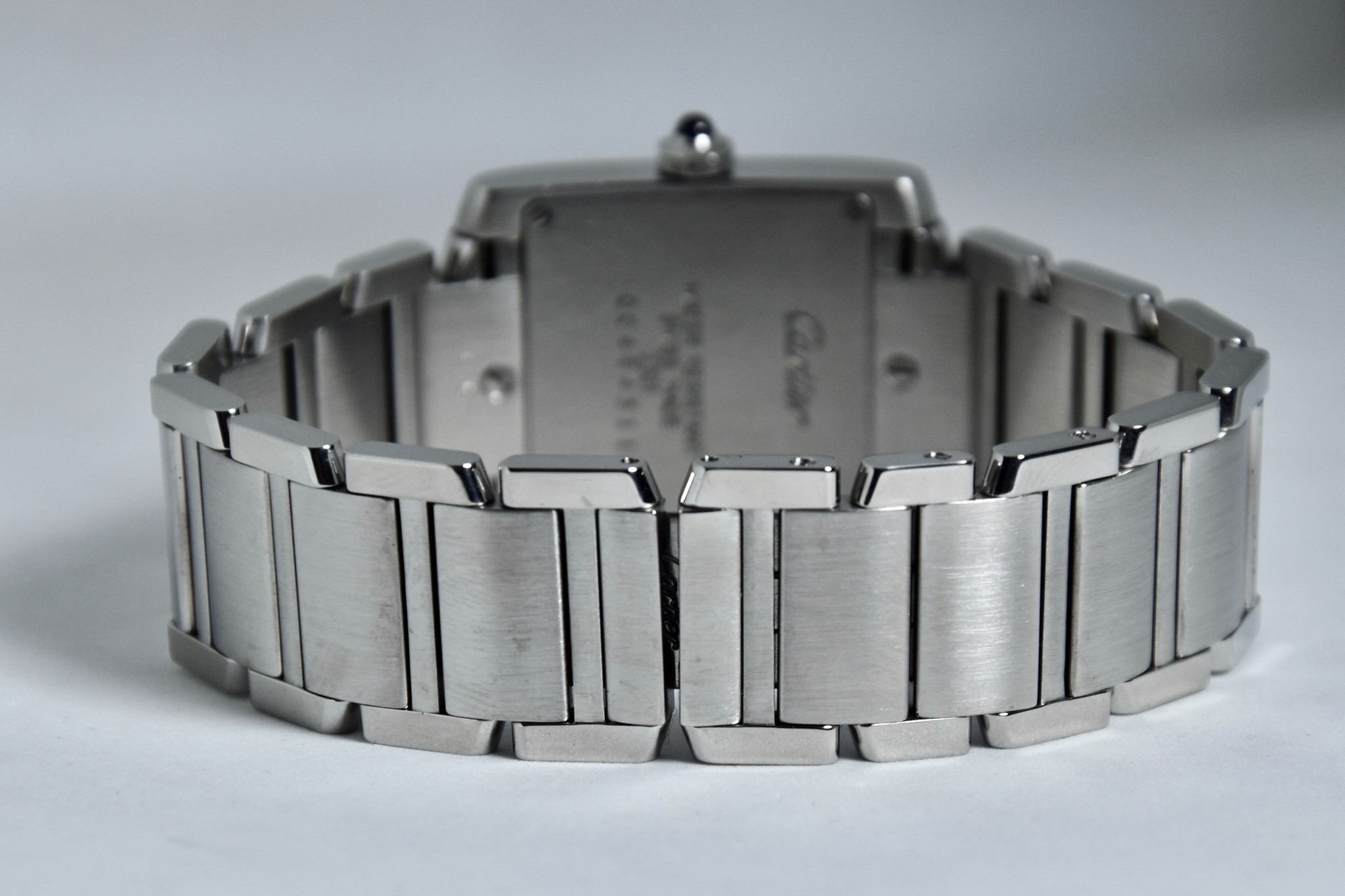 Cartier Tank Francaise ref.2301 del 1998. Orologio in acciaio in ottime condizioni. Movimento al quarzo, calibro Cartier 157 senza sfera dei secondi. Diametro cassa 25x37 mm. Quadrante bianco con numeri romani. Vetro zaffiro. Corona con zaffiro cabochon. Con bracciale originale in acciaio in ottime condizioni. Senza scatola né garanzia originali.