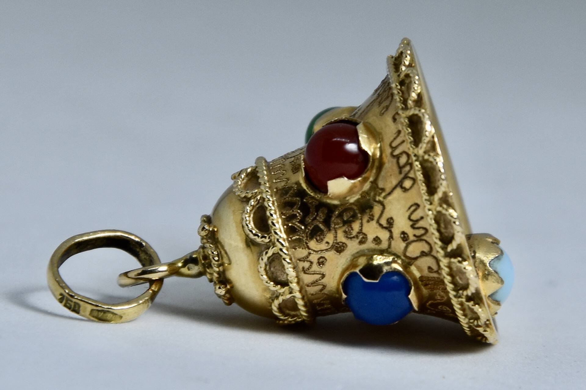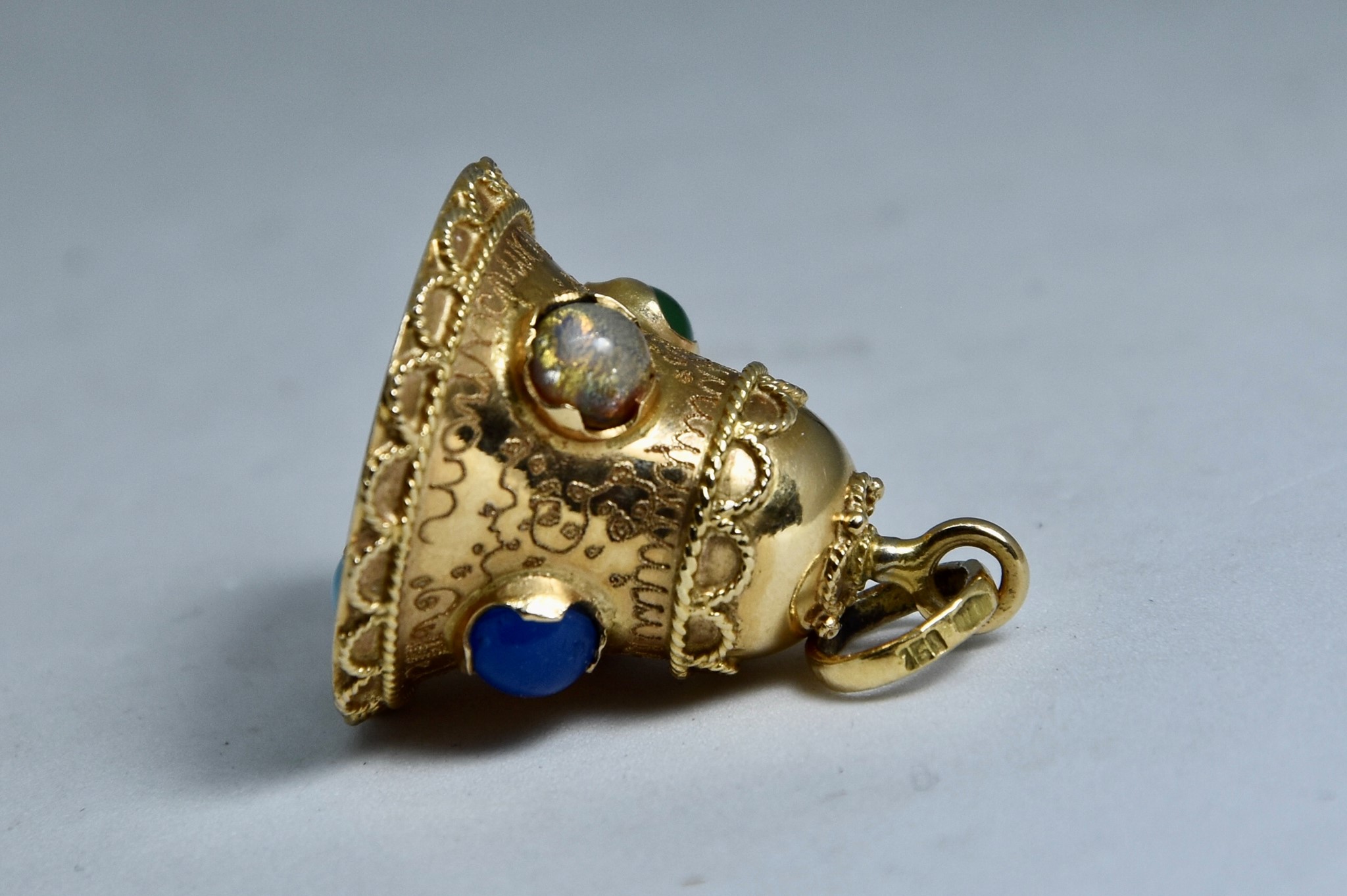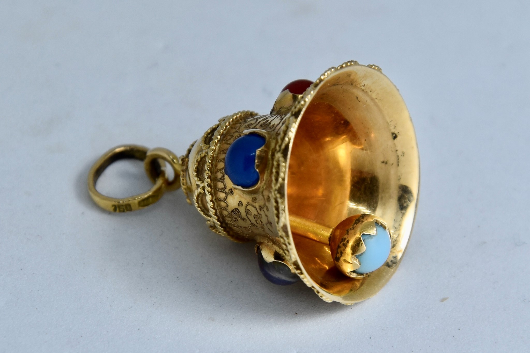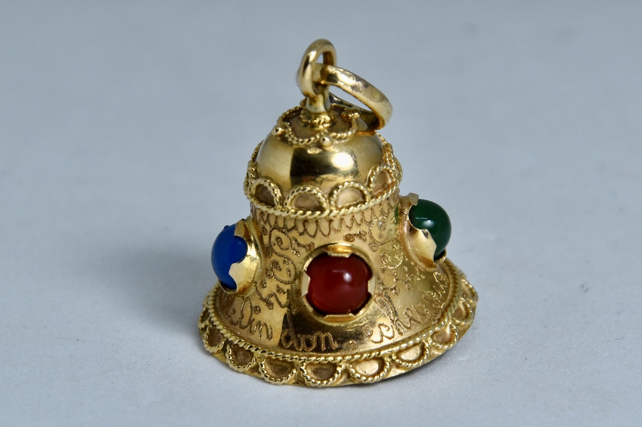 Ciondolo campana in oro giallo 750/00 con pietre colorate naturali varie. Dimensione ciondolo 3,00x2,10cm (incluso anello). Peso 6,85g.