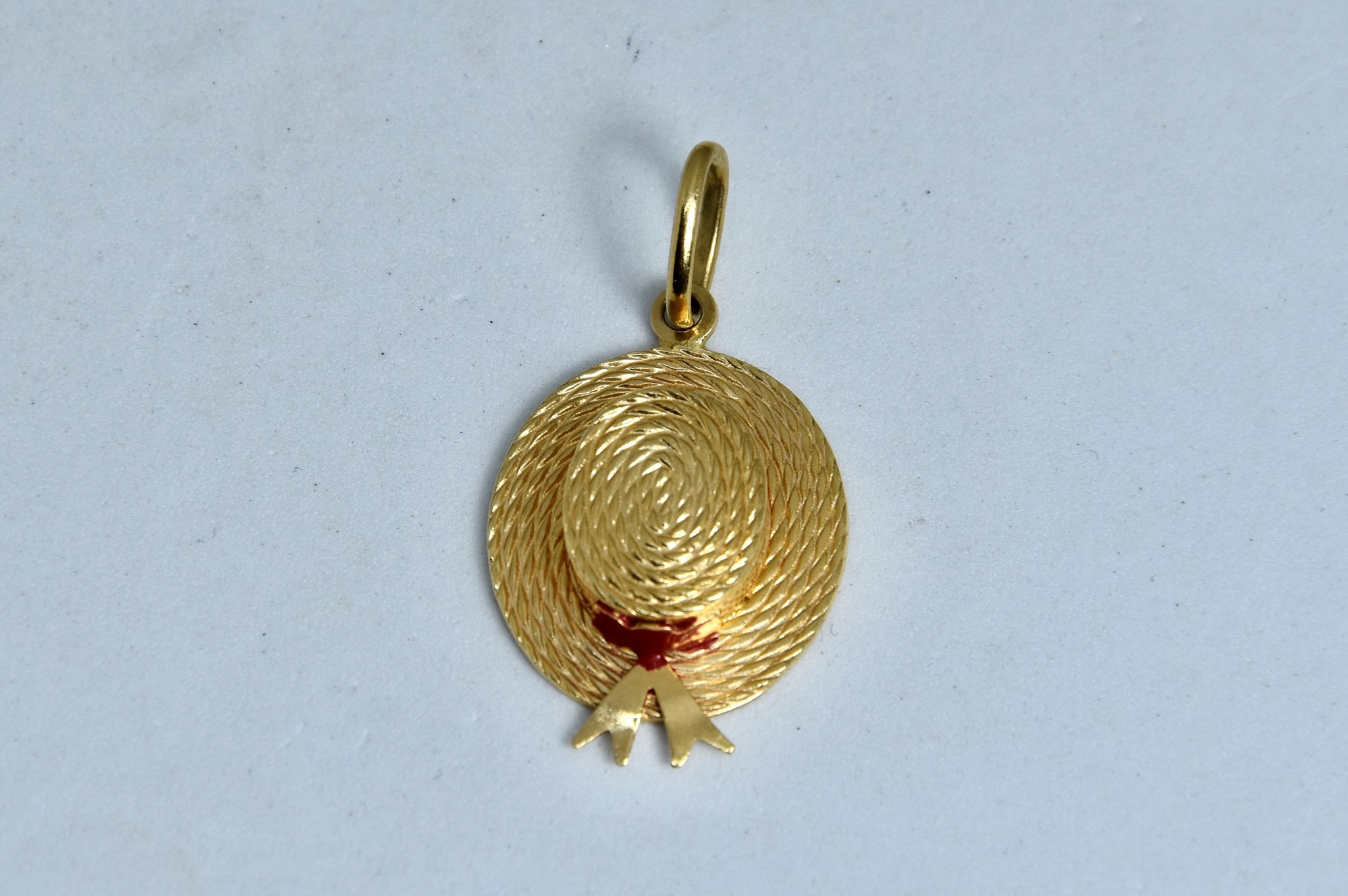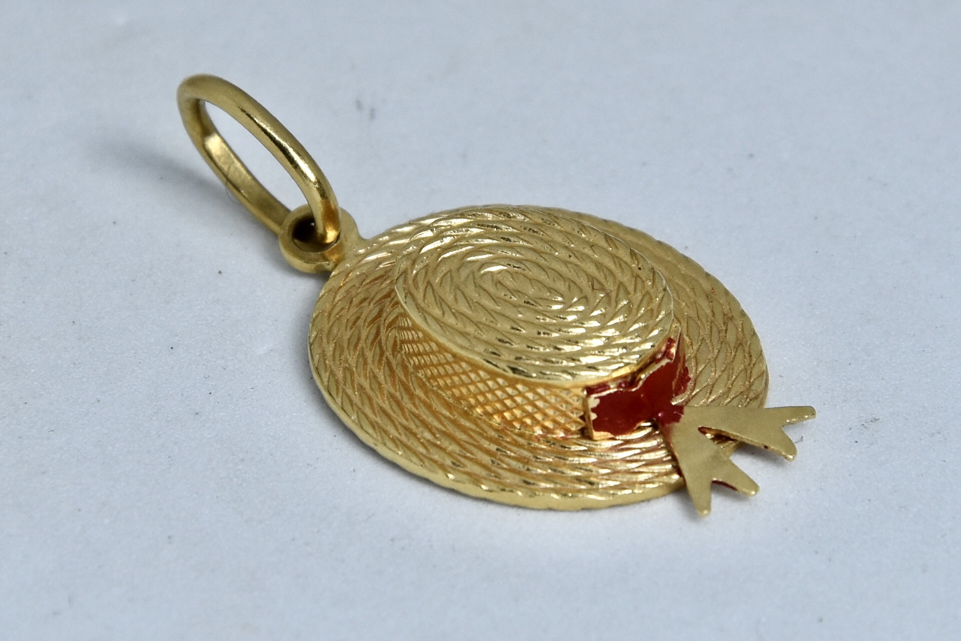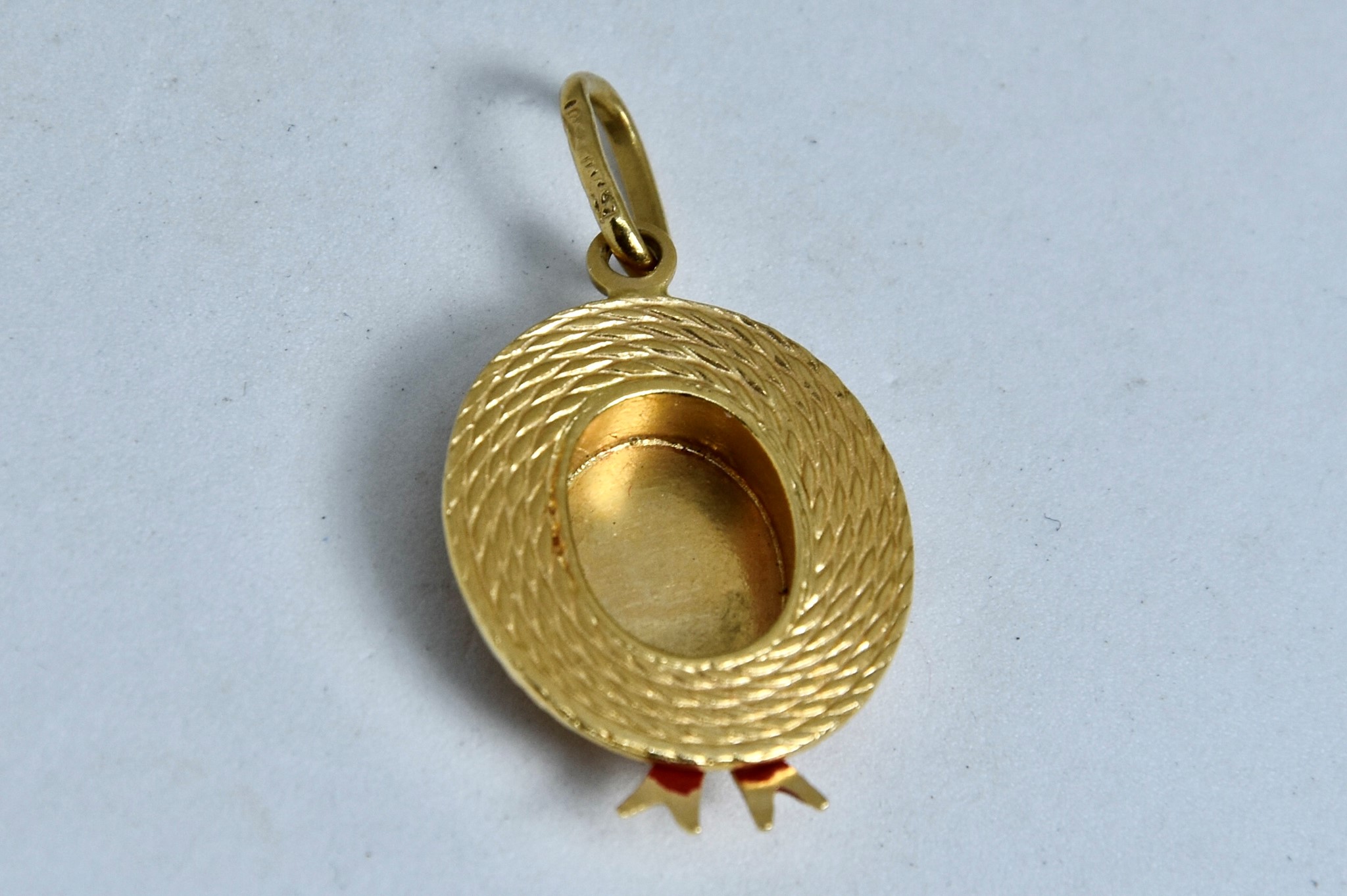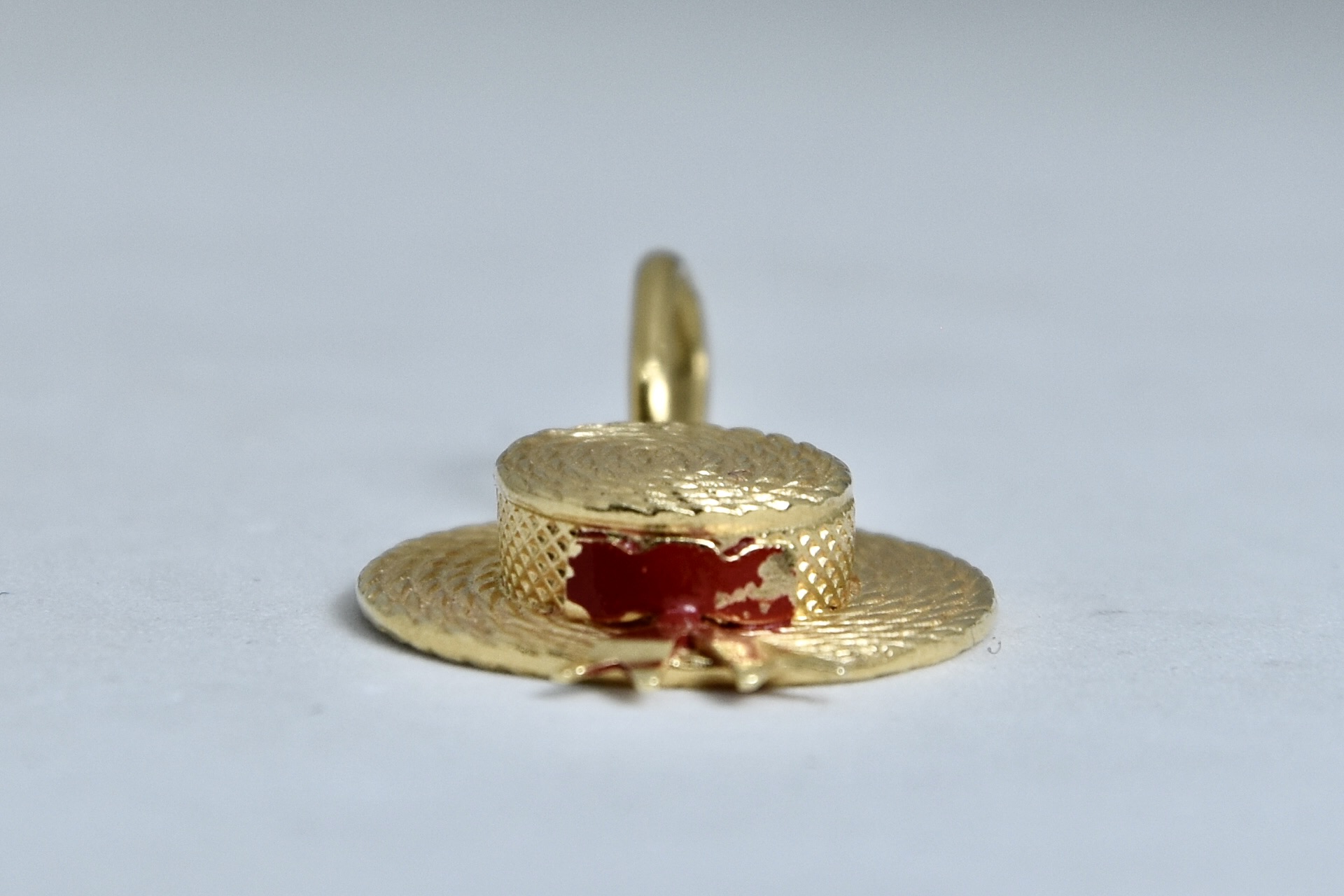 Ciondolo in oro giallo 750/00 a forma di cappello (ideale come charm) con fiocchetto smaltato rosso, ma rovinato. Dimensione 2,30x1,70cm (escluso anellino). Peso ciondolo 3,95g.