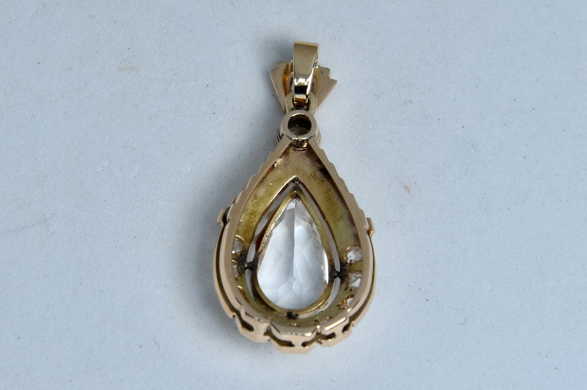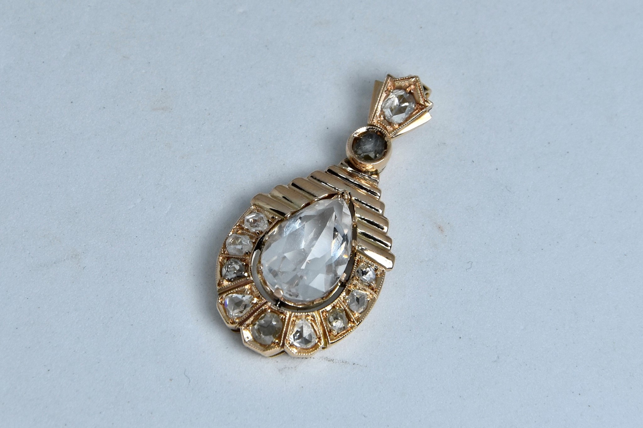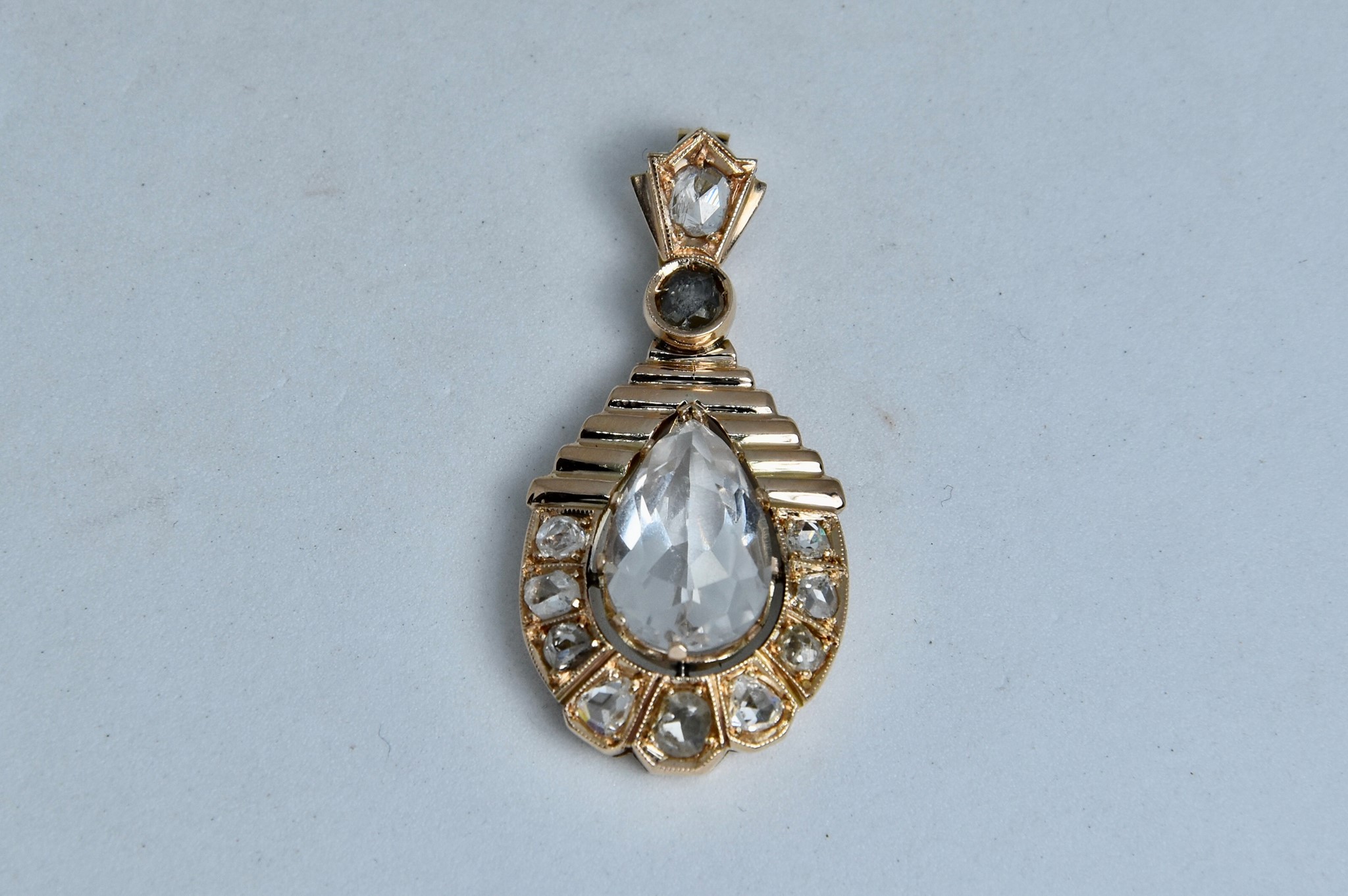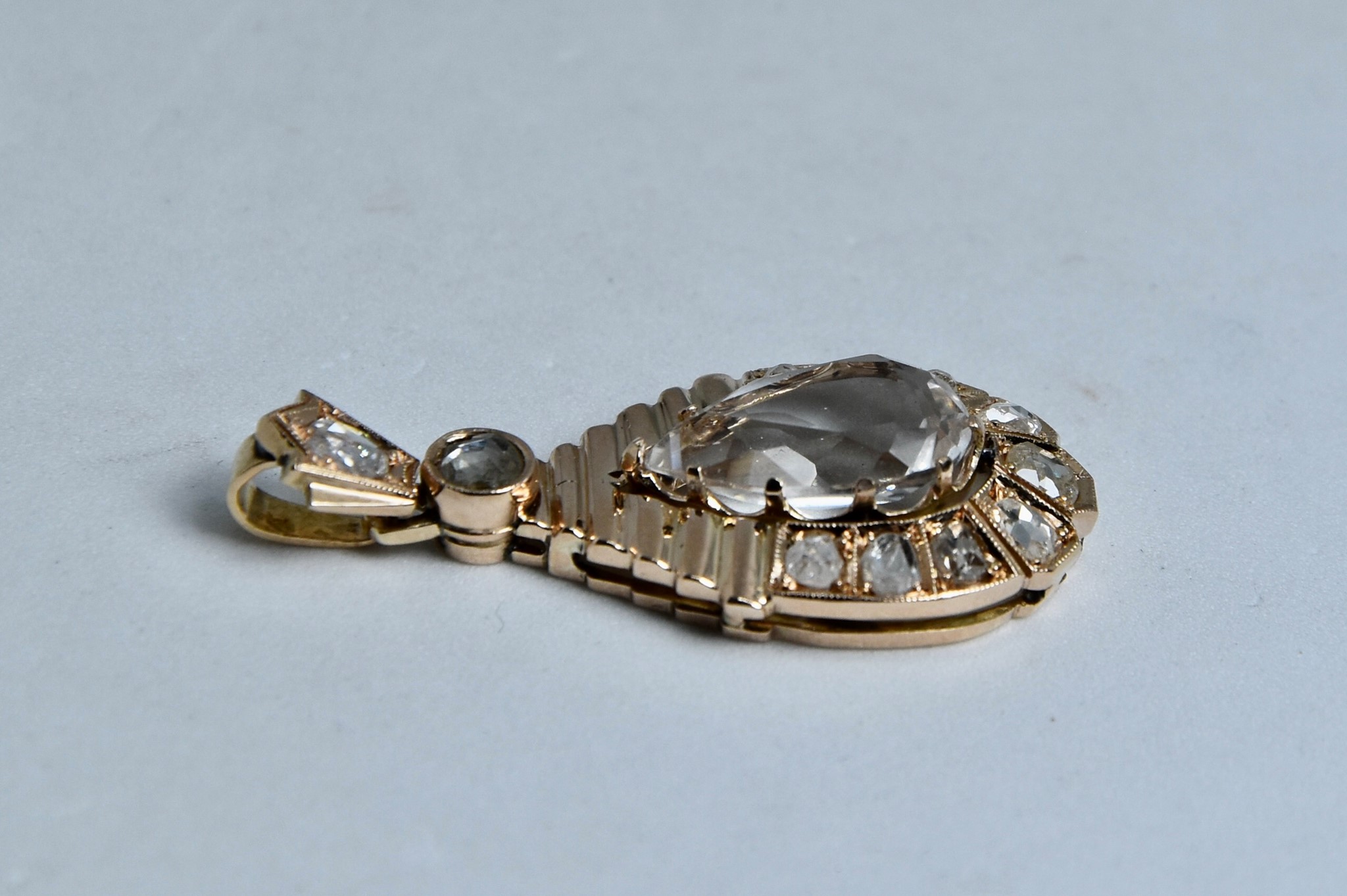 Ciondolo in oro rosa 585/00 a forma di goccia con cristallo di rocca centrale dal taglio a goccia di circa 4,00ct e 11 diamanti taglio rosetta. Dimensione ciondolo con anellino 3,30x1,60 cm. Peso 4,15g.