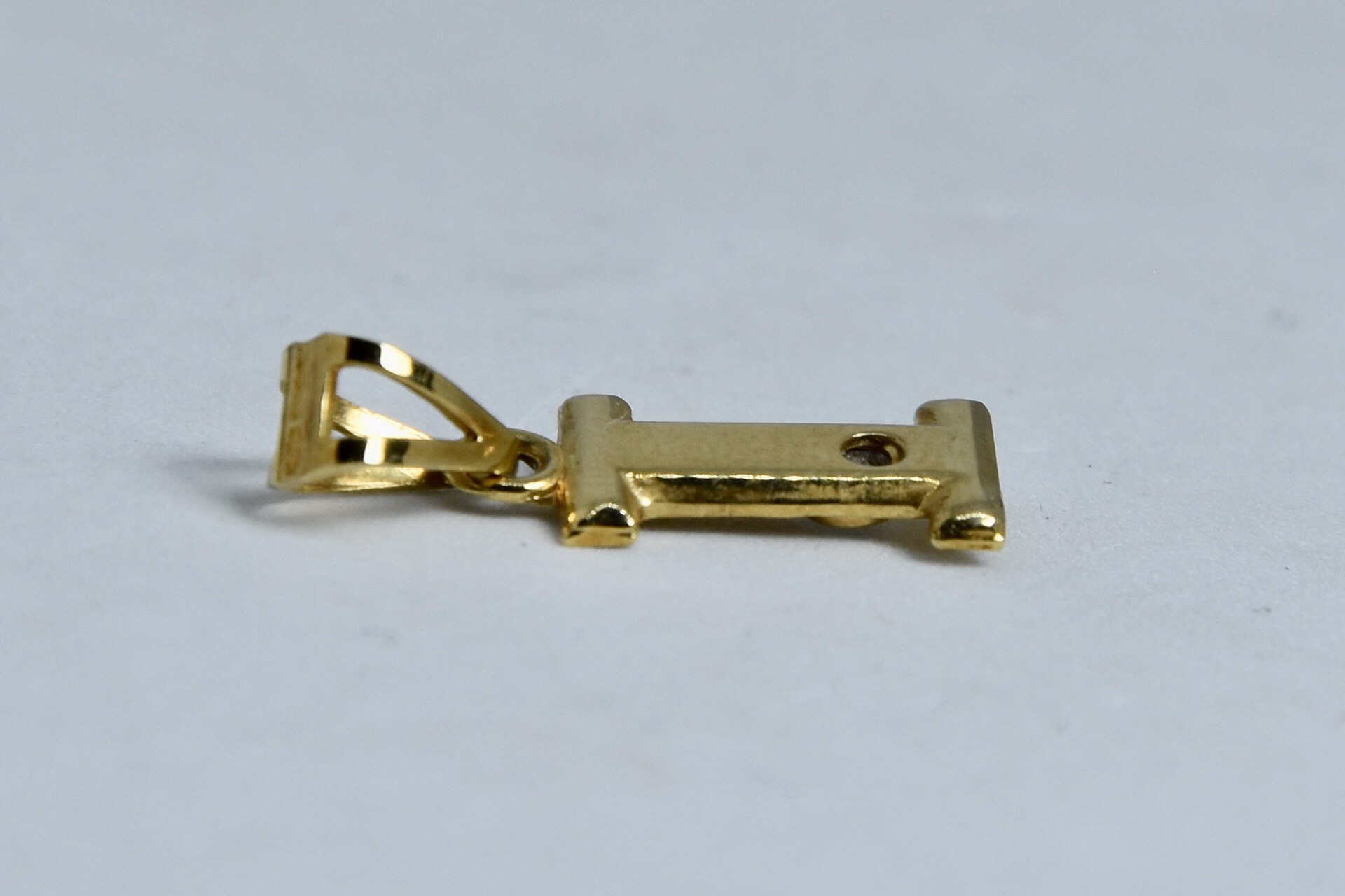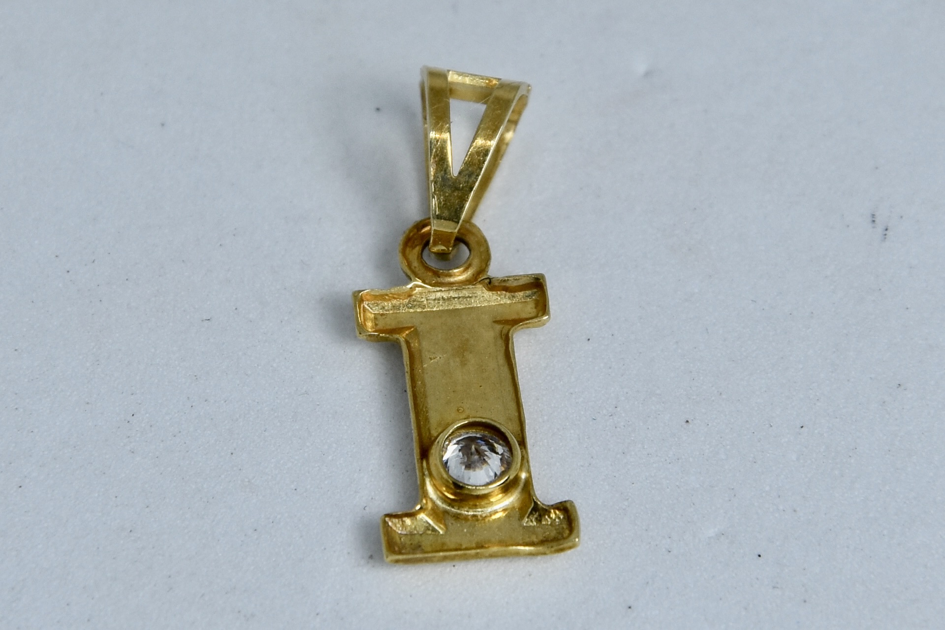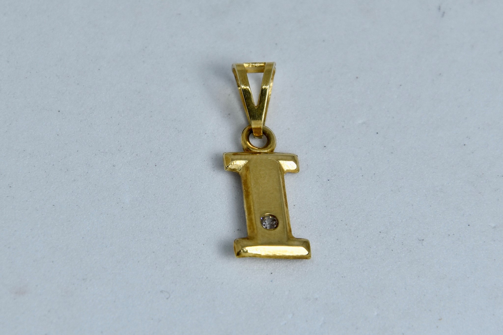 Ciondolo in oro giallo 750/00 iniziale lettera "I" con piccolo zircone. Dimensione 1,50x0,70cm (escluso anellino). Peso 0,75g.