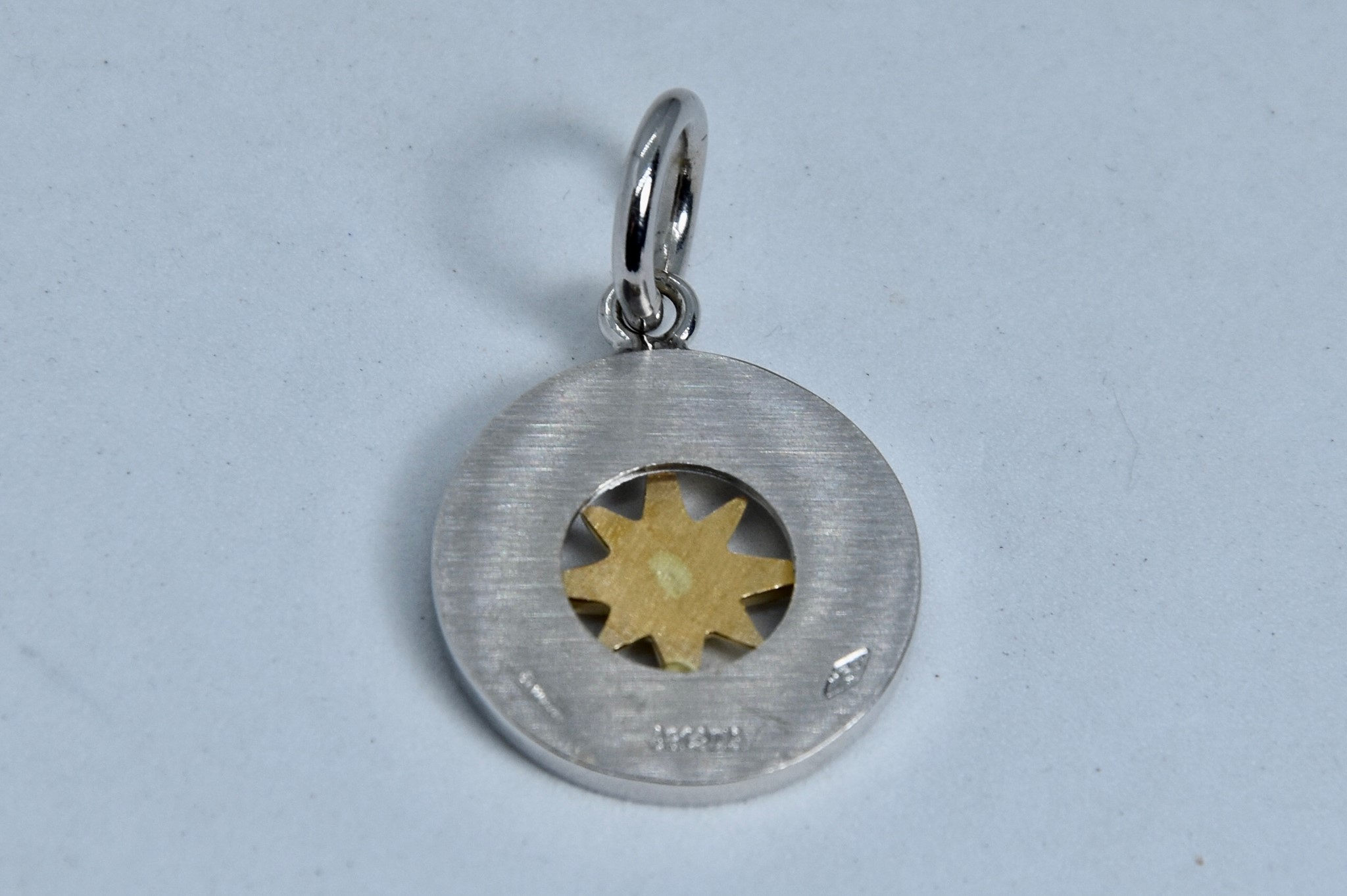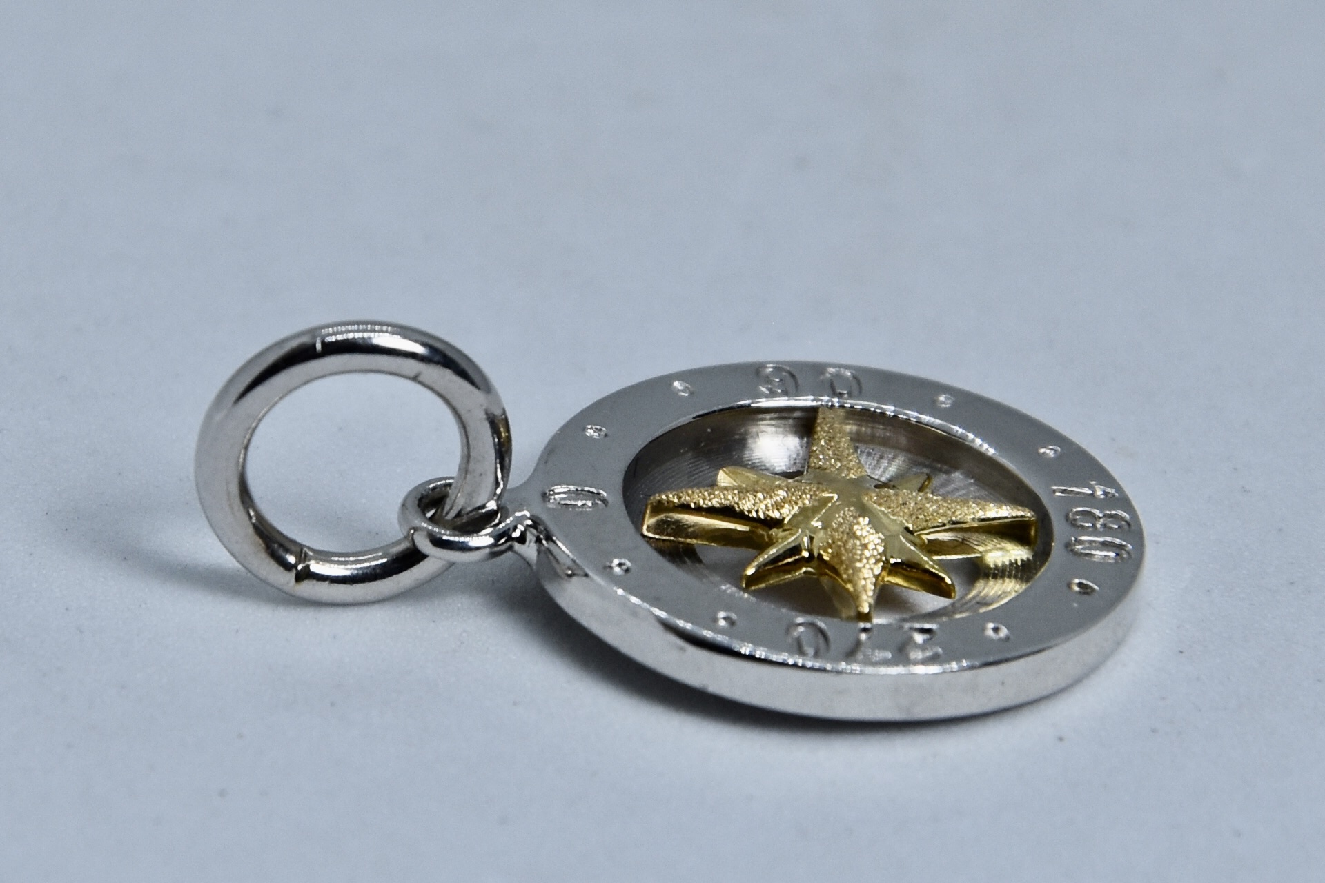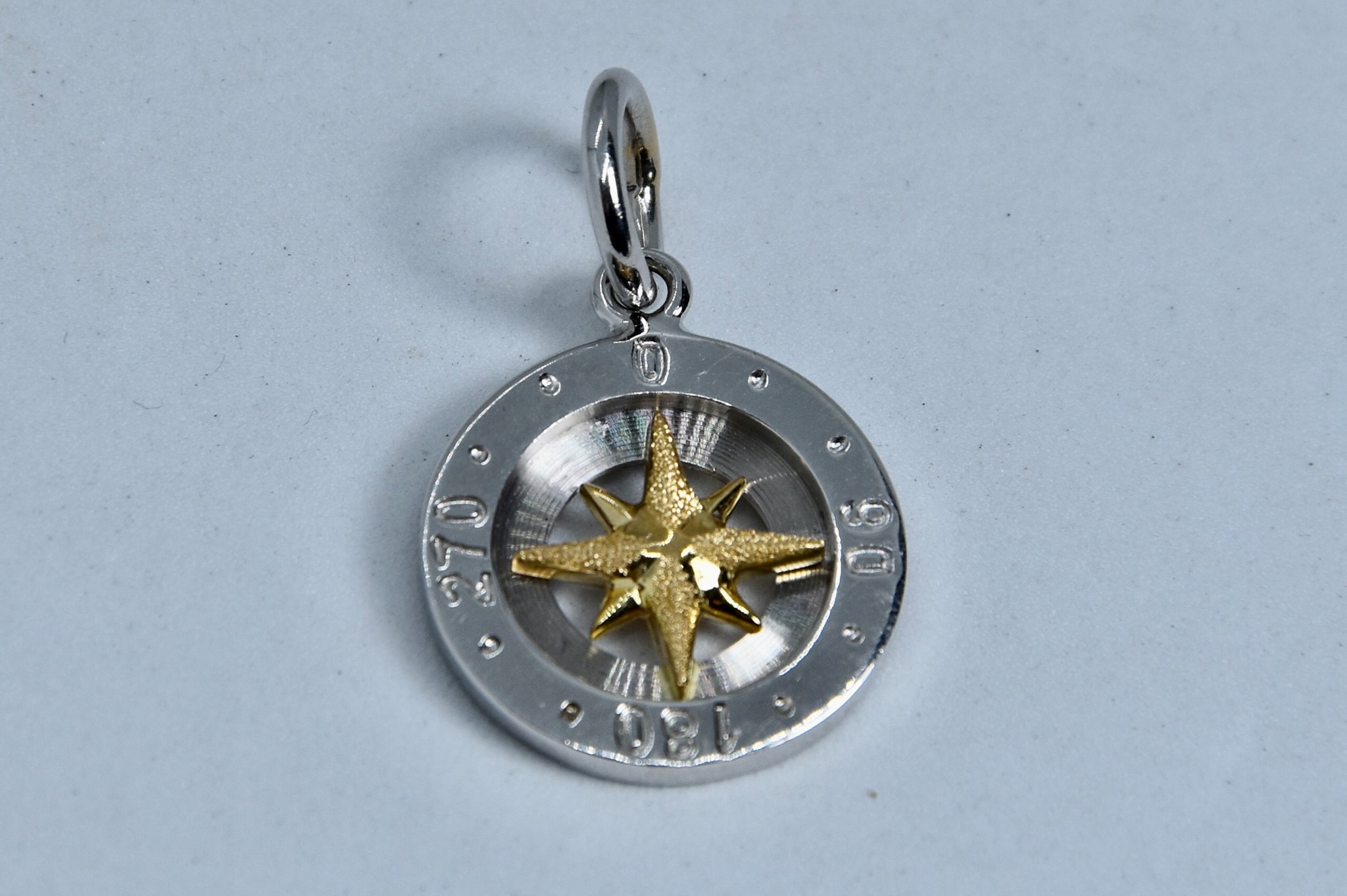 Ciondolo rosa dei venti in oro bianco e giallo 750/00. Diametro 1,70cm. Peso 4,60g.