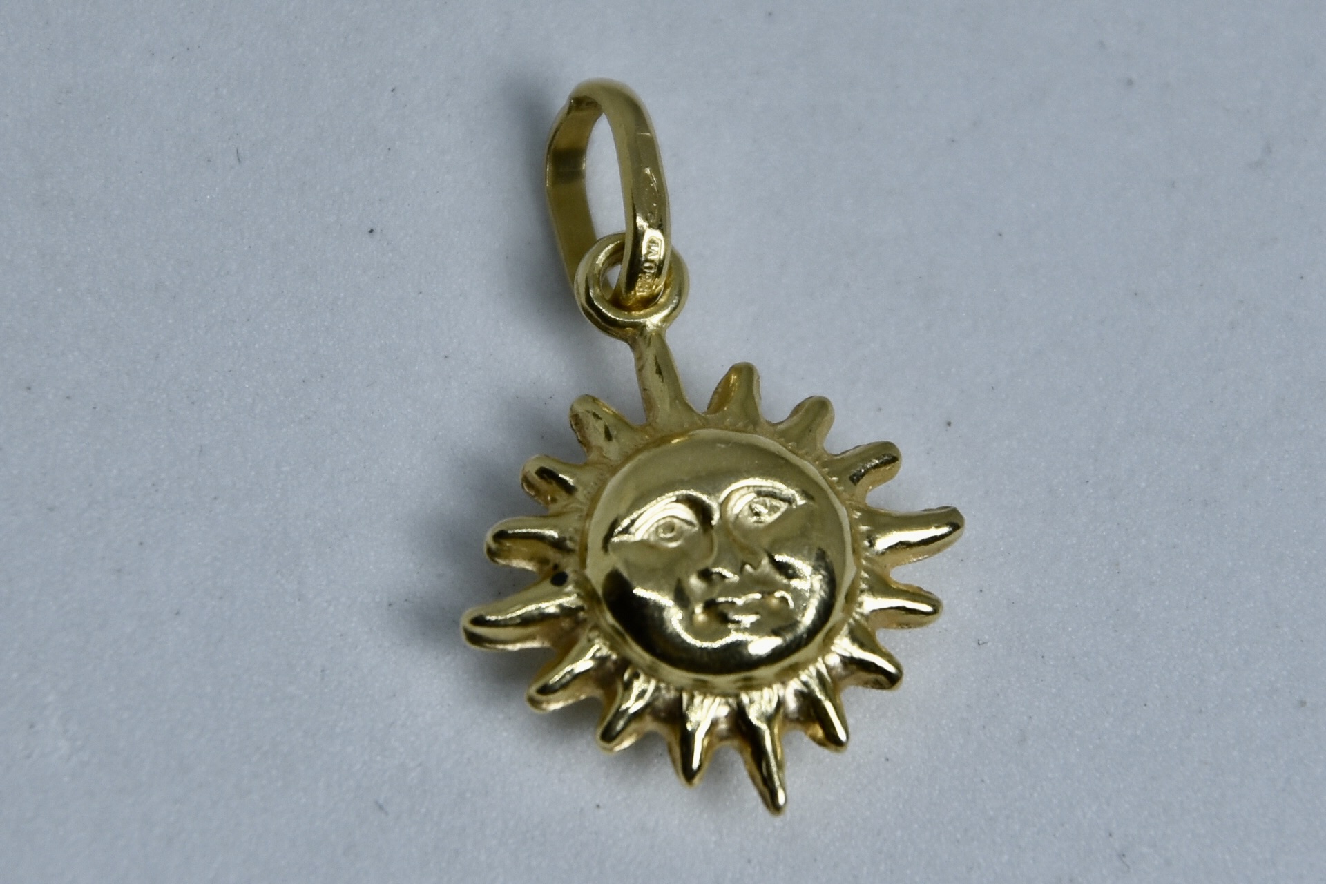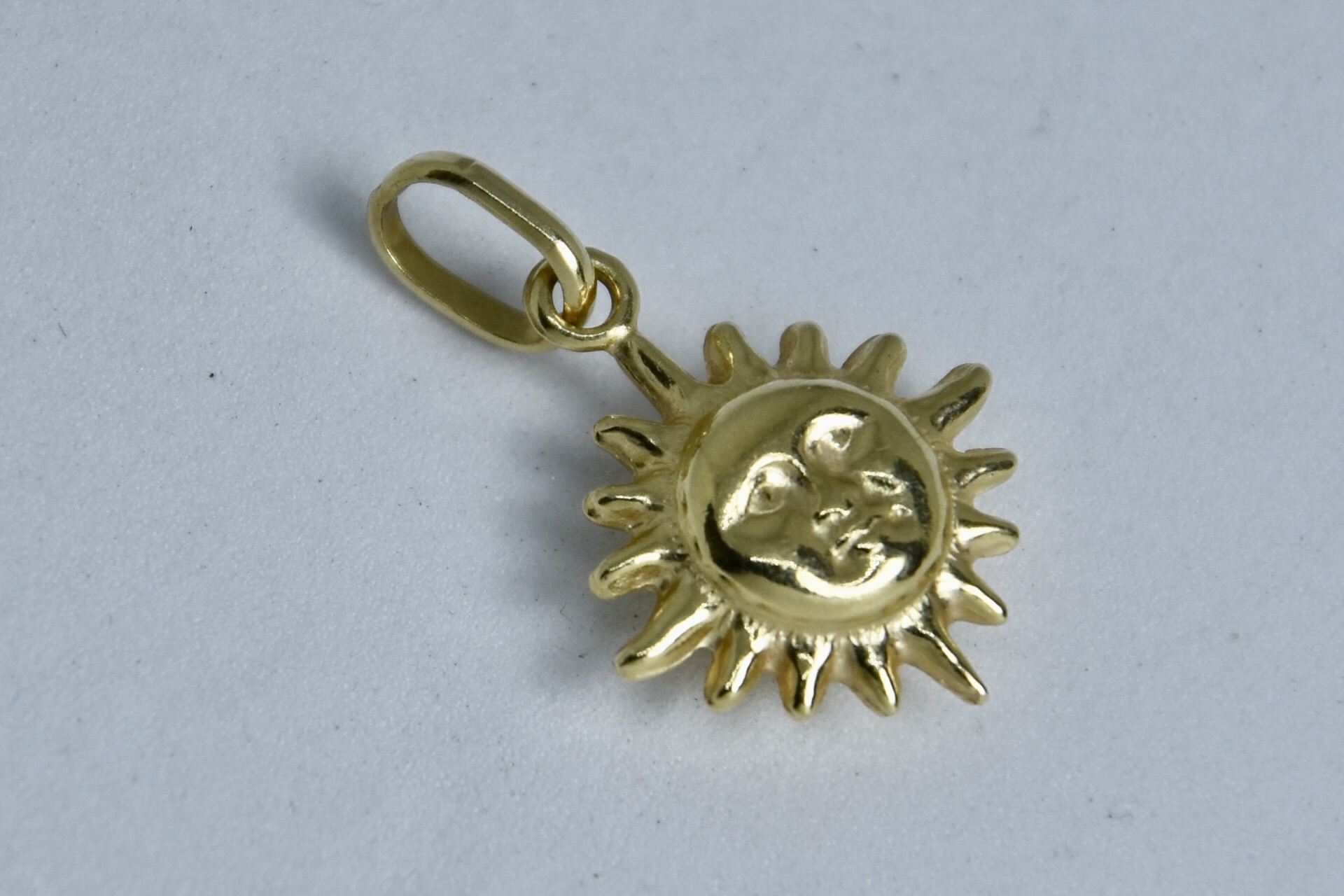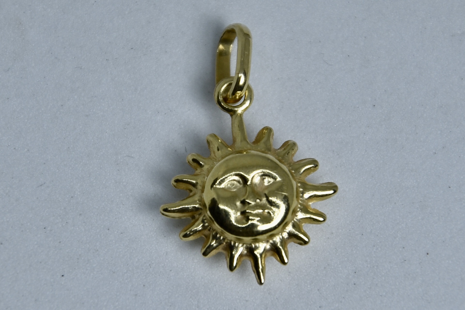 Ciondolo sole in oro giallo 750/00. Dimensione 1,50cm (escluso anellino). Peso 1,40g.
