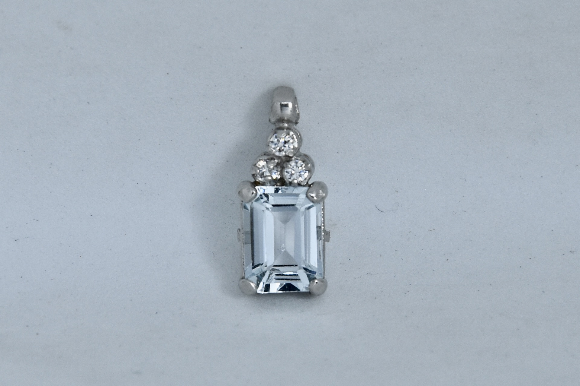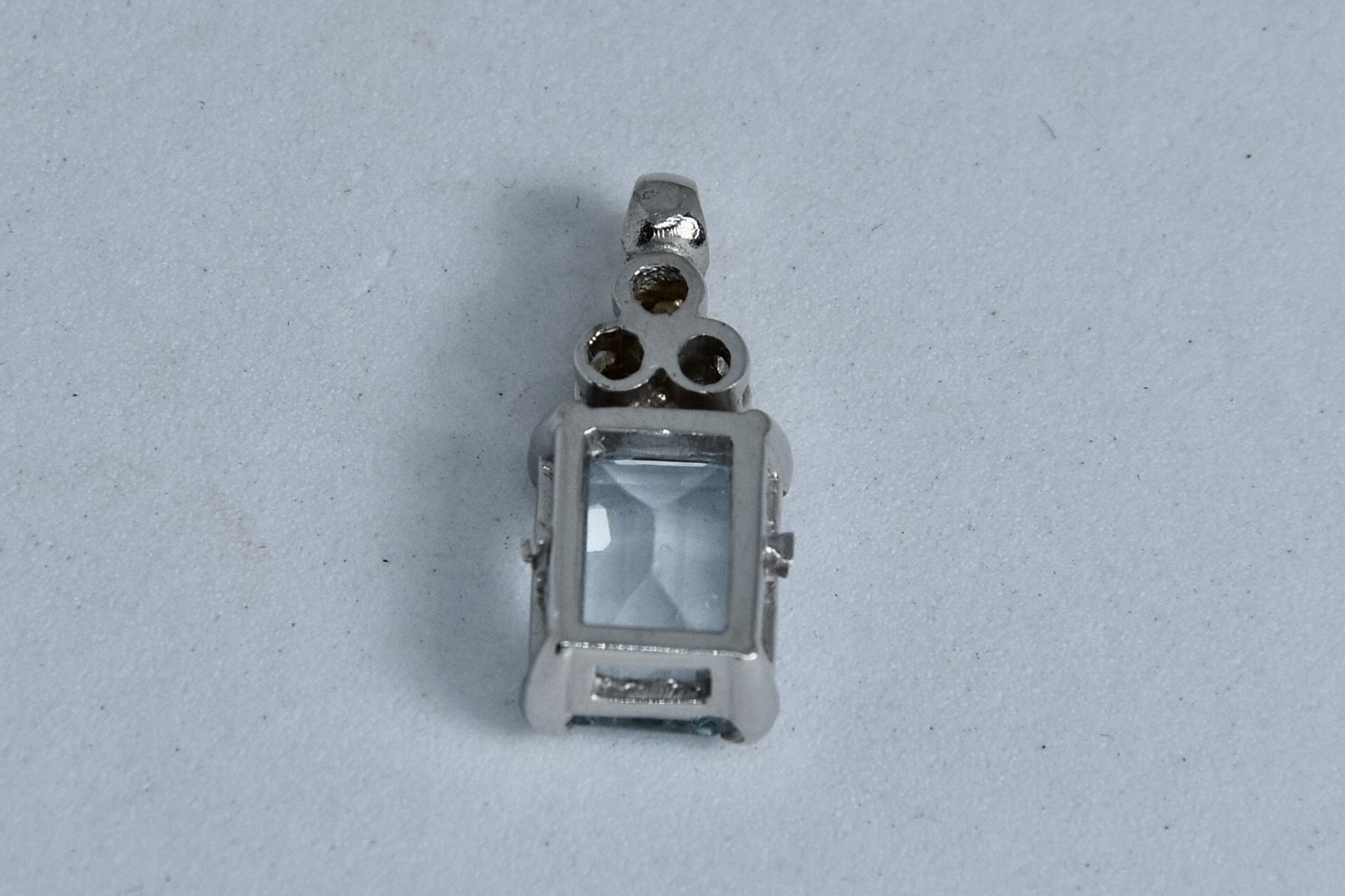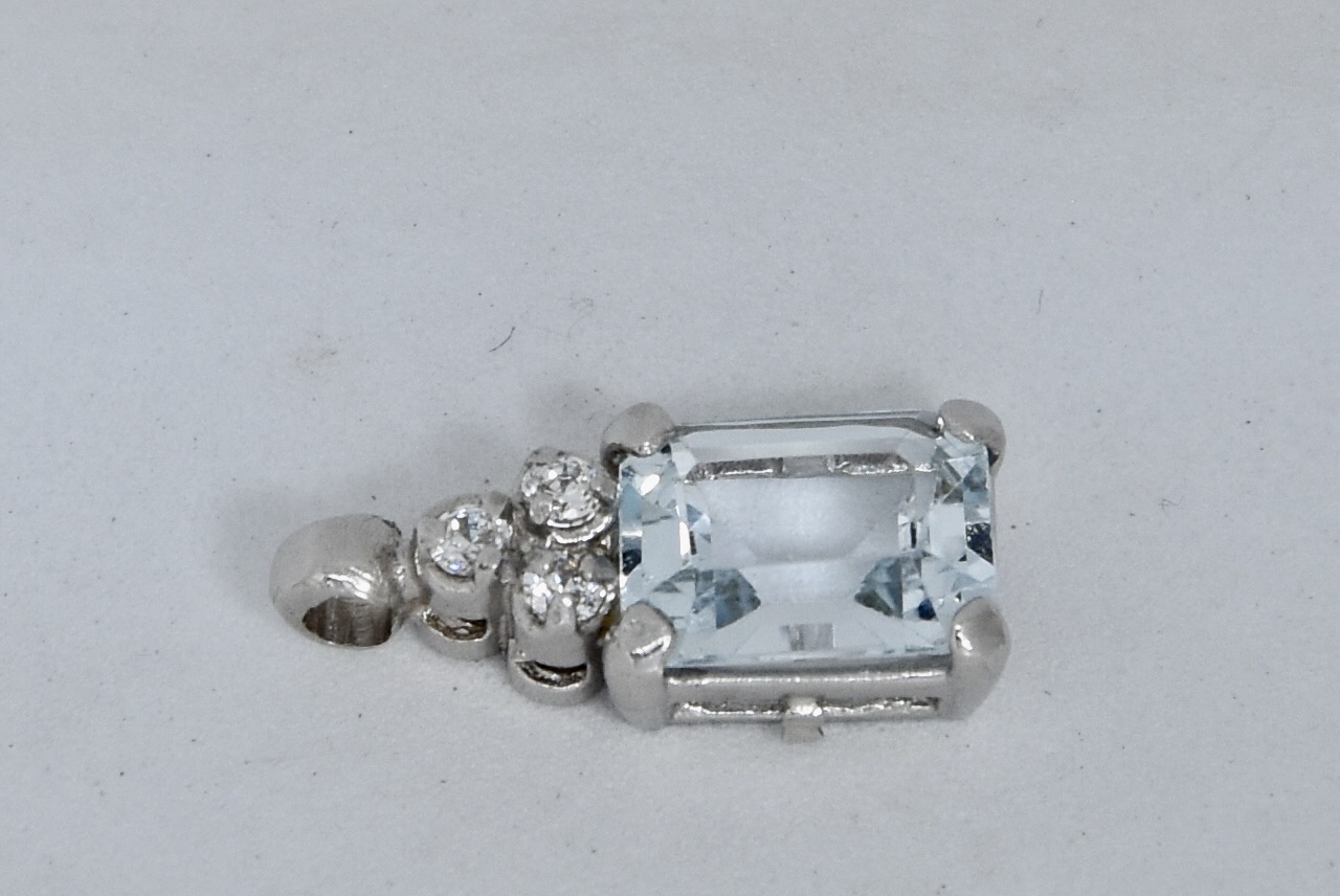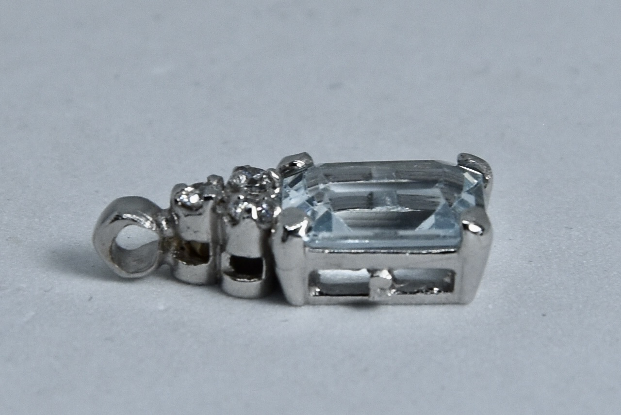 Ciondolo in oro bianco 750/00 con topazio azzurro taglio smeraldo e tre zirconi. Dimensione ciondolo 1,60x0,60cm. Peso 1,60g.