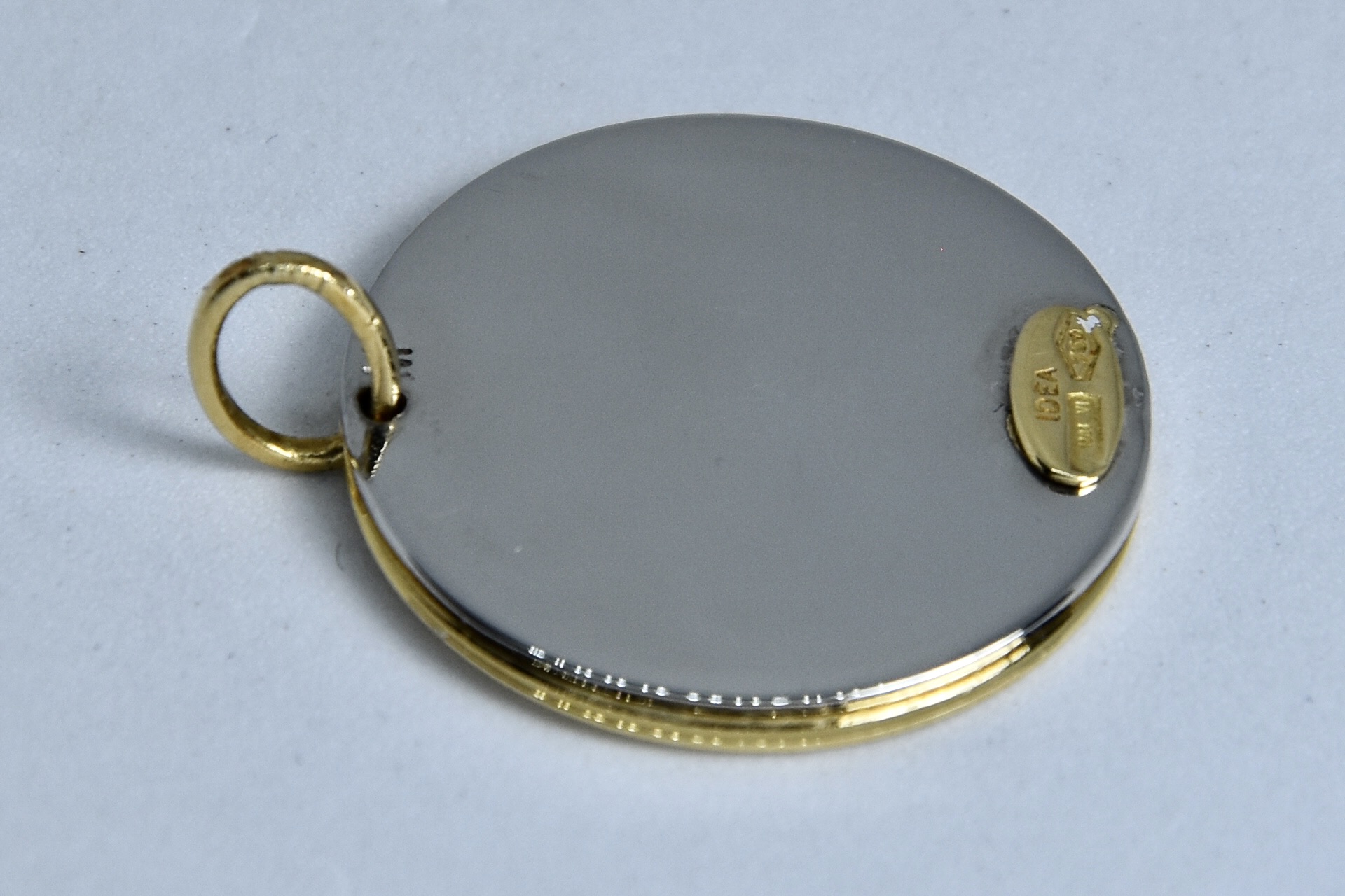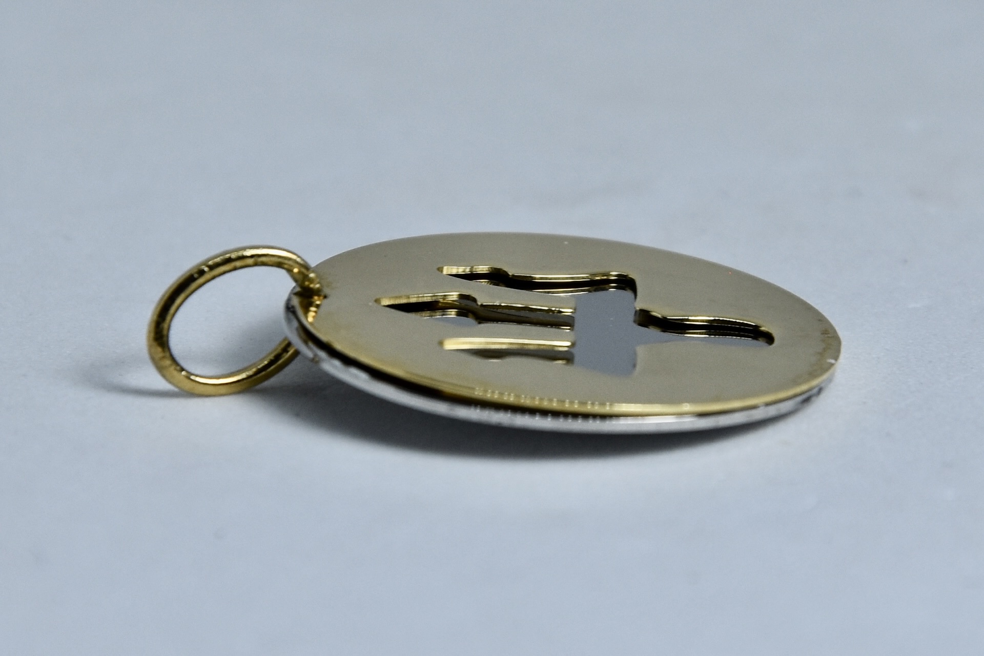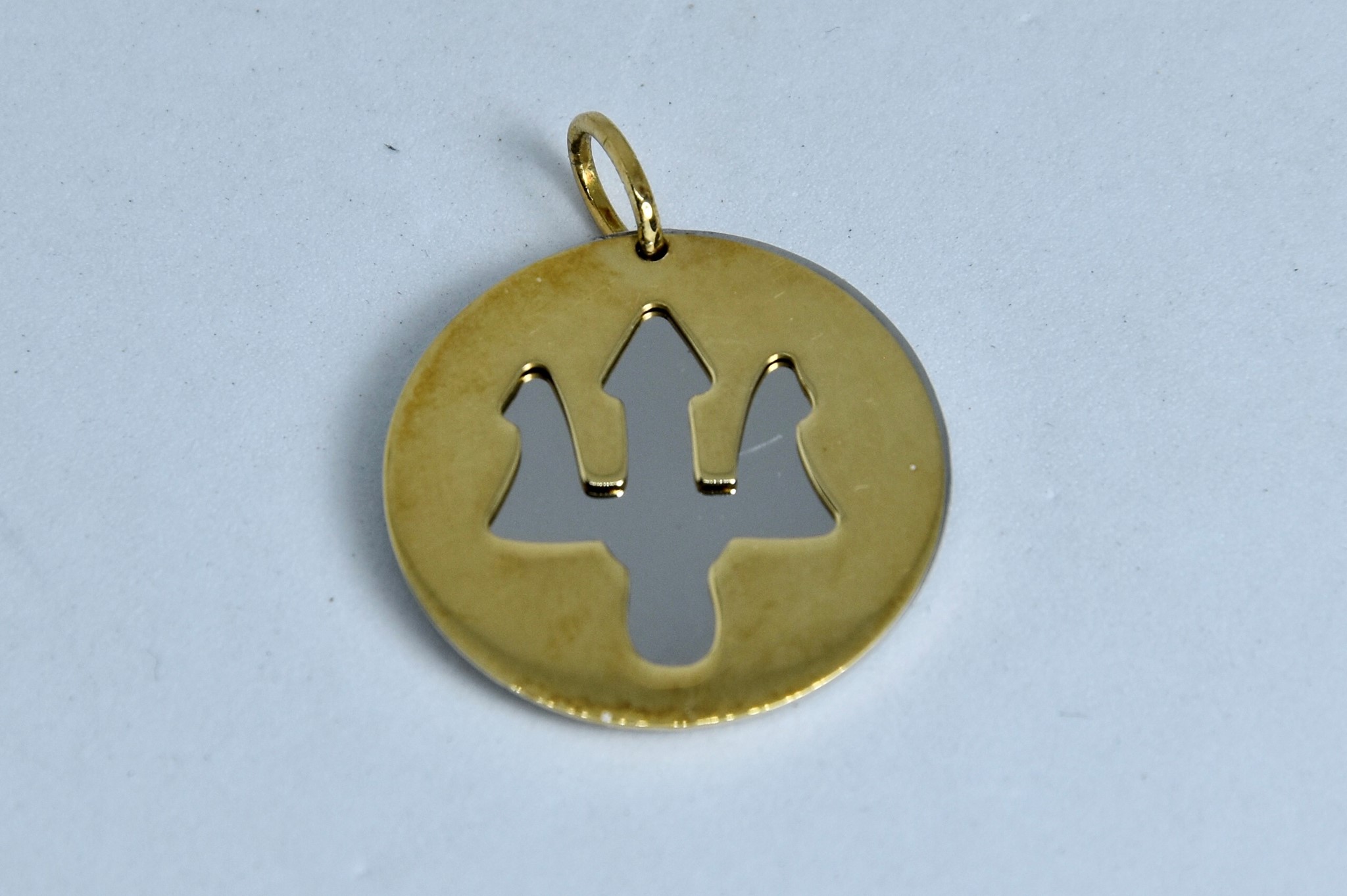 Ciondolo tridente in oro giallo e bianco 750/00. Sono due piastrine unite dall'anellino. Diametro 2,00cm. Peso 3,50g.
