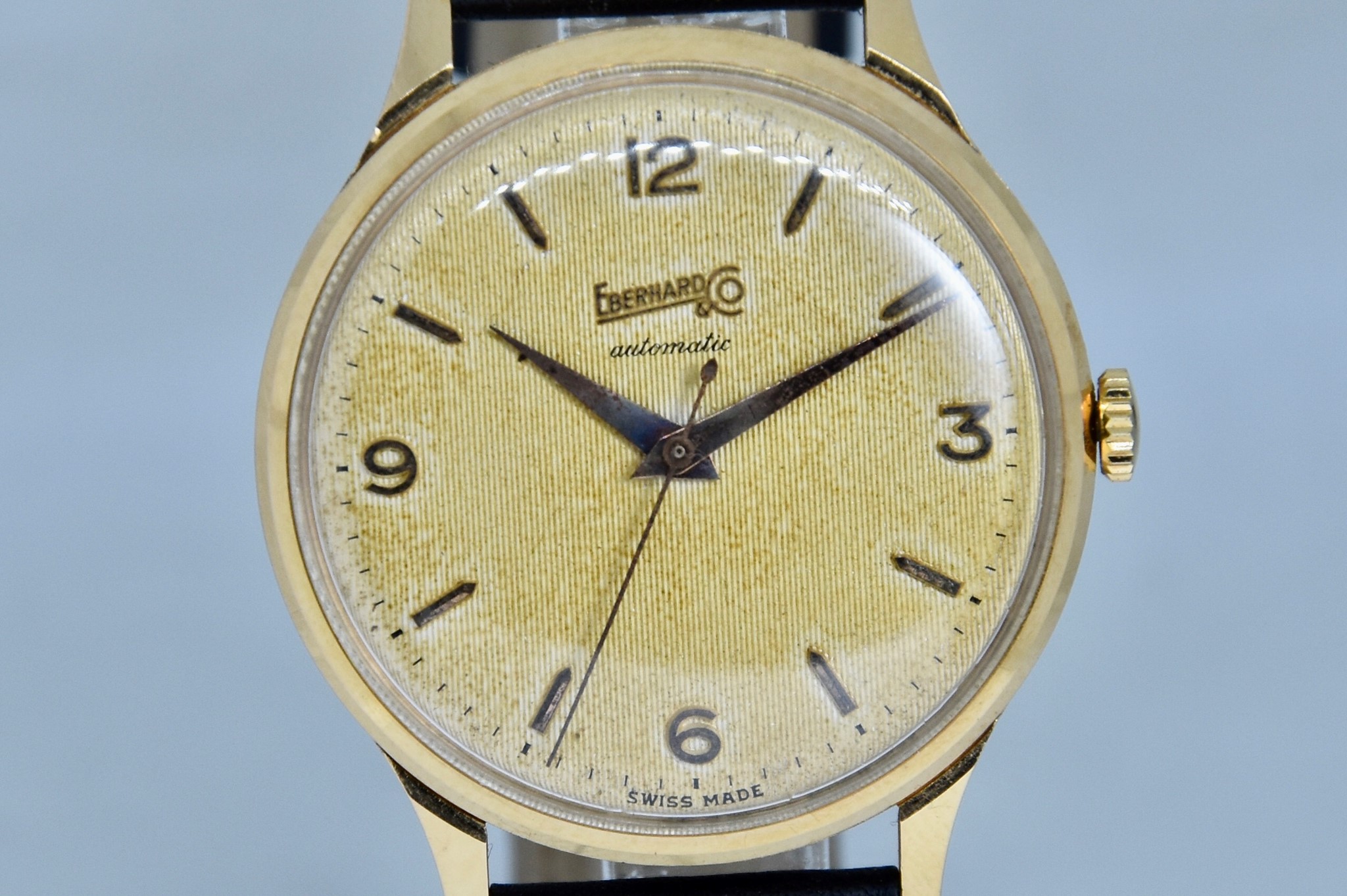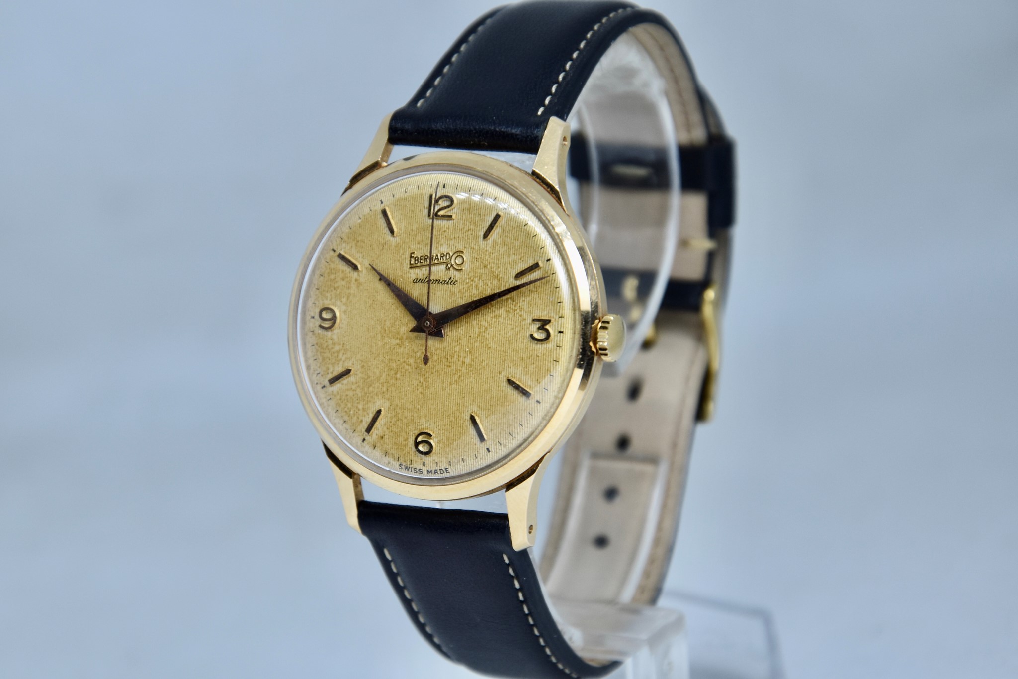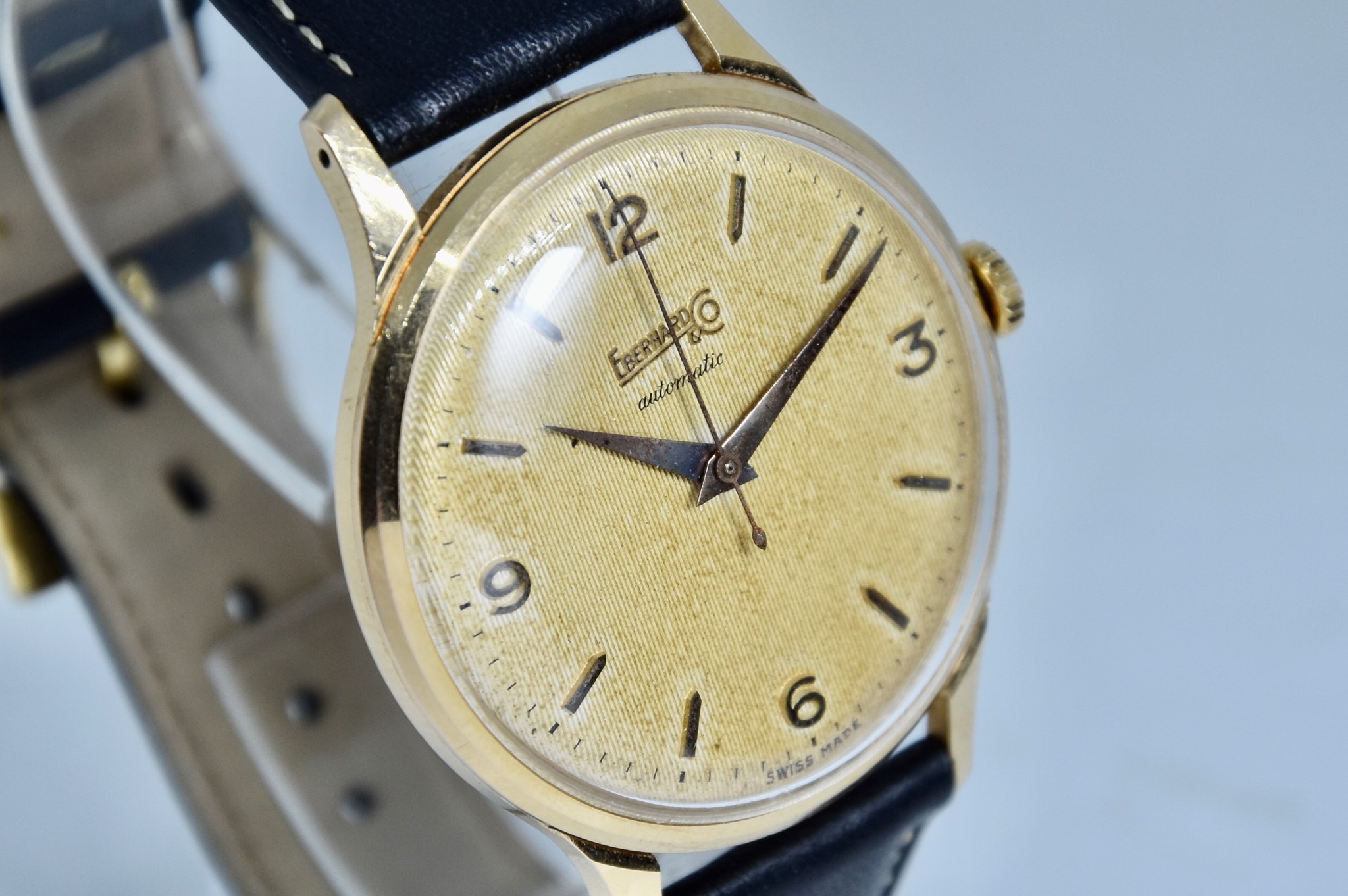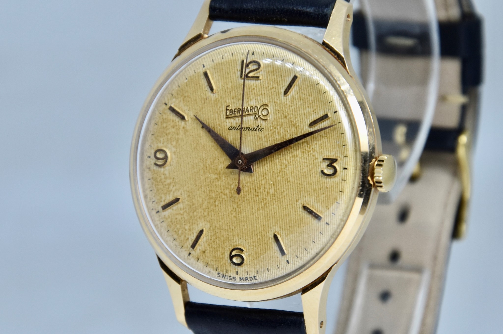 Eberhard & Co. Automatic in oro giallo 750/00 anni 60'. Orologio in buone condizioni. Movimento a carica automatica cal. 11500. Quadrante color oro a nido d'ape con stupenda patina. Diametro cassa 36mm. Vetro Plexiglass. Cassa italiana da circa 15 grammi. Corona non originale. Con nostra scatola.