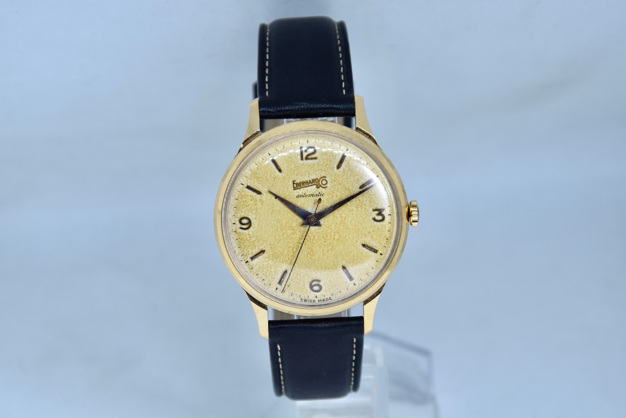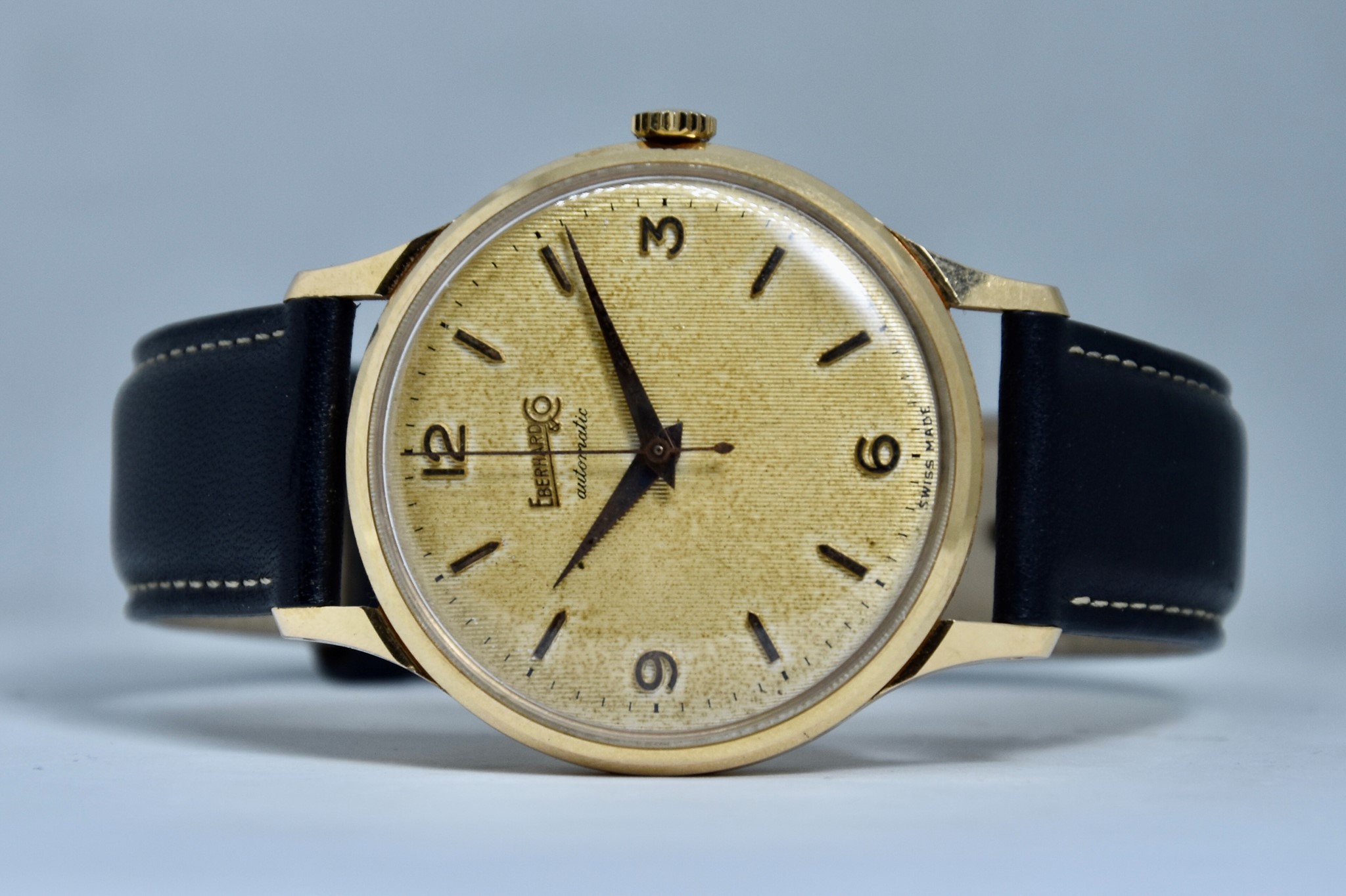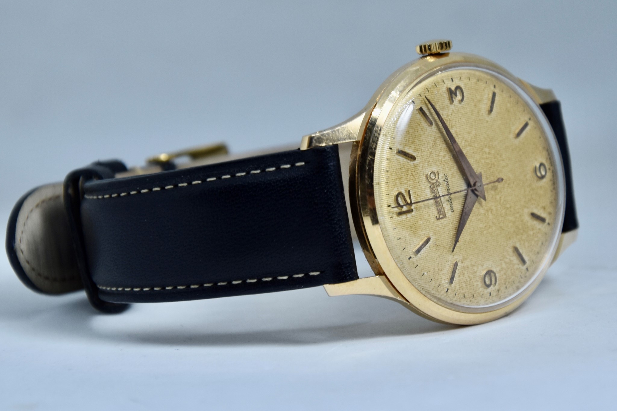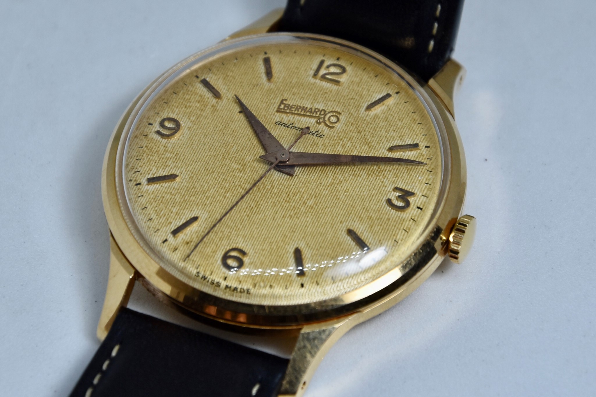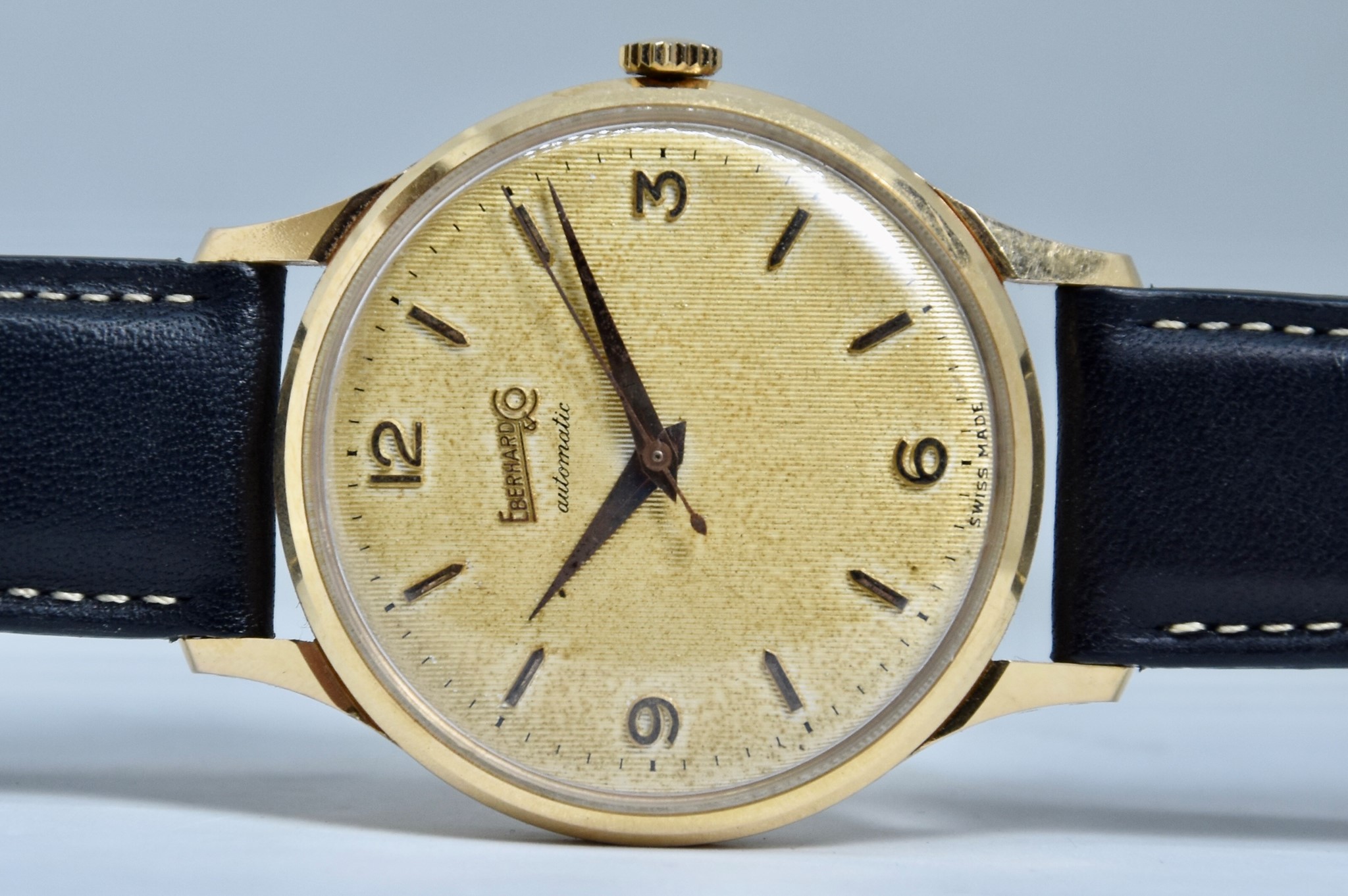 Eberhard & Co. Automatic in oro giallo 750/00 anni 60'. Orologio in buone condizioni. Movimento a carica automatica cal. 11500. Quadrante color oro a nido d'ape con stupenda patina. Diametro cassa 36mm. Vetro Plexiglass. Cassa italiana da circa 15 grammi. Corona non originale. Con nostra scatola.
