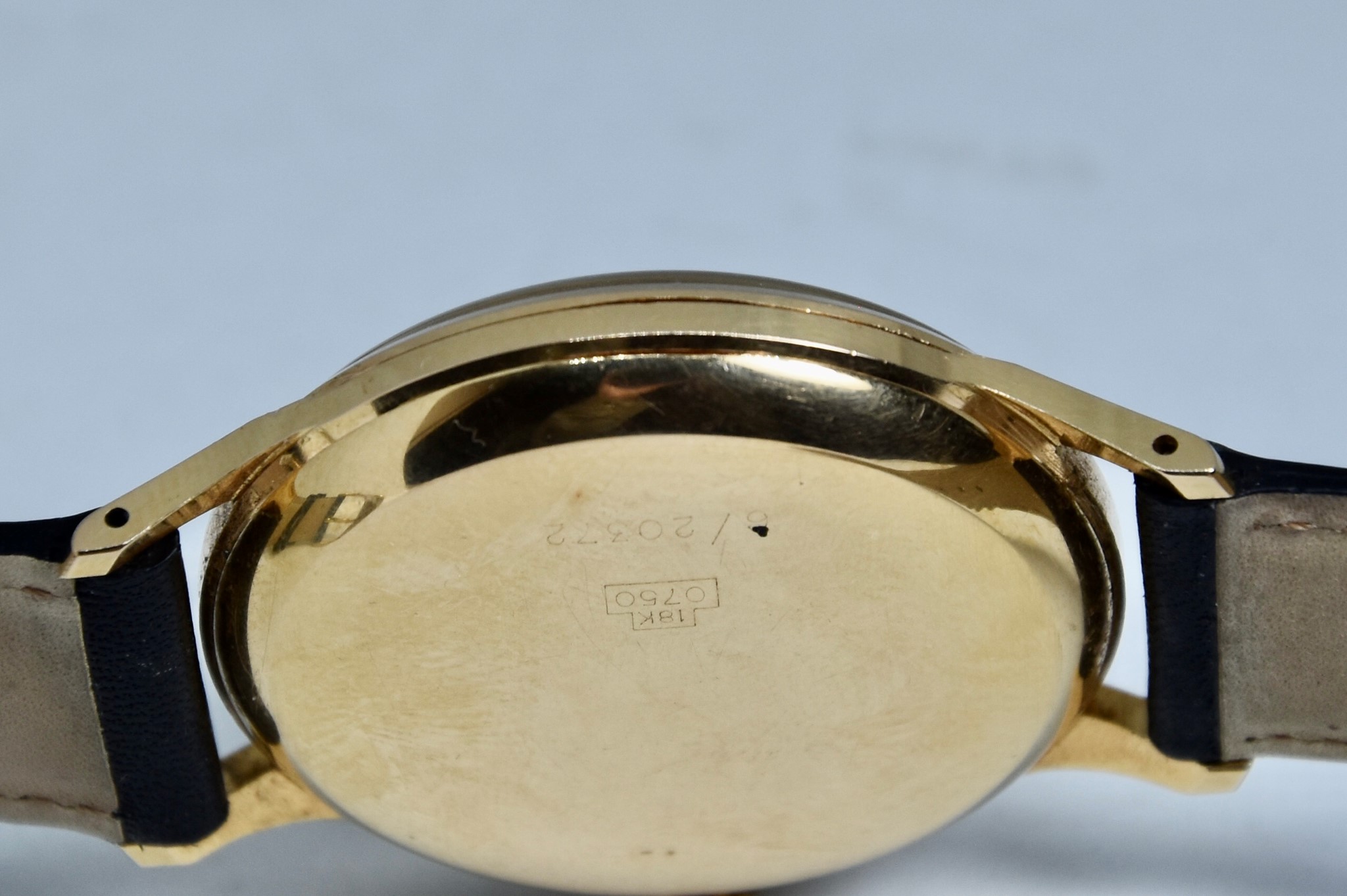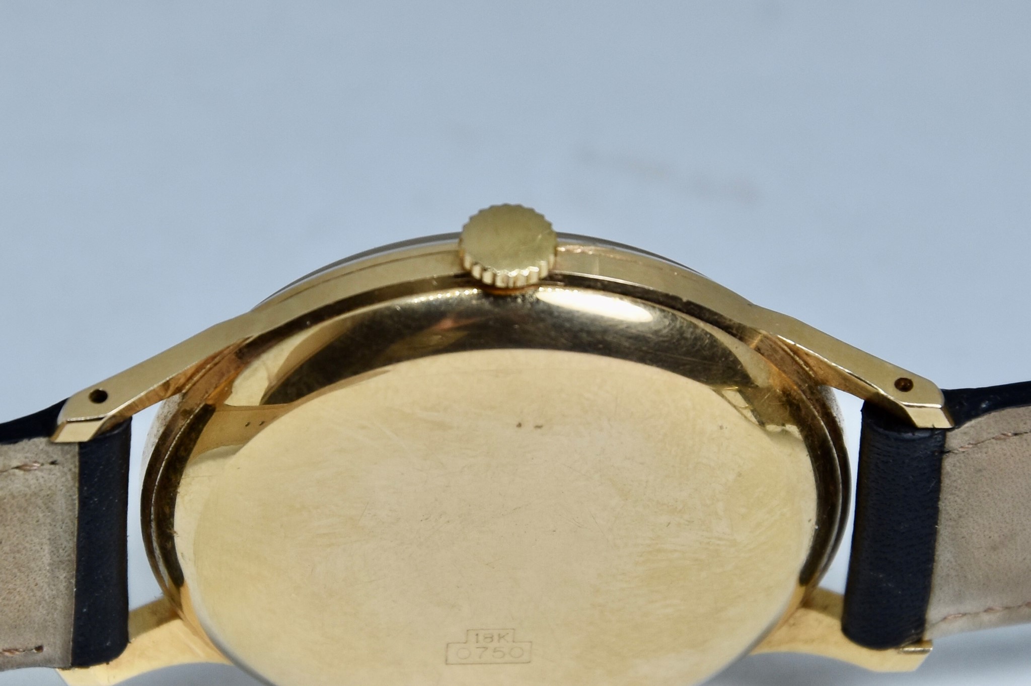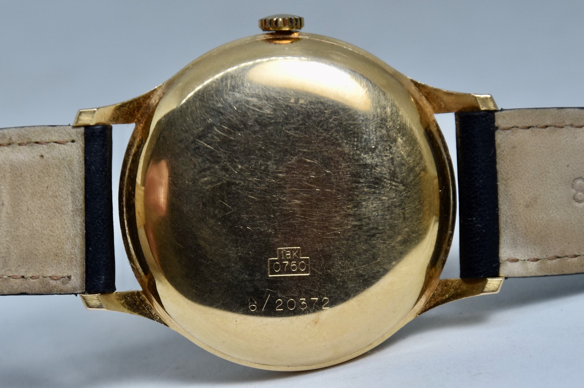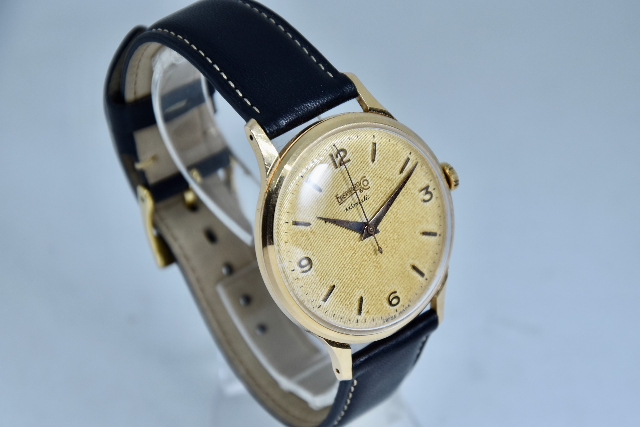 Eberhard & Co. Automatic in oro giallo 750/00 anni 60'. Orologio in buone condizioni. Movimento a carica automatica cal. 11500. Quadrante color oro a nido d'ape con stupenda patina. Diametro cassa 36mm. Vetro Plexiglass. Cassa italiana da circa 15 grammi. Corona non originale. Con nostra scatola.