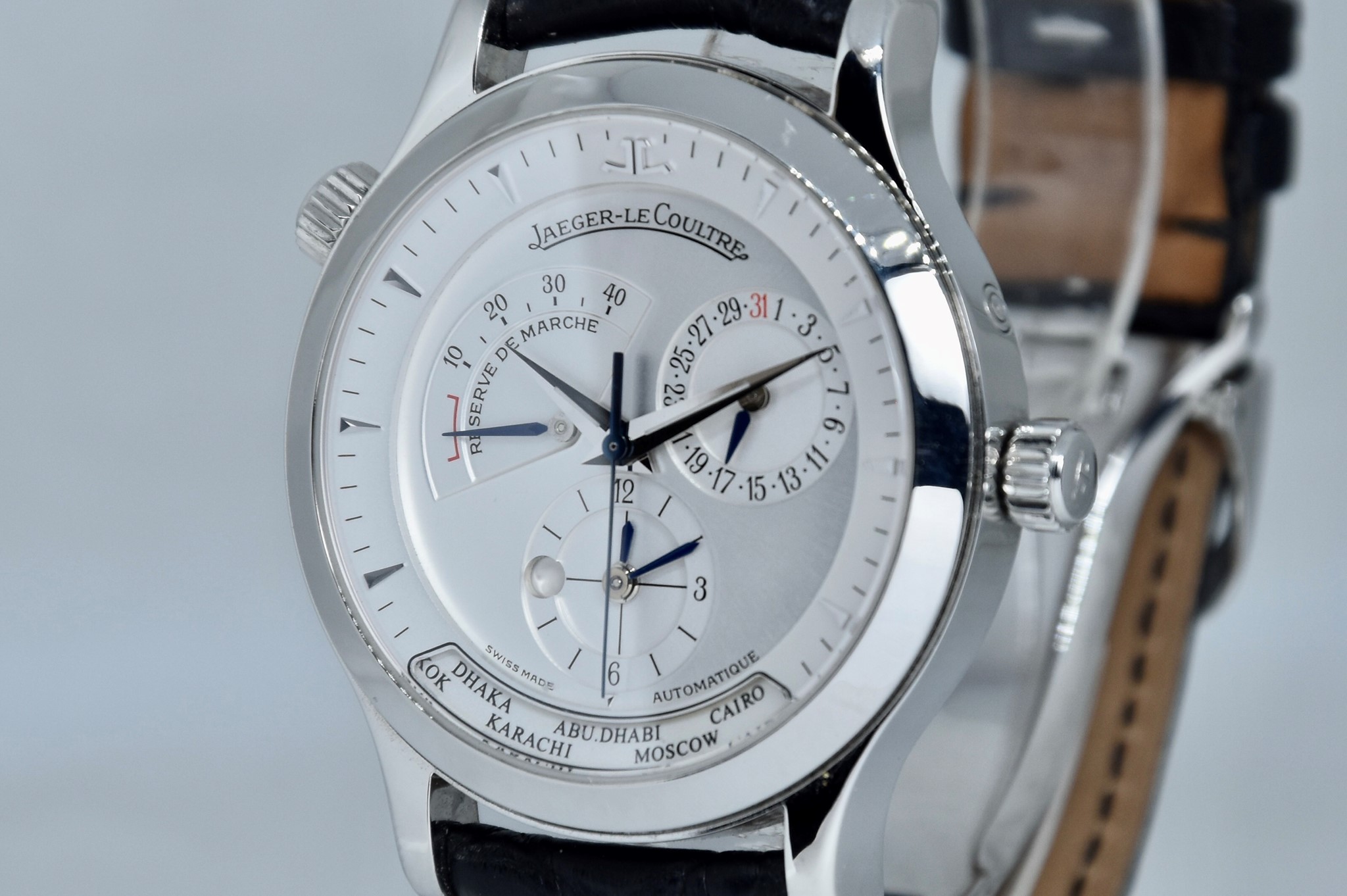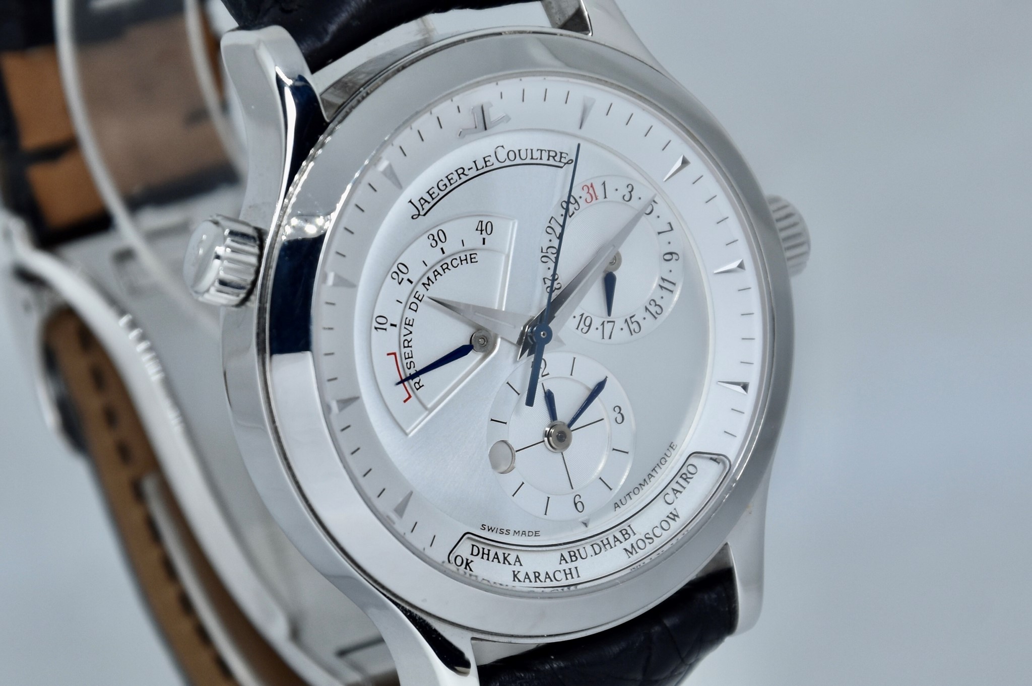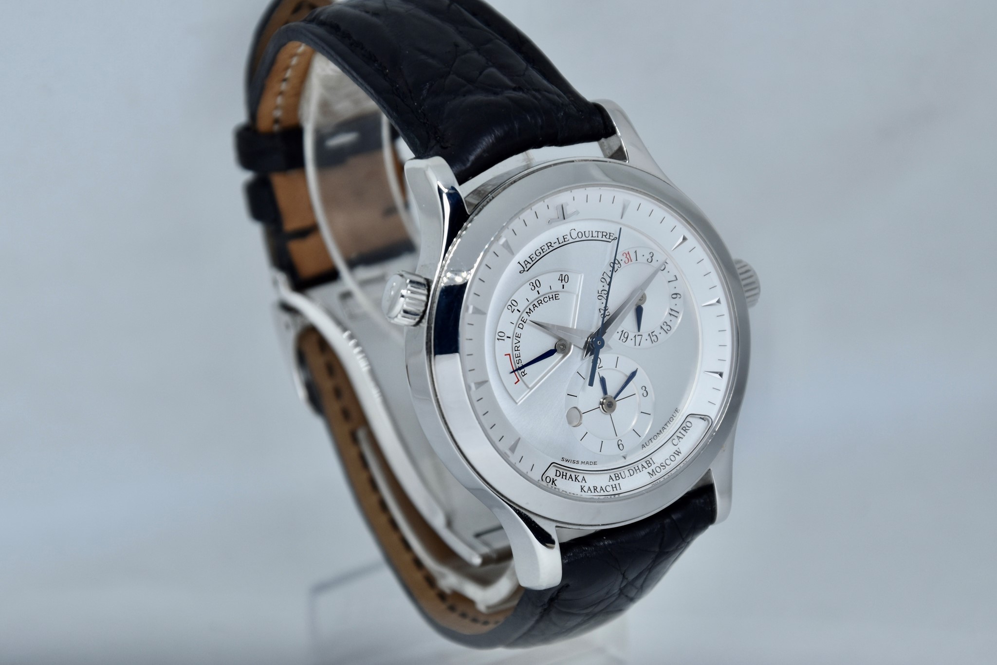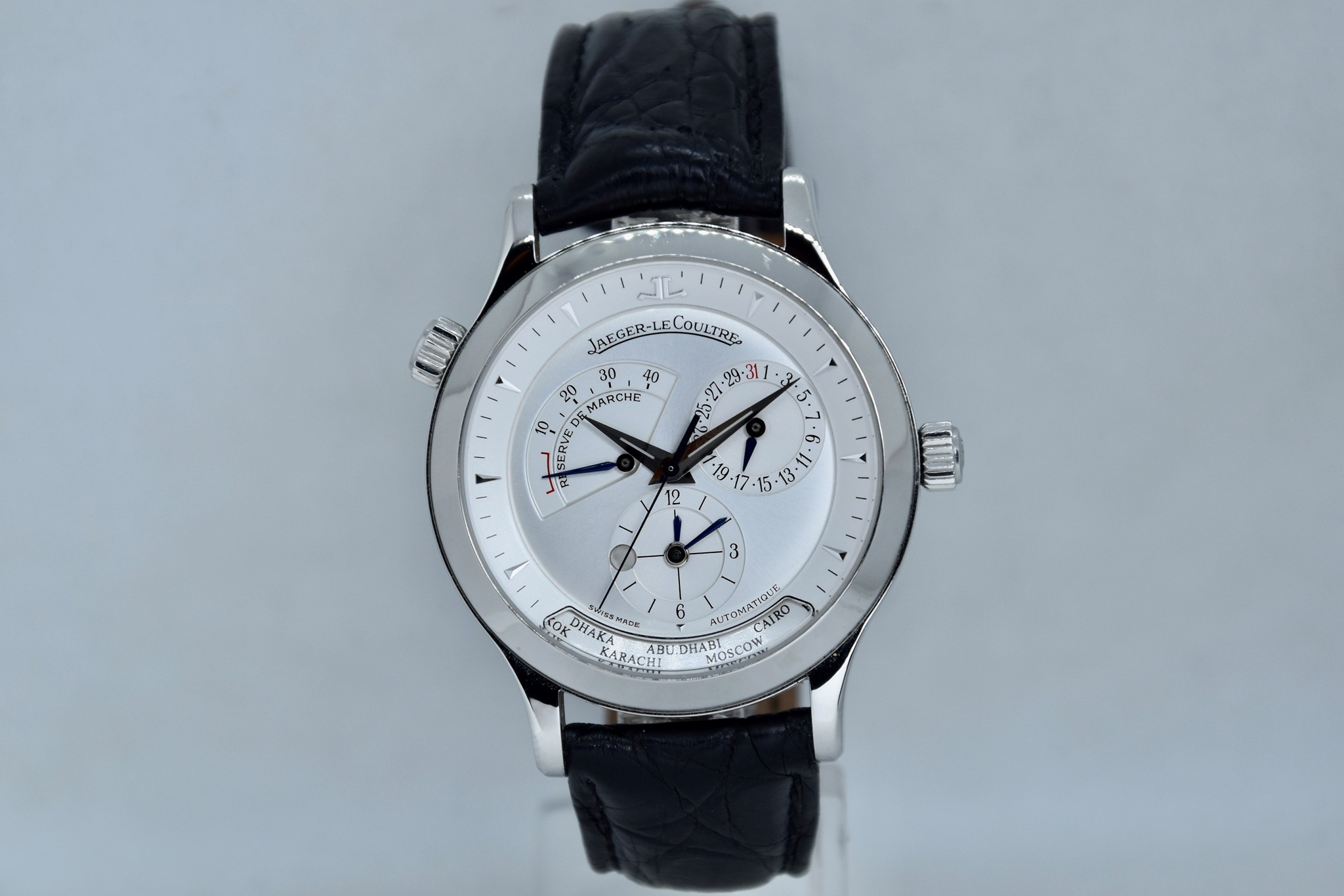 Jaeger-LeCoultre Master Geographic ref. 142.8.29 del 2006. Orologio in acciaio in ottime condizioni. Quadrante Argento. Indicatore della data. Cassa di 38mm. Lunetta in acciaio liscio. Movimento a carica automatica 939. Funzione GMT e riserva di carica. Vetro zaffiro. Deployante originale in acciaio. Completo di scatola e garanzia originale.