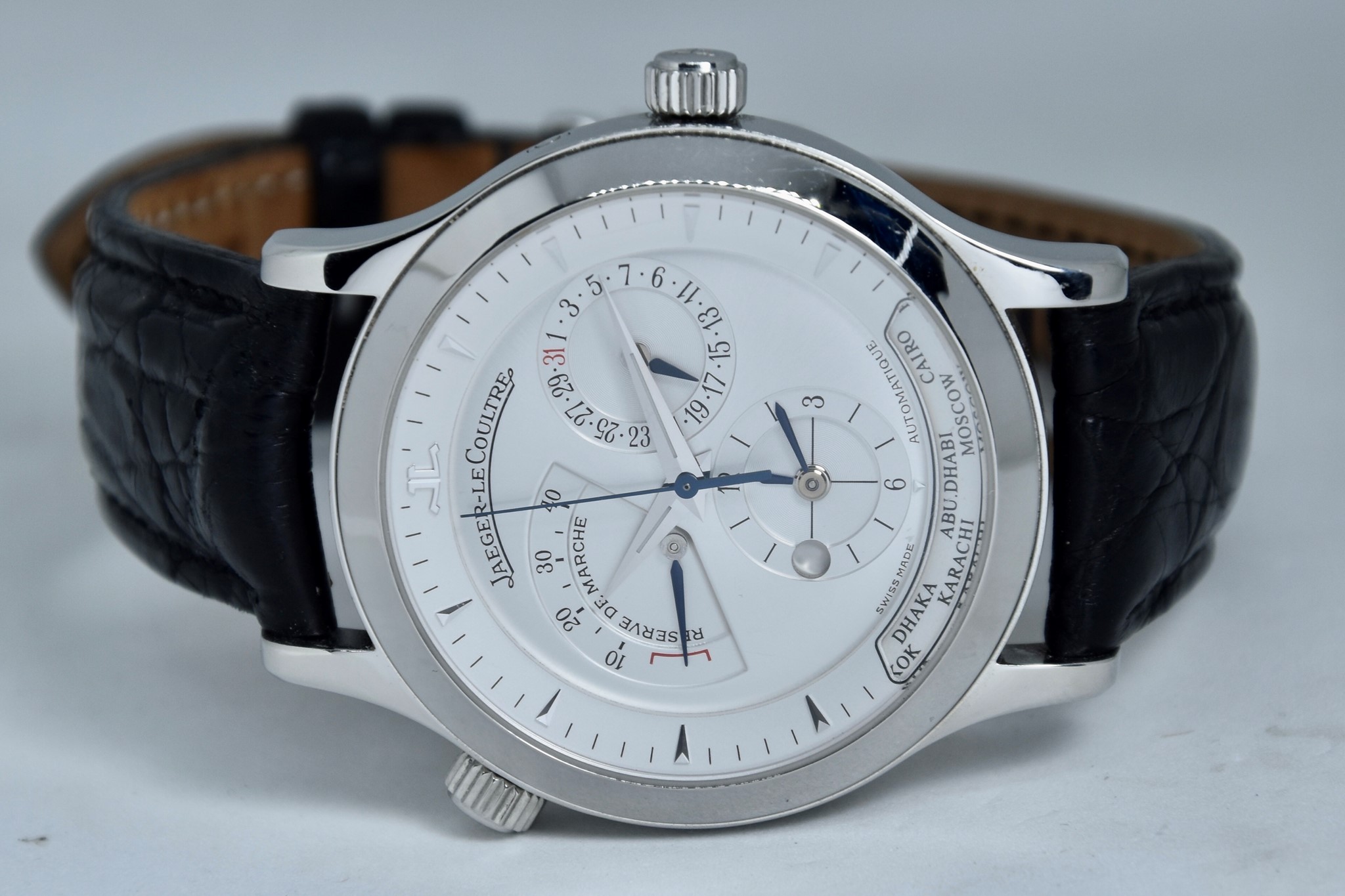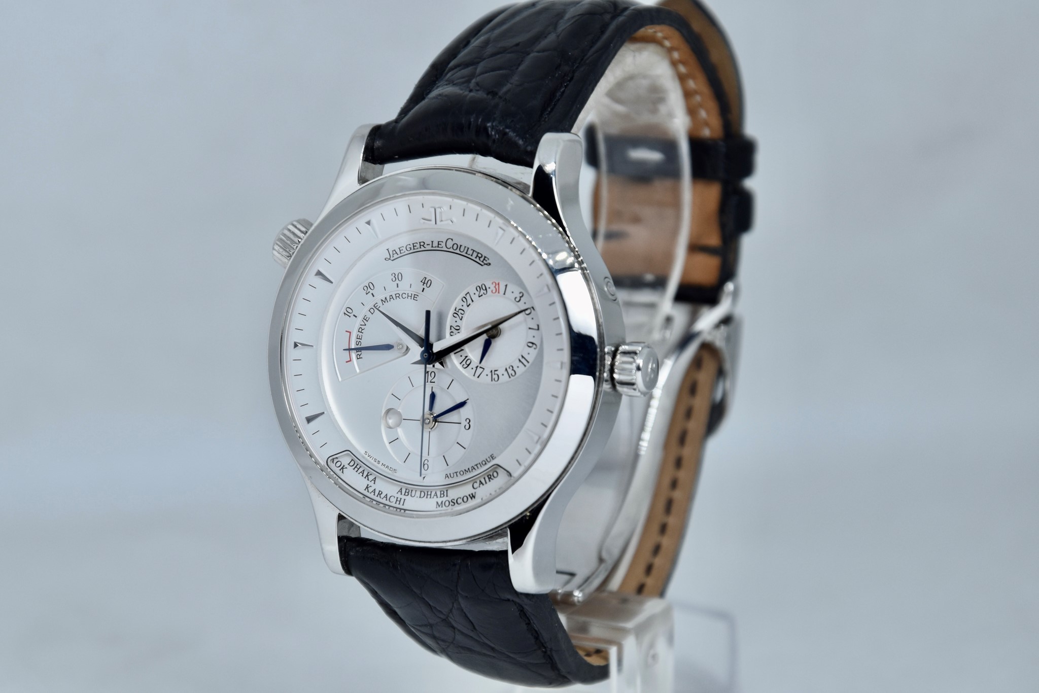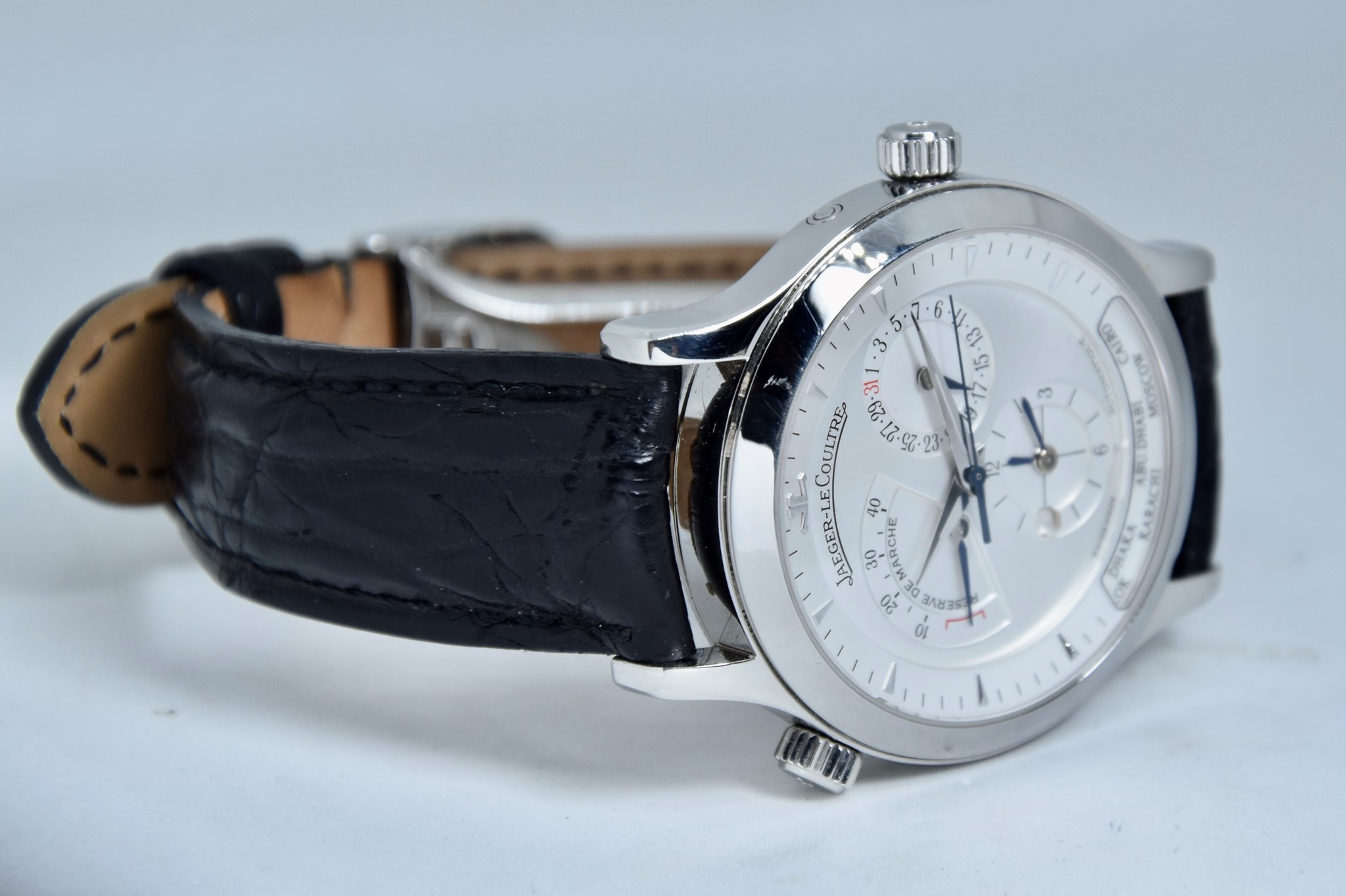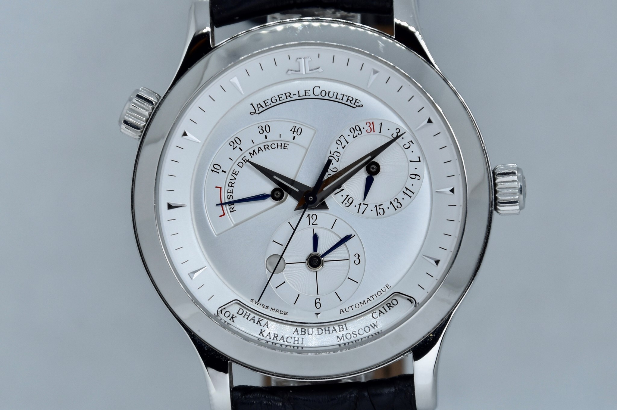 Jaeger-LeCoultre Master Geographic ref. 142.8.29 del 2006. Orologio in acciaio in ottime condizioni. Quadrante Argento. Indicatore della data. Cassa di 38mm. Lunetta in acciaio liscio. Movimento a carica automatica 939. Funzione GMT e riserva di carica. Vetro zaffiro. Deployante originale in acciaio. Completo di scatola e garanzia originale.