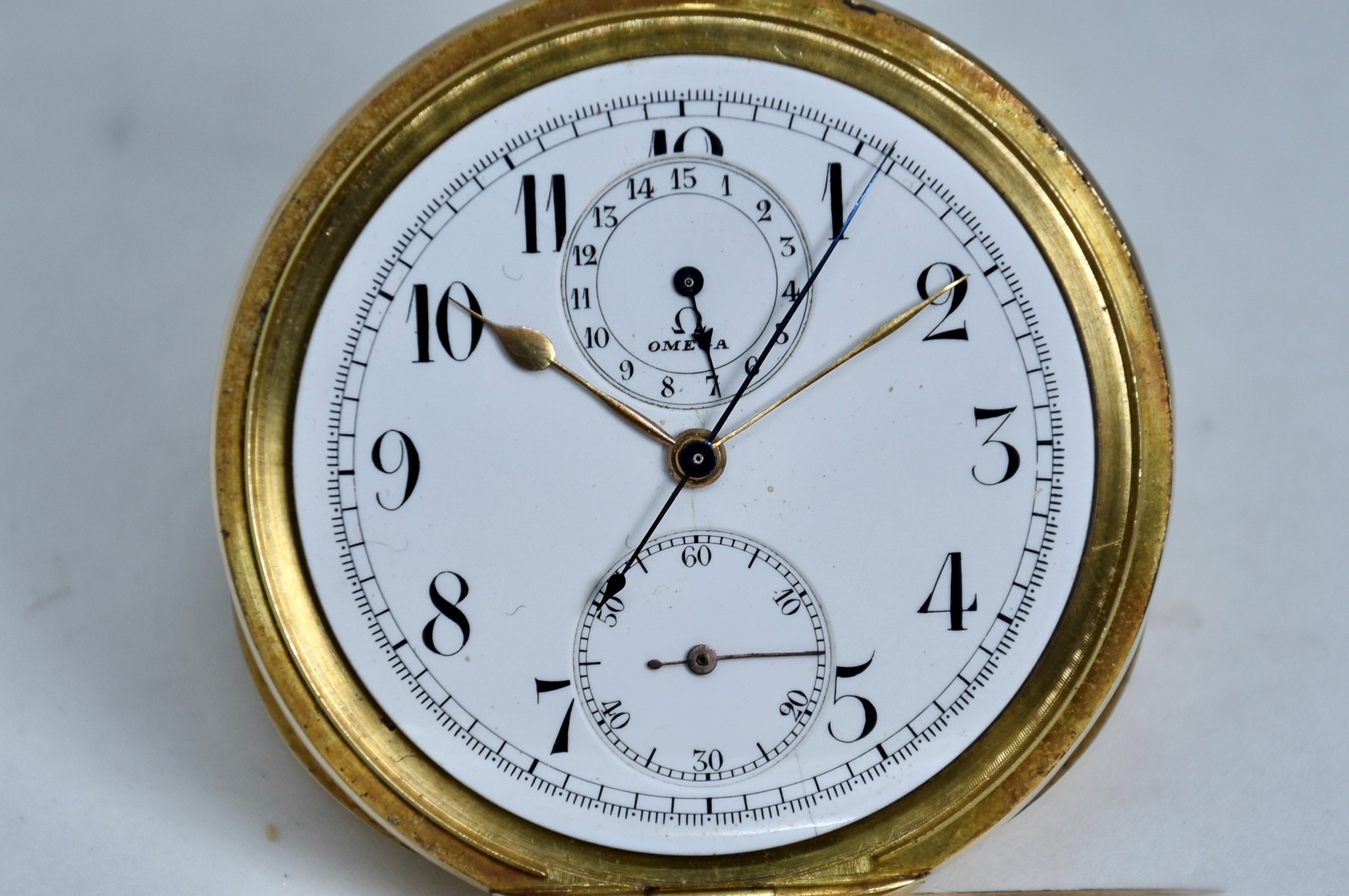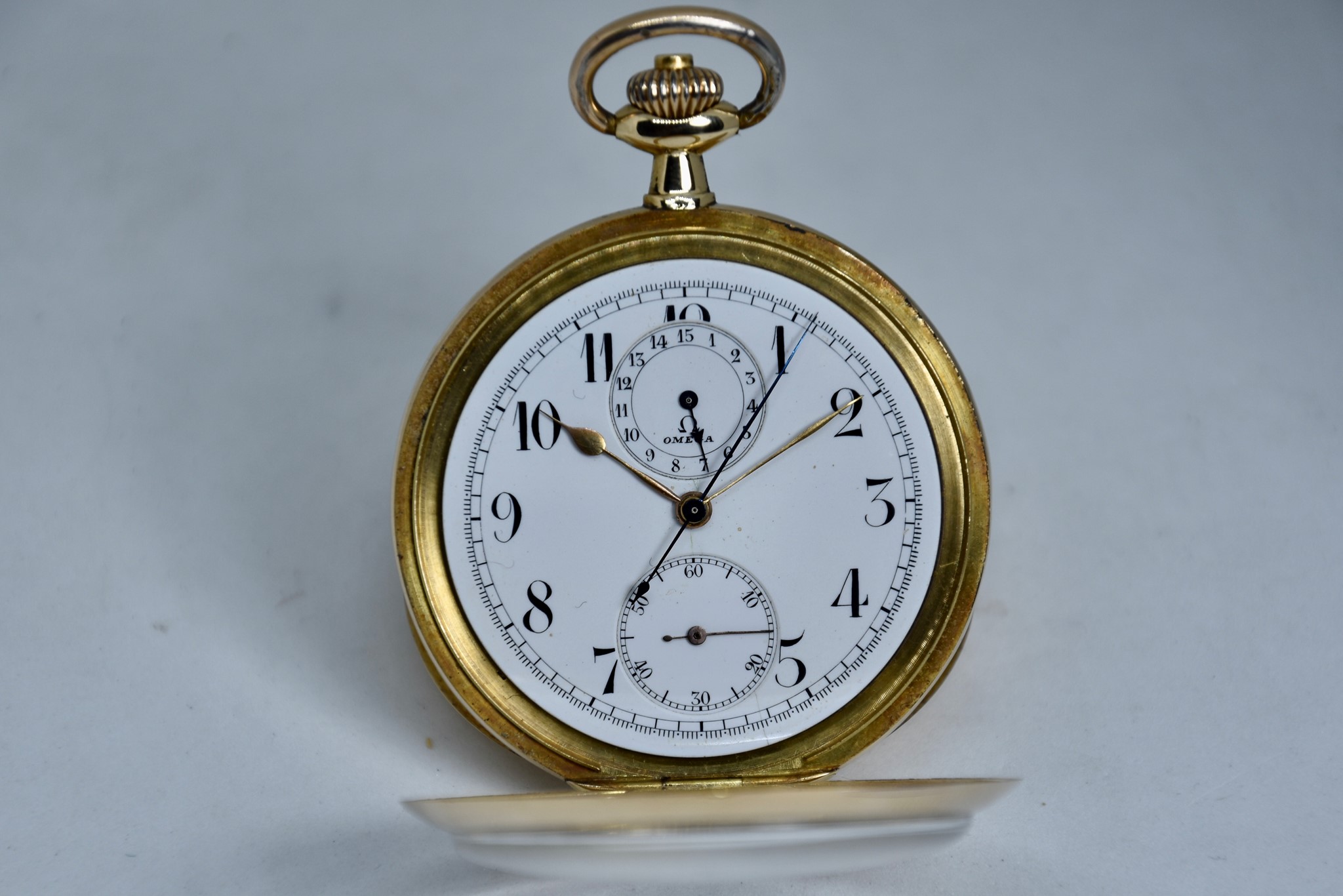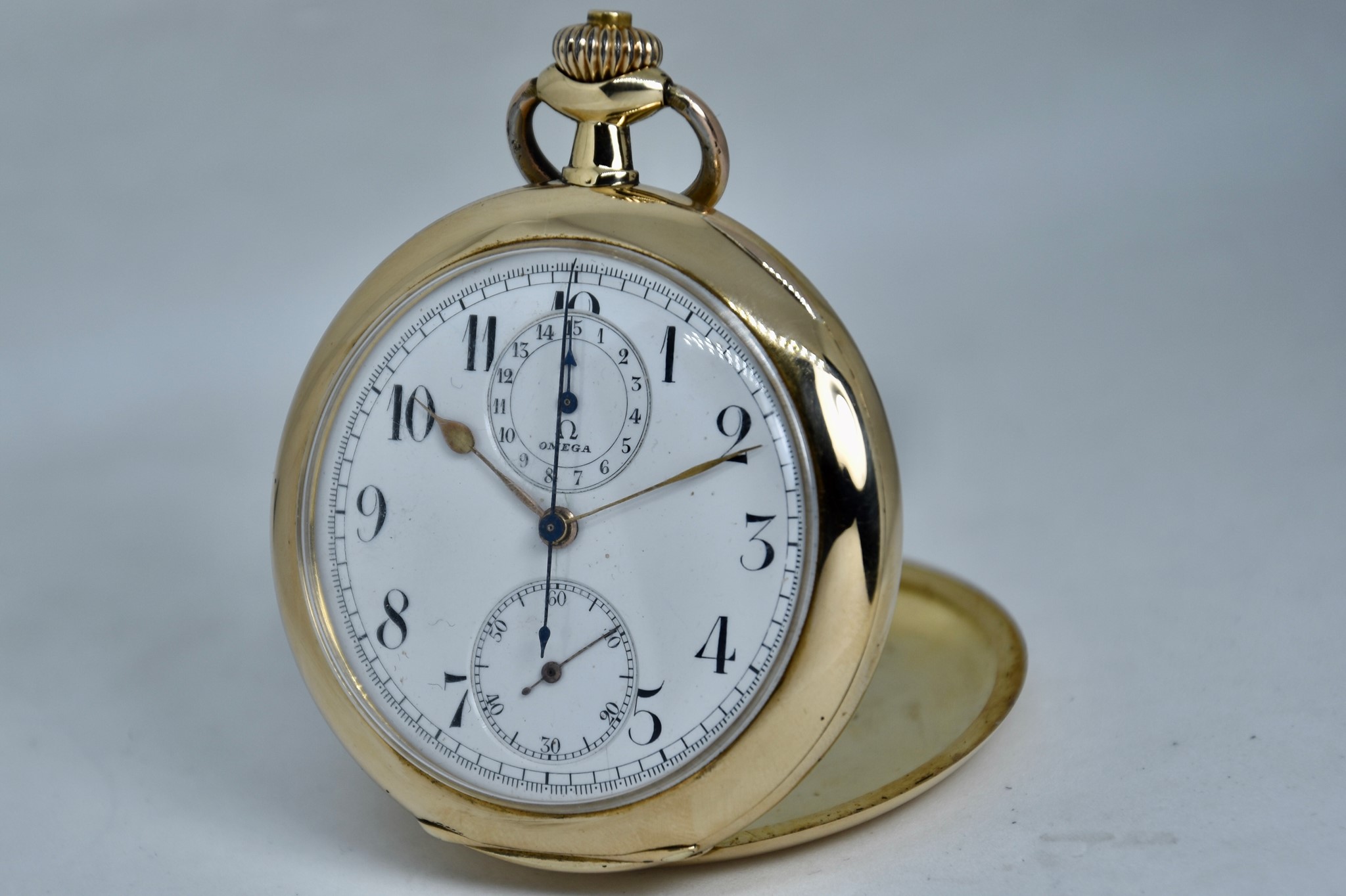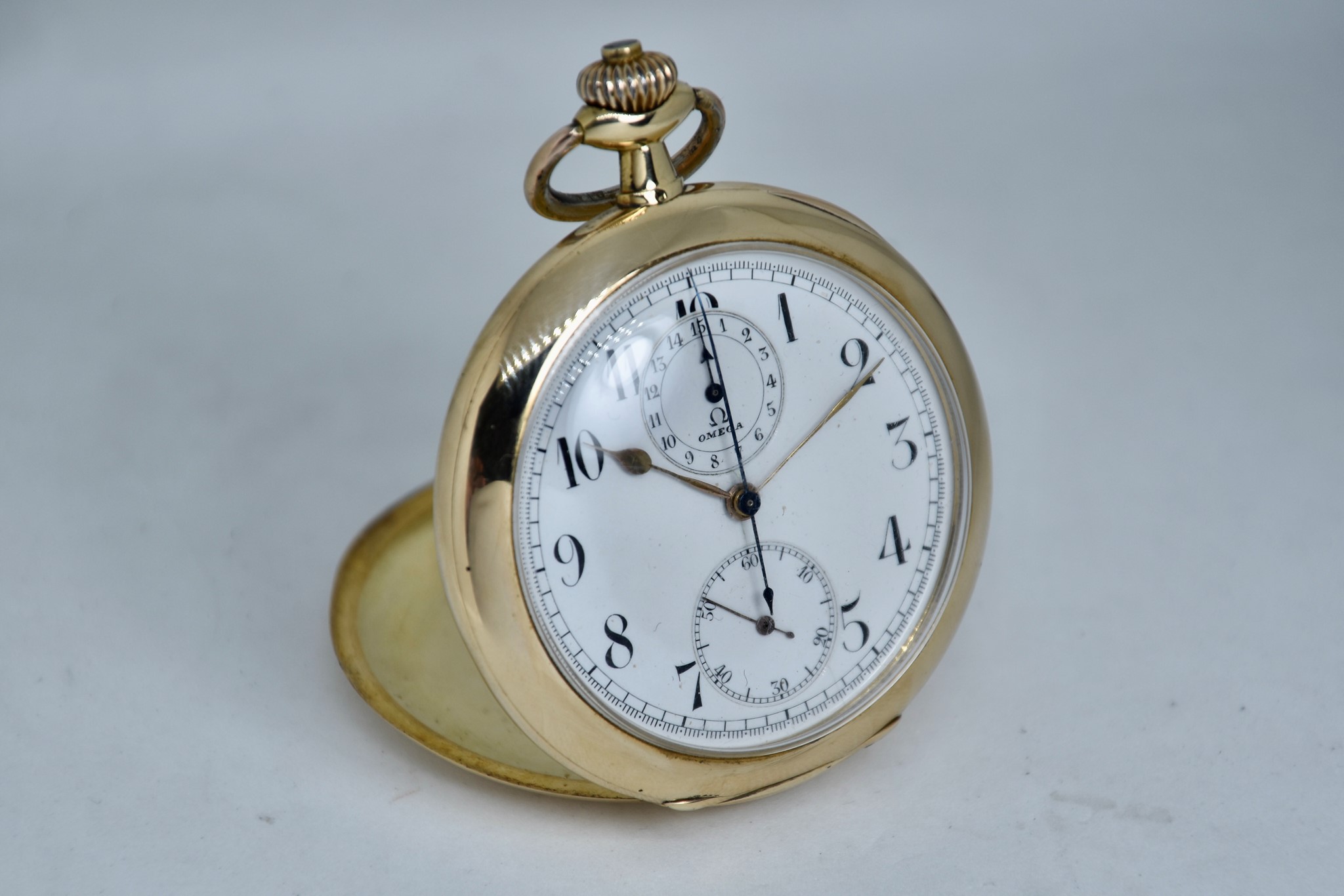 Omega Chronografo MonoPulsante del 1910 approssimativamente. Orologio da tasca in oro giallo 750/00 in buone condizioni. Quadrante bianco in smalto con numeri bianchi. Presenta dei segni internamente al vetro. Secondi piccoli a ore 6. Movimento a carica manuale di manifattura. Diametro cassa 52mm. Vetro plexiglas. Corona originale. Con nostra scatola.