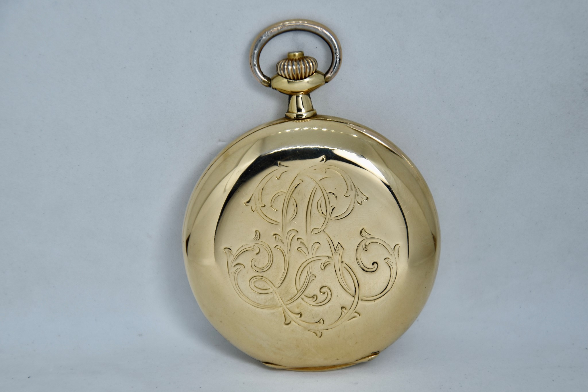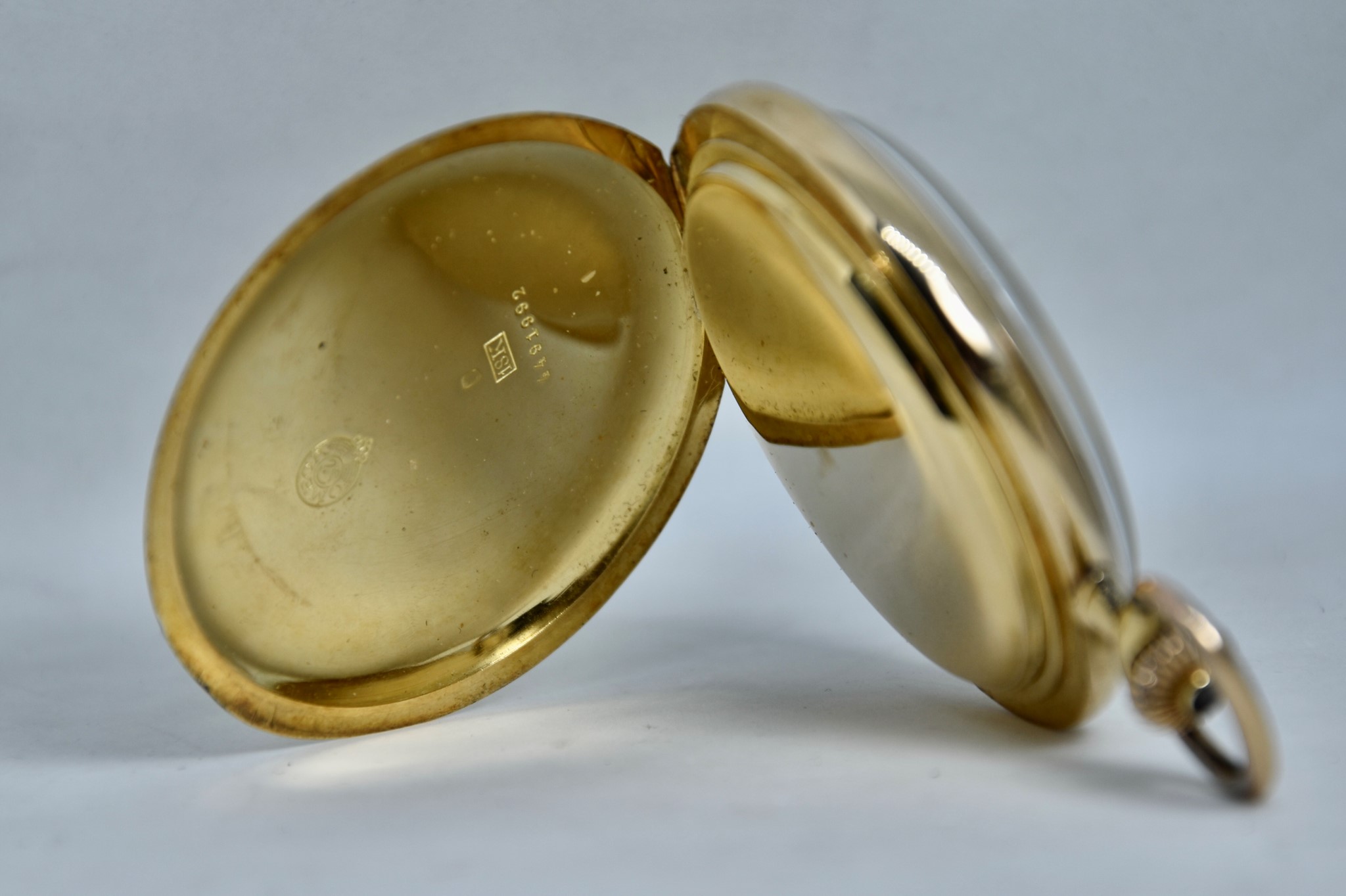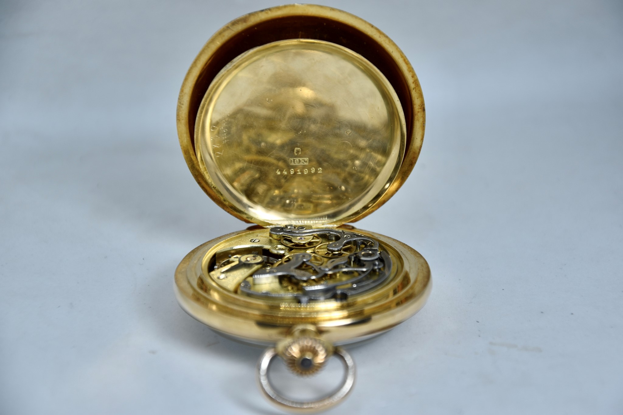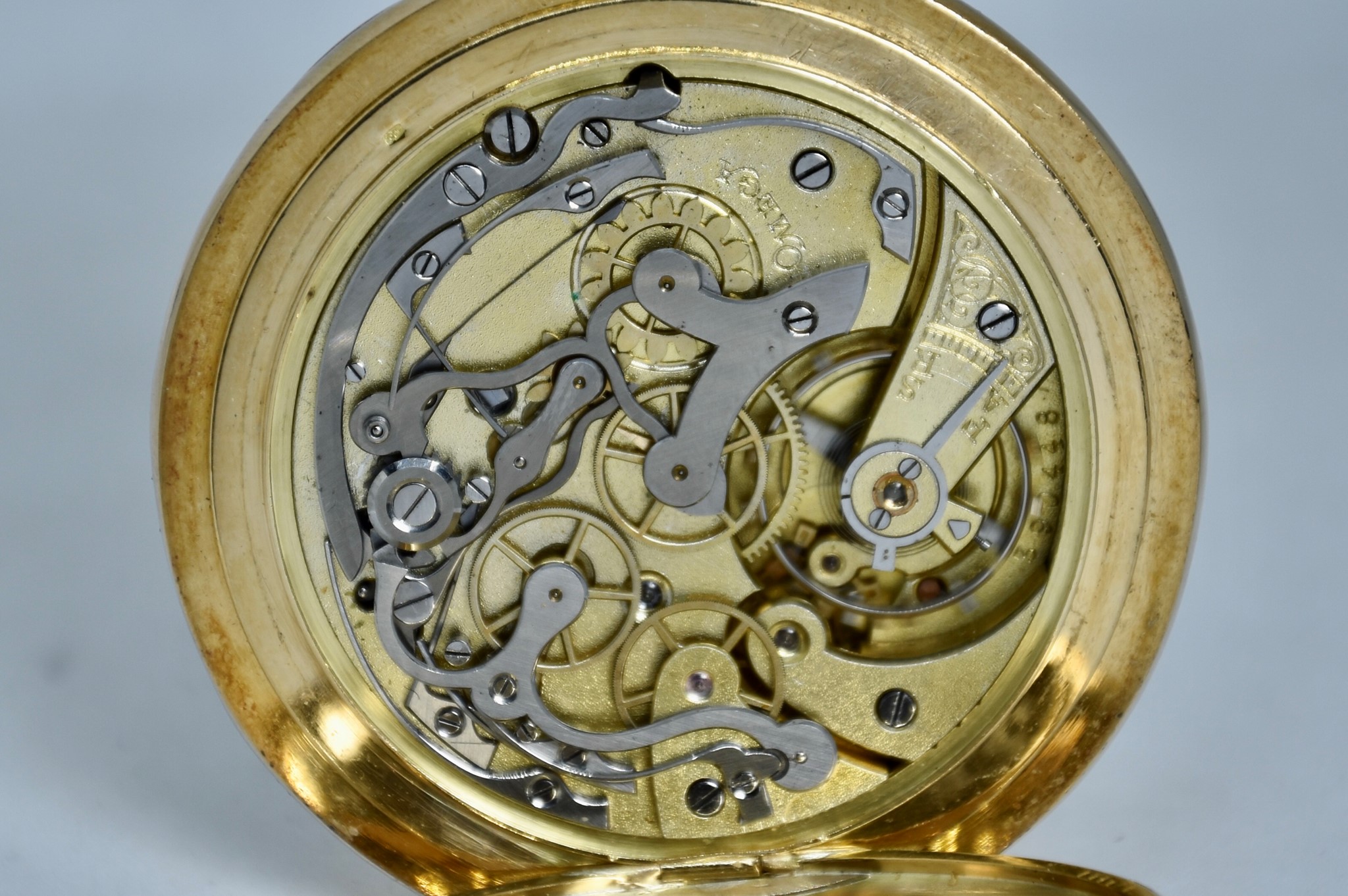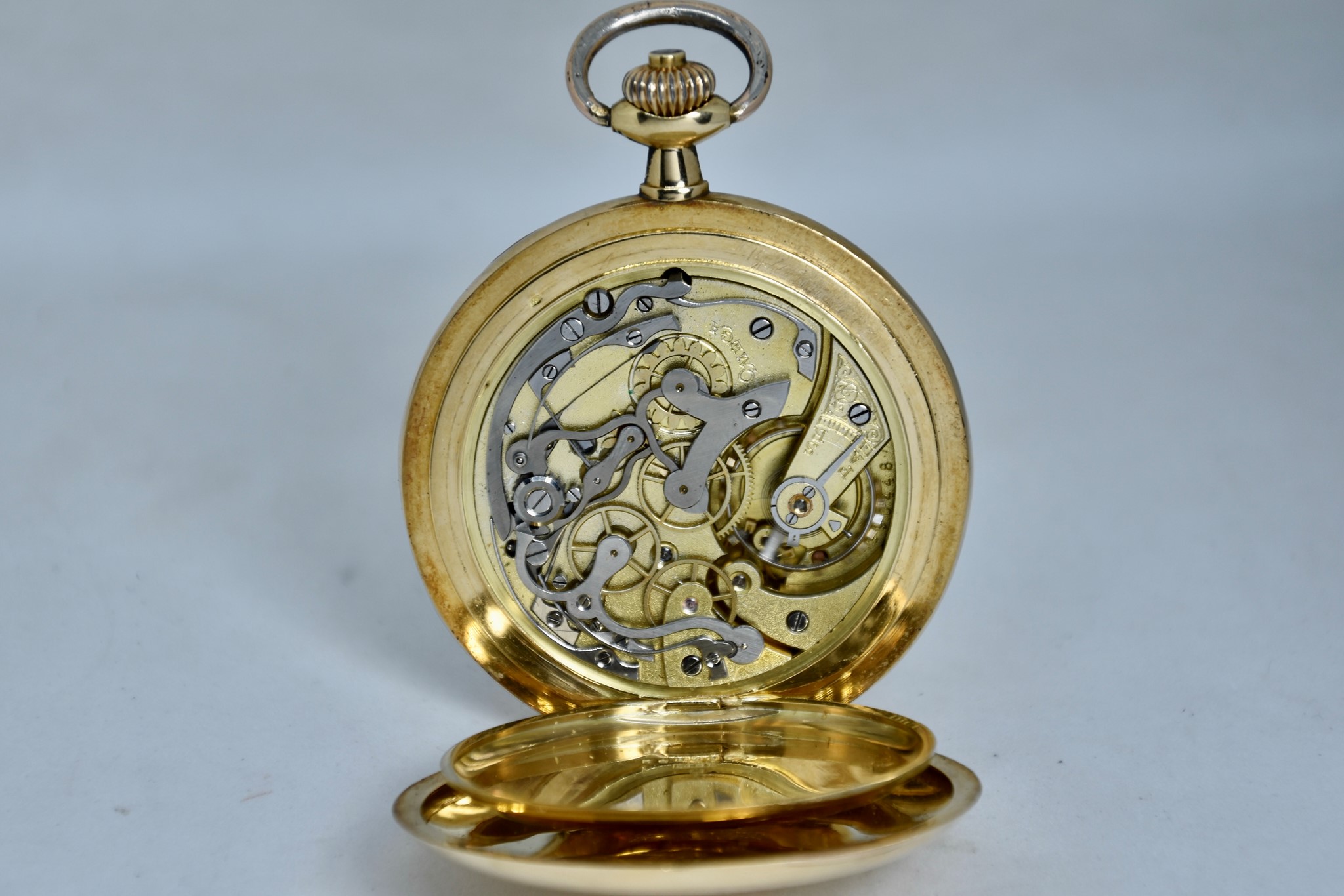 Omega Chronografo MonoPulsante del 1910 approssimativamente. Orologio da tasca in oro giallo 750/00 in buone condizioni. Quadrante bianco in smalto con numeri bianchi. Presenta dei segni internamente al vetro. Secondi piccoli a ore 6. Movimento a carica manuale di manifattura. Diametro cassa 52mm. Vetro plexiglas. Corona originale. Con nostra scatola.