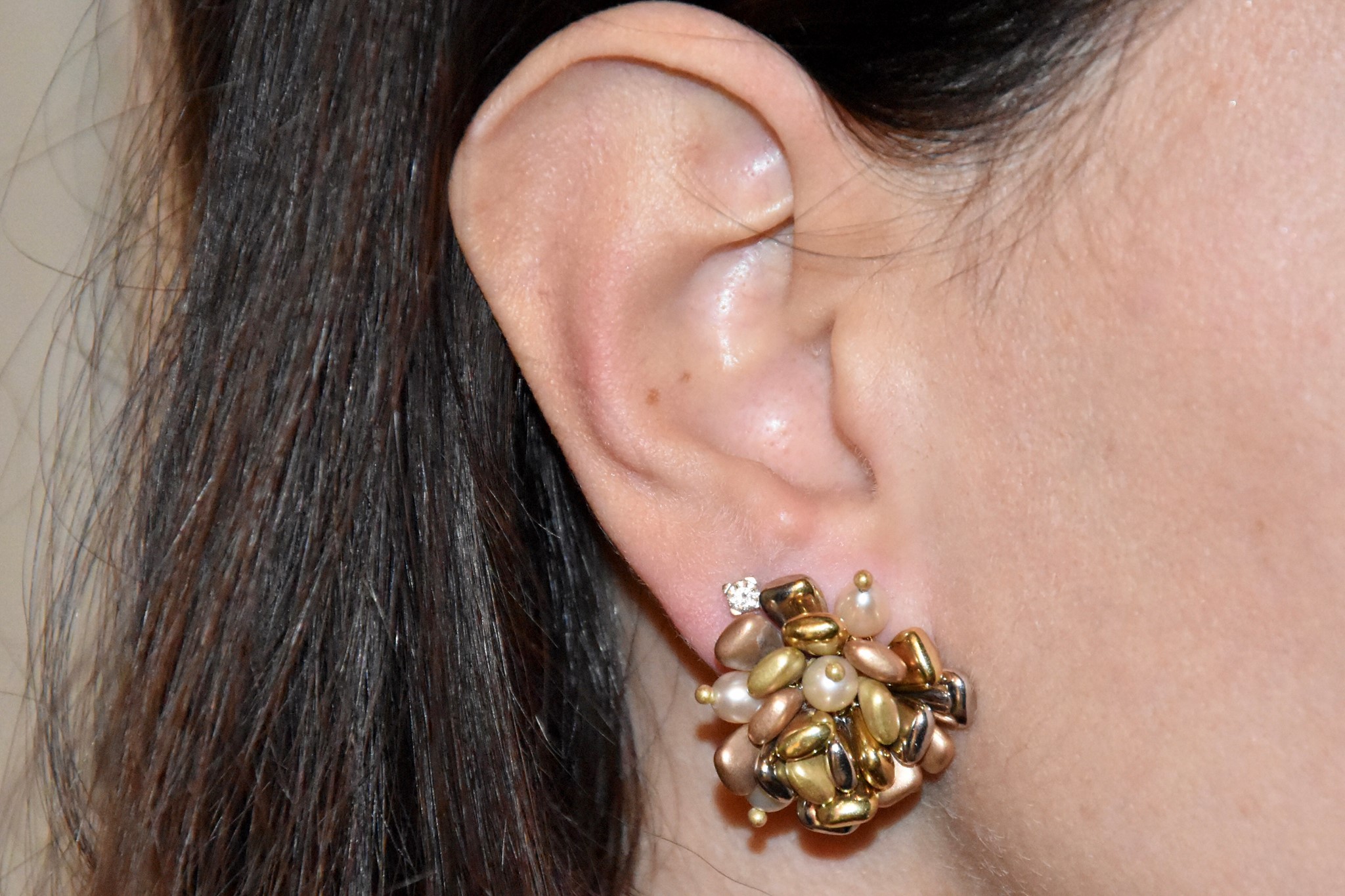 Orecchini a grappolo che si muovono in oro giallo, bianco e rosa 750/00 con lavorazione che gioca con il contrasto di lucido e satinato ed alcune perle di fiume. Orecchini con perno e clip.Diametro orecchini 2,50cm. Peso 15,05g.