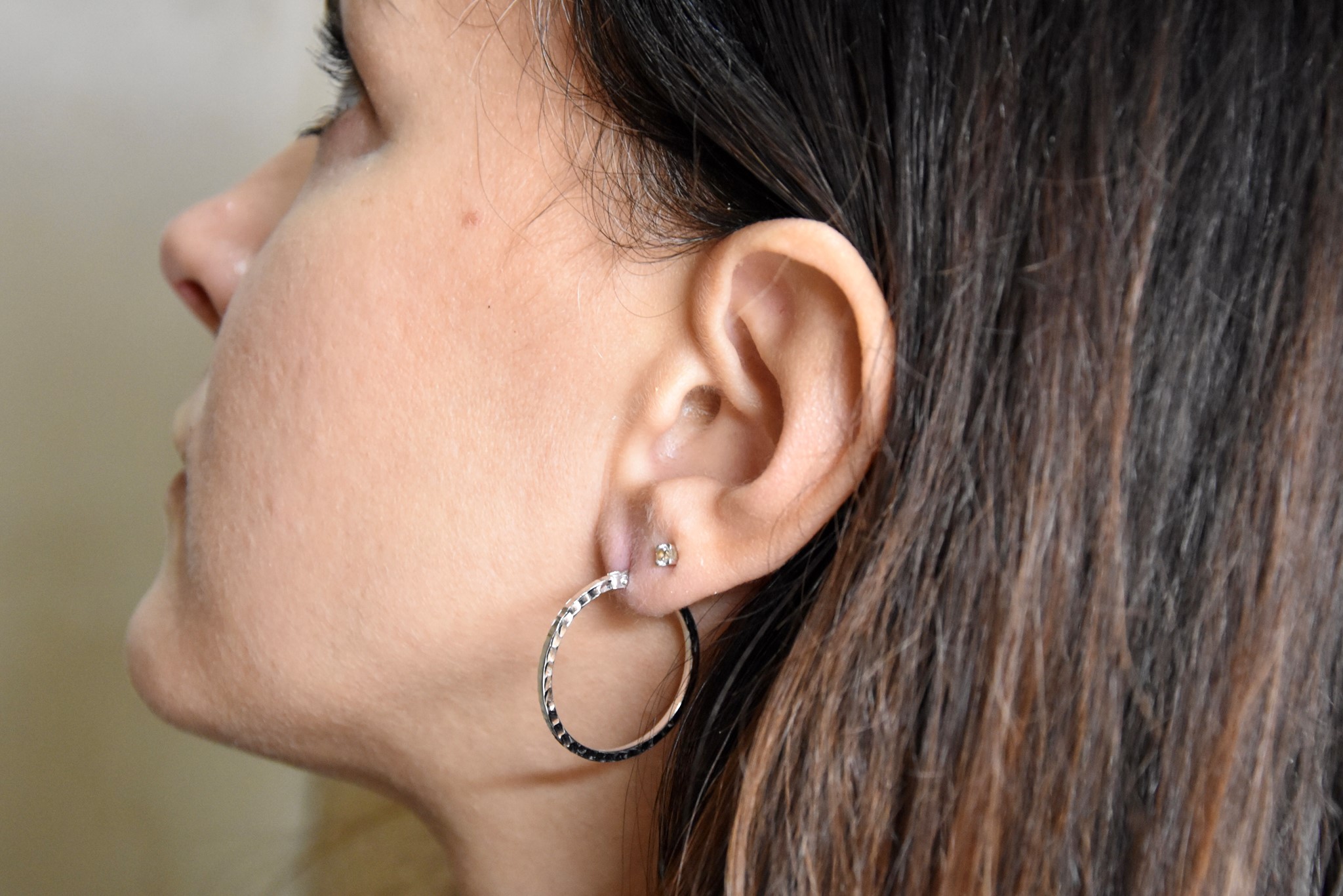 Orecchini a cerchio sfaccettati con laser in oro bianco 750/00 del diametro di 2,70cm. Peso 2,40g.