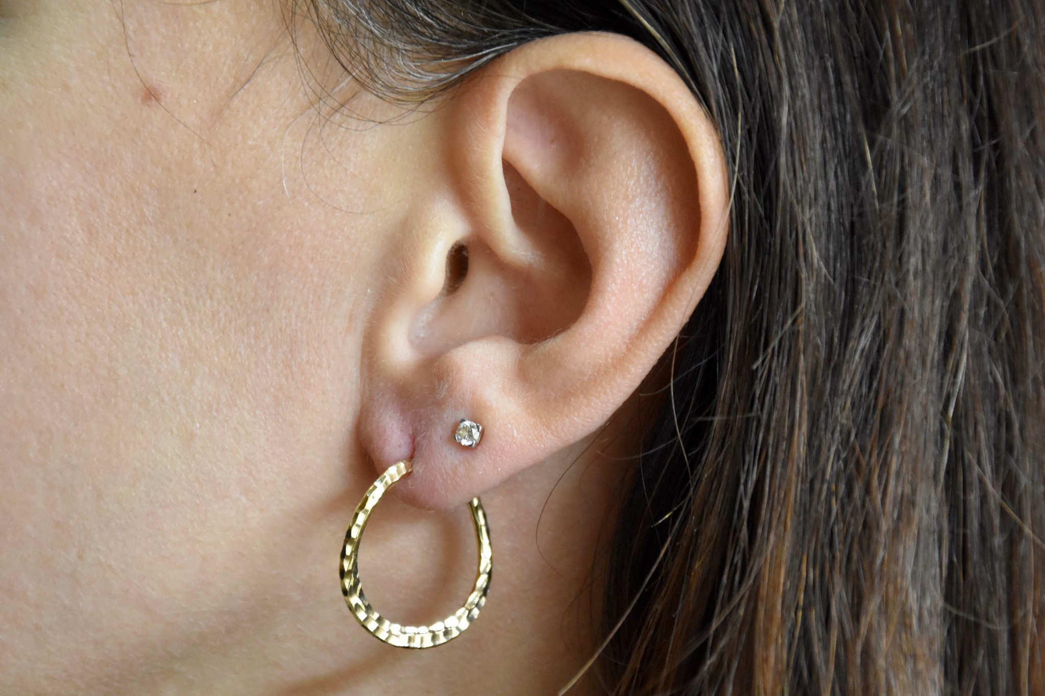 Orecchini a cerchio sfaccettati con laser in oro giallo 750/00 del diametro di 2,30cm. Peso 1,65g.